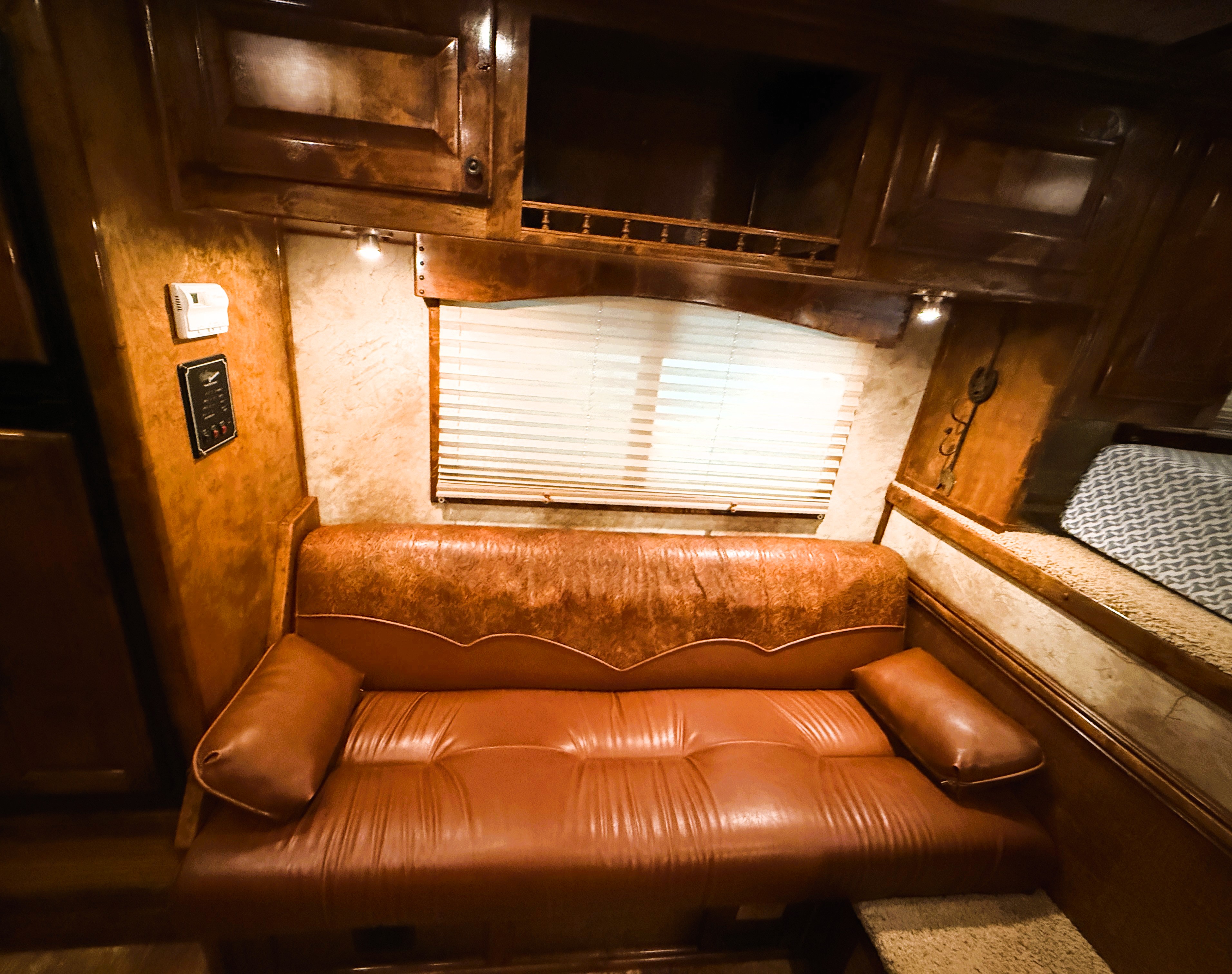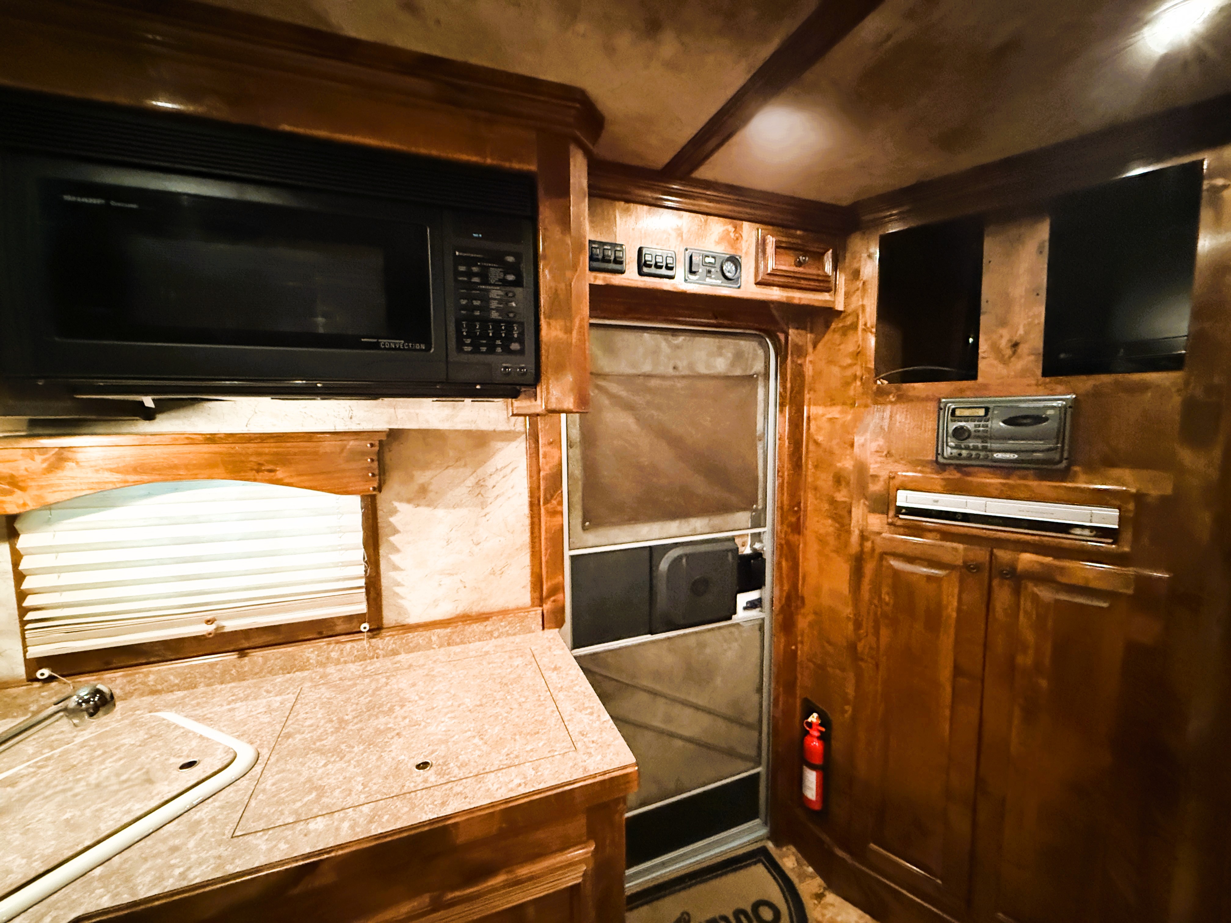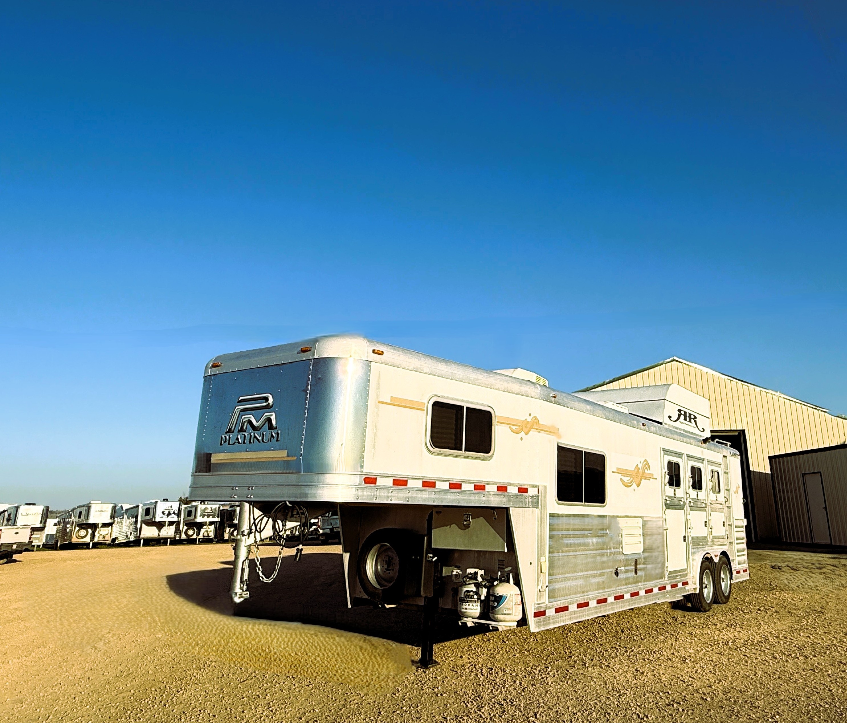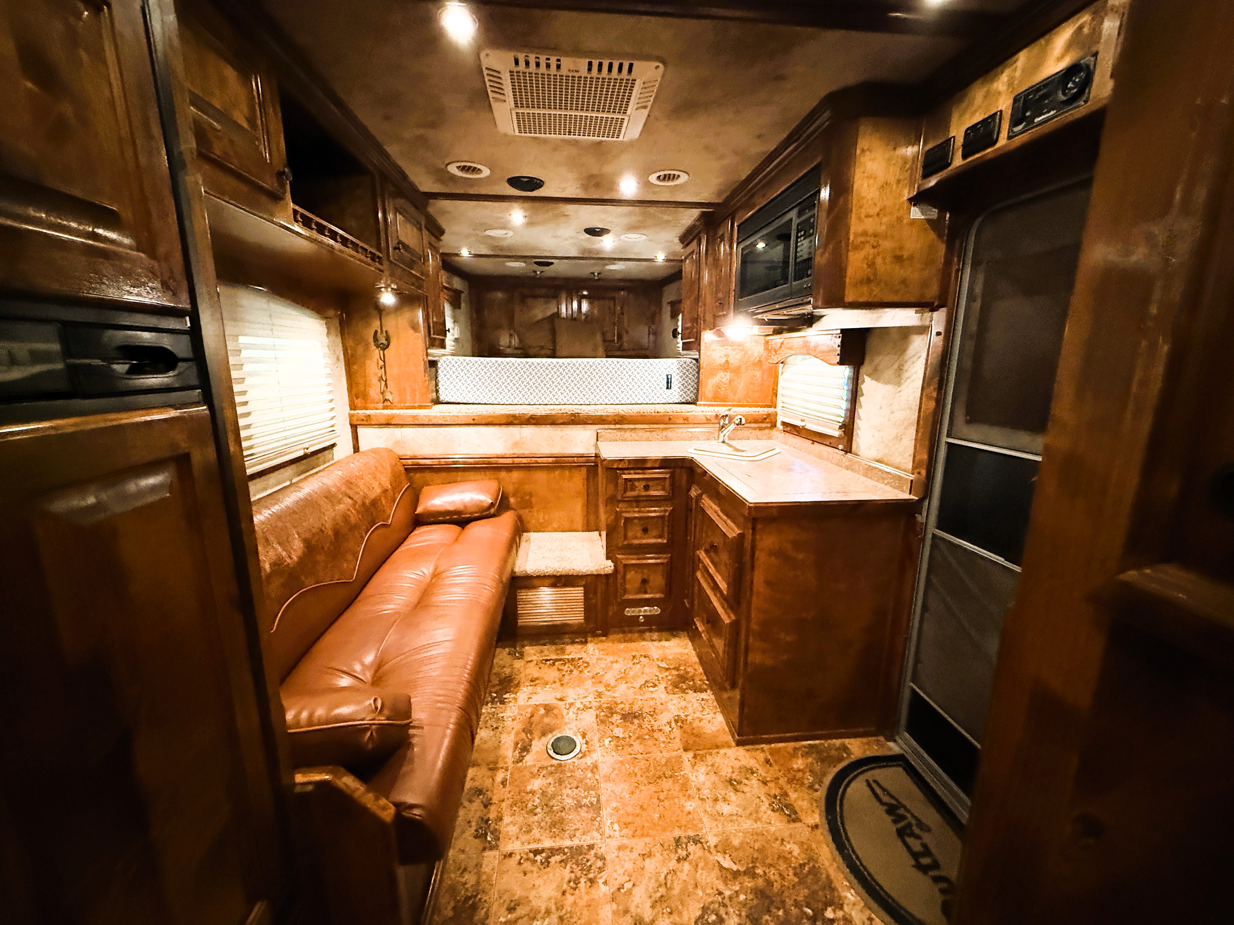 This Platinum 3 horse has an Outlaw Conversion interior with a sofa-sleeper, and a queen-sized bed; along with a full kitchen set up with a recessed cook-top, sink, microwave, large refrigerator, and lots of storage space. The fully private bathroom has a corner shower, closet, sink with vanity and mirror and a walk-through door into the horse compartment. The horse area has a stud stall in the first manger, a blanket bar and bridle hooks, mangers with under manger storage. The corner rear tack features a 4-tier saddle rack, lots of bridle hooks, a fold out step, a blanket bar and a brush box. Additional features include a hay pod, generator and a hydraulic jack. This trailer has a floor length of 25'.