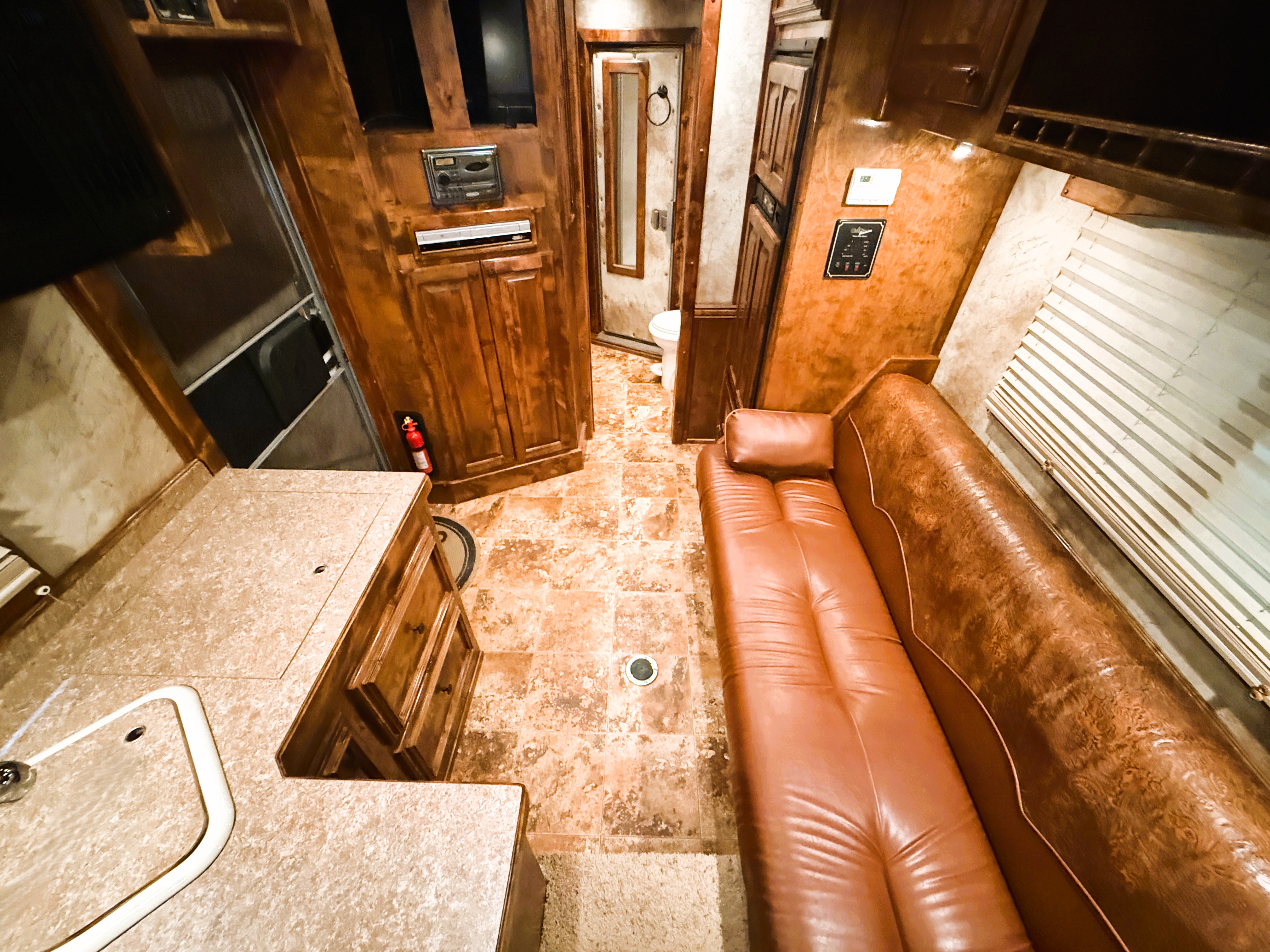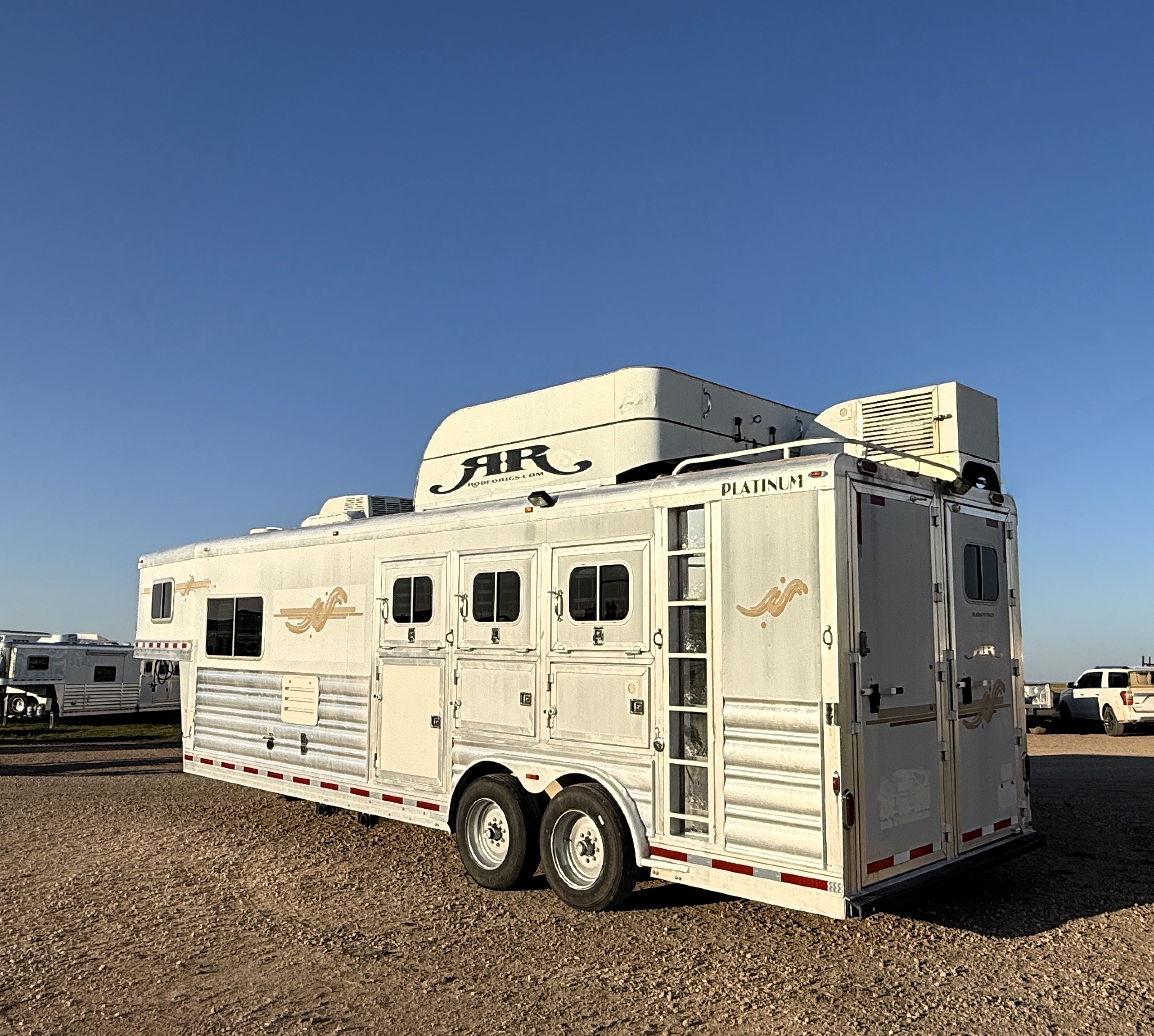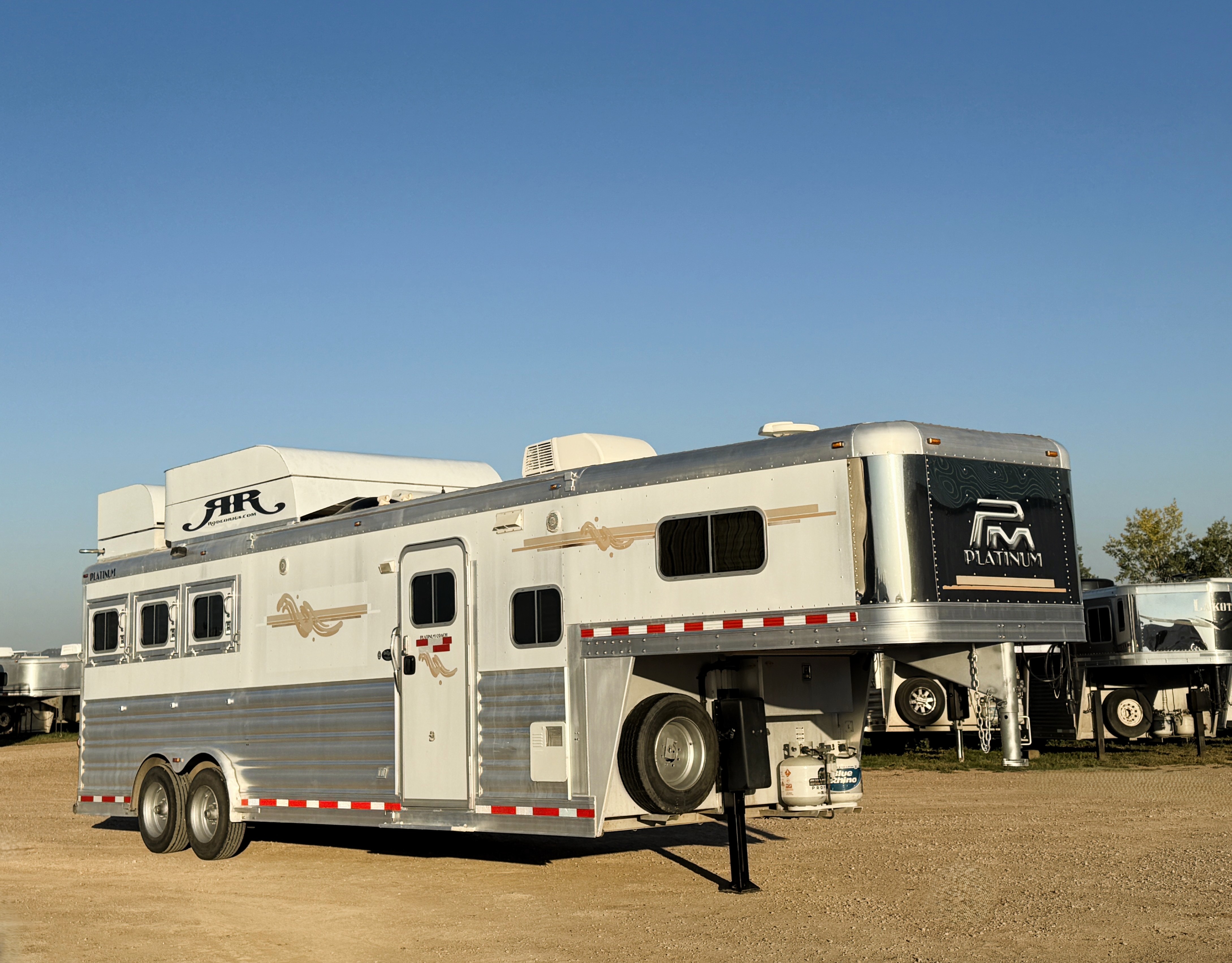 This Platinum 3 horse has an Outlaw Conversion interior with a sofa-sleeper, and a queen-sized bed; along with a full kitchen set up with a recessed cook-top, sink, microwave, large refrigerator, and lots of storage space. The fully private bathroom has a corner shower, closet, sink with vanity and mirror and a walk-through door into the horse compartment. The horse area has a stud stall in the first manger, a blanket bar and bridle hooks, mangers with under manger storage. The corner rear tack features a 4-tier saddle rack, lots of bridle hooks, a fold out step, a blanket bar and a brush box. Additional features include a hay pod, generator and a hydraulic jack. This trailer has a floor length of 25'.