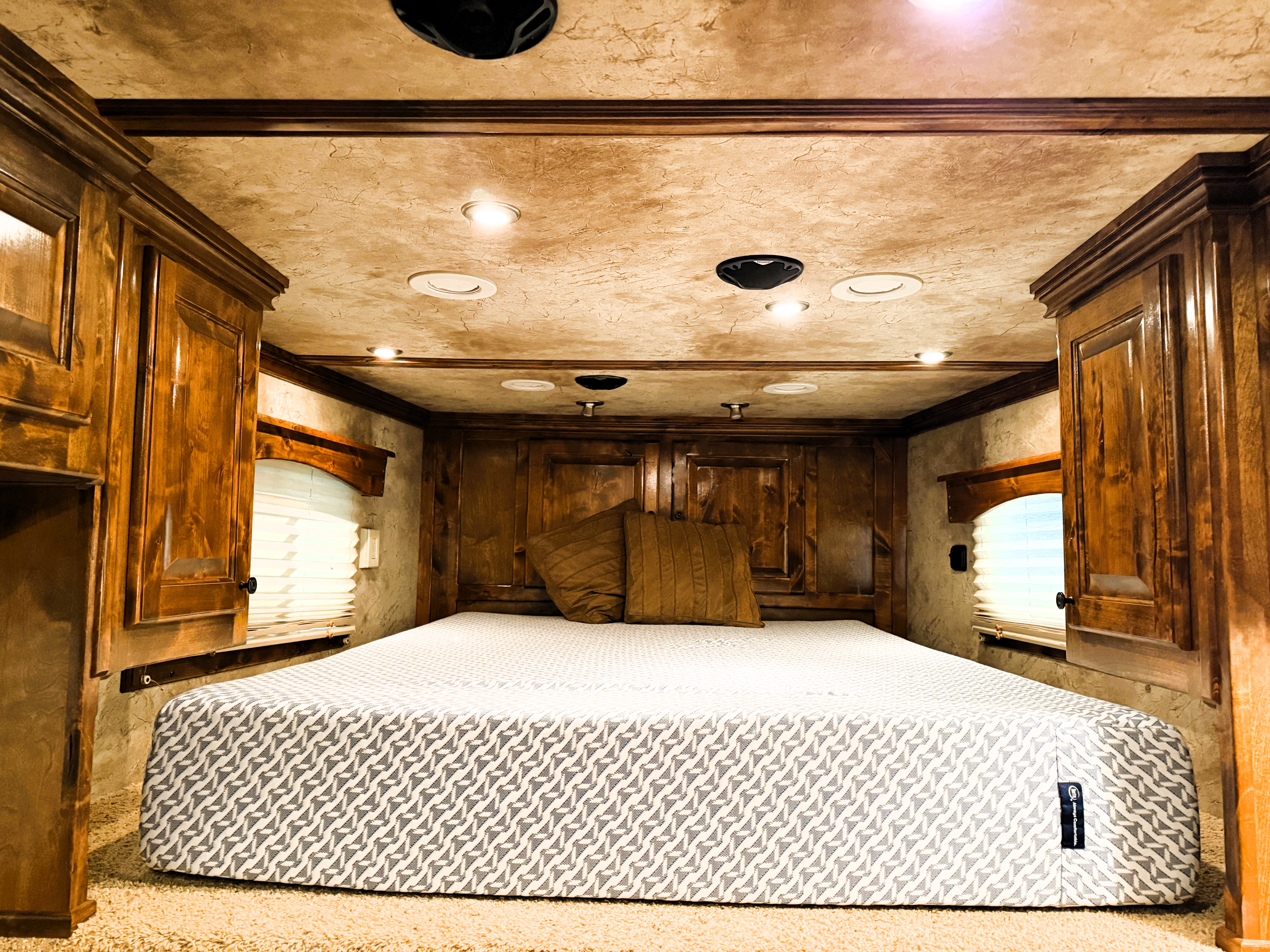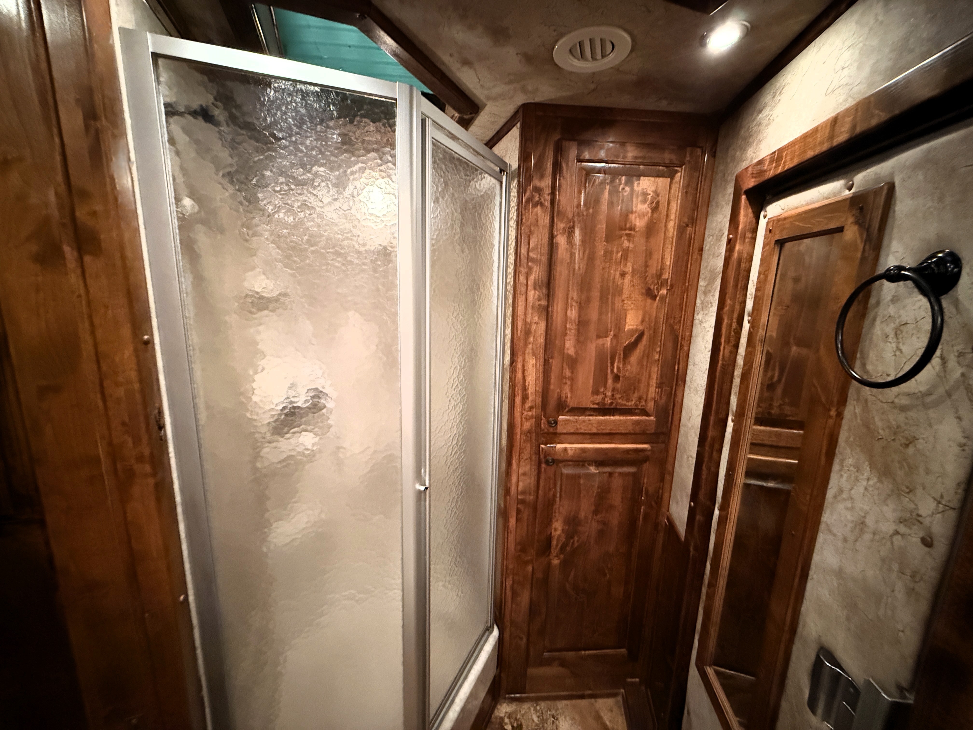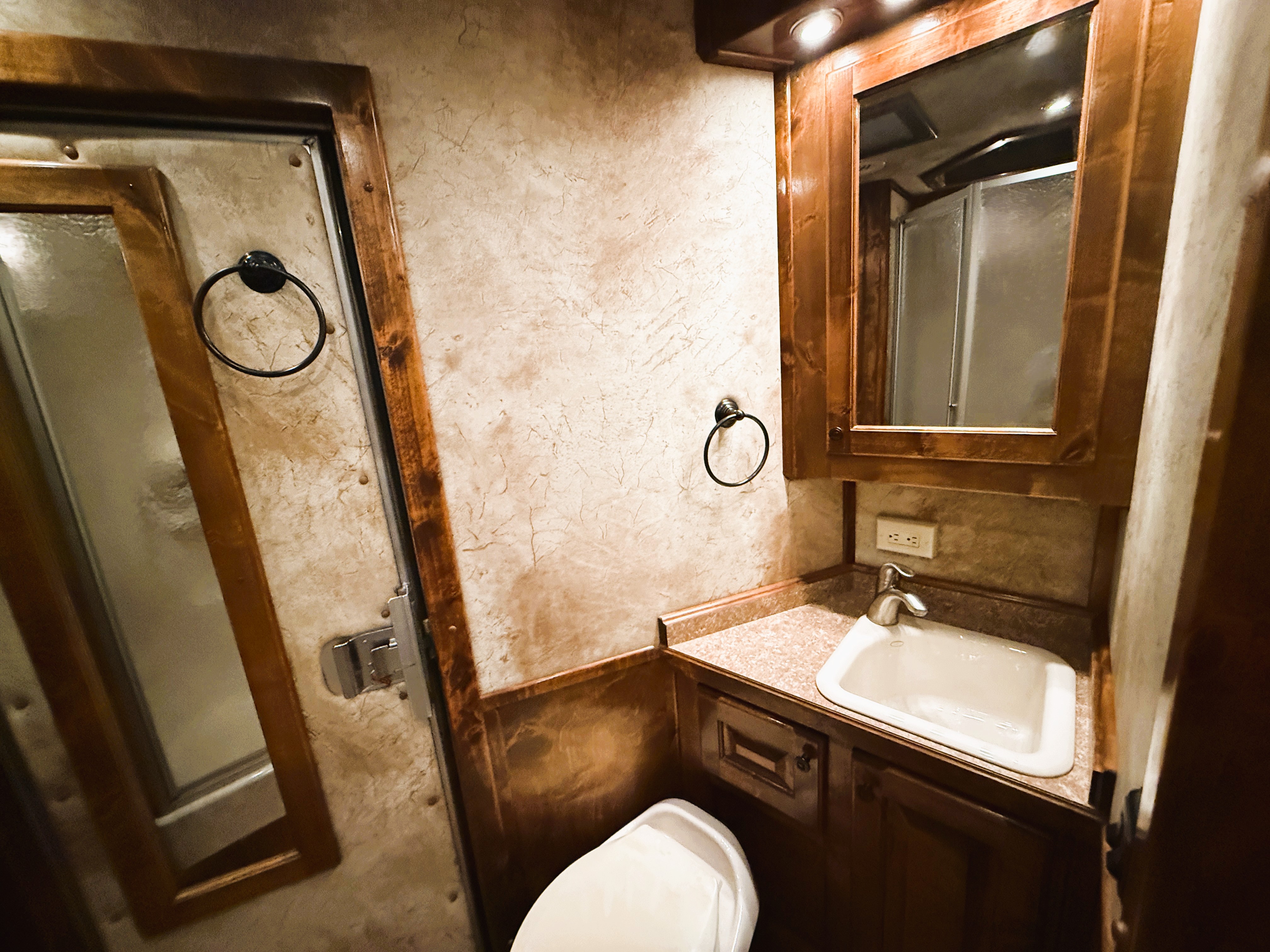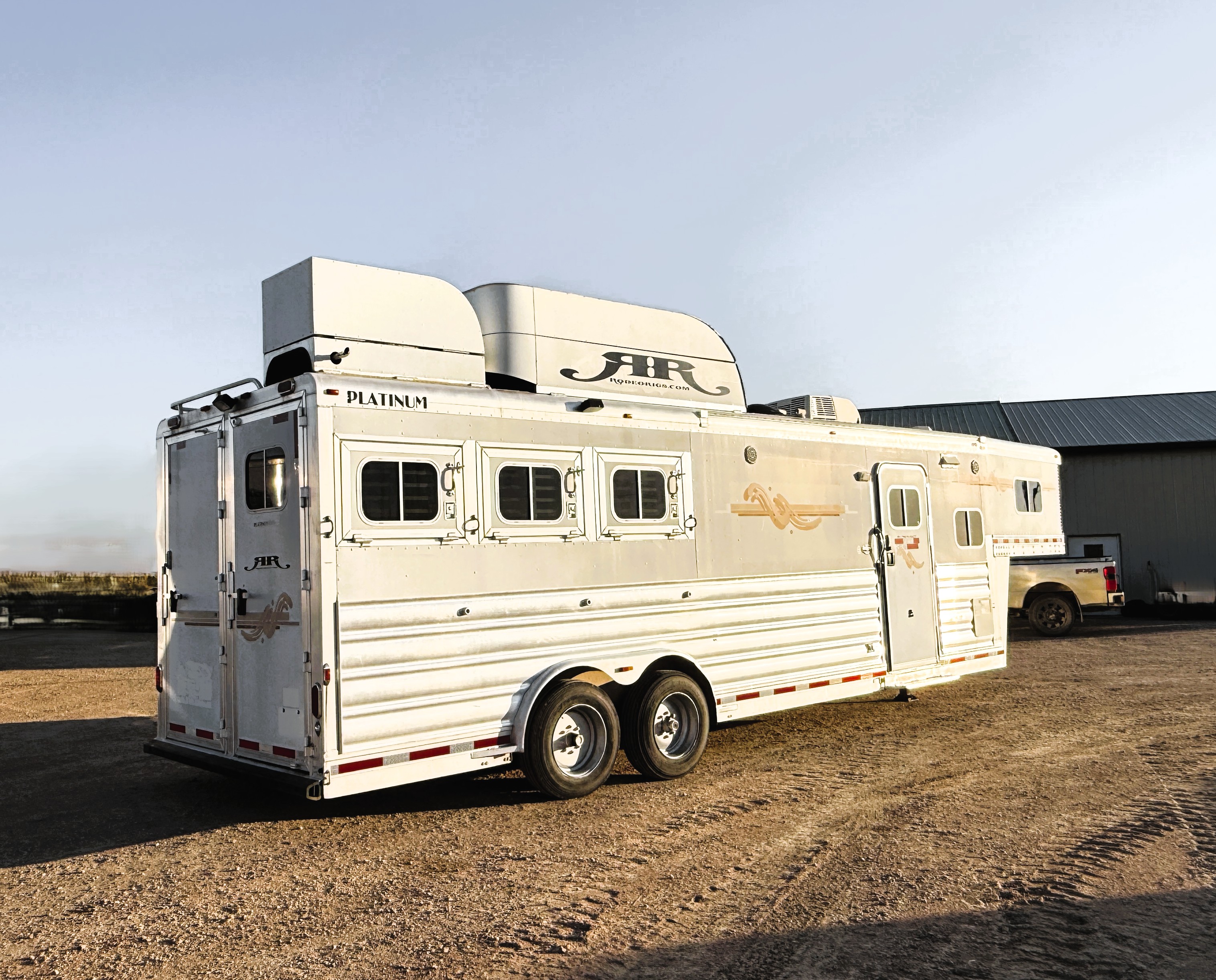 This Platinum 3 horse has an Outlaw Conversion interior with a sofa-sleeper, and a queen-sized bed; along with a full kitchen set up with a recessed cook-top, sink, microwave, large refrigerator, and lots of storage space. The fully private bathroom has a corner shower, closet, sink with vanity and mirror and a walk-through door into the horse compartment. The horse area has a stud stall in the first manger, a blanket bar and bridle hooks, mangers with under manger storage. The corner rear tack features a 4-tier saddle rack, lots of bridle hooks, a fold out step, a blanket bar and a brush box. Additional features include a hay pod, generator and a hydraulic jack. This trailer has a floor length of 25'.
