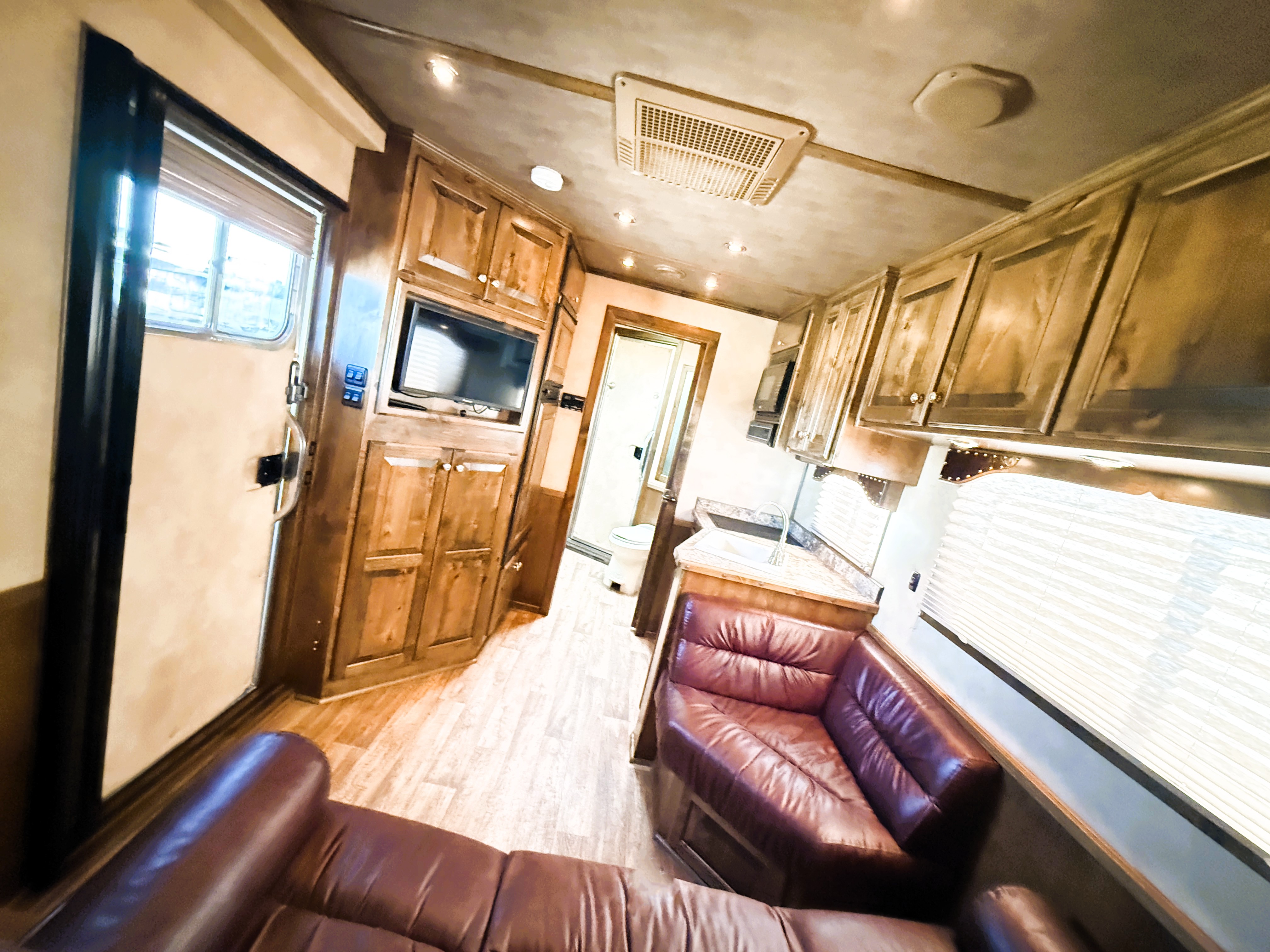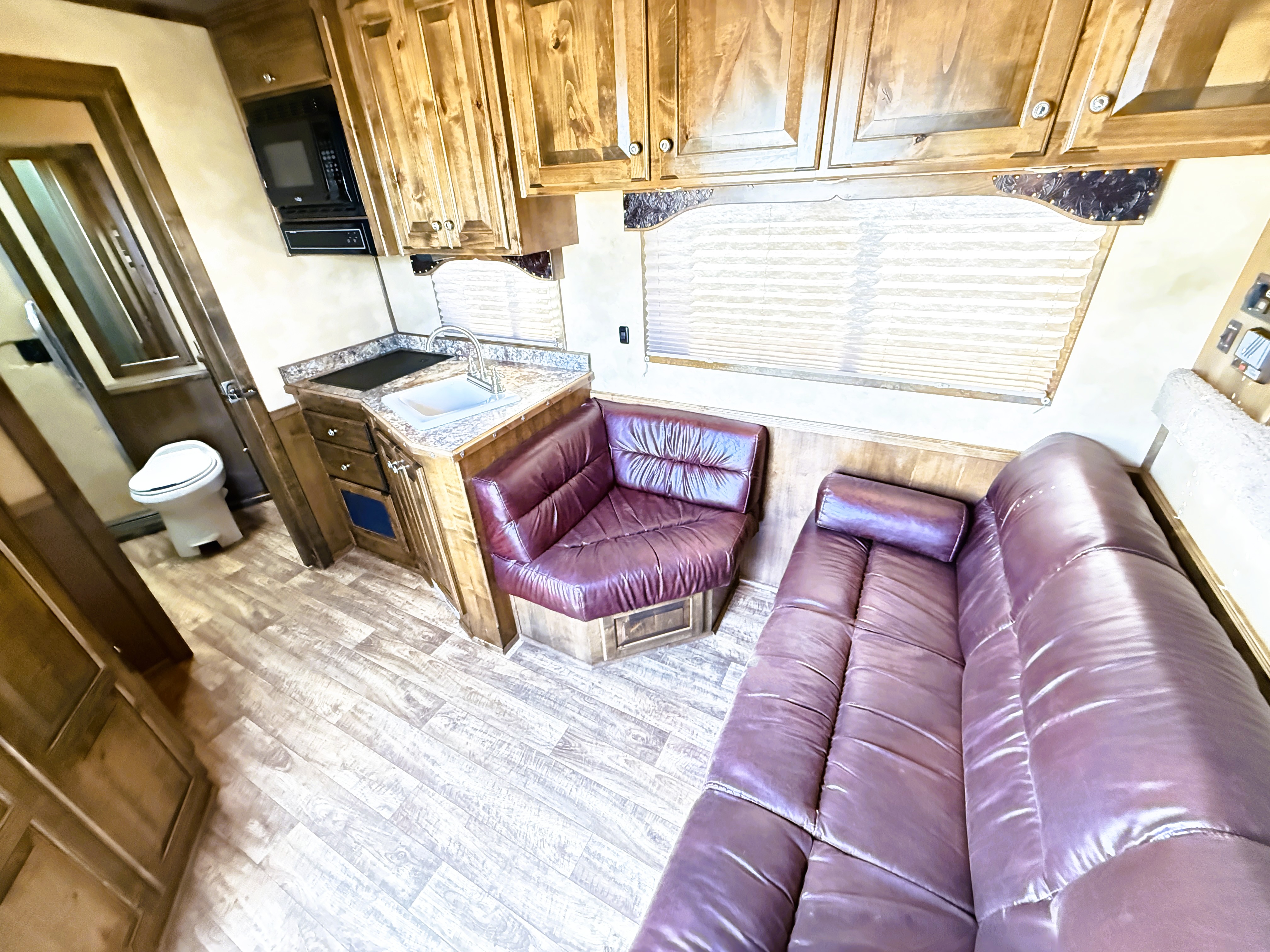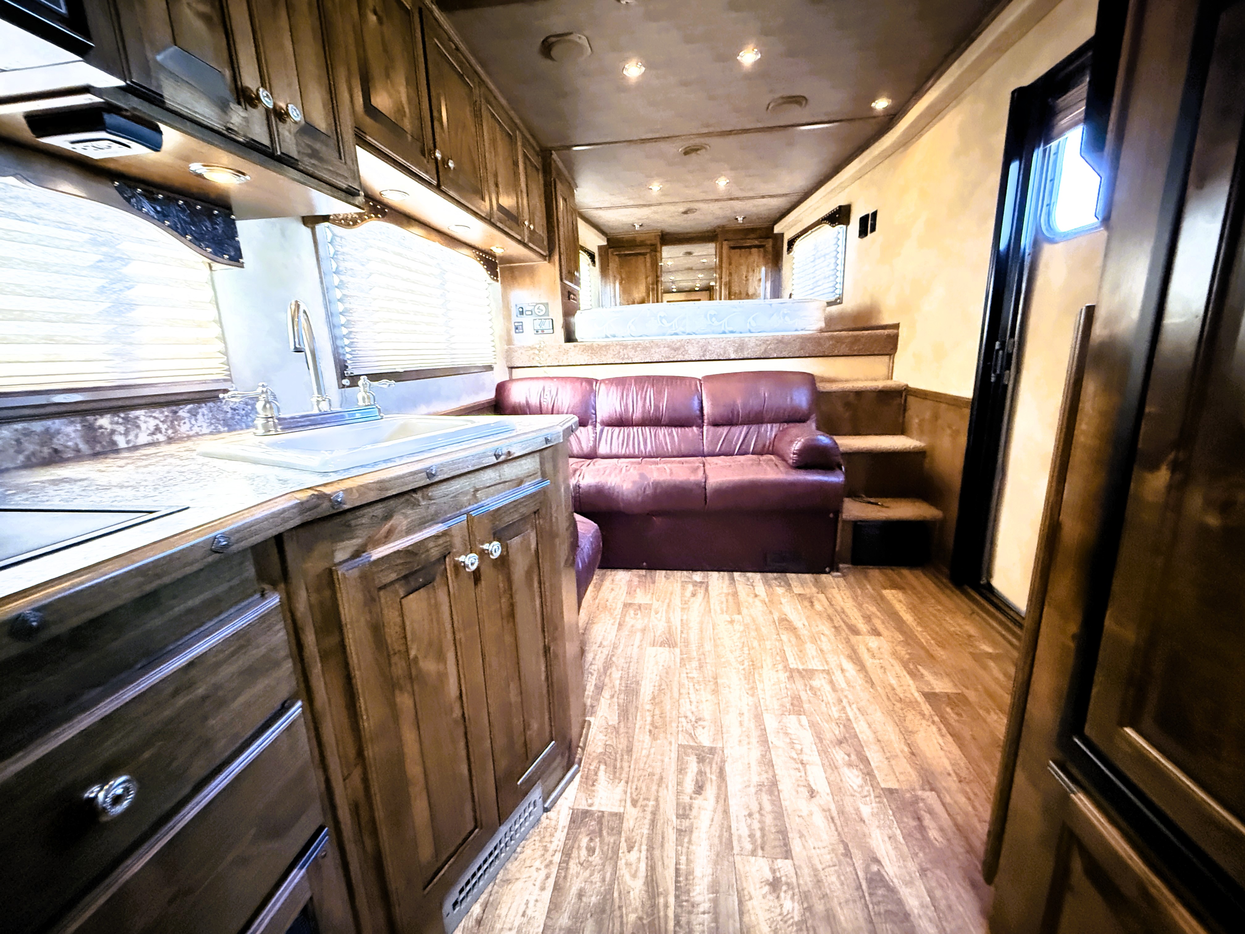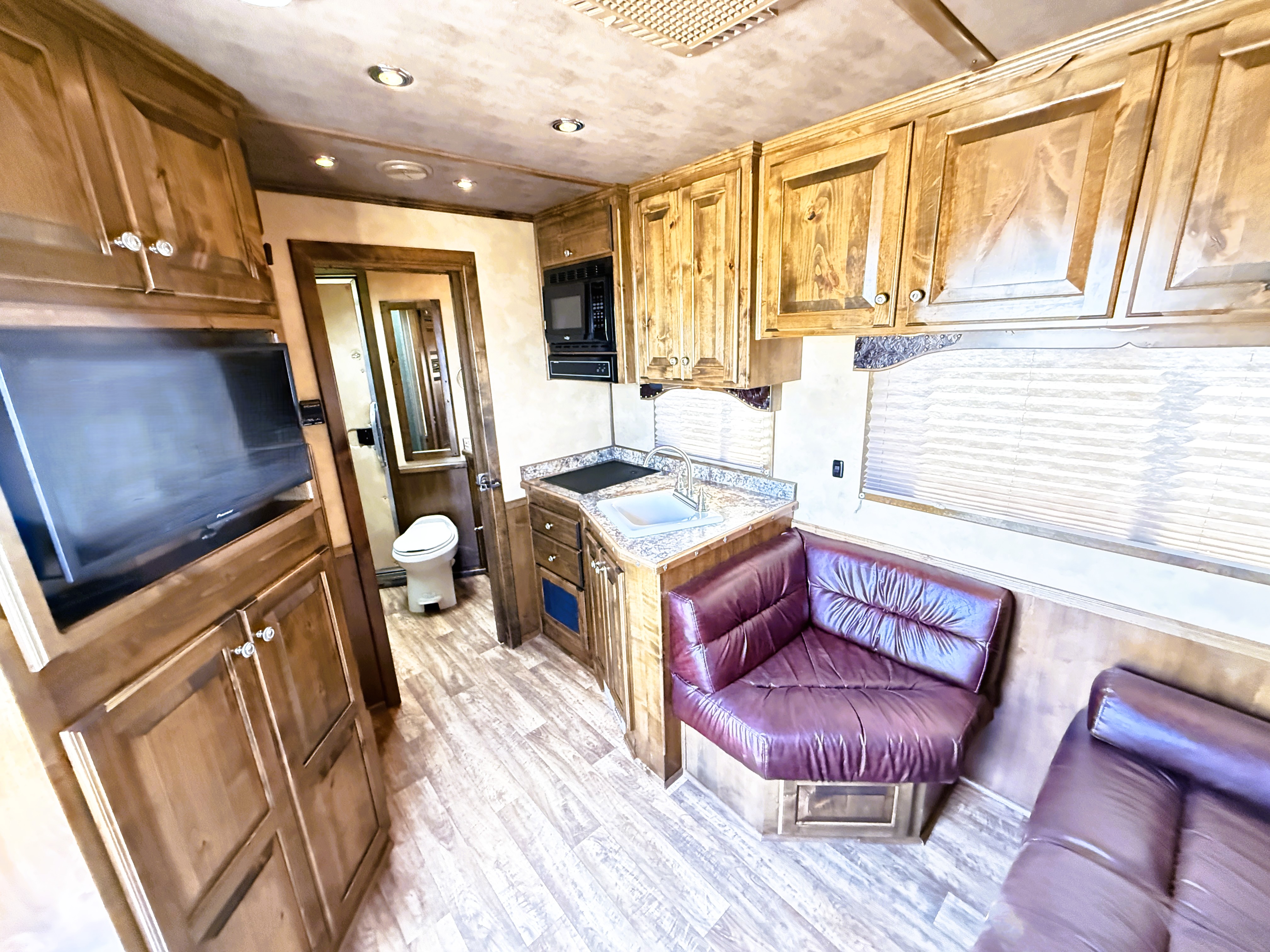 This Elite 4 horse features a Trail Boss Conversions living quarters with a sofa-sleeper, corner chair, entertainment center, queen-sized bed, and a full kitchen with a large refrigerator, microwave, recessed cook top, and large sink. The fully private bathroom features a radius shower, toilet, large sink with vanity and mirror and plenty of counter space, a closet and a walk-through door into the horse area. The horse compartment has a stud stall in the front slant, a roadside escape door, mangers with under manger storage, padded dividers and rubber kick mats all the way around. The corner rear tack room has a 4-tier saddle rack, blanket bar, brush box and lots of bridle hooks. Additional features include a hydraulic jack, awning, and a hay rack with ladder.