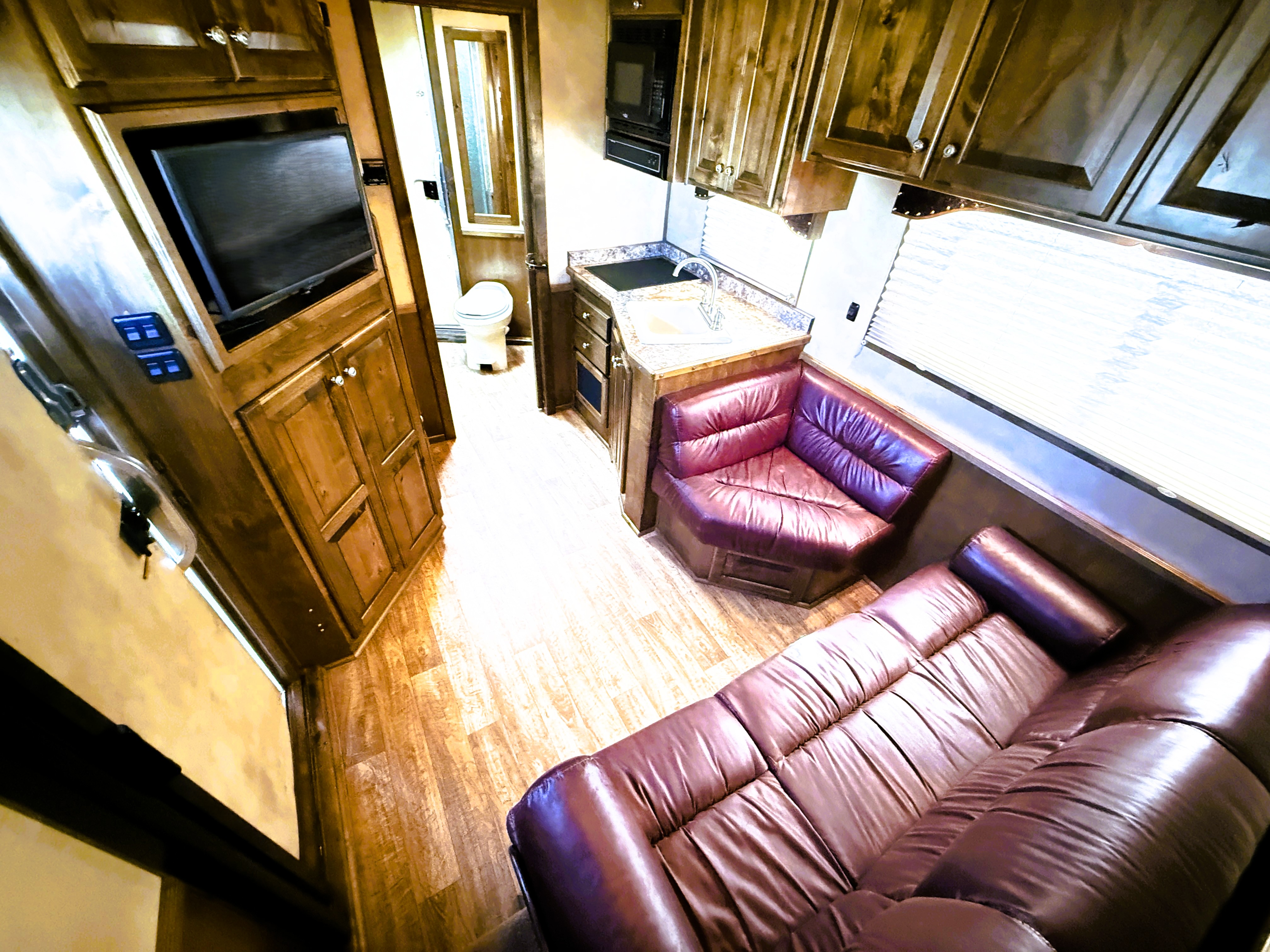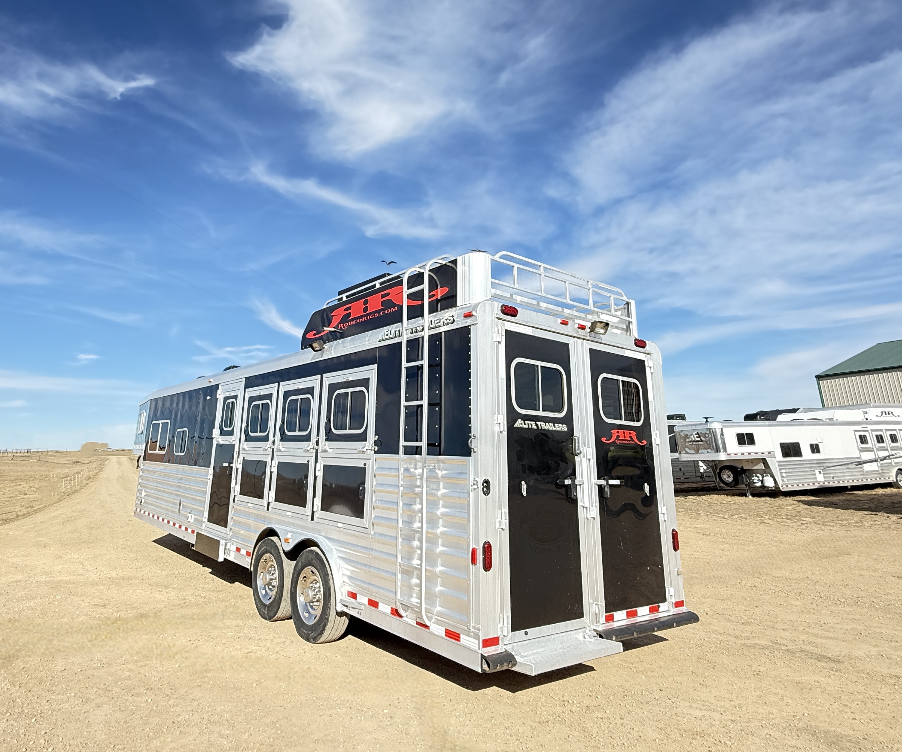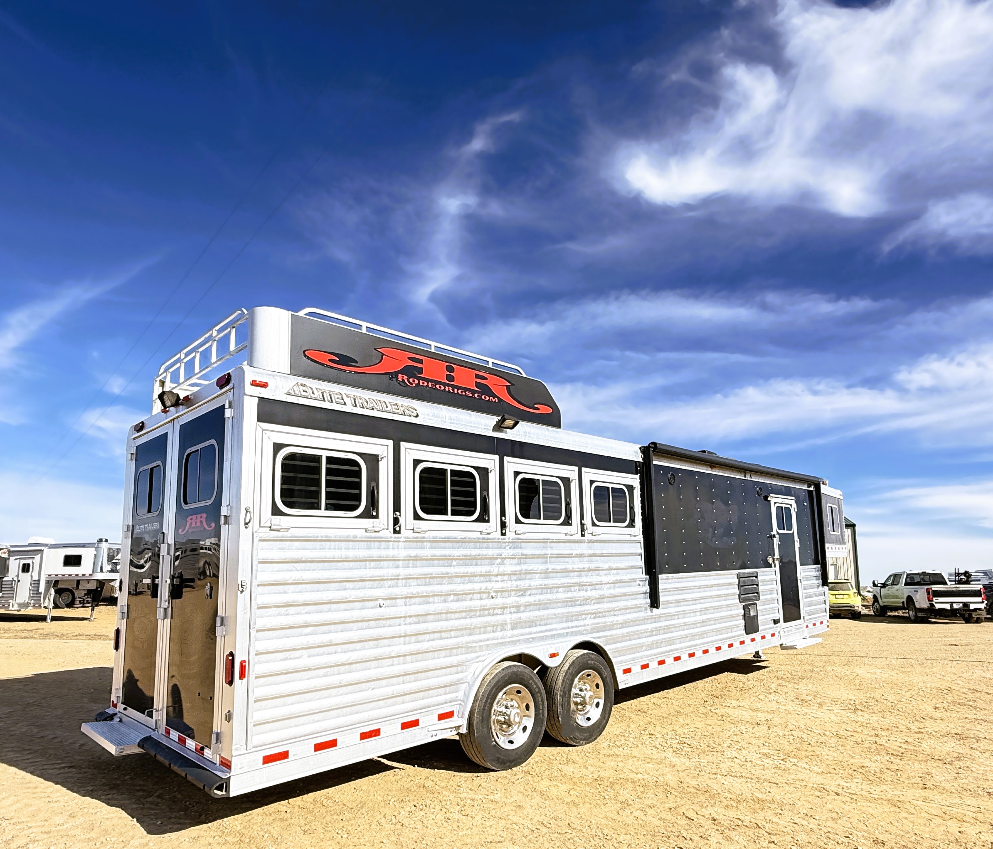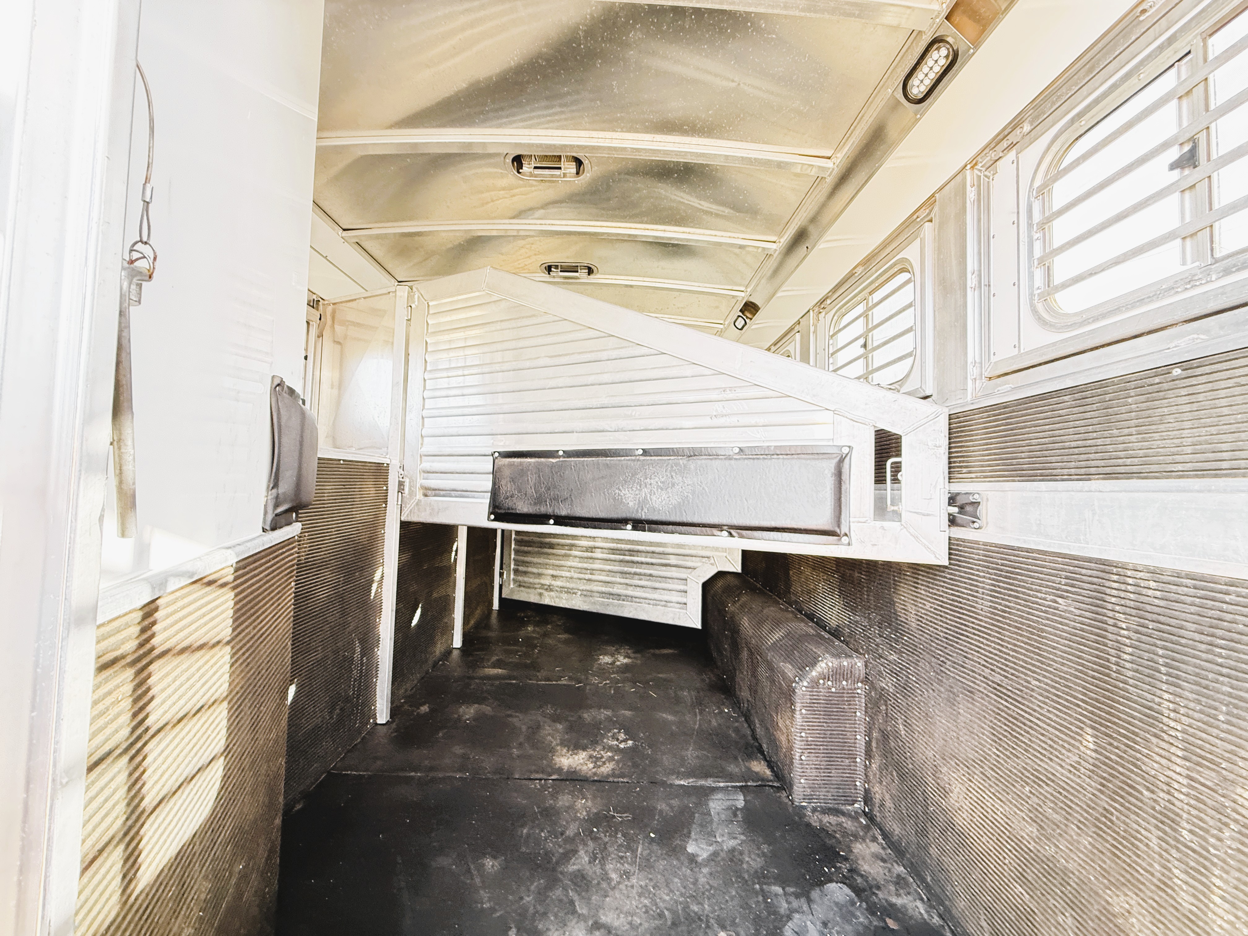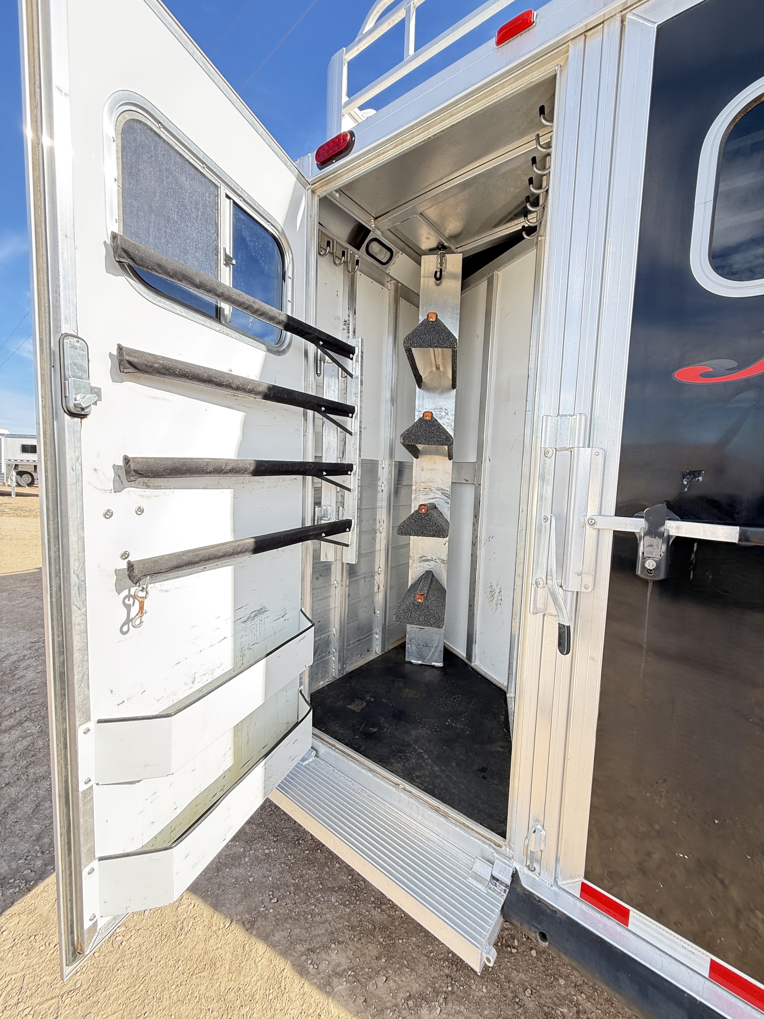 This Elite 4 horse features a Trail Boss Conversions living quarters with a sofa-sleeper, corner chair, entertainment center, queen-sized bed, and a full kitchen with a large refrigerator, microwave, recessed cook top, and large sink. The fully private bathroom features a radius shower, toilet, large sink with vanity and mirror and plenty of counter space, a closet and a walk-through door into the horse area. The horse compartment has a stud stall in the front slant, a roadside escape door, mangers with under manger storage, padded dividers and rubber kick mats all the way around. The corner rear tack room has a 4-tier saddle rack, blanket bar, brush box and lots of bridle hooks. Additional features include a hydraulic jack, awning, and a hay rack with ladder.