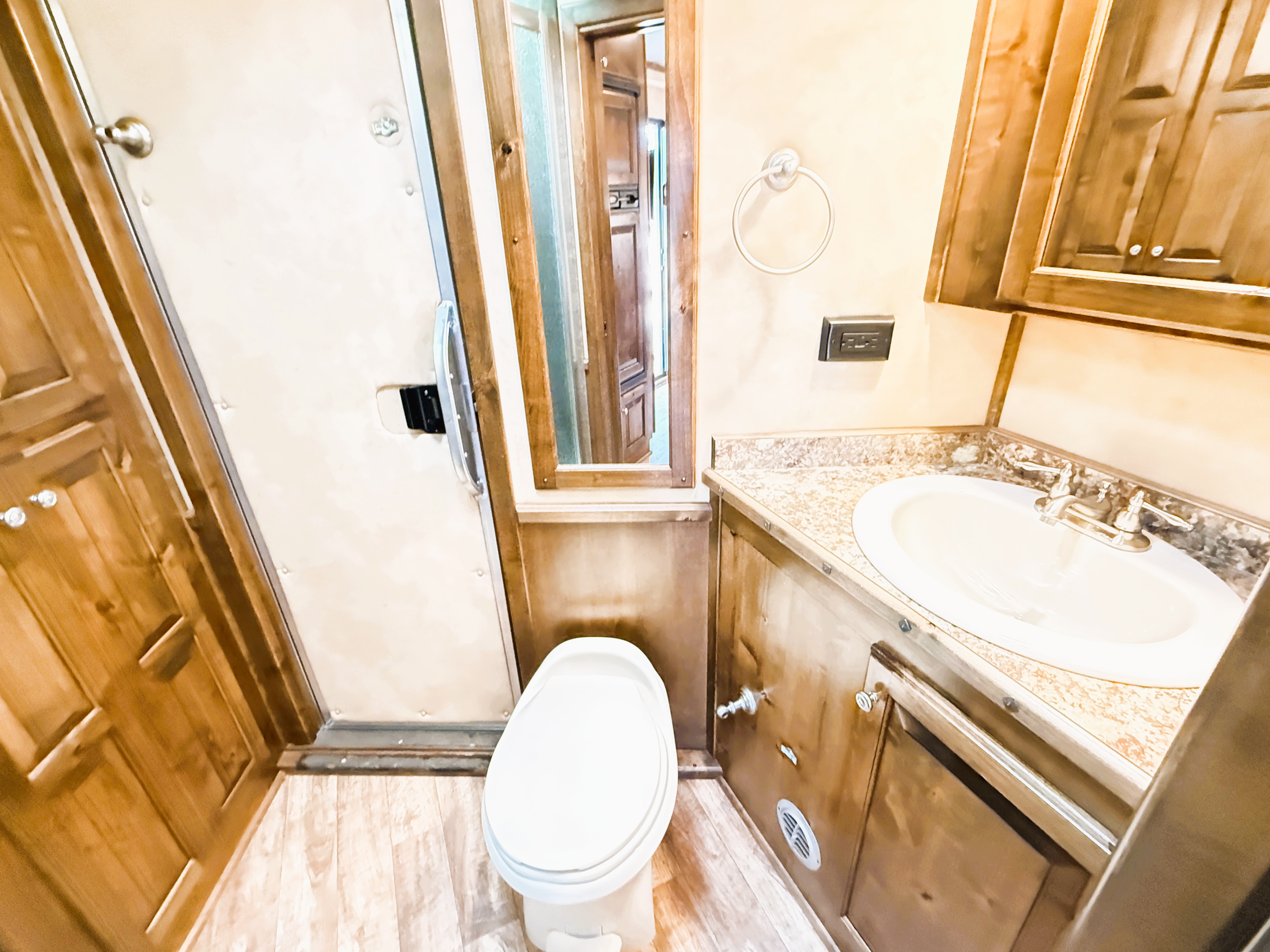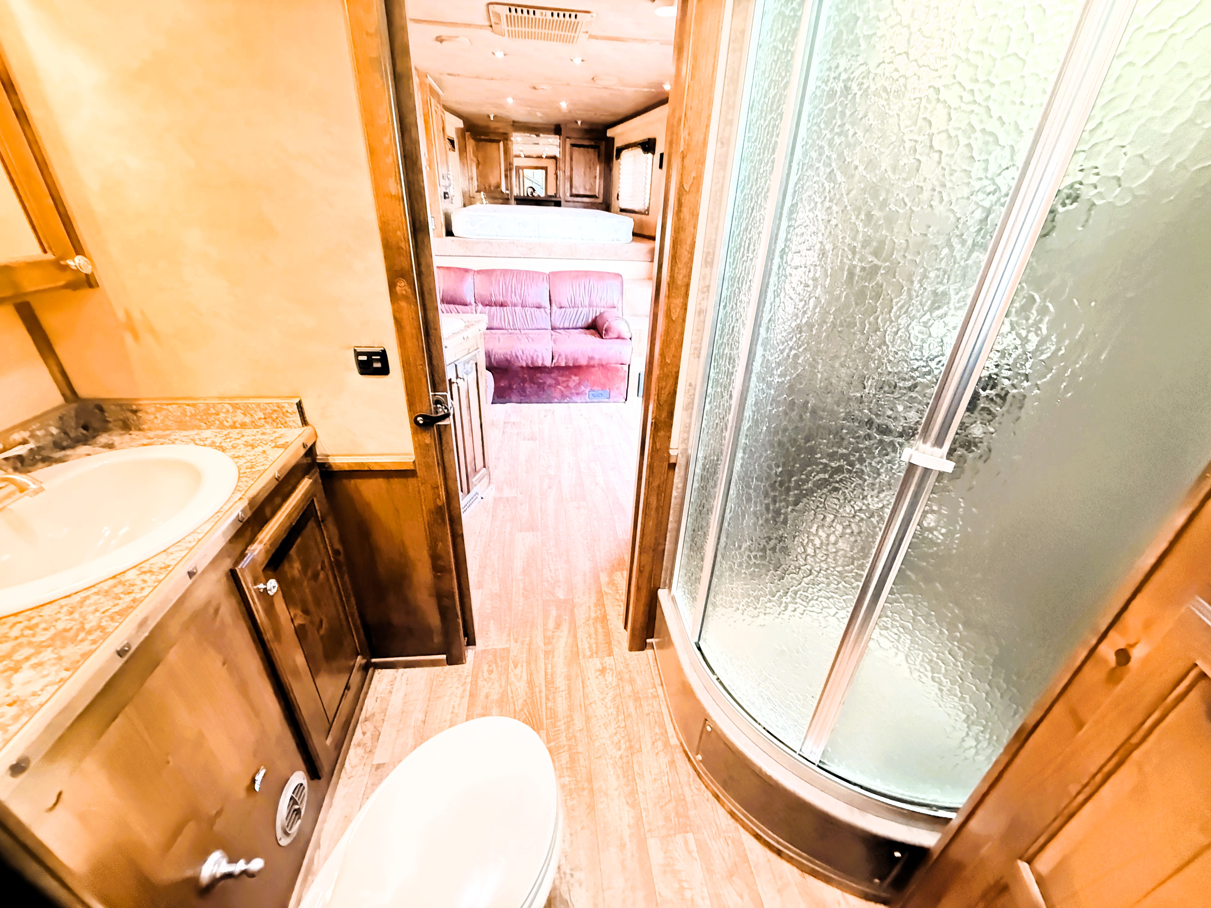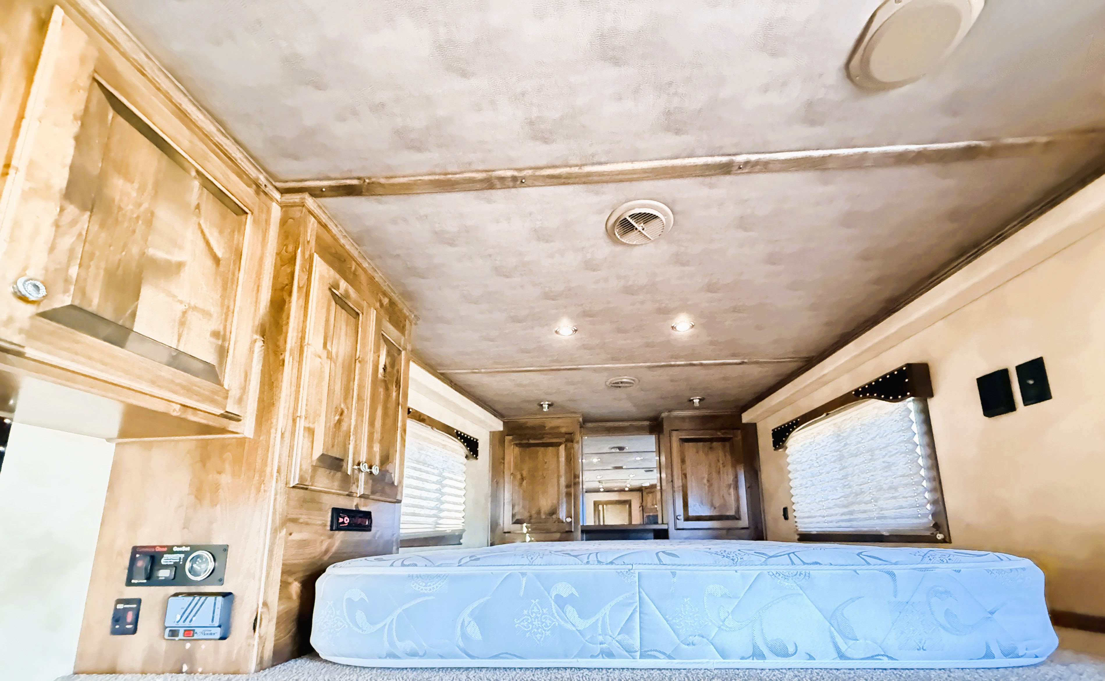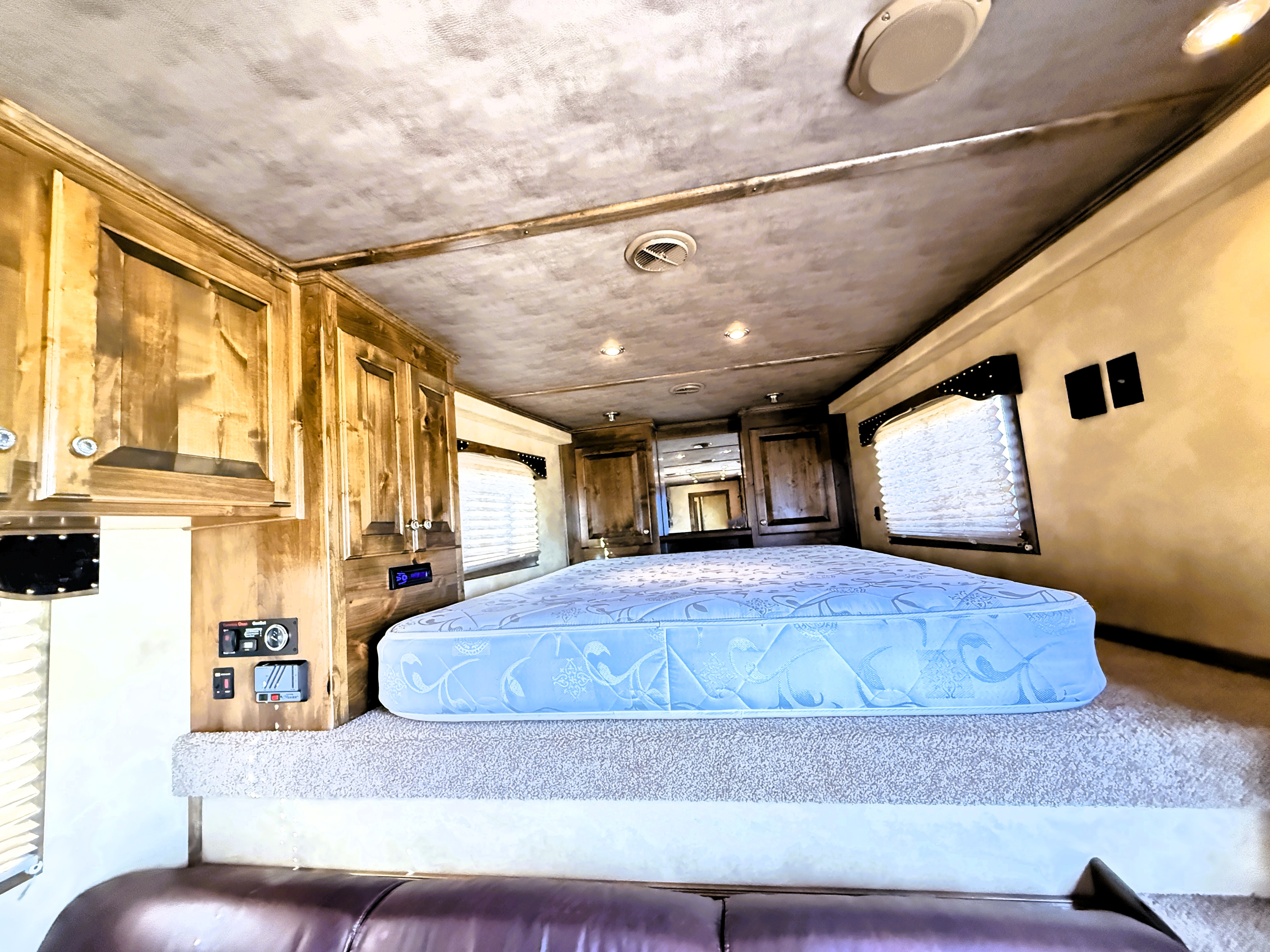 This Elite 4 horse features a Trail Boss Conversions living quarters with a sofa-sleeper, corner chair, entertainment center, queen-sized bed, and a full kitchen with a large refrigerator, microwave, recessed cook top, and large sink. The fully private bathroom features a radius shower, toilet, large sink with vanity and mirror and plenty of counter space, a closet and a walk-through door into the horse area. The horse compartment has a stud stall in the front slant, a roadside escape door, mangers with under manger storage, padded dividers and rubber kick mats all the way around. The corner rear tack room has a 4-tier saddle rack, blanket bar, brush box and lots of bridle hooks. Additional features include a hydraulic jack, awning, and a hay rack with ladder.