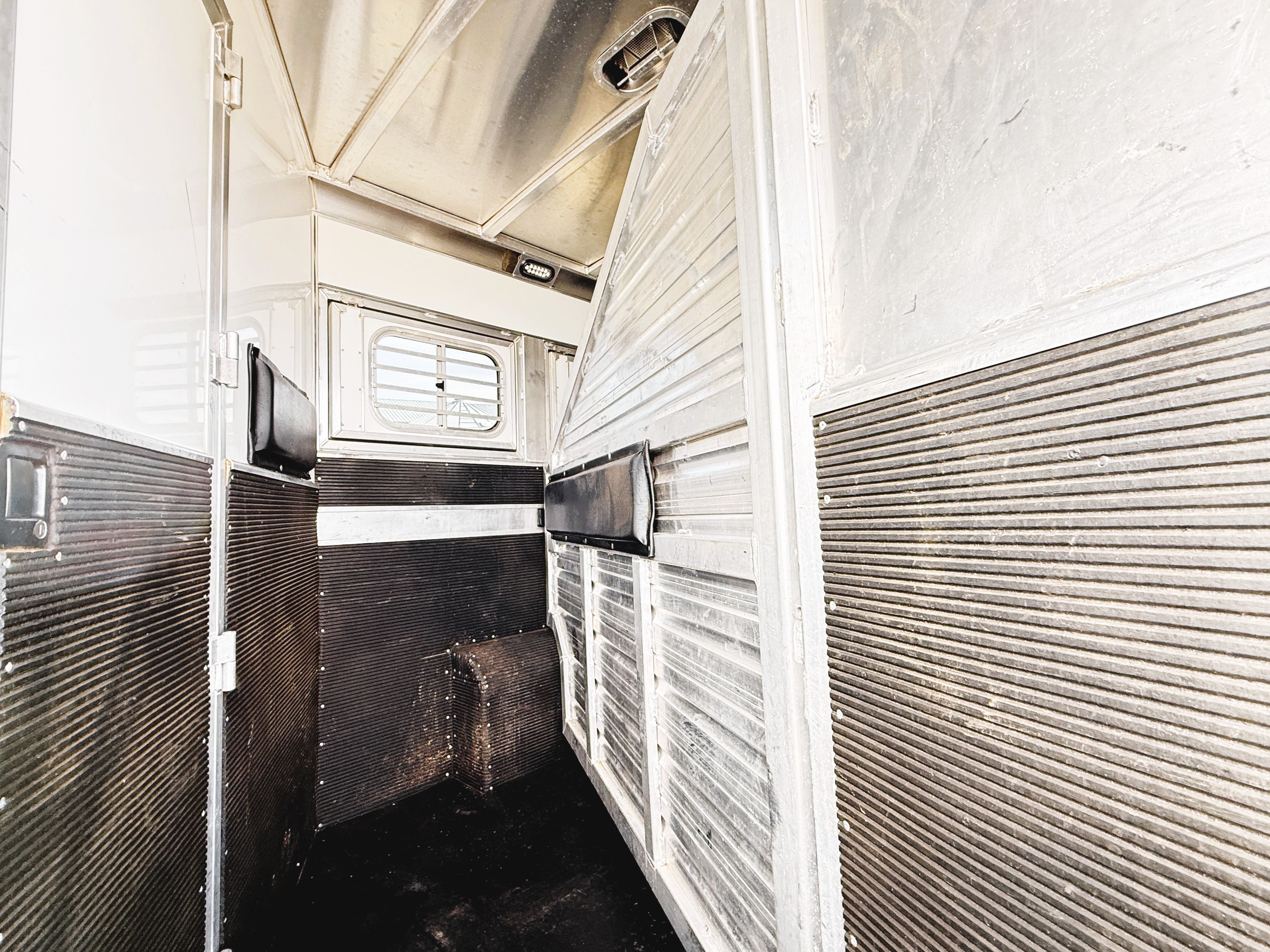 This Elite 4 horse features a Trail Boss Conversions living quarters with a sofa-sleeper, corner chair, entertainment center, queen-sized bed, and a full kitchen with a large refrigerator, microwave, recessed cook top, and large sink. The fully private bathroom features a radius shower, toilet, large sink with vanity and mirror and plenty of counter space, a closet and a walk-through door into the horse area. The horse compartment has a stud stall in the front slant, a roadside escape door, mangers with under manger storage, padded dividers and rubber kick mats all the way around. The corner rear tack room has a 4-tier saddle rack, blanket bar, brush box and lots of bridle hooks. Additional features include a hydraulic jack, awning, and a hay rack with ladder.