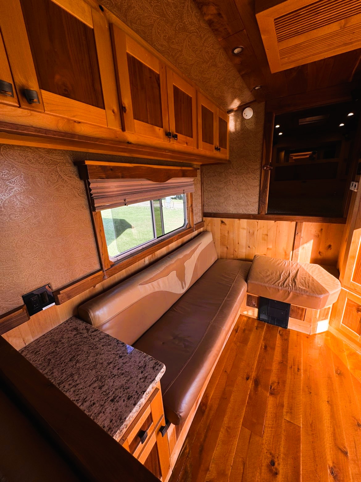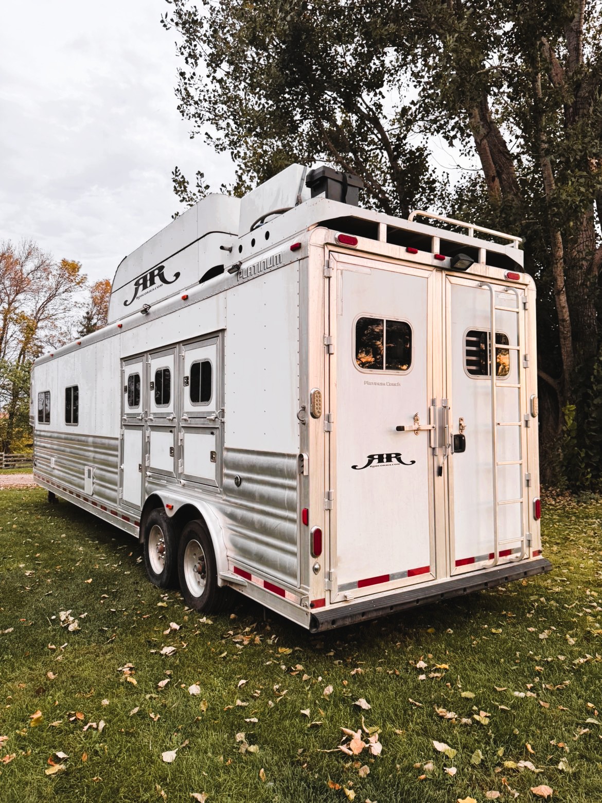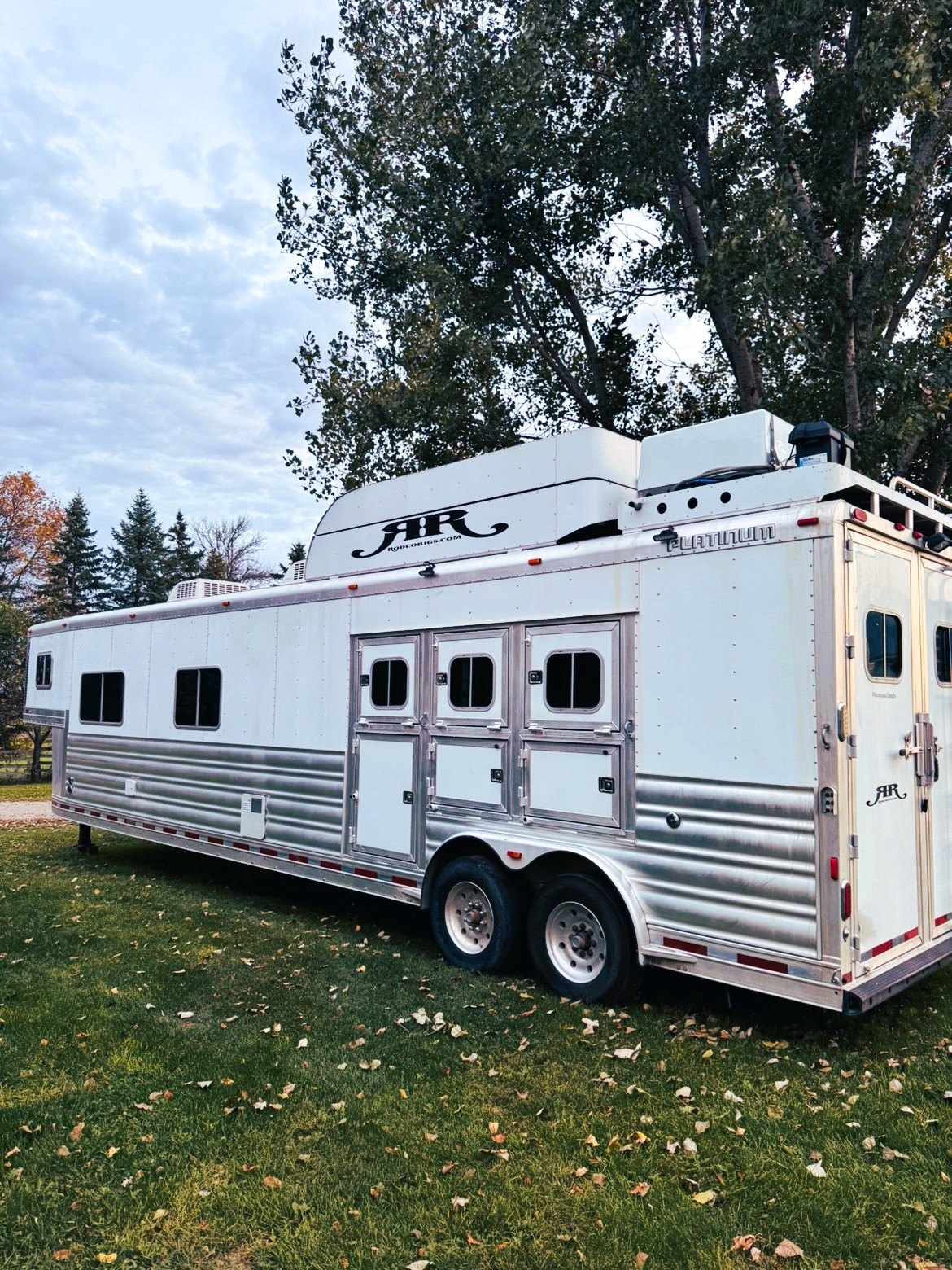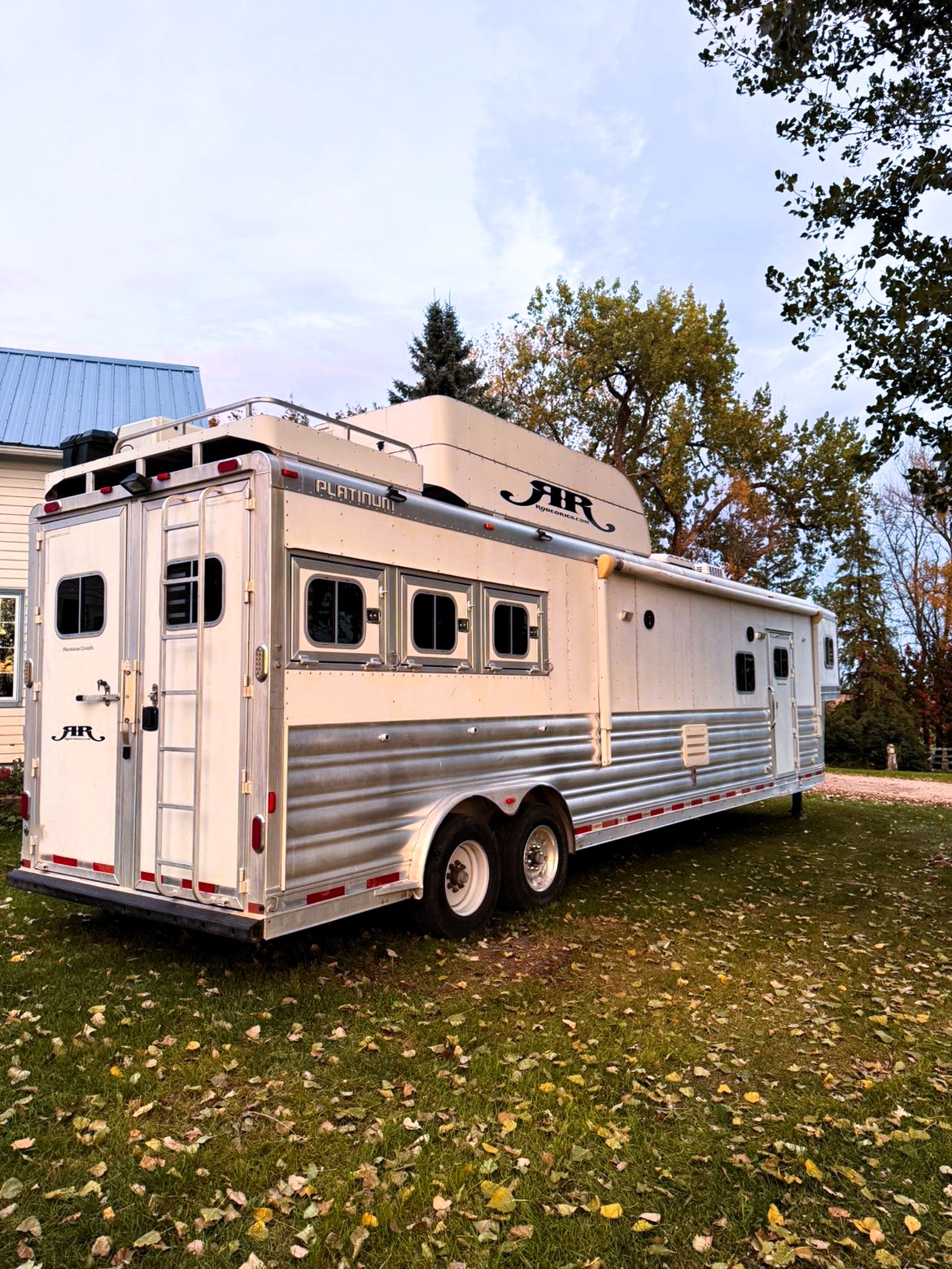 This Platinum 3 horse with a 15' living quarters features a sofa-sleeper and a dinette, a kitchen with a sink, microwave, recessed cook top and a large refrigerator. The bathroom a large radius shower, elegant sink with vanity and mirror, a large closet/storage area and a walk-through door into the horse area. Additional features include a hay pod with ladder, generator, awning and dual hydraulic jack. This trailer has a floor length of 32'.
