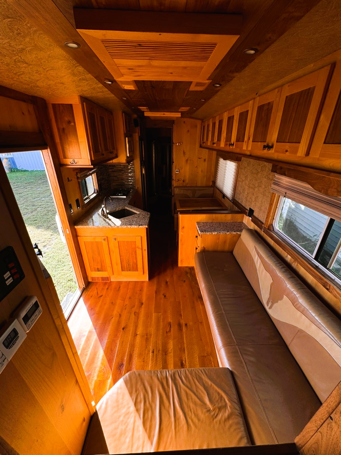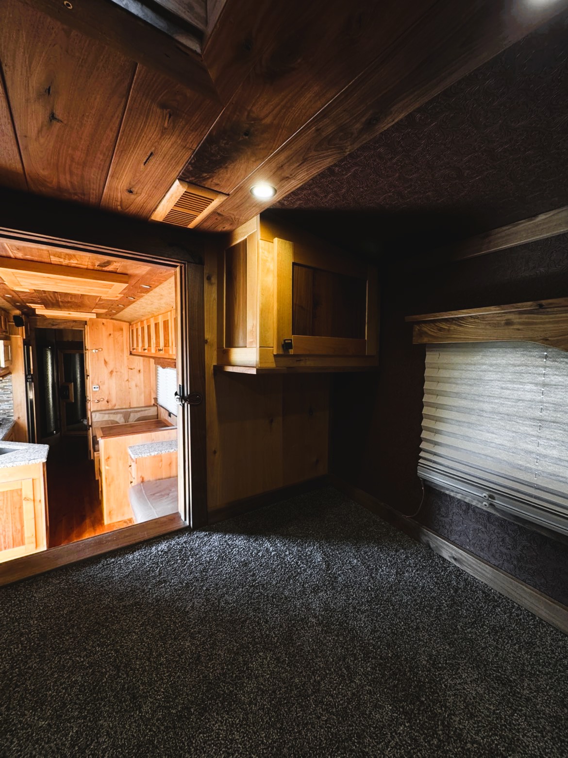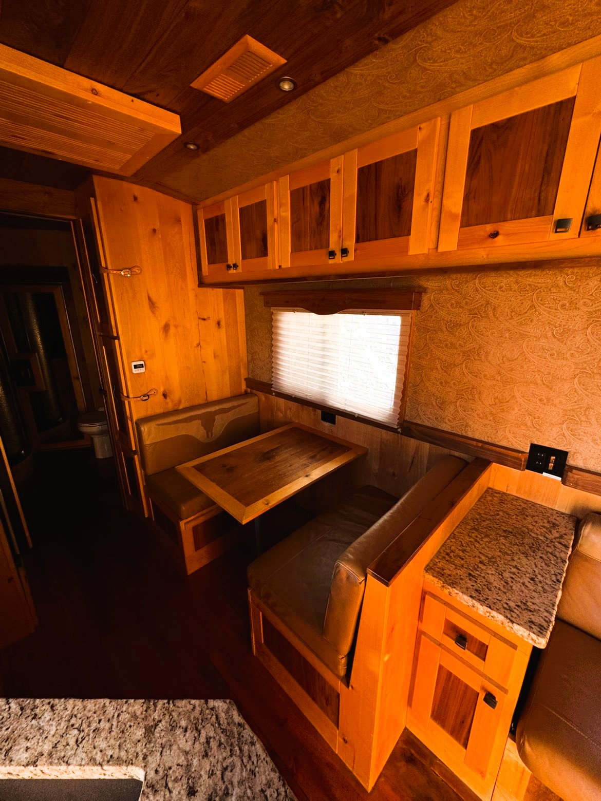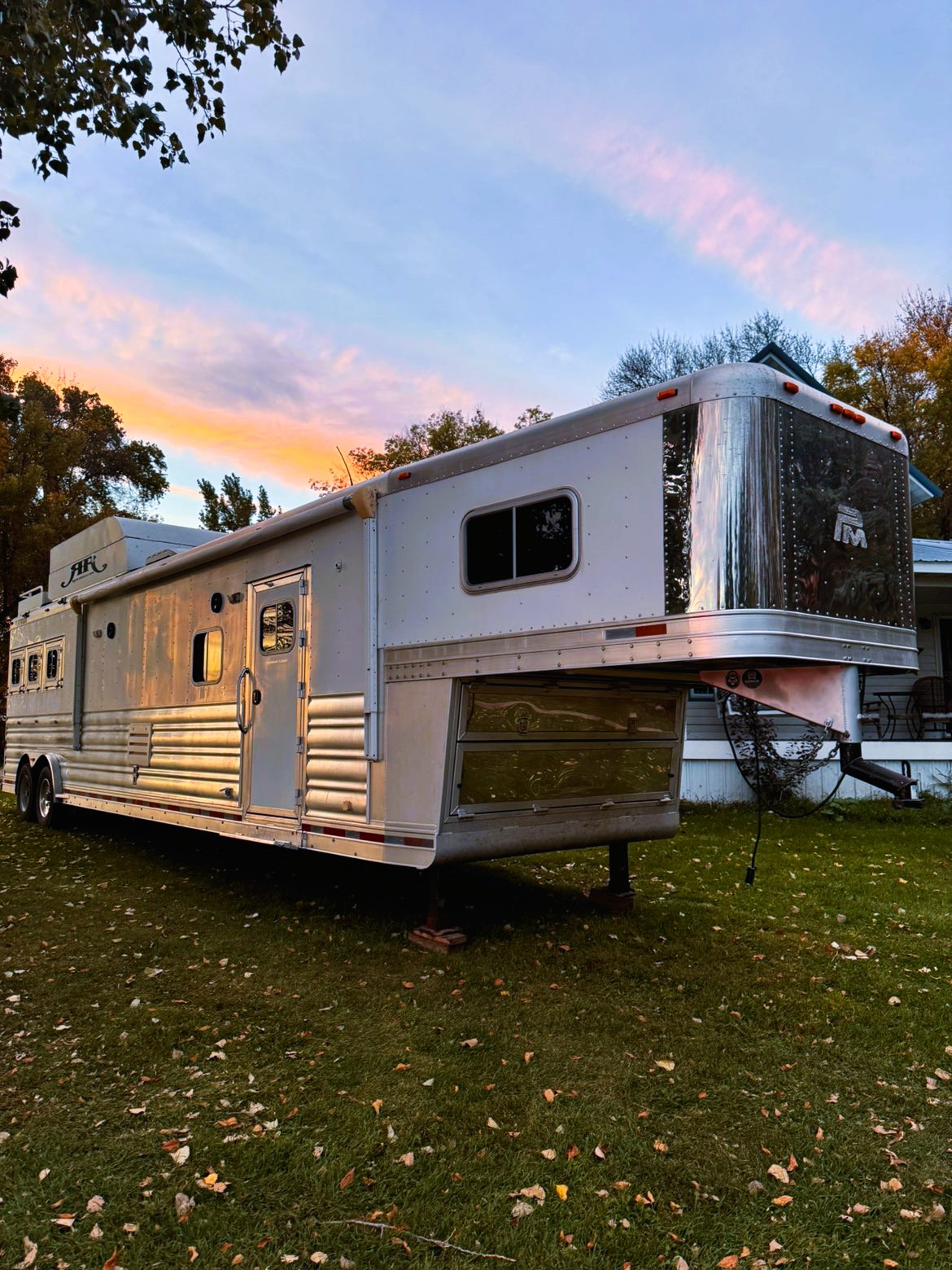 This Platinum 3 horse with a 15' living quarters features a sofa-sleeper and a dinette, a kitchen with a sink, microwave, recessed cook top and a large refrigerator. The bathroom a large radius shower, elegant sink with vanity and mirror, a large closet/storage area and a walk-through door into the horse area. Additional features include a hay pod with ladder, generator, awning and dual hydraulic jack. This trailer has a floor length of 32'.