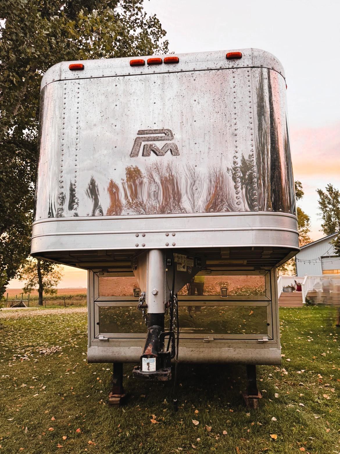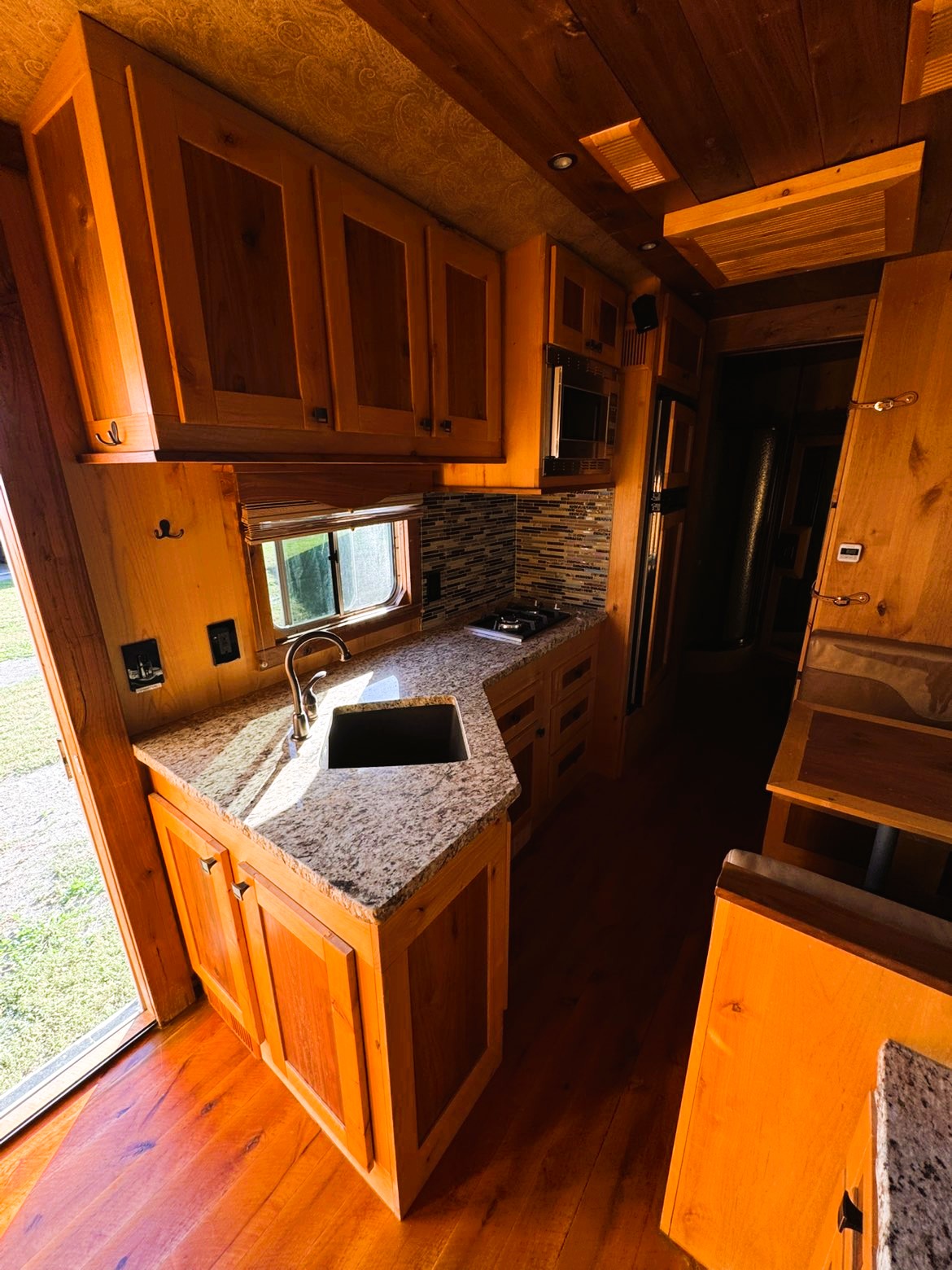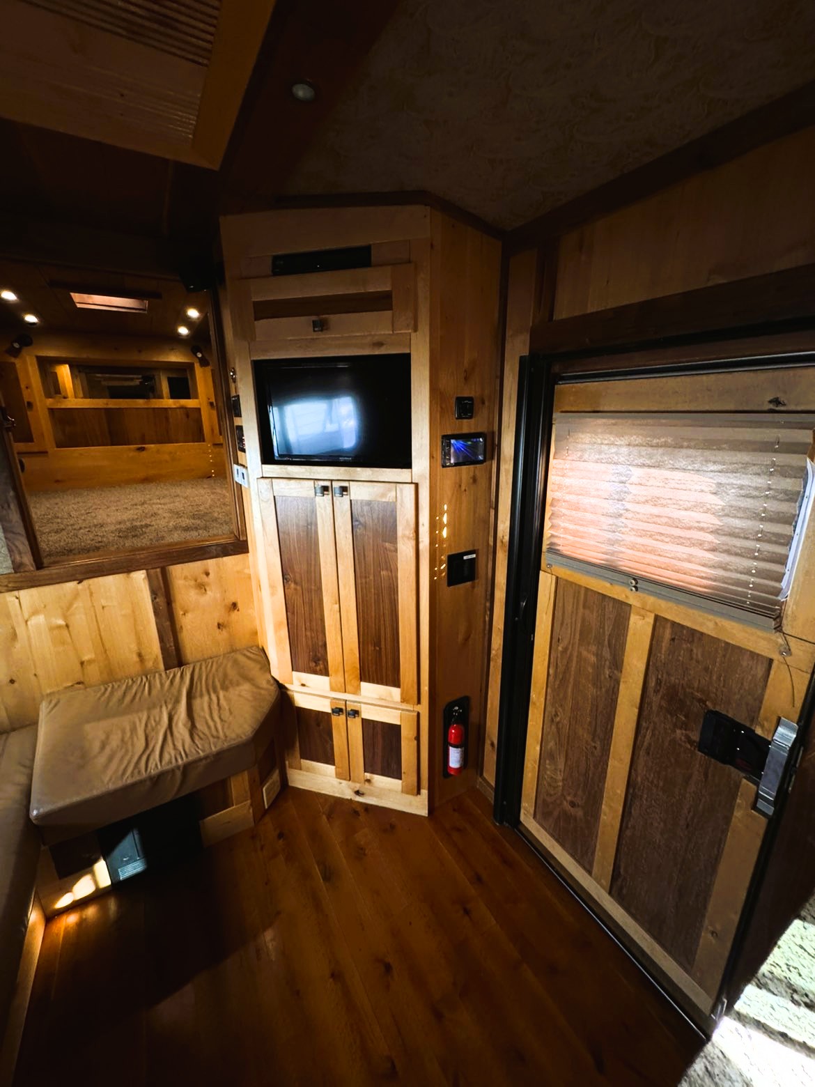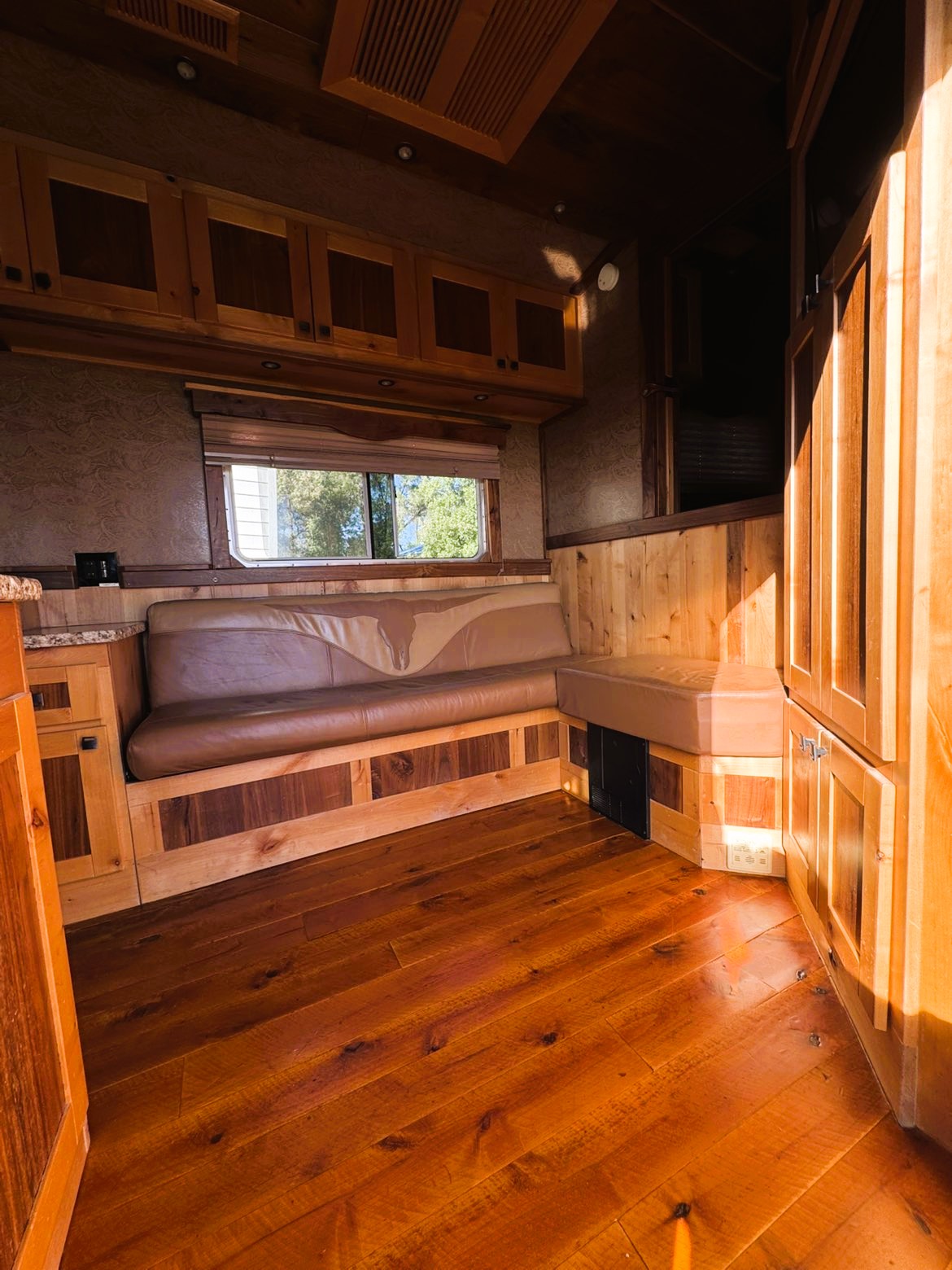 This Platinum 3 horse with a 15' living quarters features a sofa-sleeper and a dinette, a kitchen with a sink, microwave, recessed cook top and a large refrigerator. The bathroom a large radius shower, elegant sink with vanity and mirror, a large closet/storage area and a walk-through door into the horse area. Additional features include a hay pod with ladder, generator, awning and dual hydraulic jack. This trailer has a floor length of 32'.
