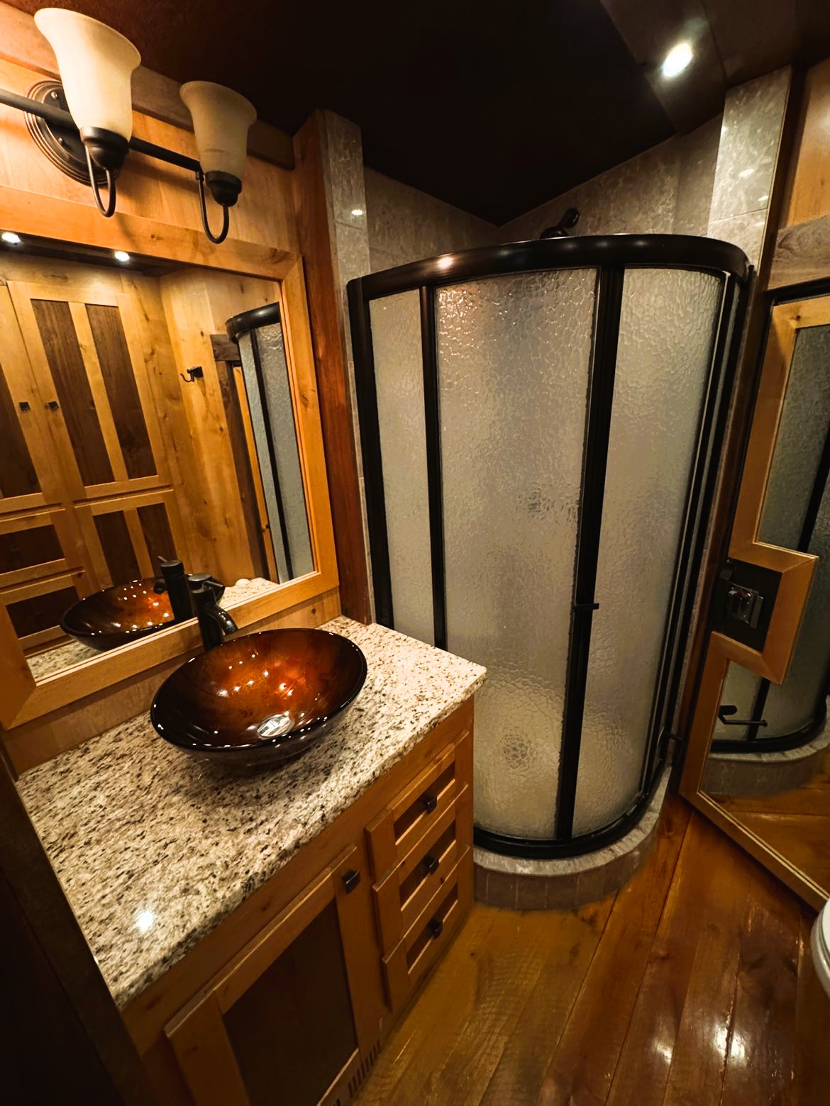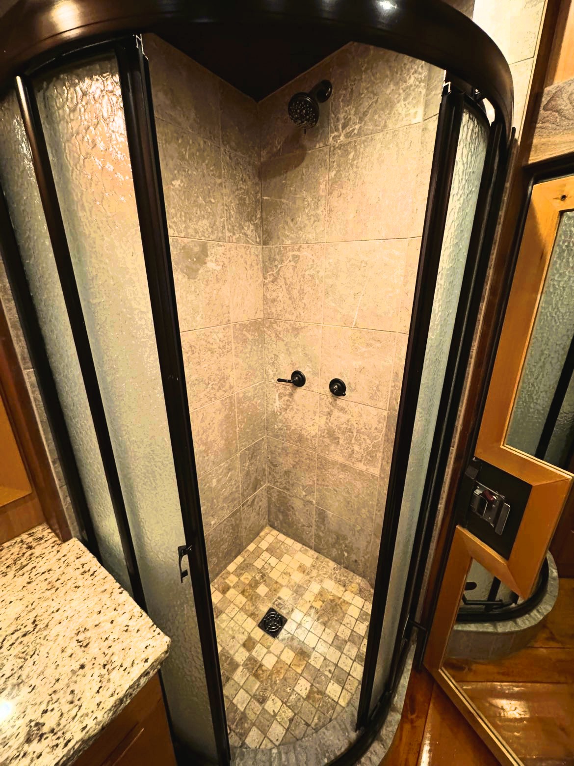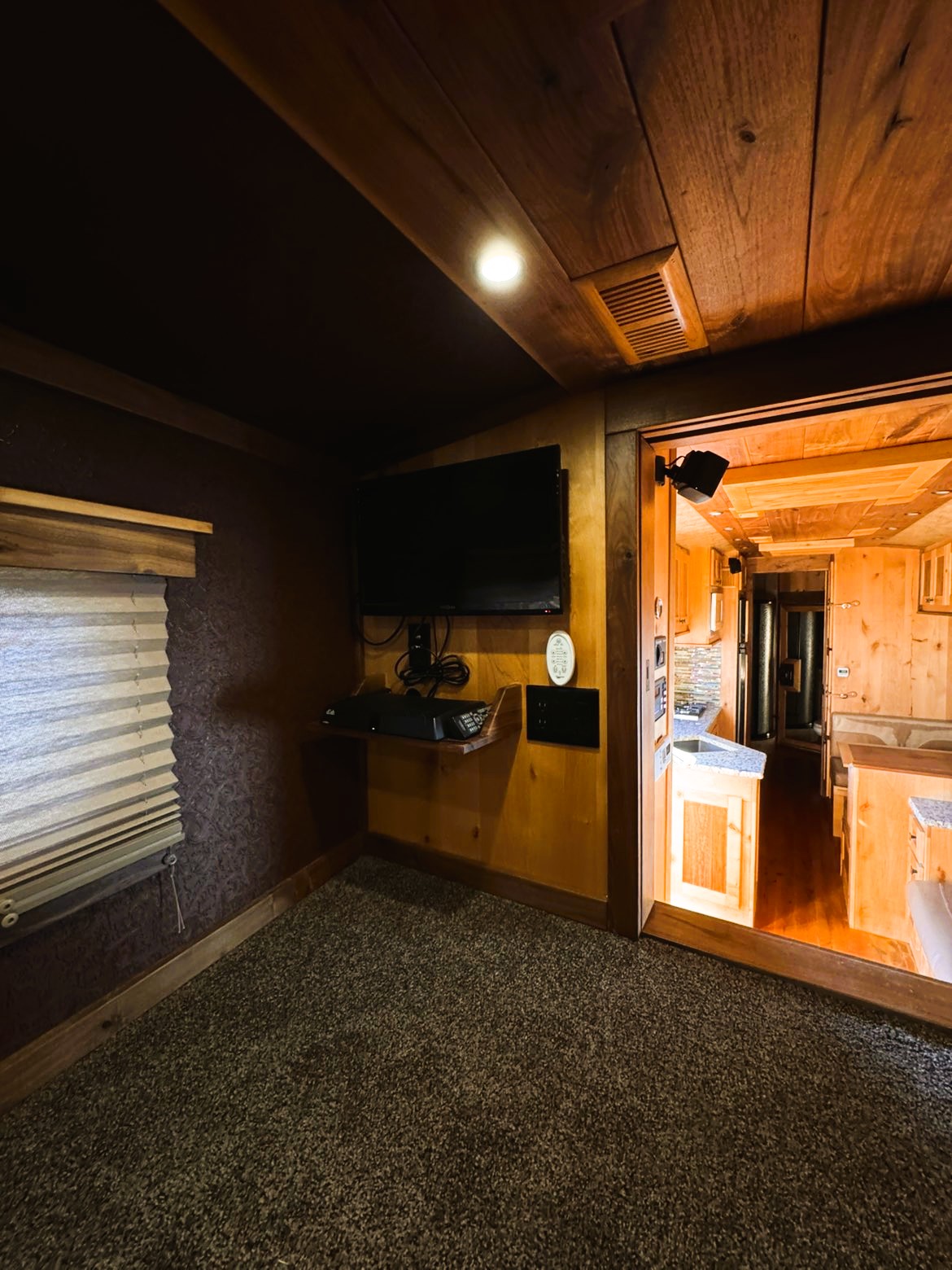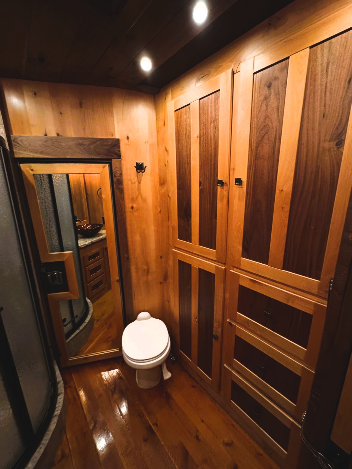 This Platinum 3 horse with a 15' living quarters features a sofa-sleeper and a dinette, a kitchen with a sink, microwave, recessed cook top and a large refrigerator. The bathroom a large radius shower, elegant sink with vanity and mirror, a large closet/storage area and a walk-through door into the horse area. Additional features include a hay pod with ladder, generator, awning and dual hydraulic jack. This trailer has a floor length of 32'.