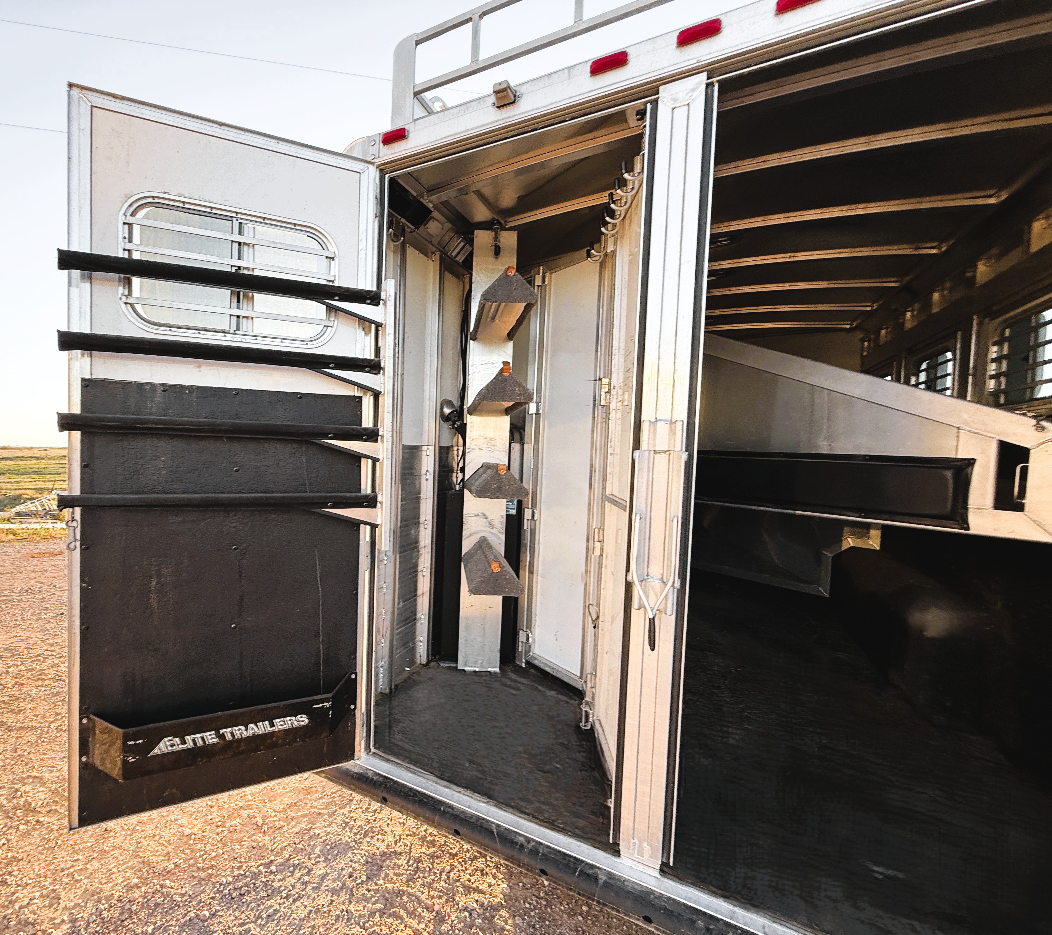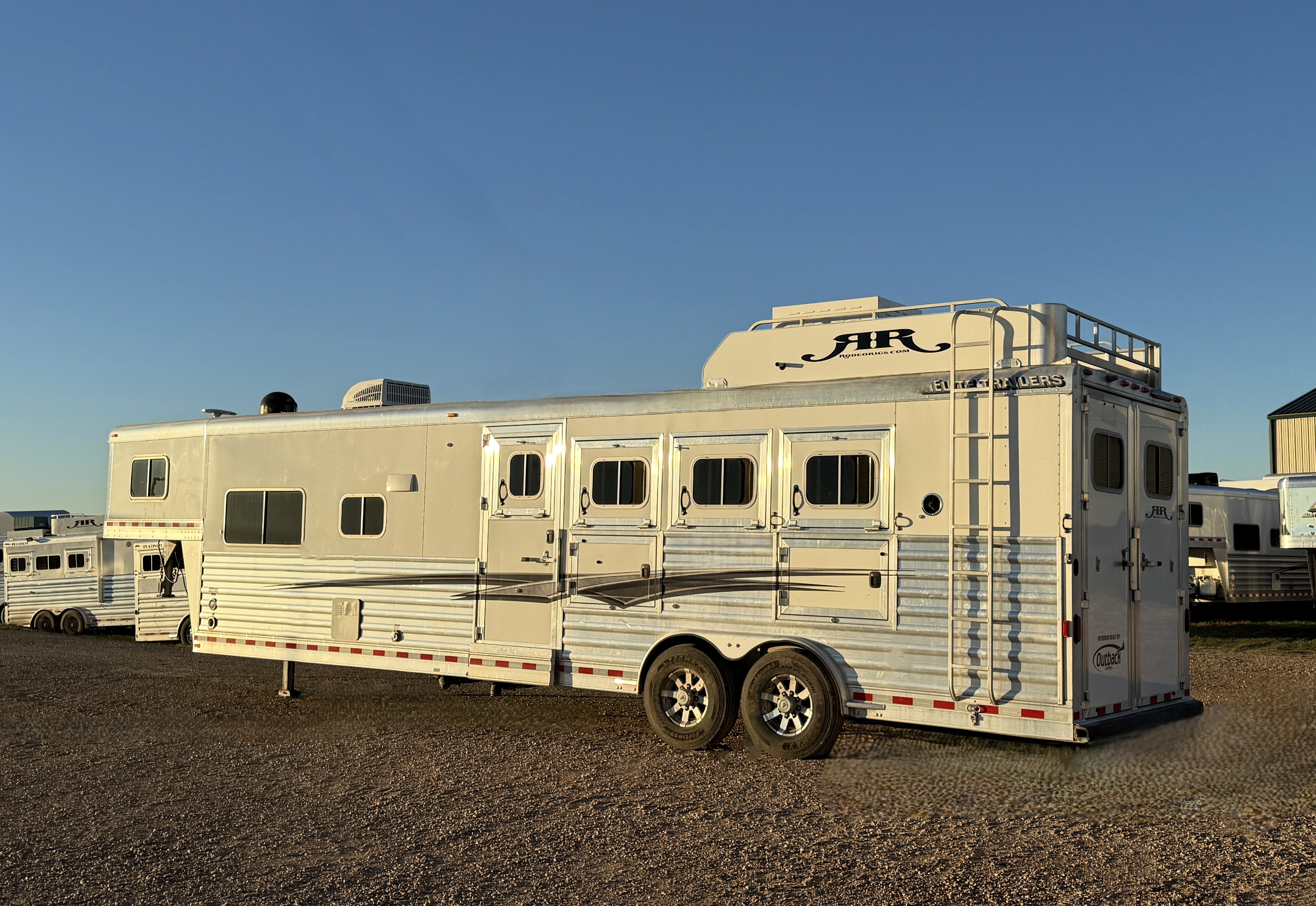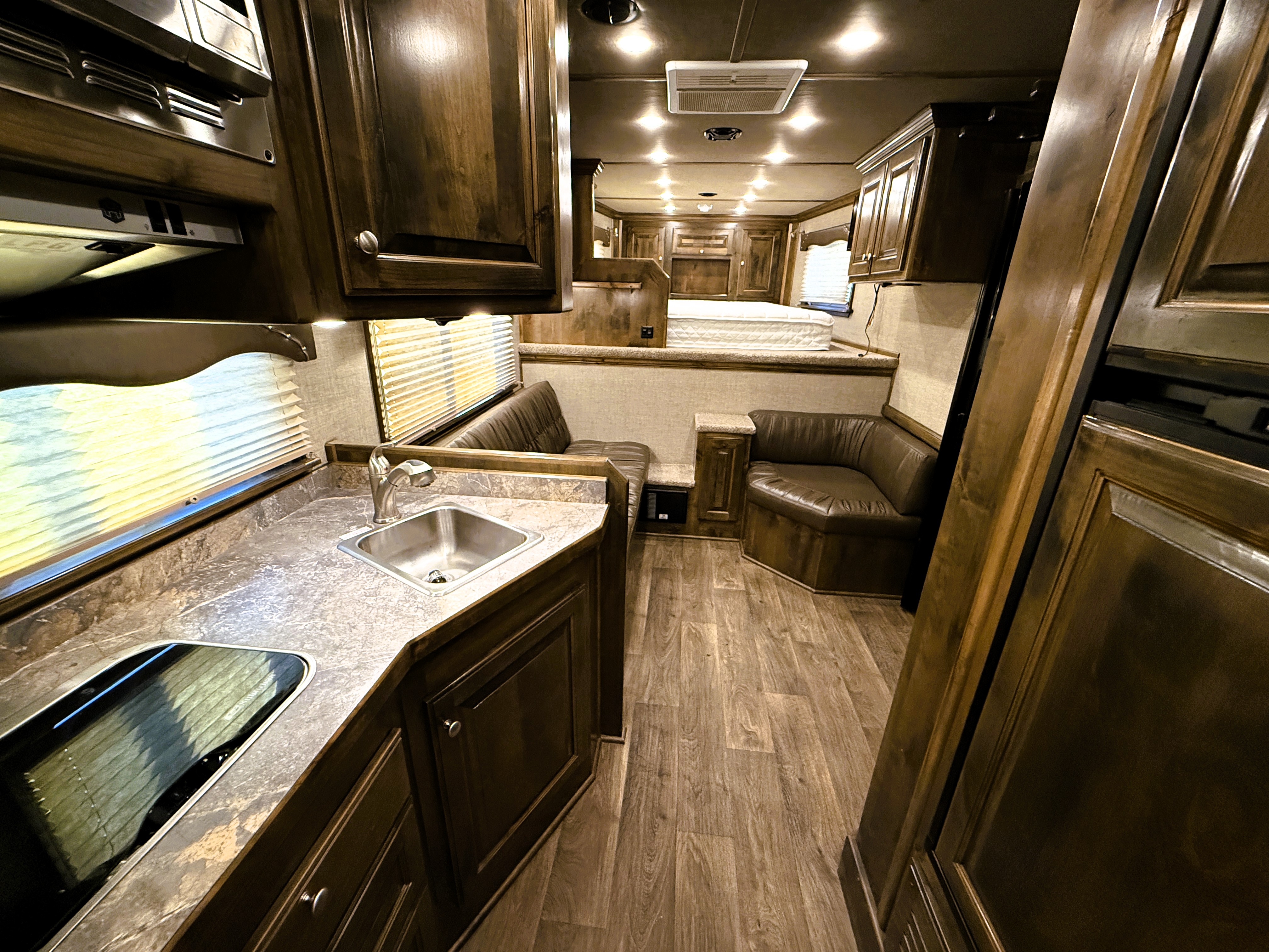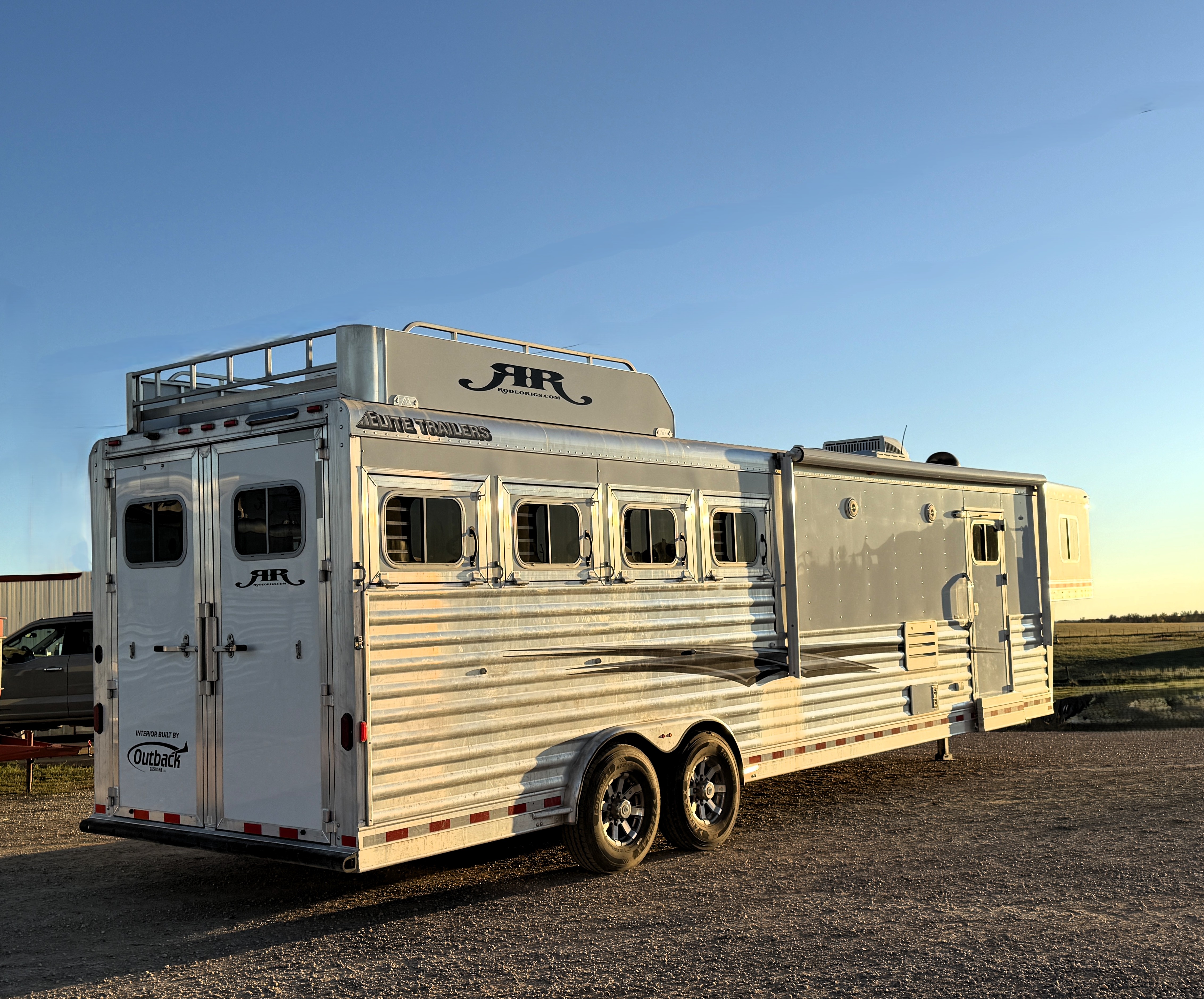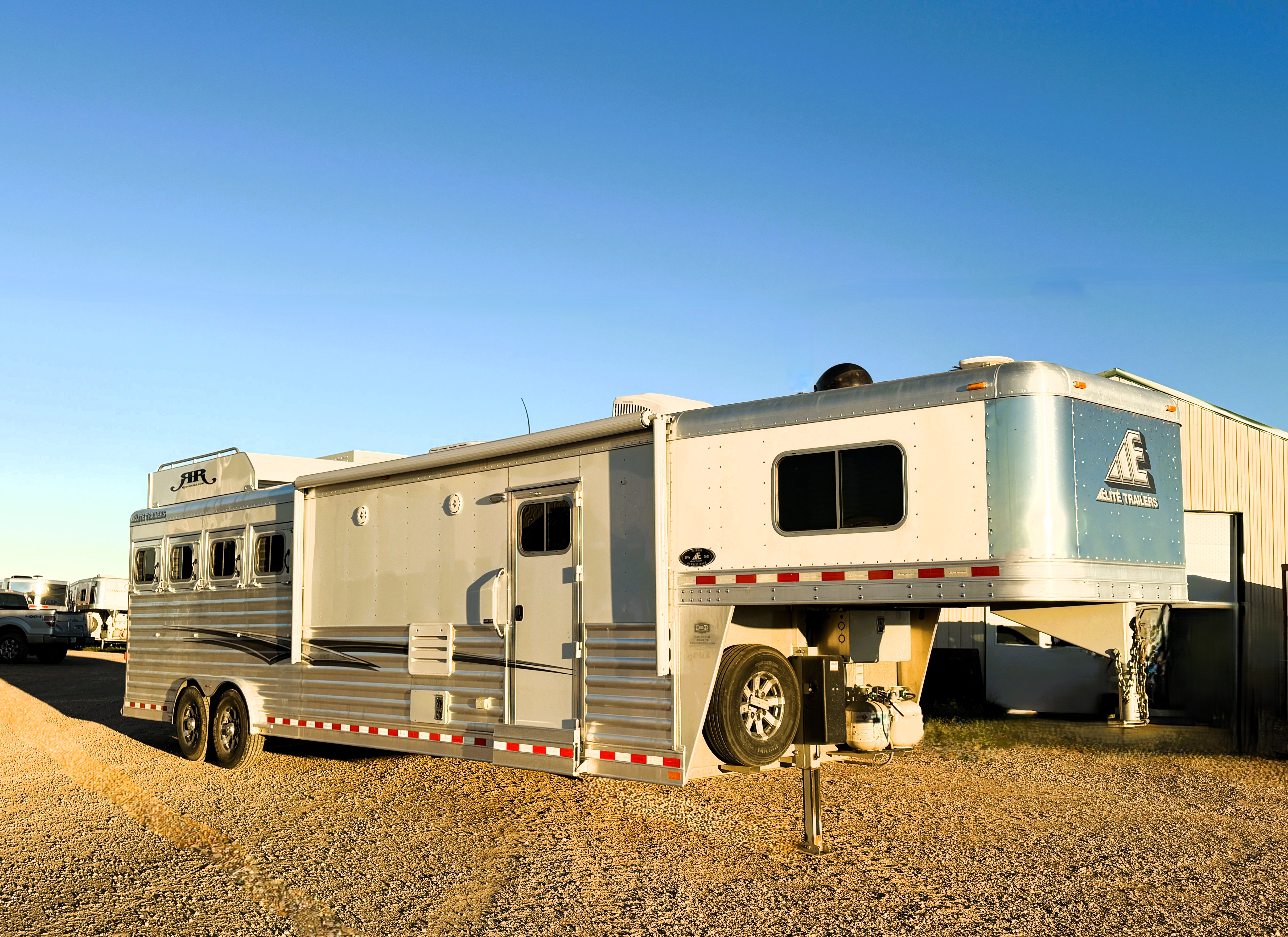 This Elite 4 horse showcases an Outback Customs interior loaded with a sofa-sleeper with a drop-down bunk, a corner lounge chair, entertainment center, and storage. The bedroom has a queen-sized bed and a hanging closet. The fully equipped kitchen has a large refrigerator, recessed cook-top, microwave, sink and lots of storage. The private bathroom has a large radius shower, toilet, sink with vanity and mirror, closets and a walk-through door into the horse area. The horse compartment has a stud stall in the front slant, mangers with under manger storage, a roadside escape door, and drop-down windows on both sides. The collapsible rear tack has a 4-tier saddle rack, blanket bar, a brush box and lots of bridle hooks. Additions include a hydraulic jack, hay rack with ladder, and an awning. This trailer has a floor length of 30'