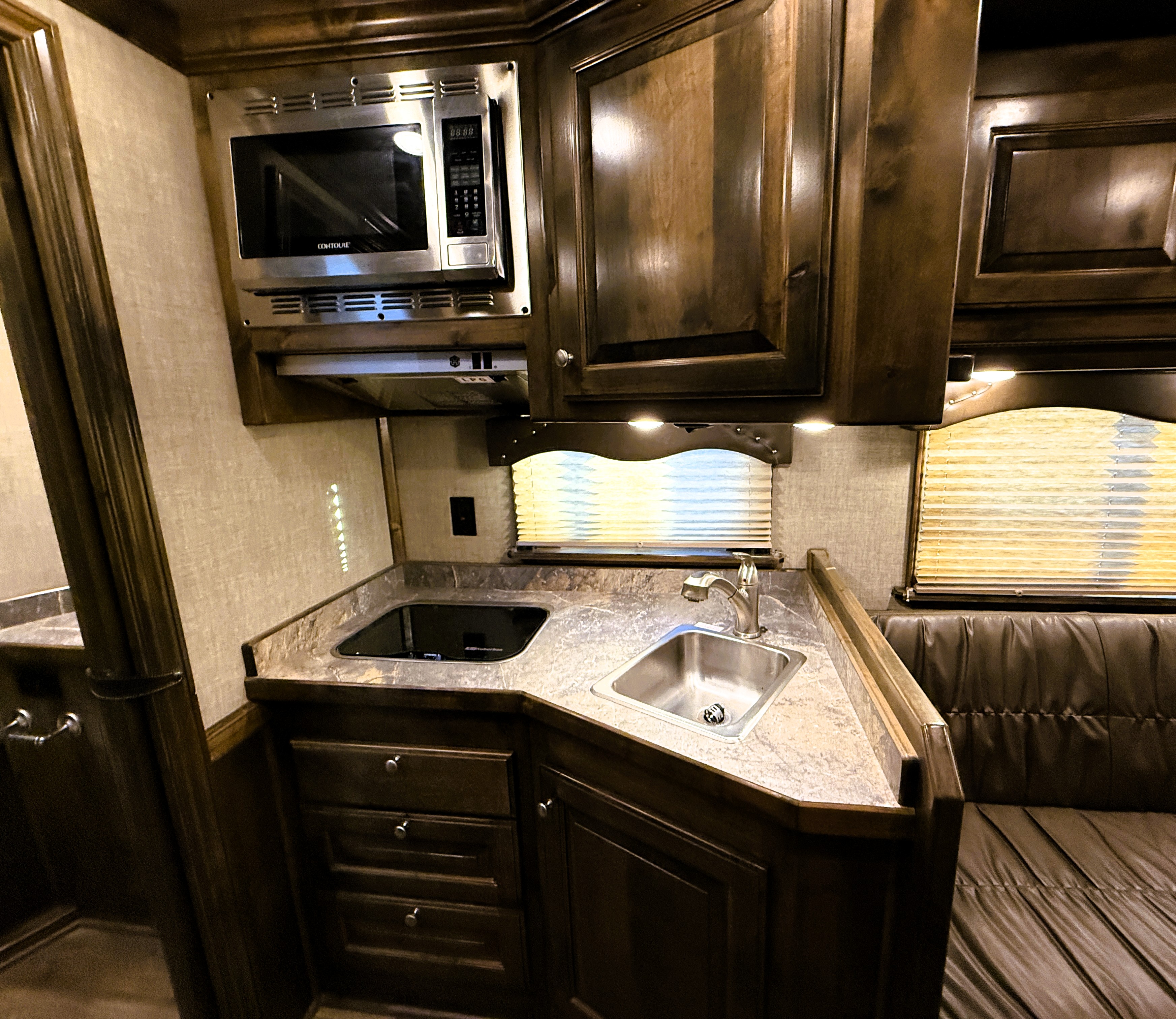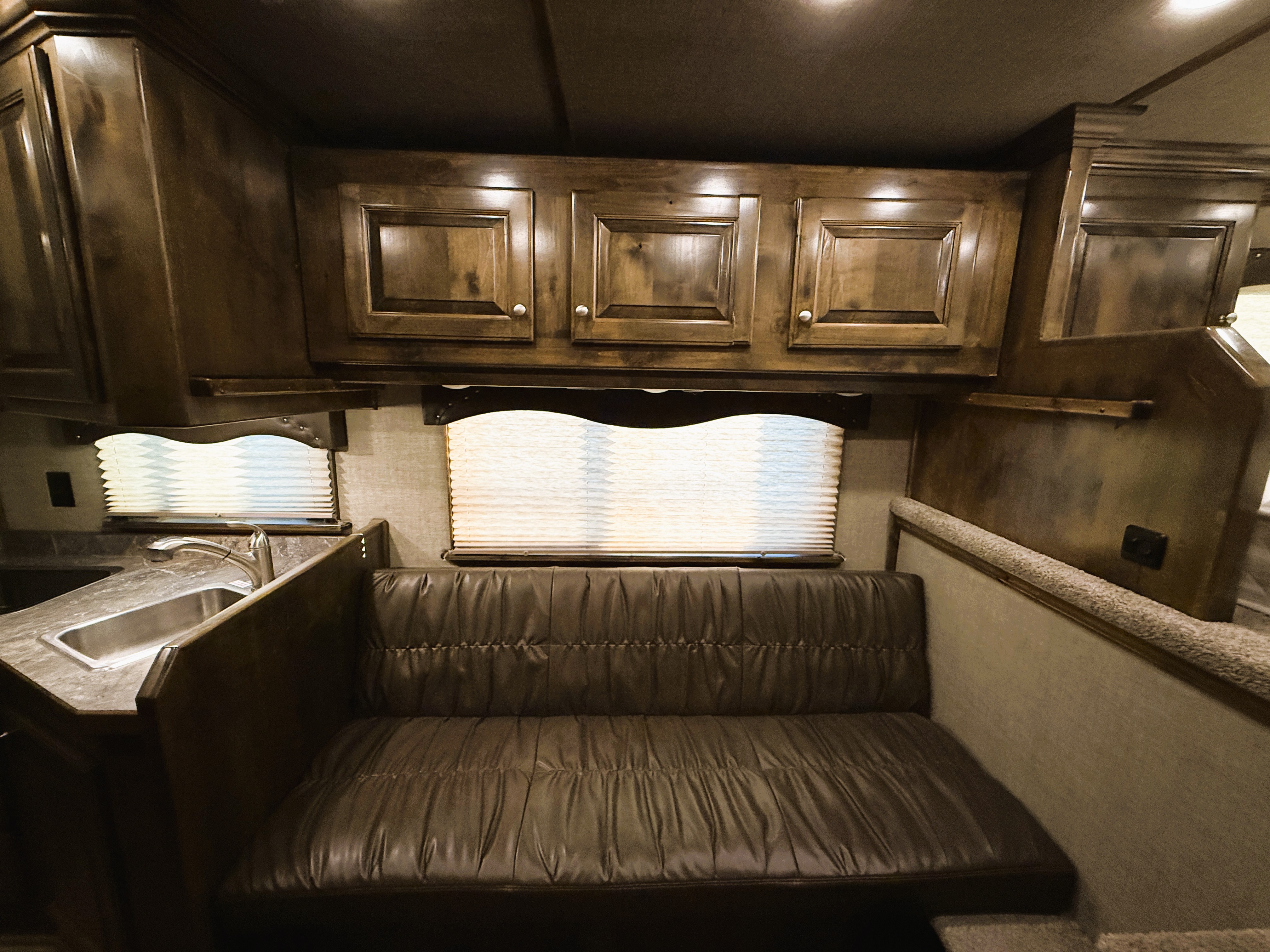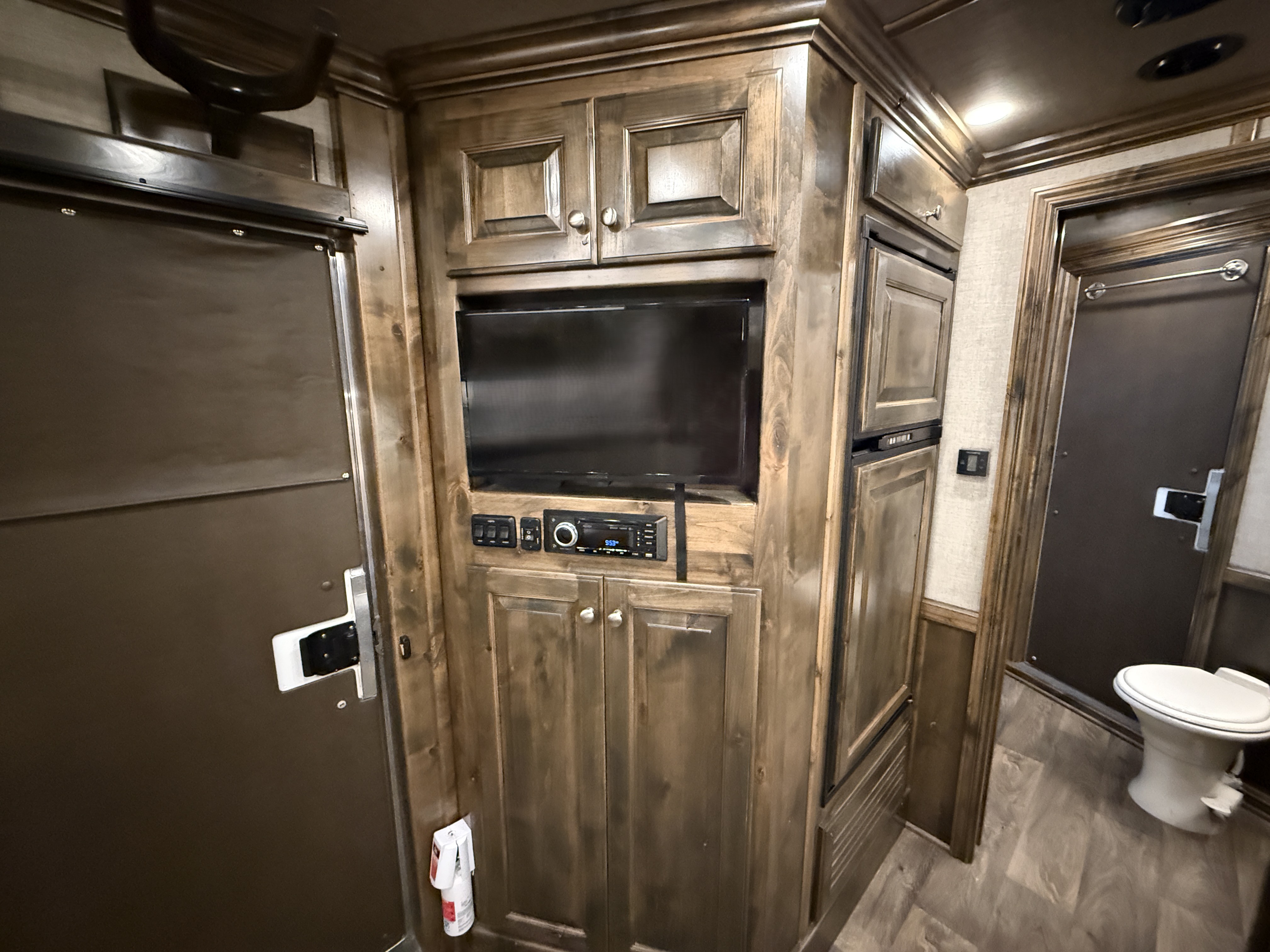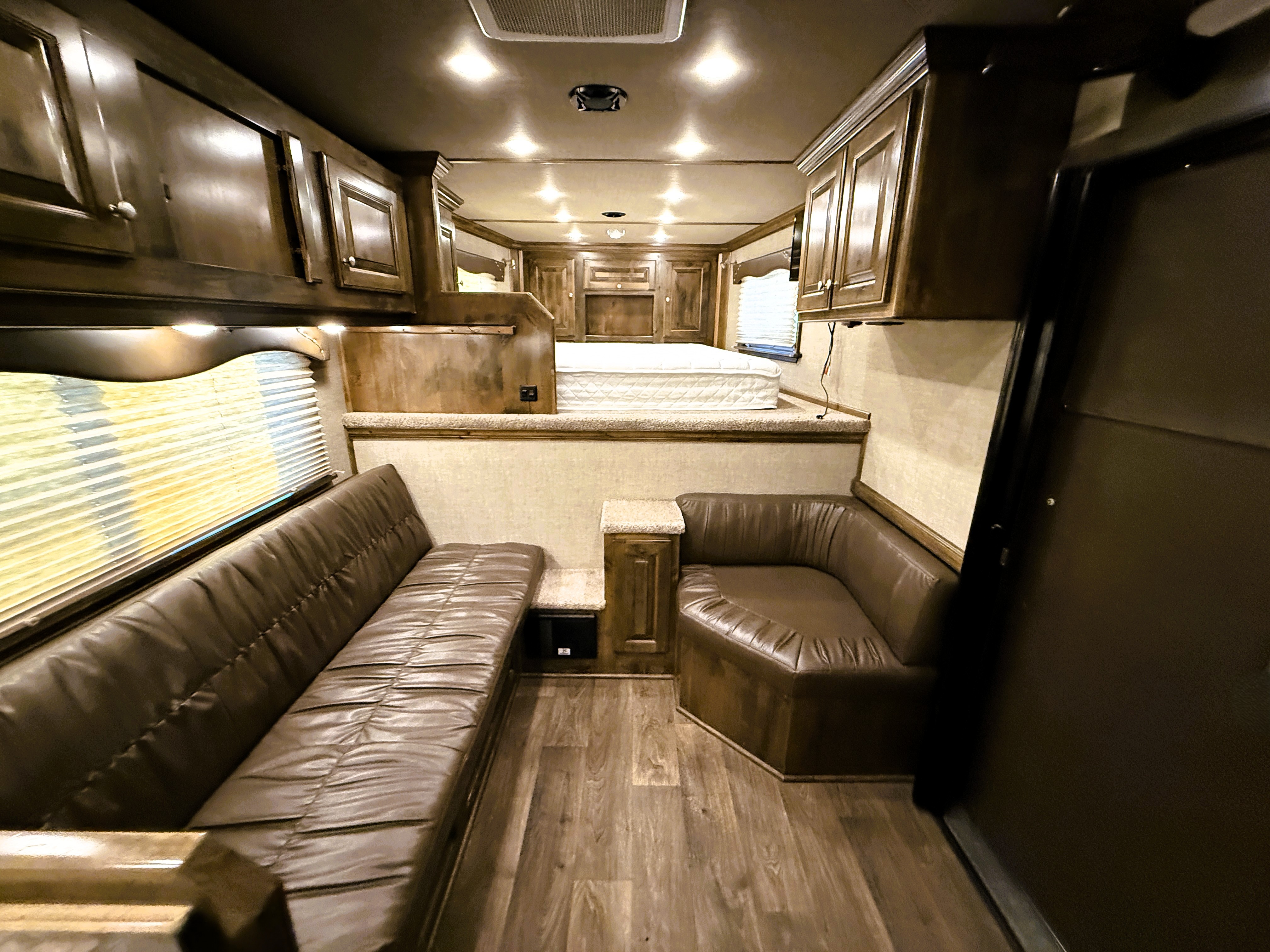 This Elite 4 horse showcases an Outback Customs interior loaded with a sofa-sleeper with a drop-down bunk, a corner lounge chair, entertainment center, and storage. The bedroom has a queen-sized bed and a hanging closet. The fully equipped kitchen has a large refrigerator, recessed cook-top, microwave, sink and lots of storage. The private bathroom has a large radius shower, toilet, sink with vanity and mirror, closets and a walk-through door into the horse area. The horse compartment has a stud stall in the front slant, mangers with under manger storage, a roadside escape door, and drop-down windows on both sides. The collapsible rear tack has a 4-tier saddle rack, blanket bar, a brush box and lots of bridle hooks. Additions include a hydraulic jack, hay rack with ladder, and an awning. This trailer has a floor length of 30'