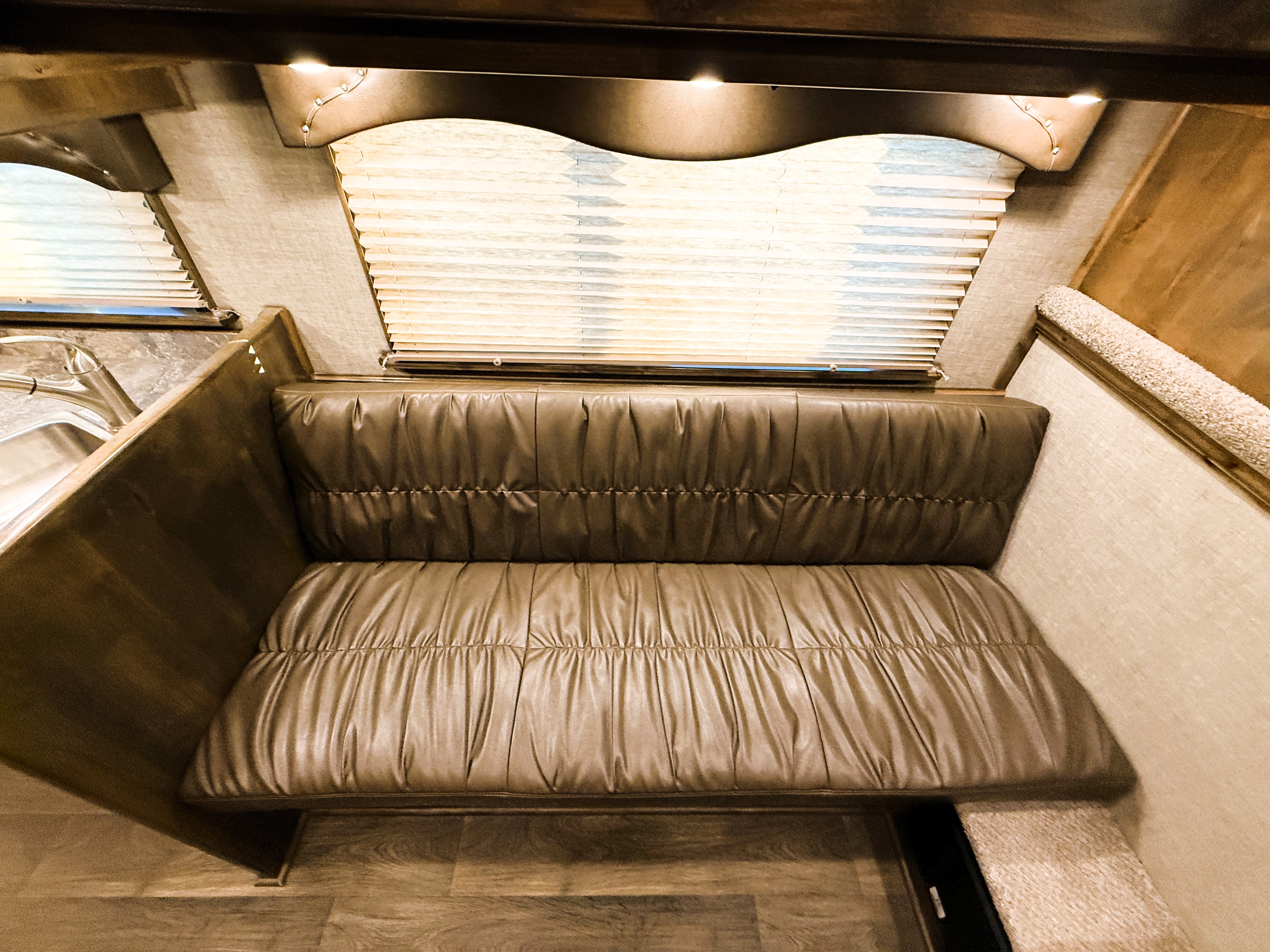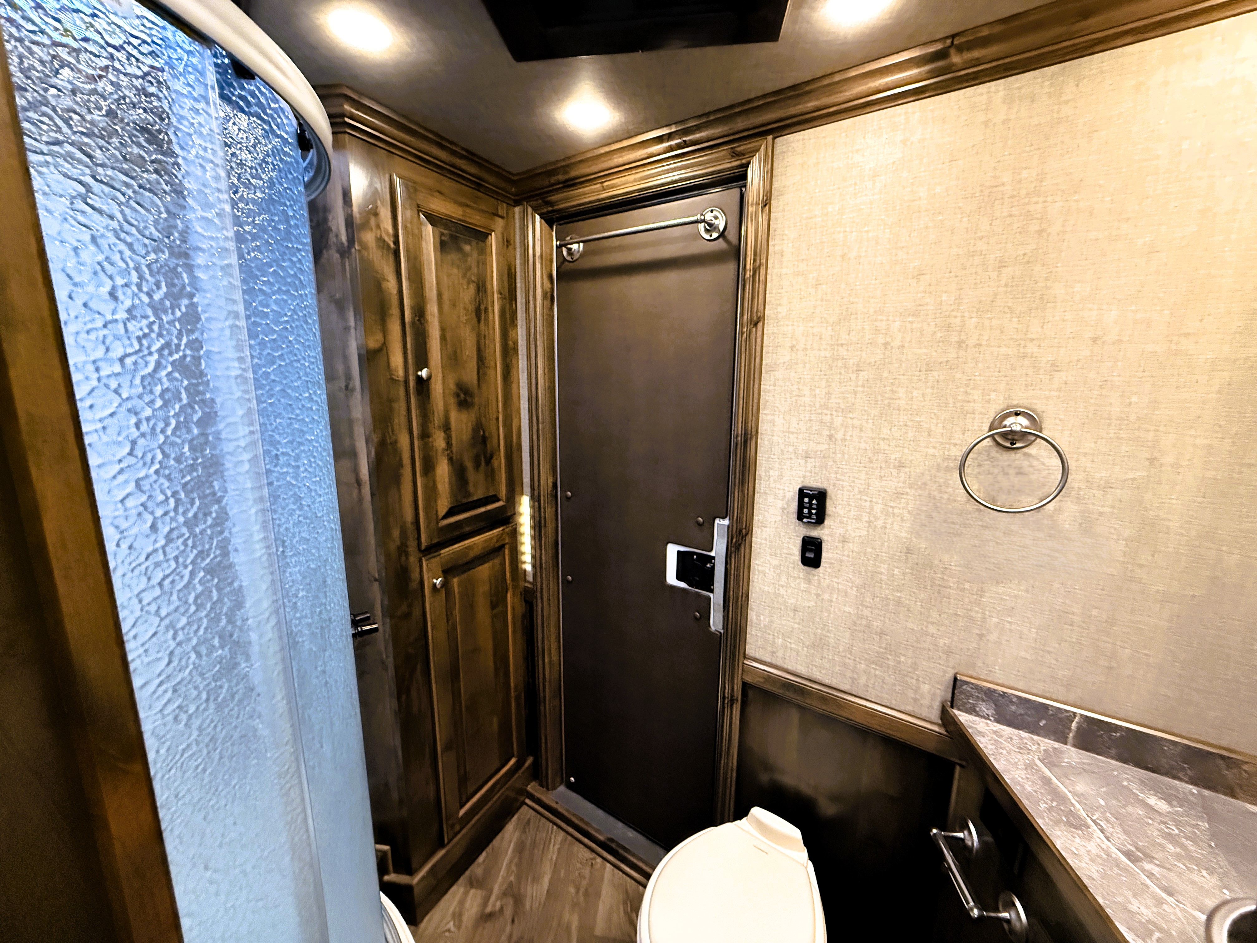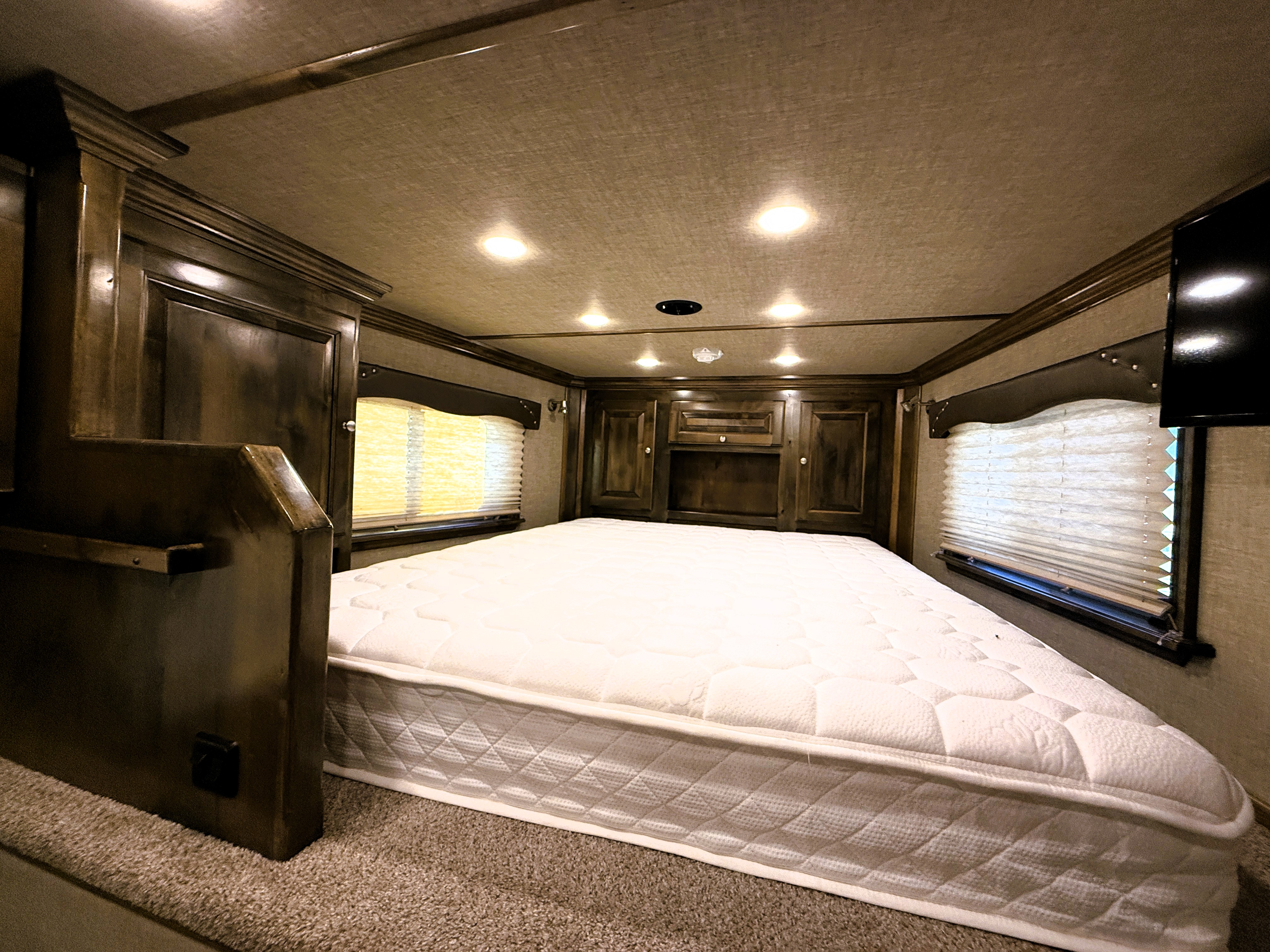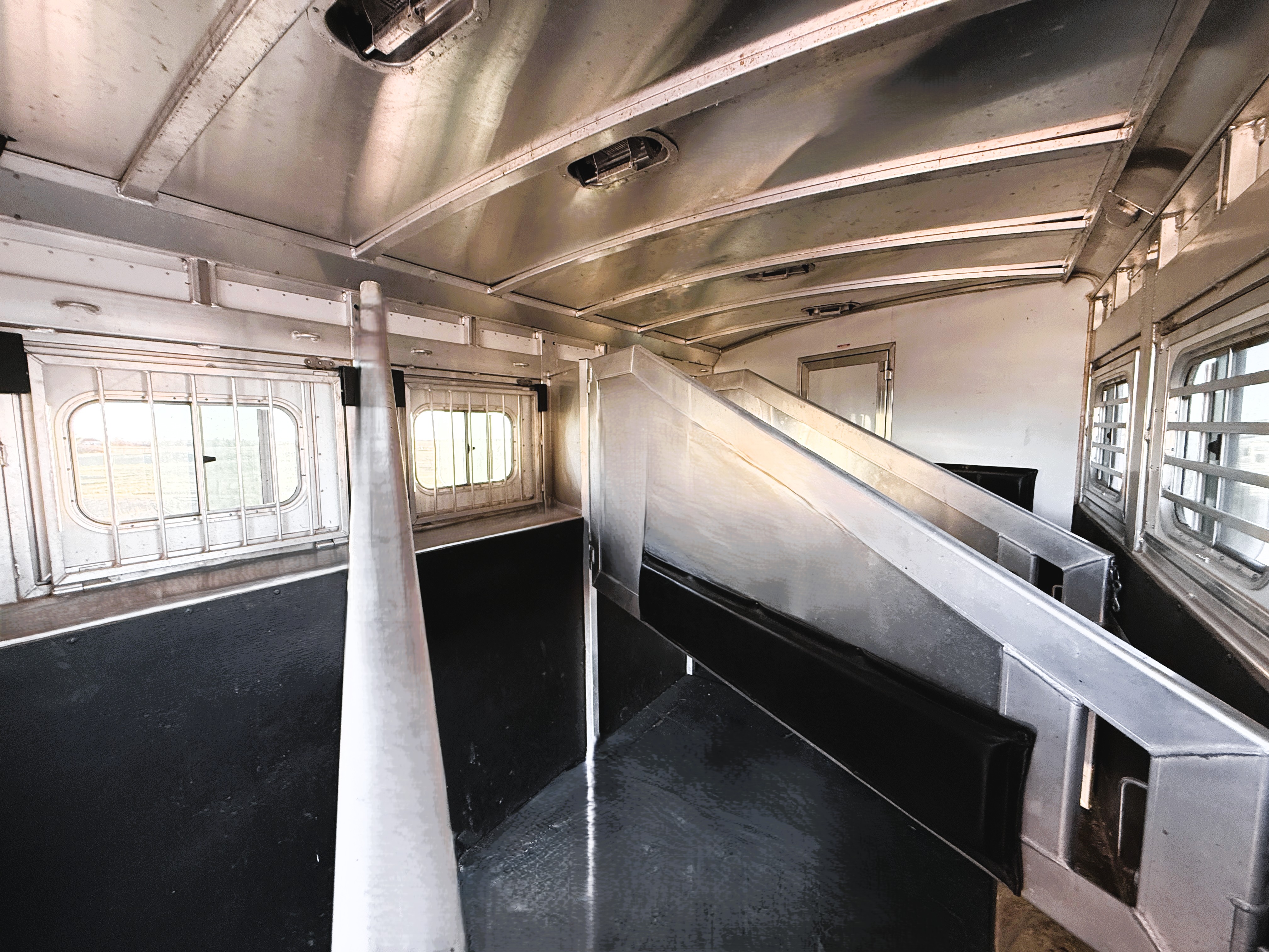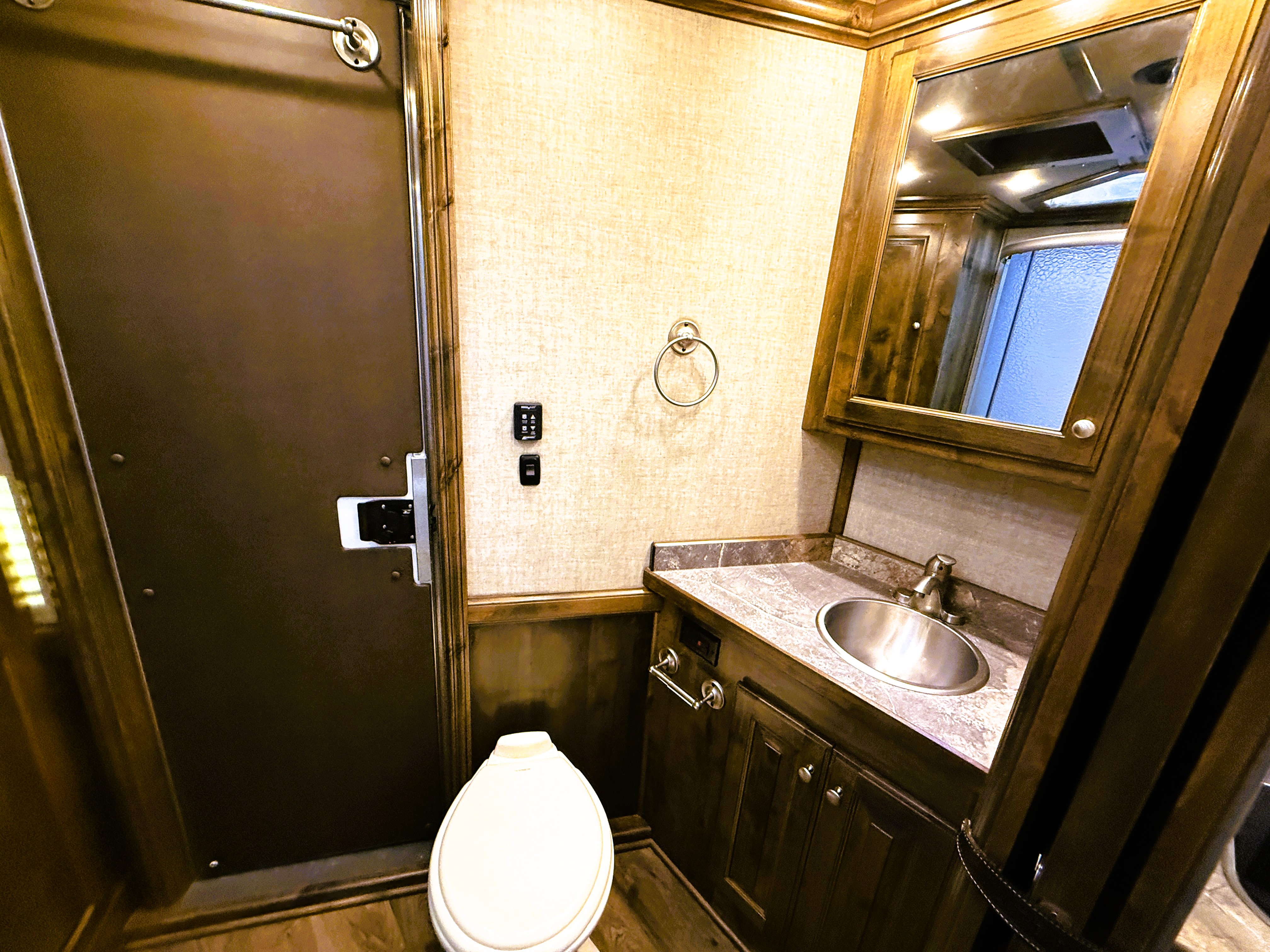 This Elite 4 horse showcases an Outback Customs interior loaded with a sofa-sleeper with a drop-down bunk, a corner lounge chair, entertainment center, and storage. The bedroom has a queen-sized bed and a hanging closet. The fully equipped kitchen has a large refrigerator, recessed cook-top, microwave, sink and lots of storage. The private bathroom has a large radius shower, toilet, sink with vanity and mirror, closets and a walk-through door into the horse area. The horse compartment has a stud stall in the front slant, mangers with under manger storage, a roadside escape door, and drop-down windows on both sides. The collapsible rear tack has a 4-tier saddle rack, blanket bar, a brush box and lots of bridle hooks. Additions include a hydraulic jack, hay rack with ladder, and an awning. This trailer has a floor length of 30'