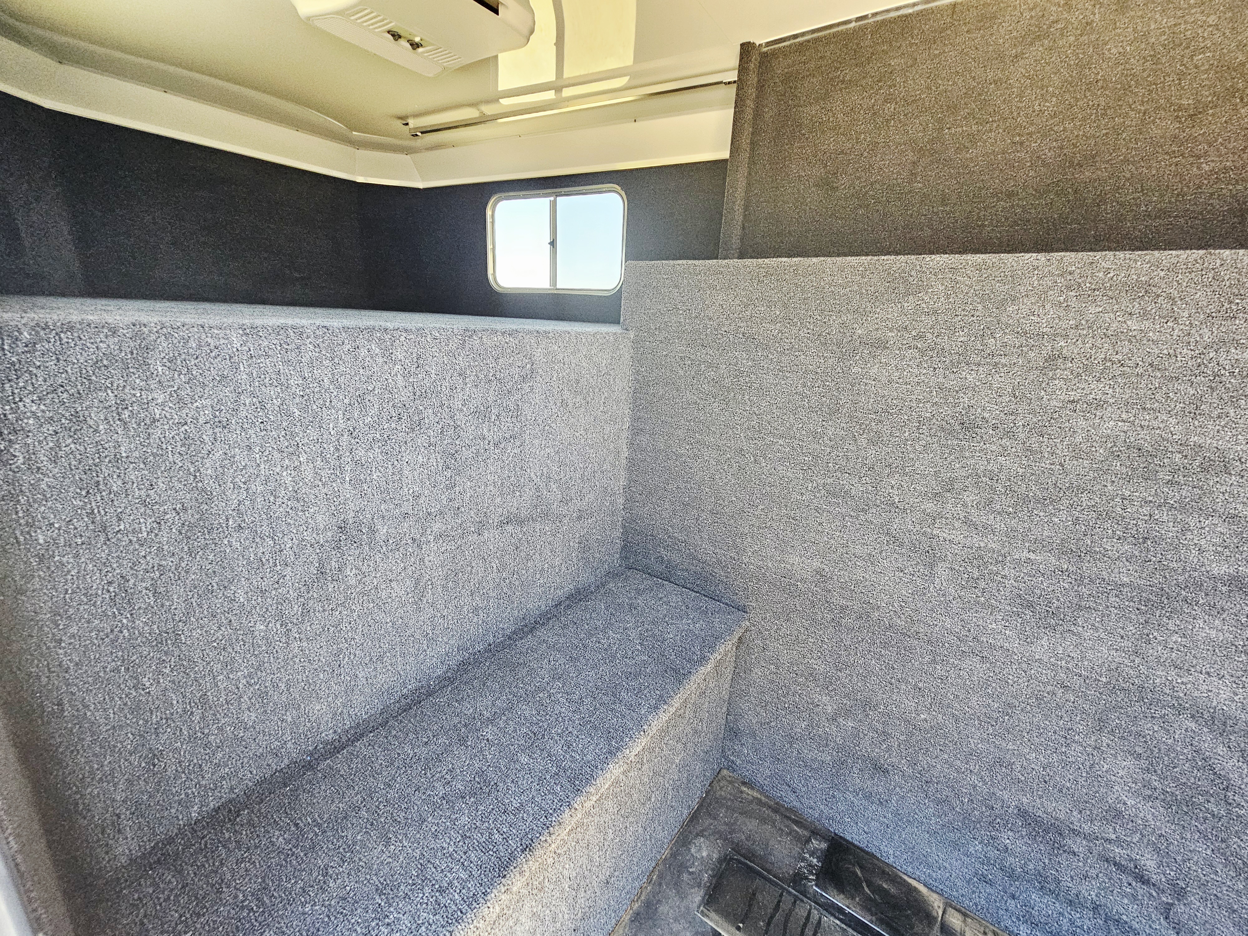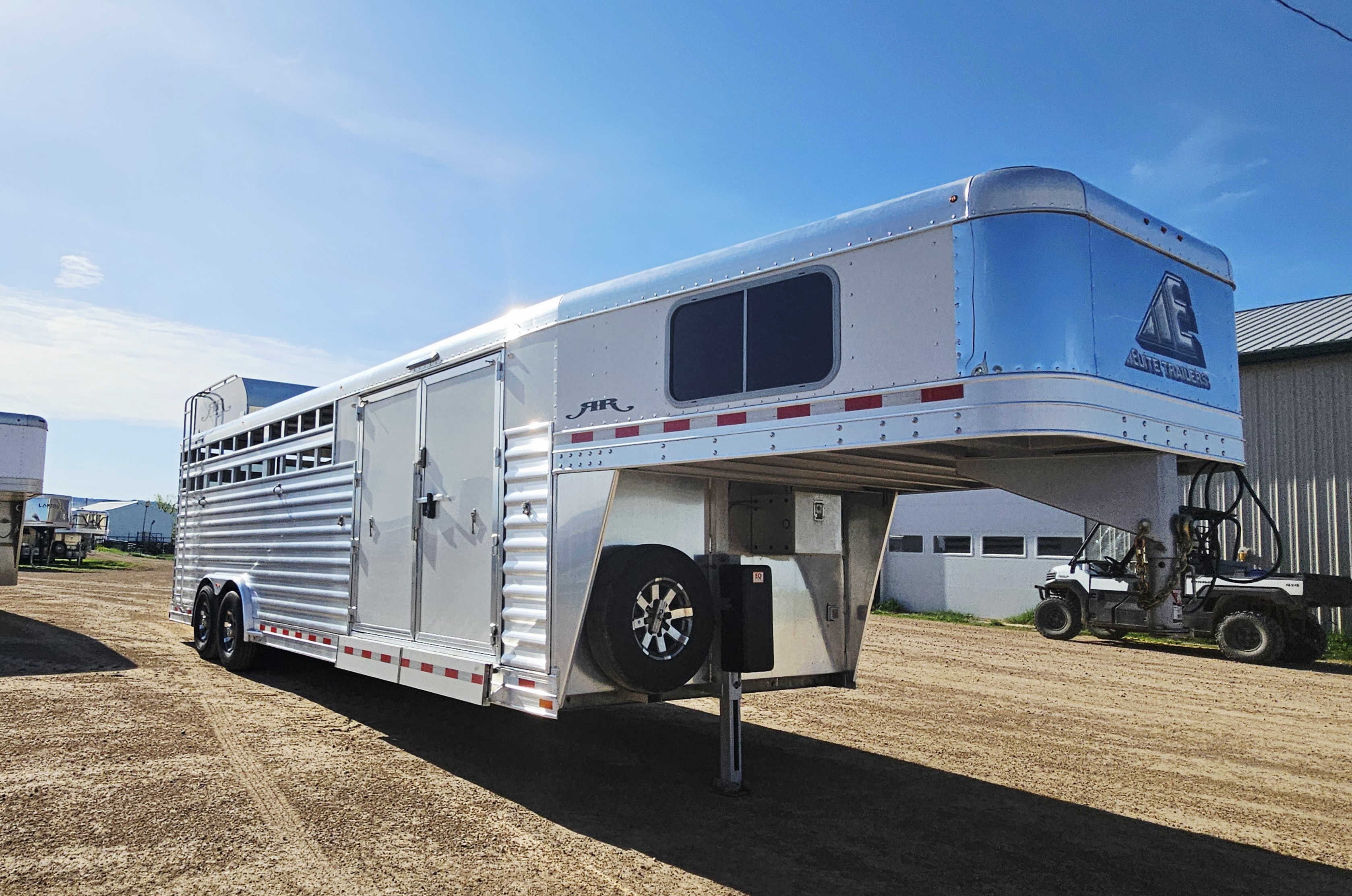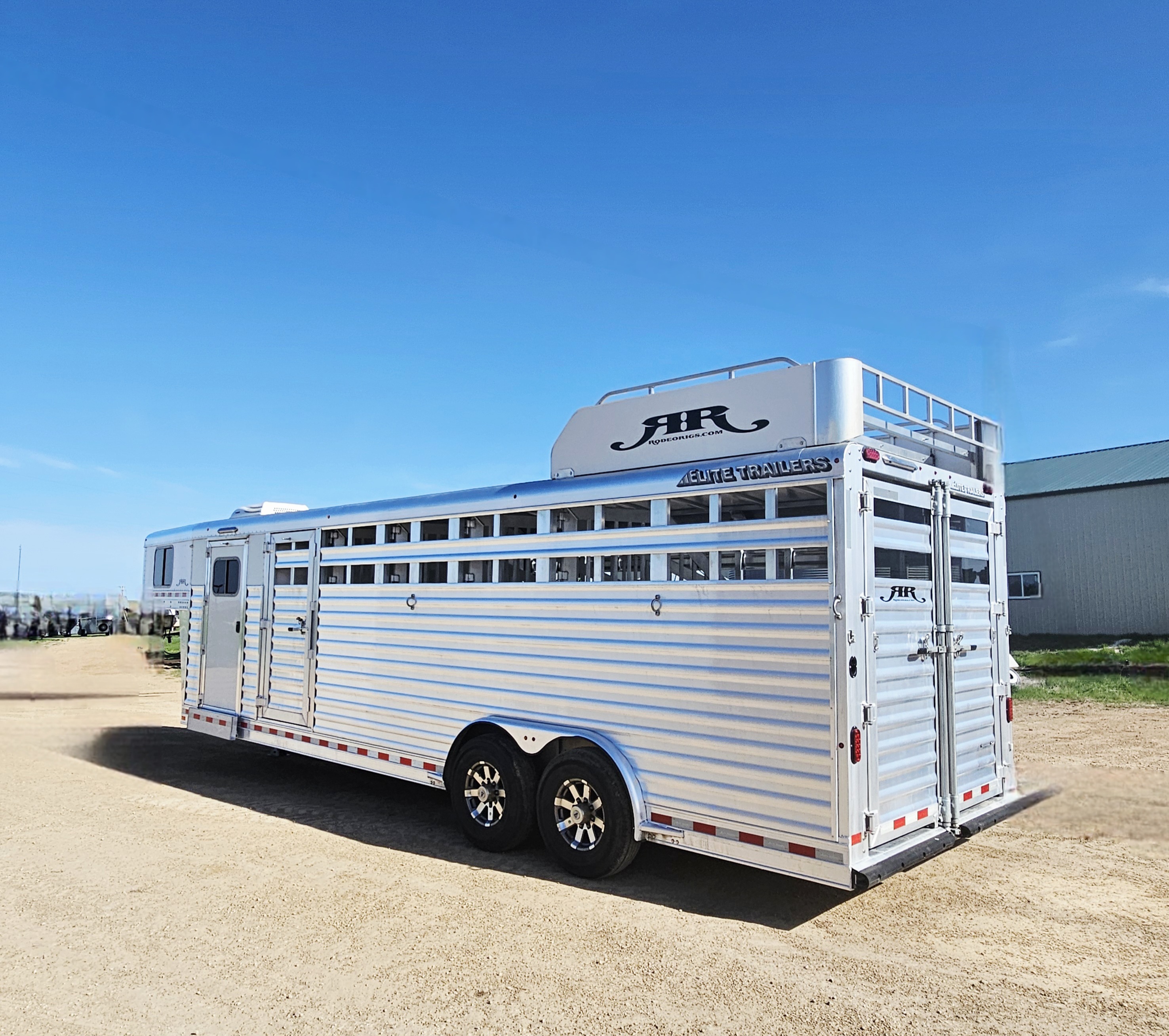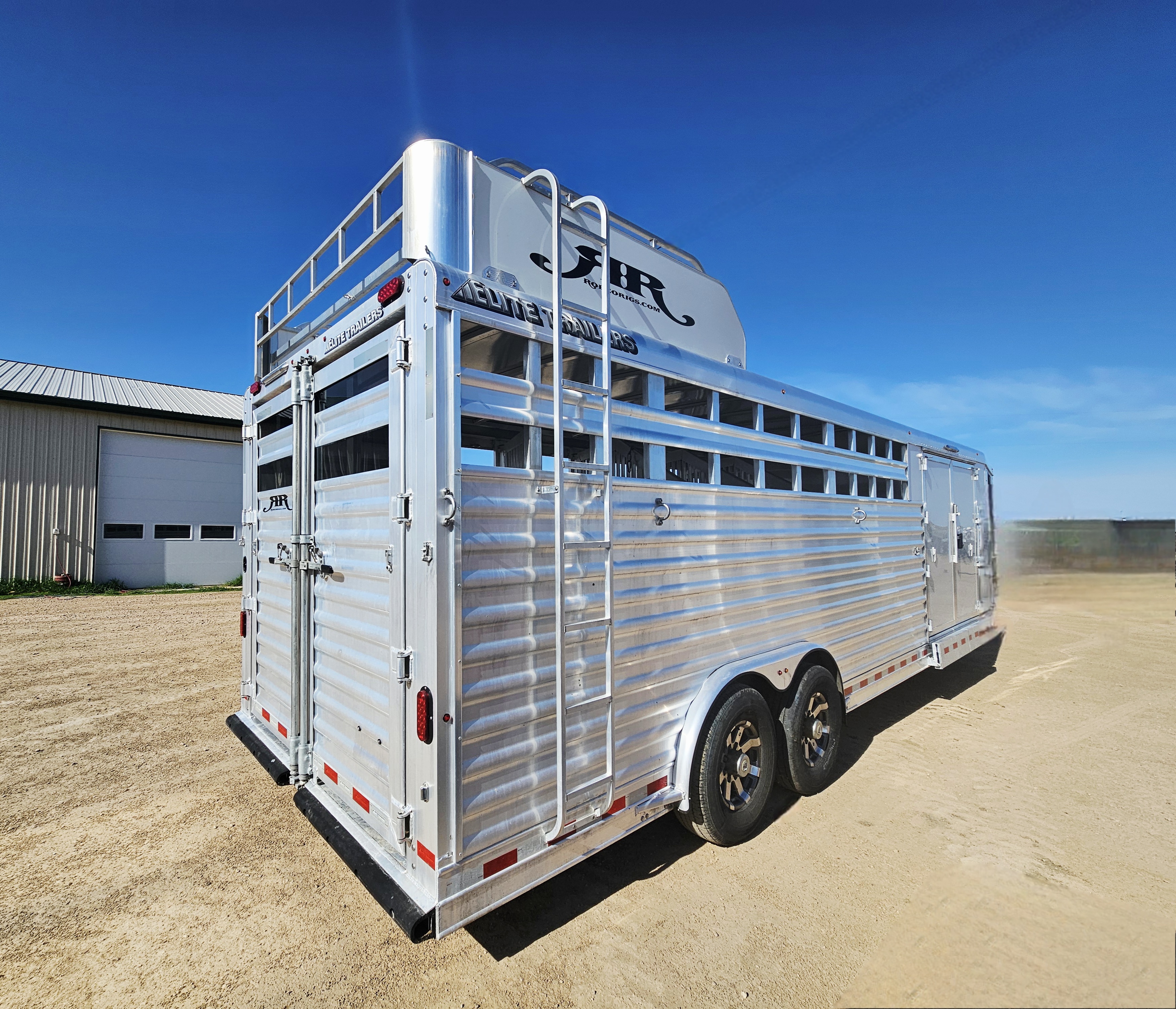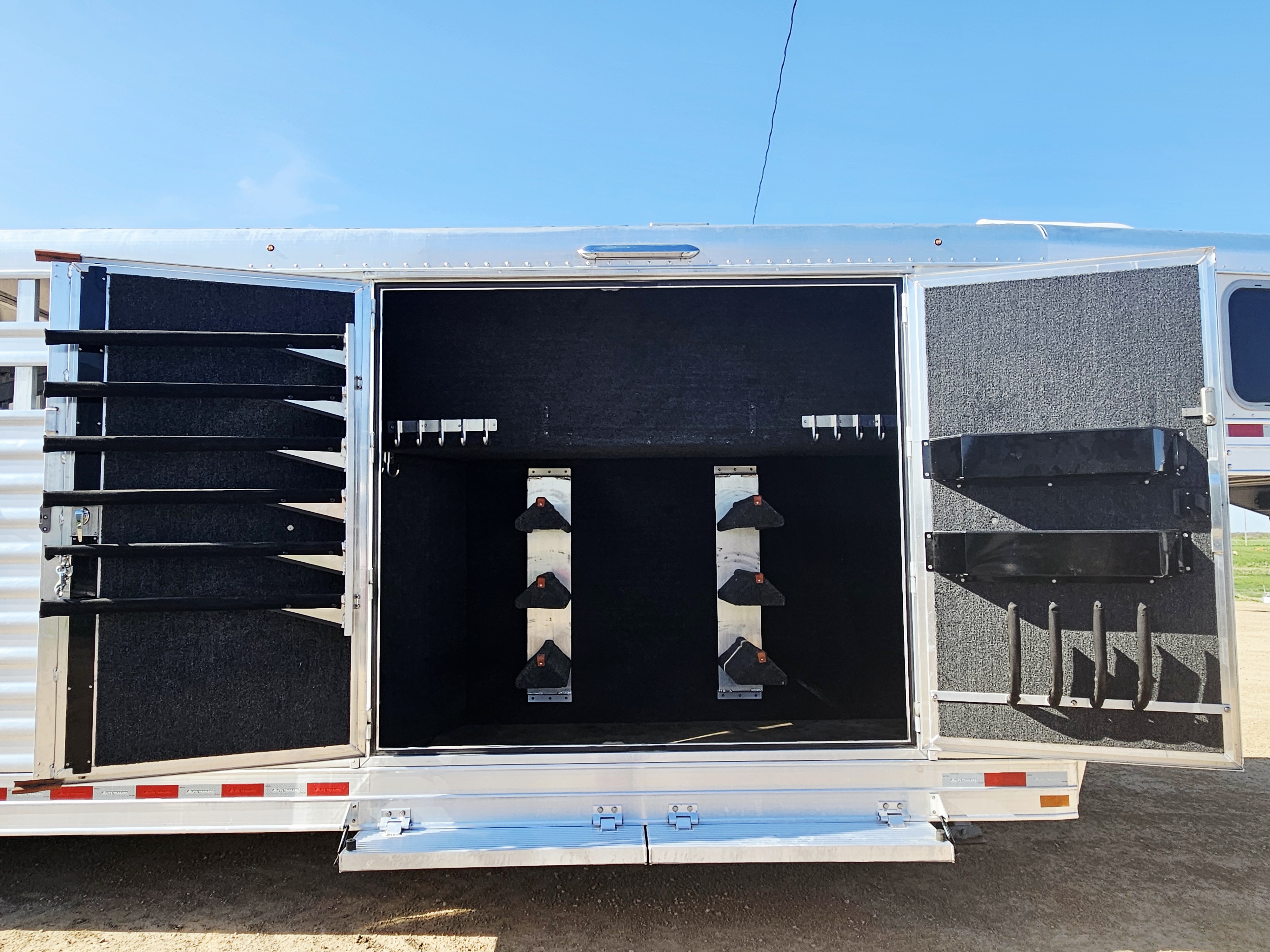 This 5 horse Elite stock combo with the two-door side tack has two 3-tier saddle racks, blanket bars, boot hooks, and brush boxes. The roadside dressing area features an air conditioner, more bridle hooks, a boot box and a shelf. This trailer has air flow dividers, a roadside escape door, a hay rack with ladder and a hydraulic jack. This trailer has a floor length of 27'.