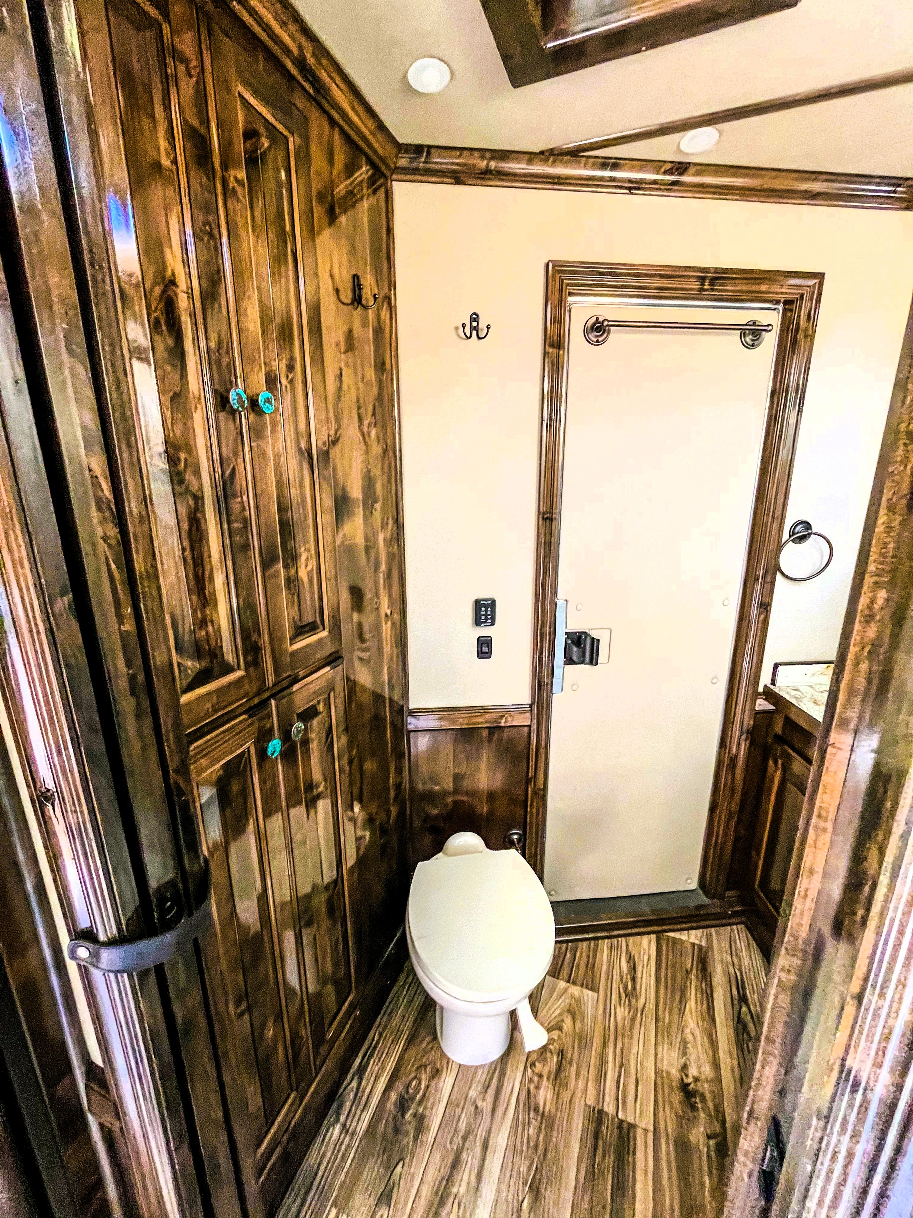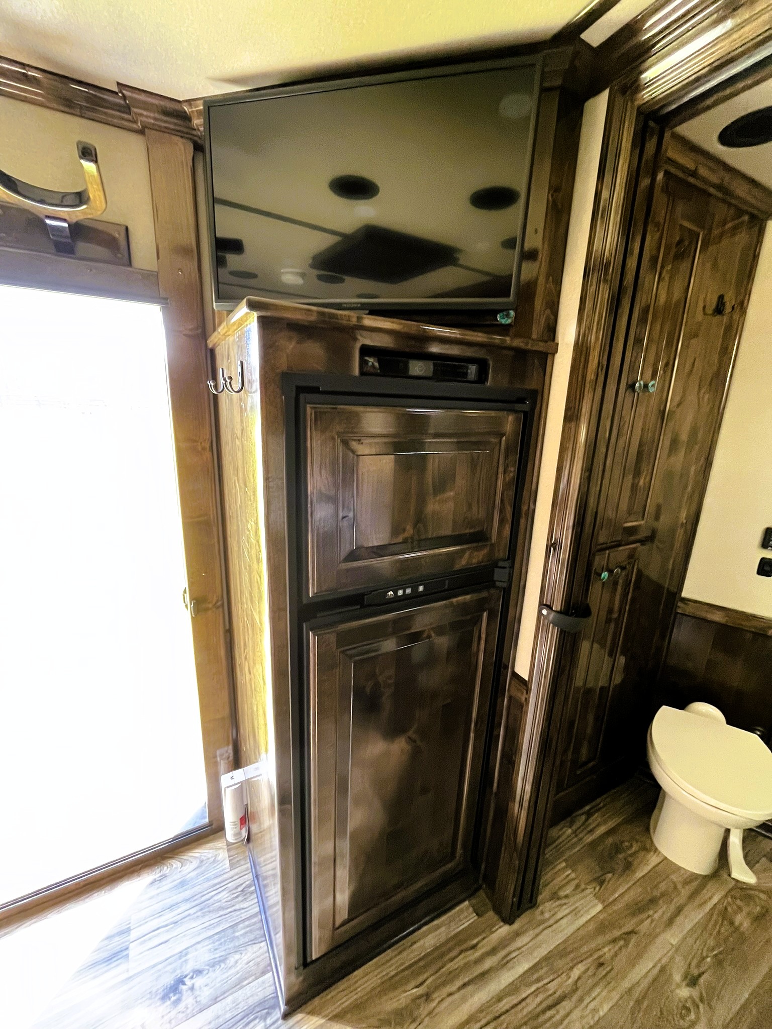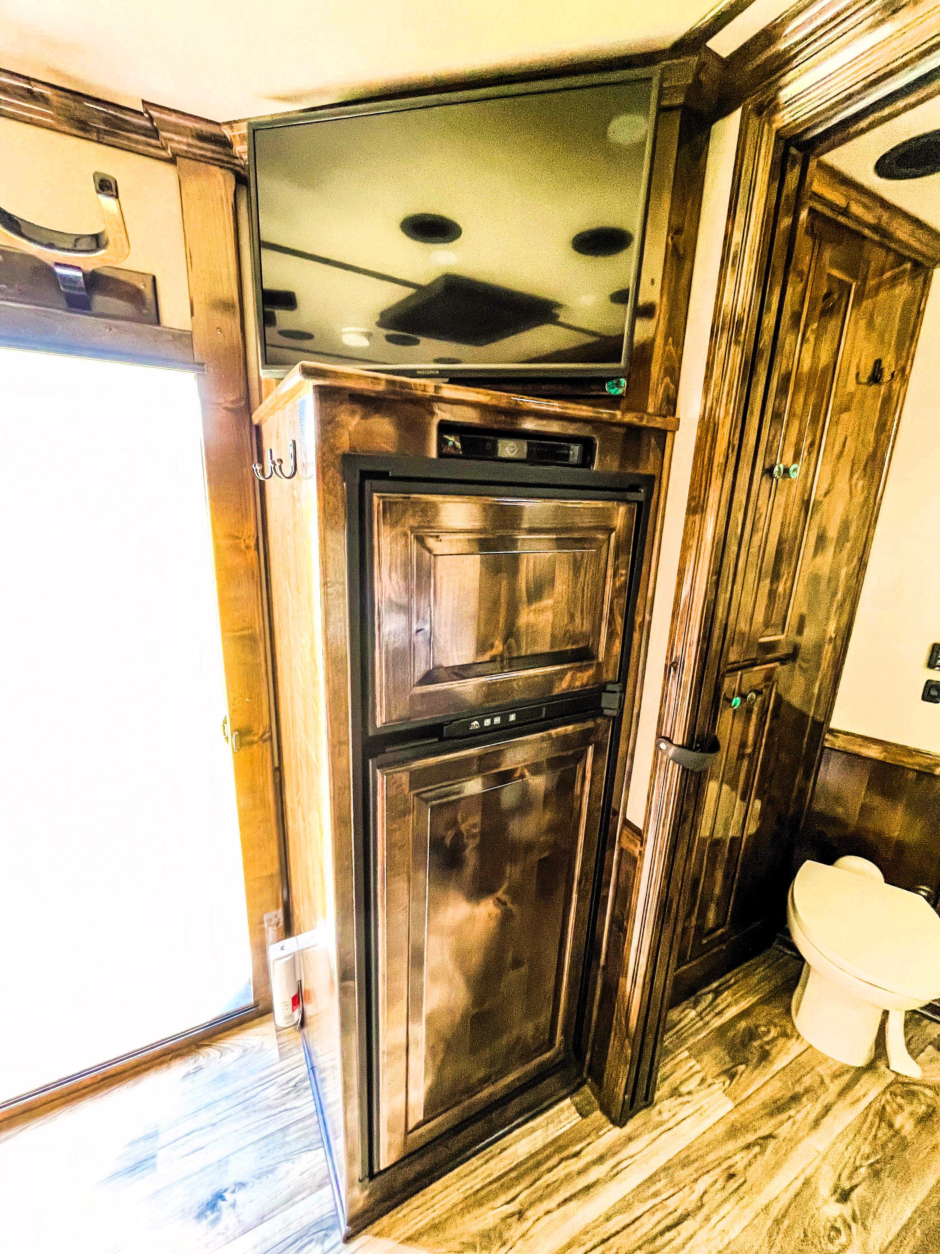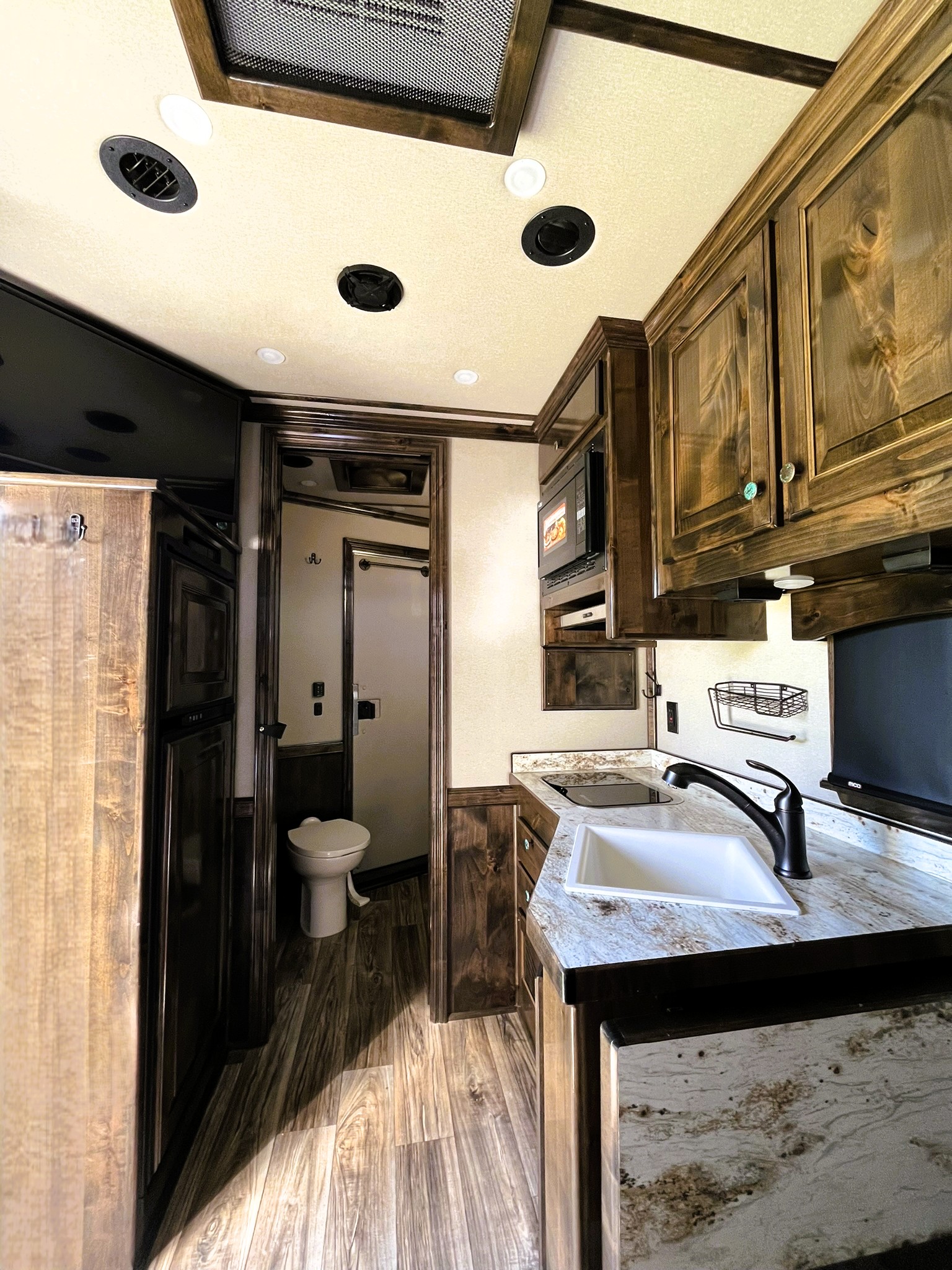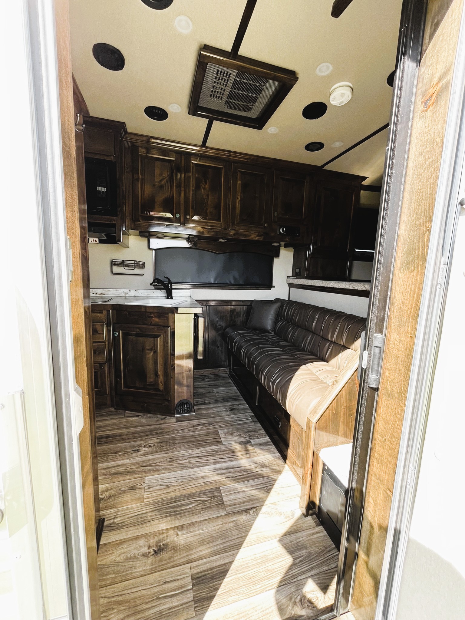 This fantastic 3 horse reverse load Elite with an 11' Outback Customs interior has all the features including a couch on the riser wall, a full kitchen with a large refrigerator, and a private bathroom with a radius shower, toilet, sink with vanity and mirror, and a walk-through door into the horse area. The horse area has air flow dividers, mangers with under manger storage, WERM flooring and a roadside escape door. A full rear tack room with a saddle rack, bridle hooks, brush boxes and a blanket bar. Additional features include a diesel generator, air ride, hydraulic jack, and 2 awnings.