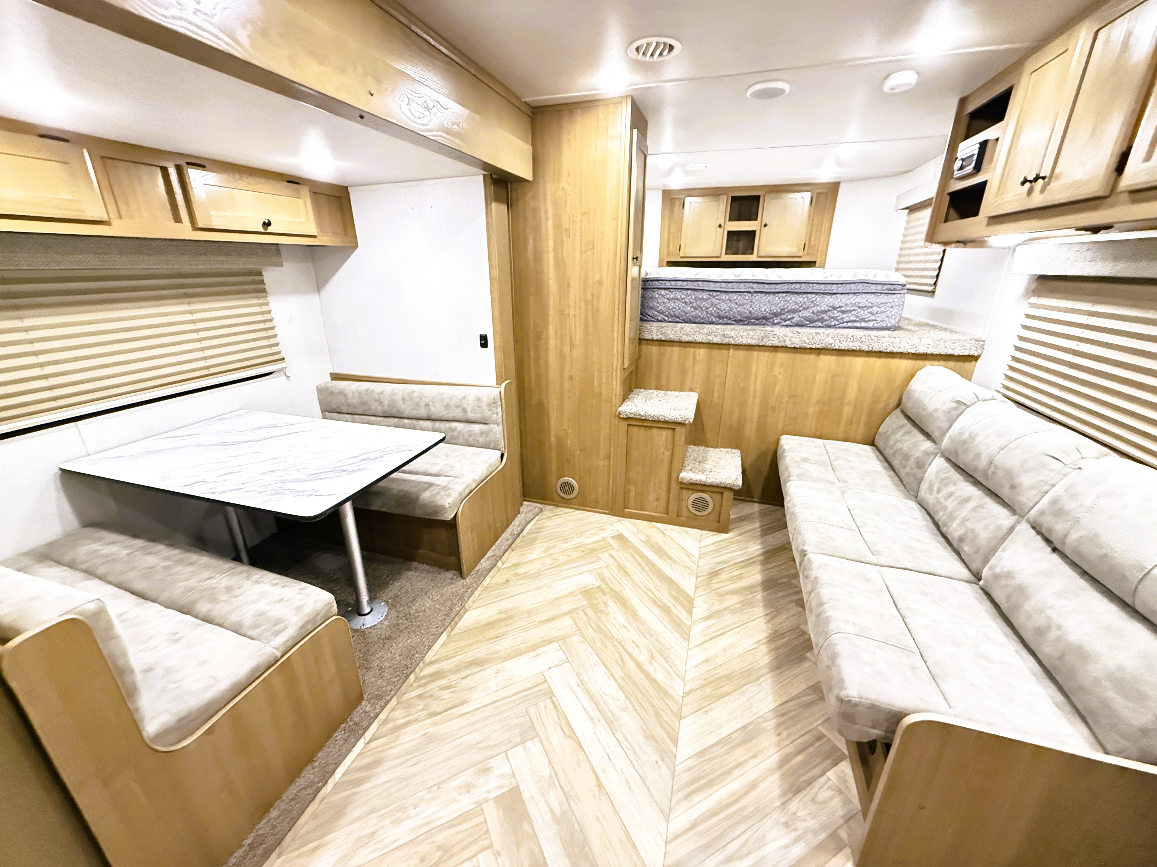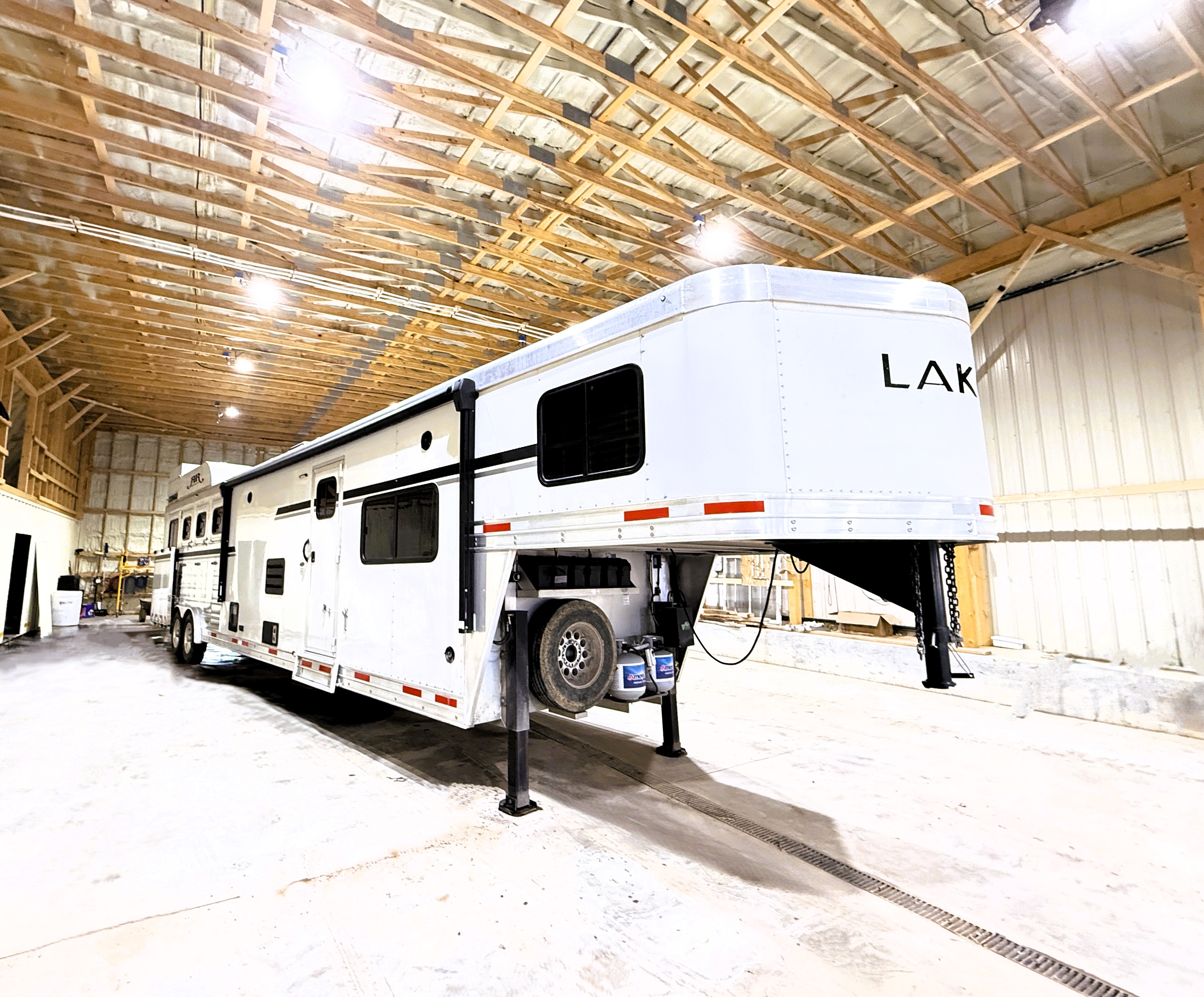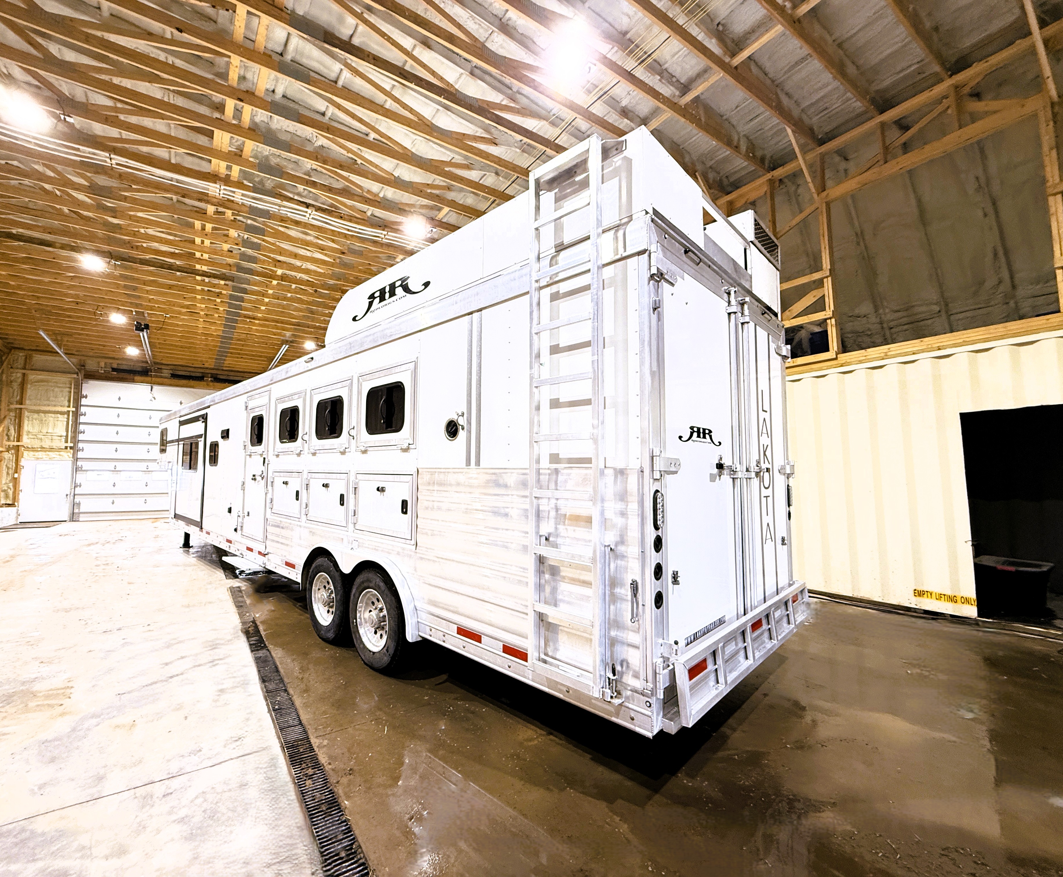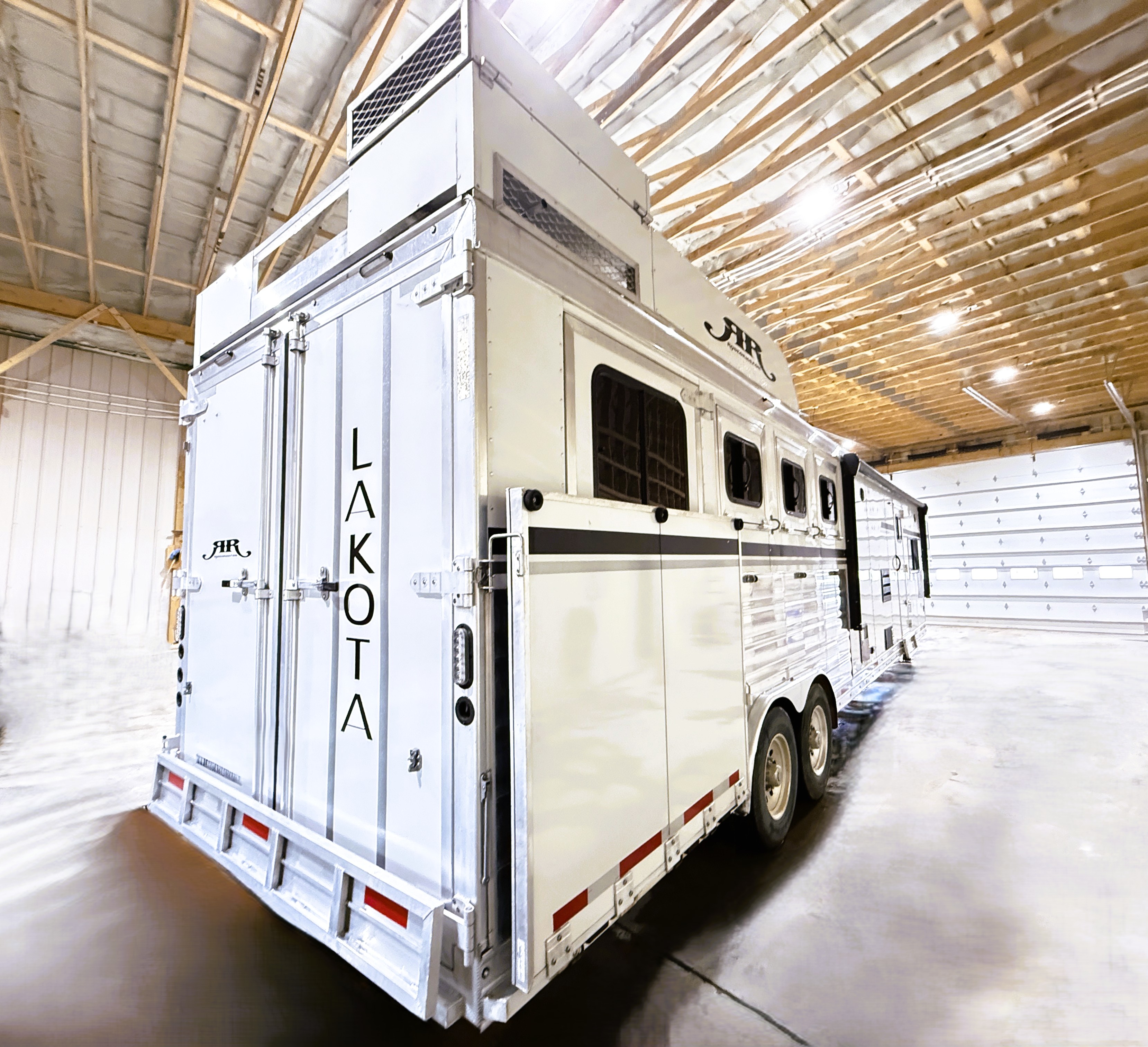 This 2024 Lakota 4-horse side-load features the highly desirable full rear tack room that includes a 4-tier saddle rack, brush boxes, blanket bars and lots of bridle hooks. The 15' living quarters features a queen-sized bed in the nose along with hanging closets. The living area has a sofa-sleeper, and a dinette-sleeper in the 6' slide out. The full kitchen has a large refrigerator, recessed cook top, double-sided sink, microwave and lots of storage. The private bathroom has a radius shower, toilet, sink with vanity and mirror, storage and a walk-through door into the horse area. The horse compartment features a stud stall in the first divider, drop down windows, mangers with under manger storage and a side load ramp. Additional features include a hay pod with ladder, generator, dual hydraulic jacks, and an awning.