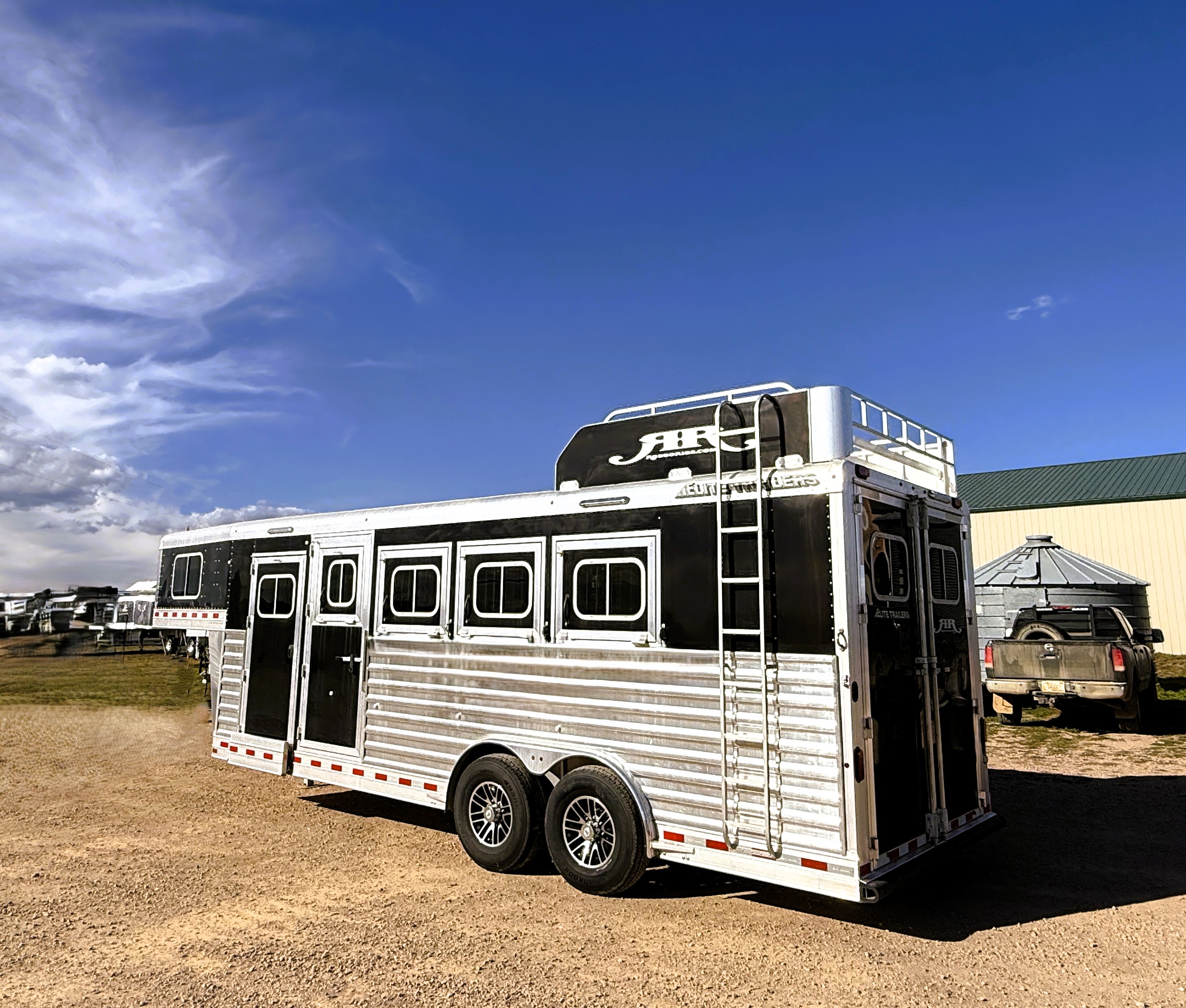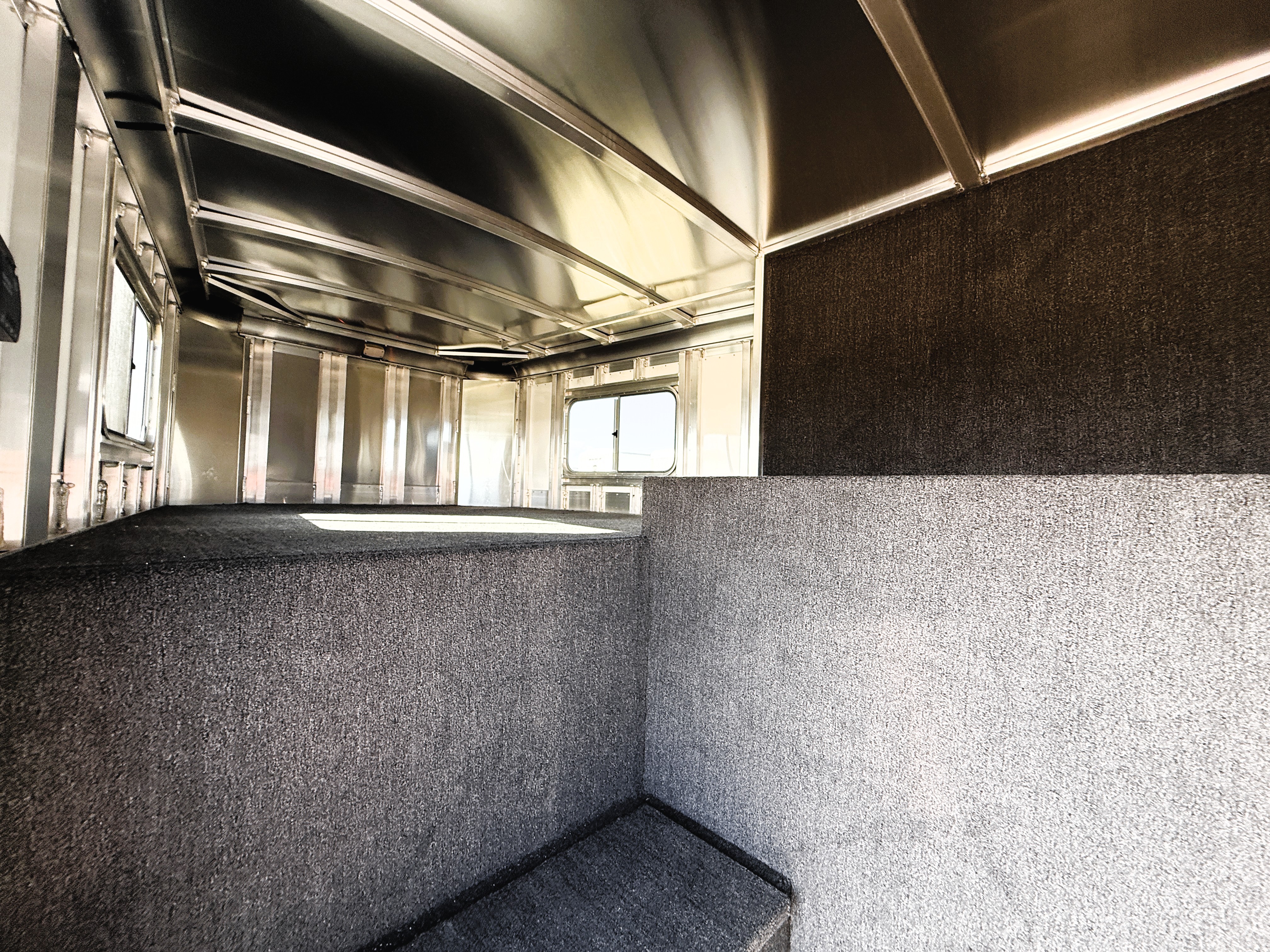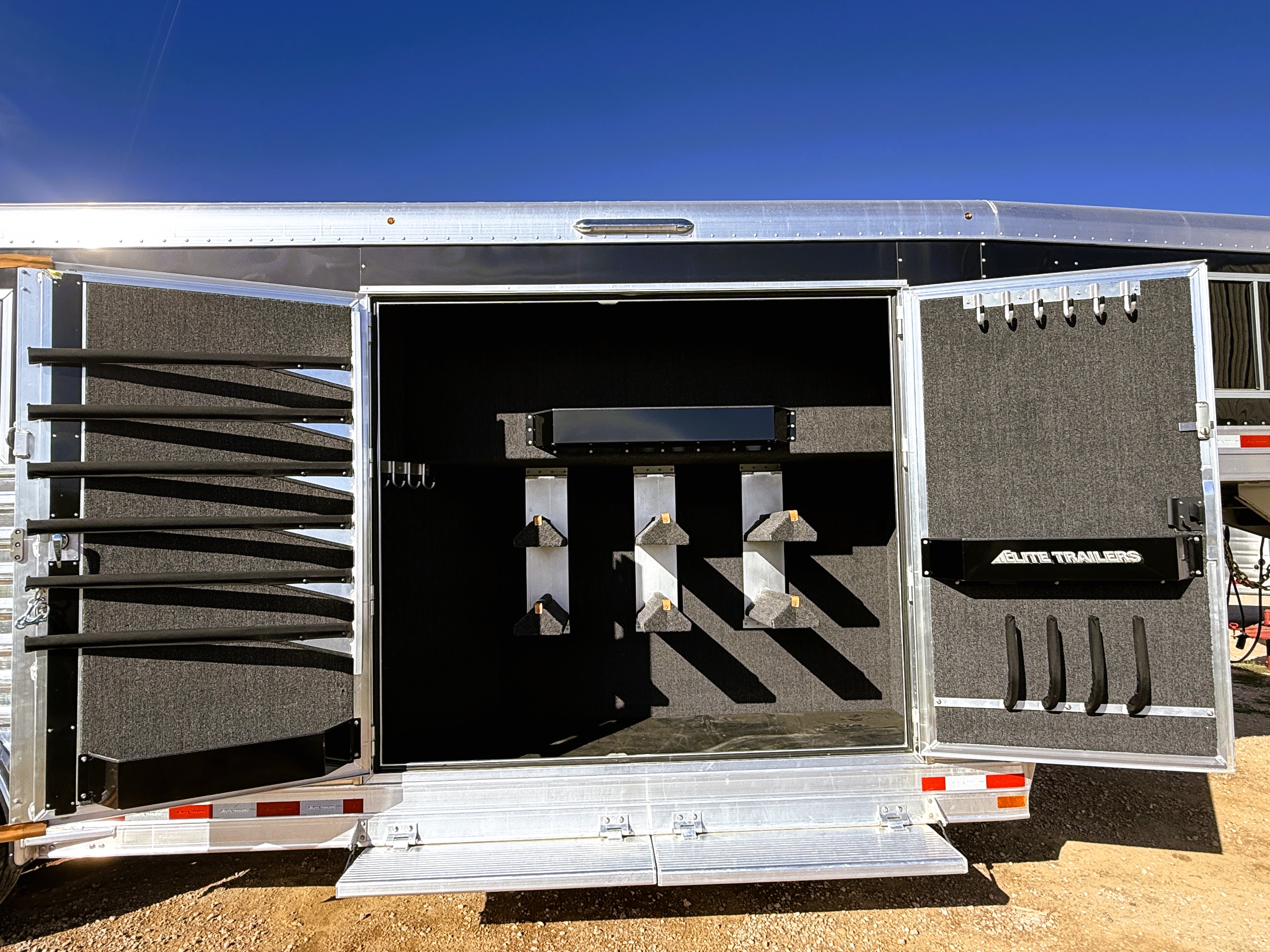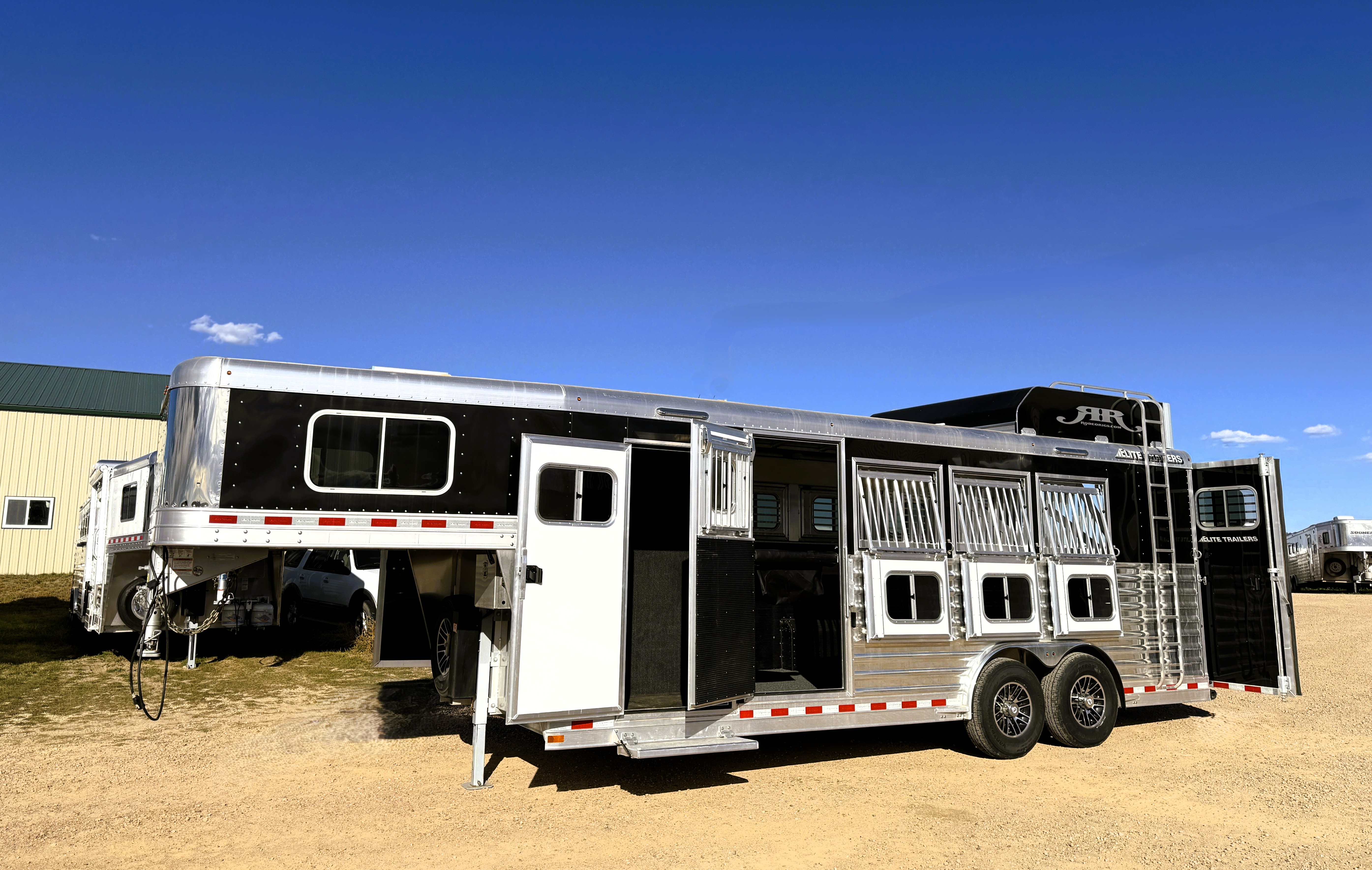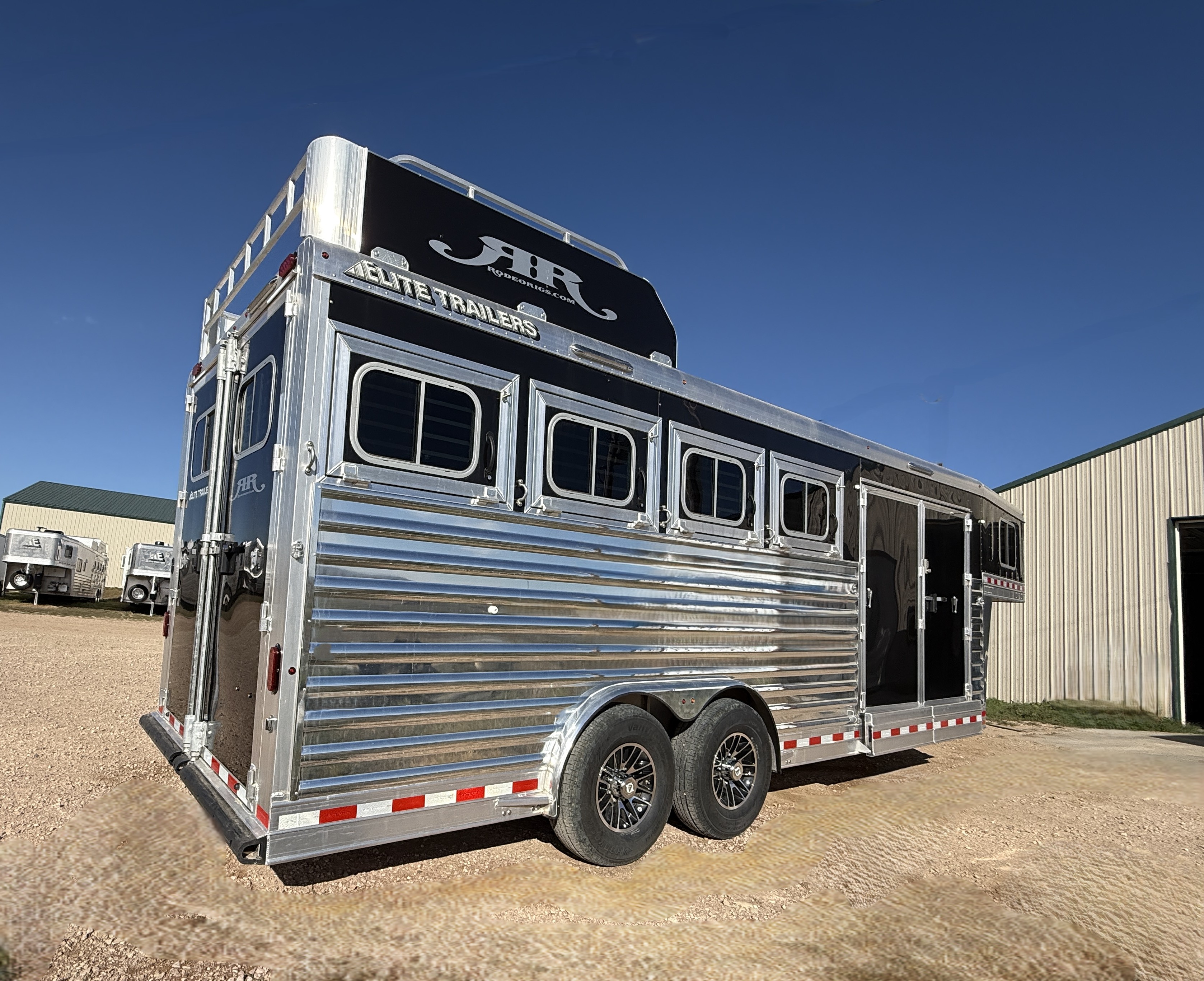 This Elite 4 horse trailer with a side tack has all the options. The horse area includes a stud stall in the front slant and a telescoping divider in the rear slant, a roadside escape door, drop down windows, butterfly rear doors and polylast flooring. The curbside, side tack has double doors for easy access to the 3 2-tier saddle racks, bridle hooks, blanket bar, boot hook and brush trays. The roadside dressing area features more storage availability along with a boot box, shelf, and a clothes rod. Additional trailer features include a hydraulic jack, hay rack with ladder, LED load lights on the rear of the trailer, an LED light above the side tack and the dressing room tack door. This trailer is 22' in length and is 8' wide.