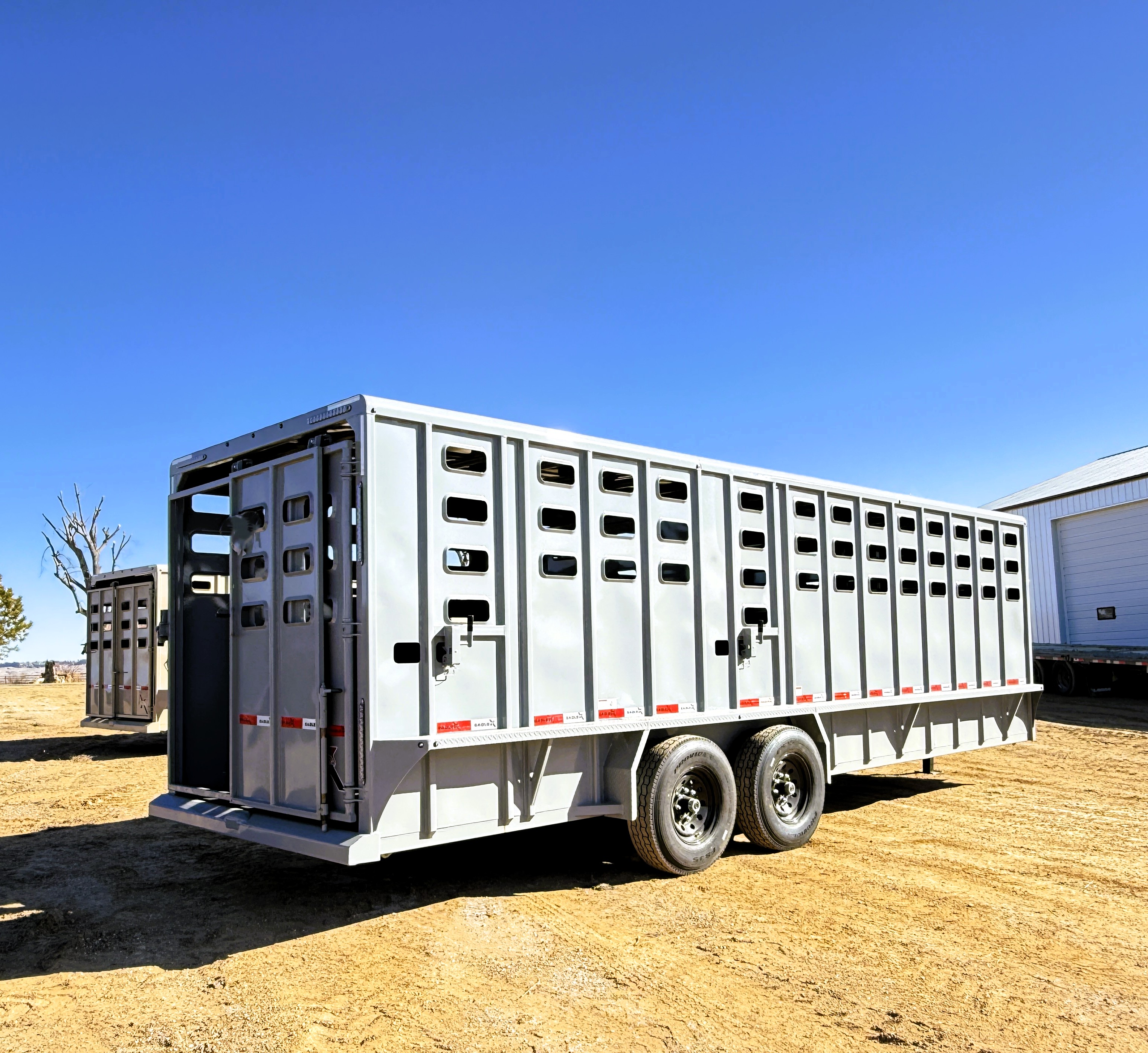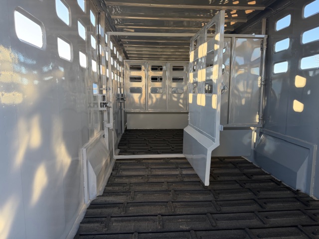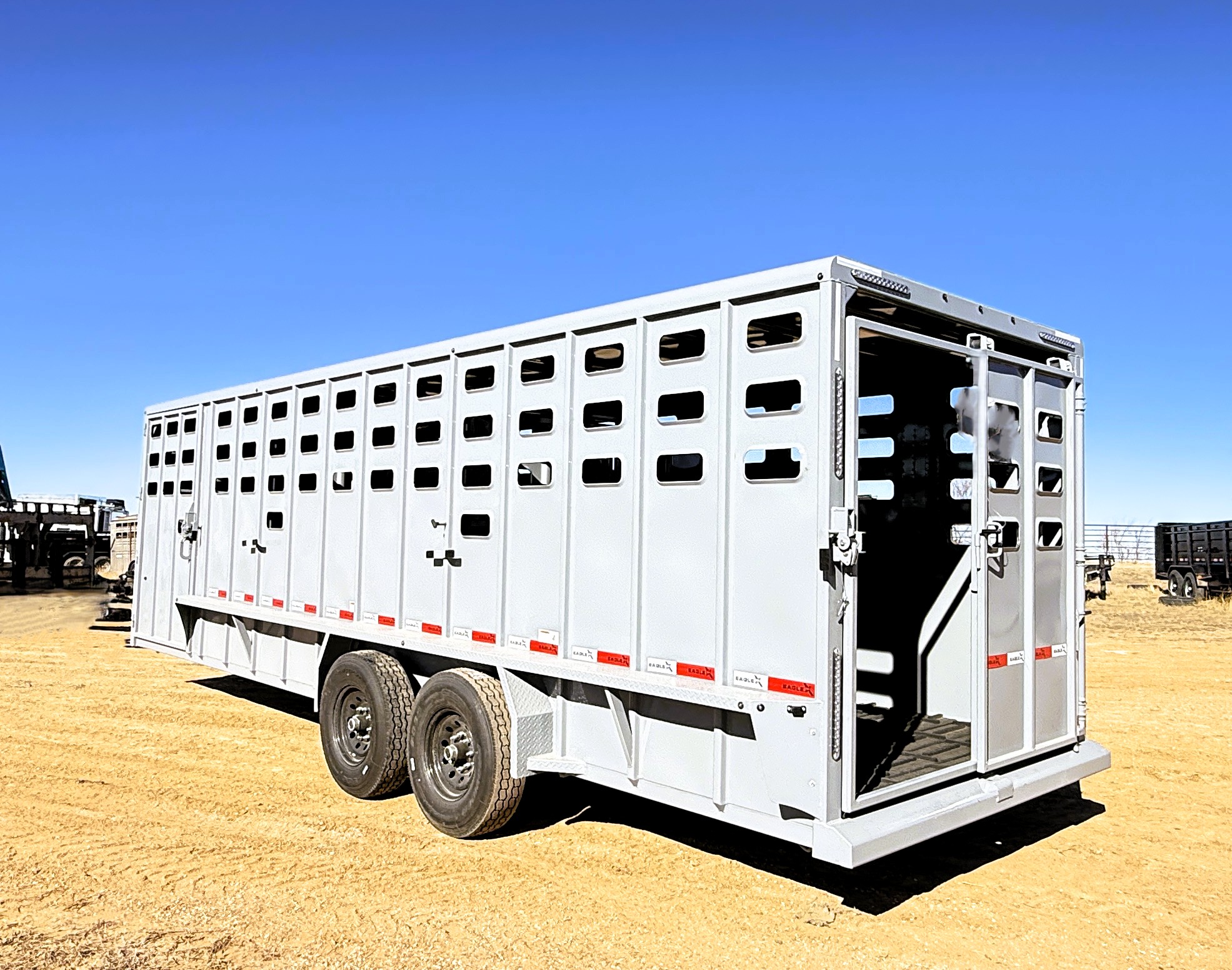 This punch sided steel, 24' Eagle X stock trailer comes with 2- center gates with sorting doors, a full rear door with a slider, 48" roadside escape door, brush fenders, cleated rubber flooring, and dual 7,000# axles. Additional features include calf gates in the nose, and a quick release coupler. This trailer is 78" tall, 7' wide and a 24' floor length, in the color lava gray.