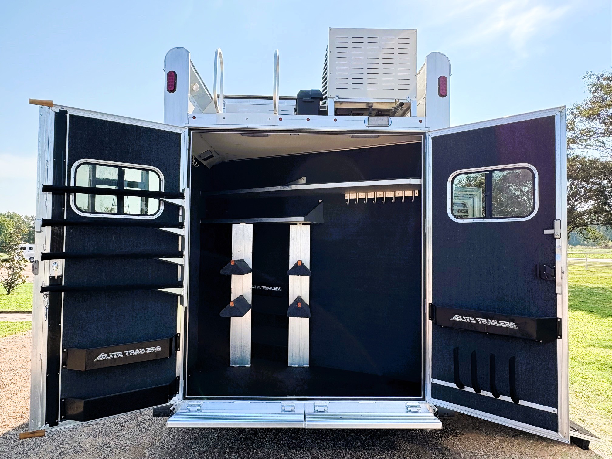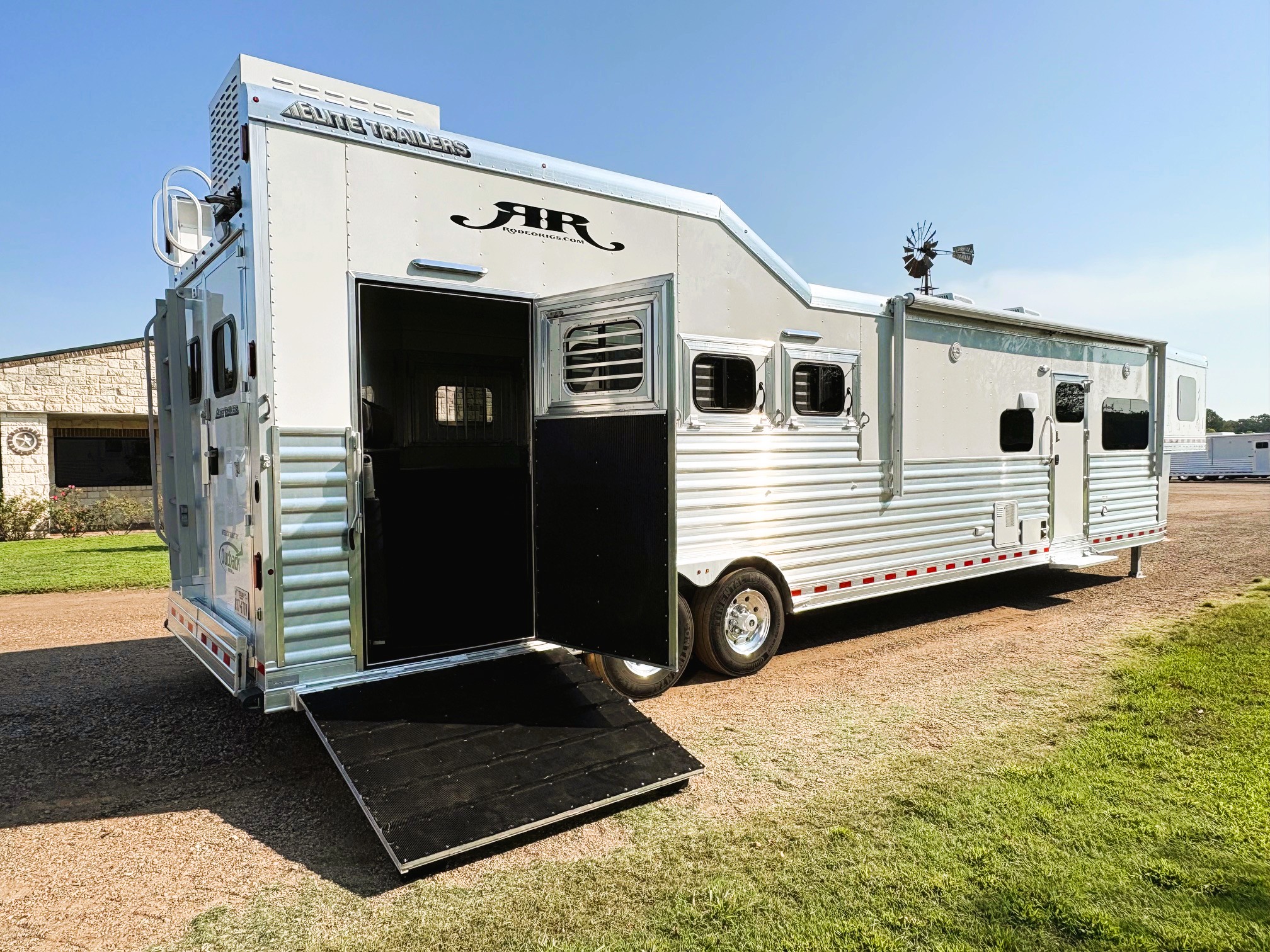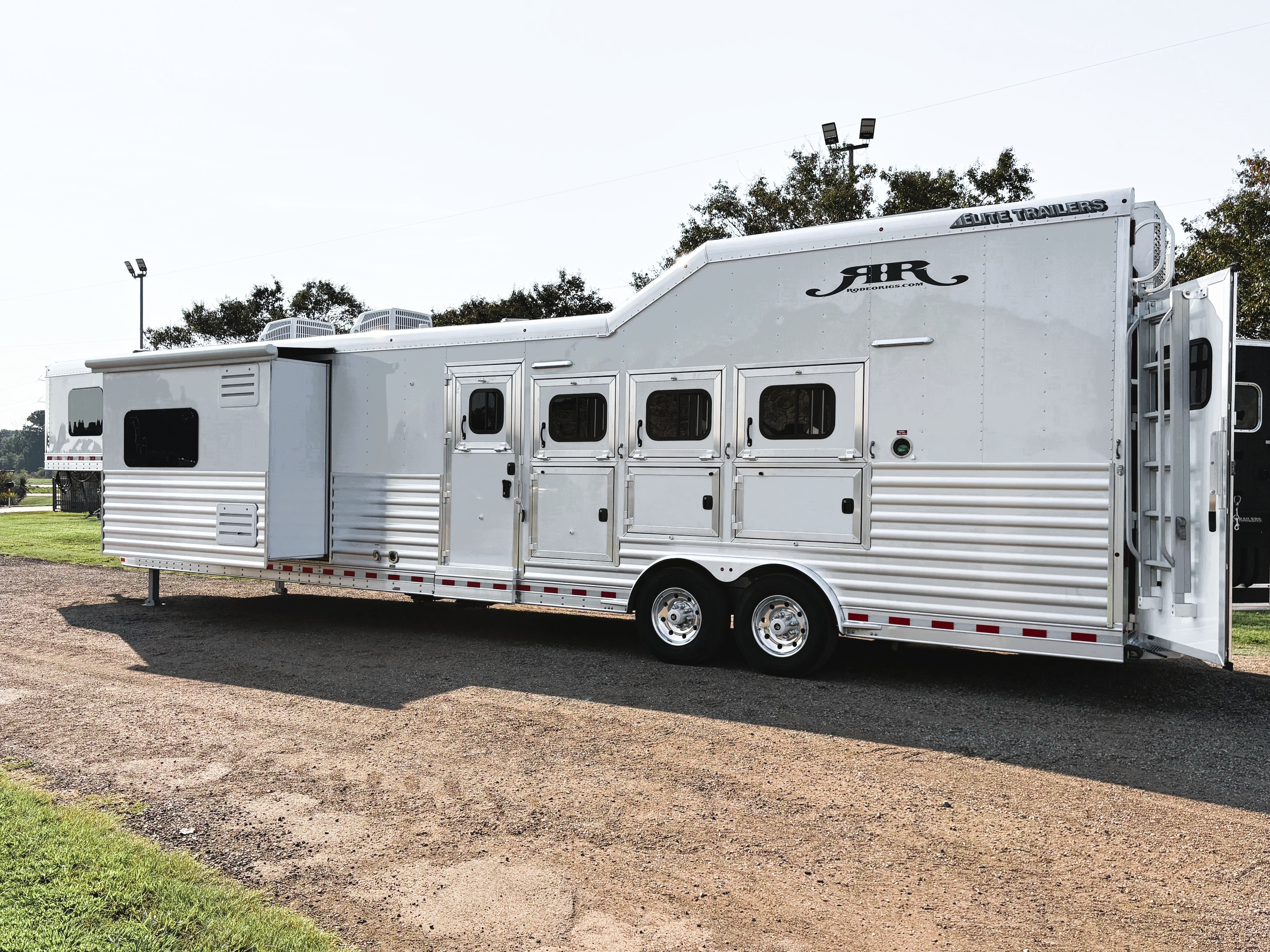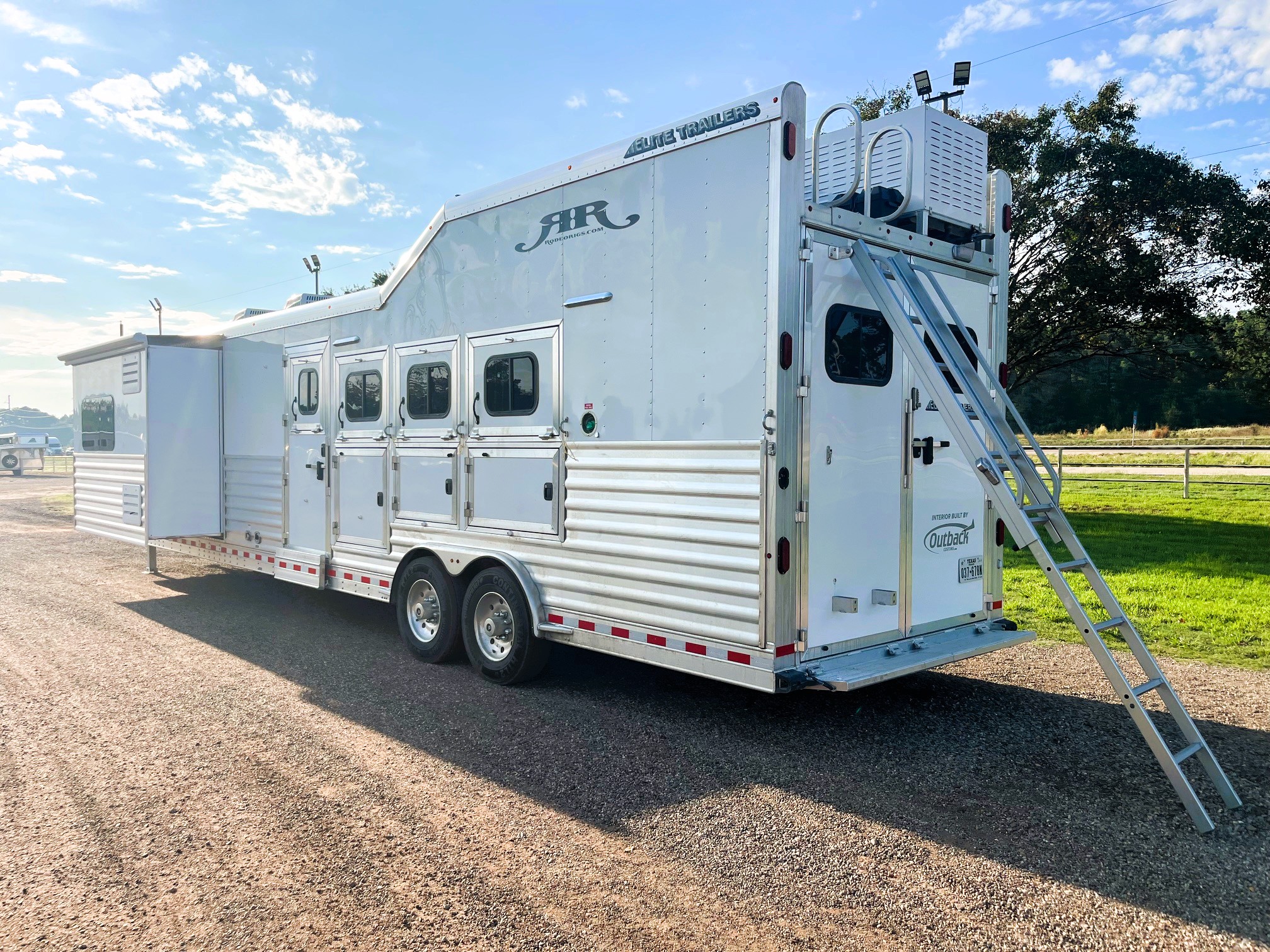 On Consignment is this beautiful 2026 Elite 4 horse side-load with a 15' Outback Customs interior that features an 8' 3" slide out with a sofa-sleeper and a large refrigerator. There is an additional sofa-sleeper on the opposite wall. There is a full kitchen that has a recessed cook-top, sink, microwave, and a pantry with shelves. The bedroom has a queen-sized mattress and a hanging closet on each side. The private bathroom has a radius shower, vanity with mirror and lights, a double hanging closet and a walk-through door into the horse compartment. The horse area has a stud stall in the front slant, air flow dividers, mangers with under manger storage, WERM flooring, a roadside escape door, and a side load ramp. The full rear tack room has 2 2-tier saddle racks, blanket bar, bridle hooks, boot rack, brush boxes and storage shelves. Additional features include Starlink, diesel generator, awning and dual hydraulic jacks. This trailer has a floor length of 35'.