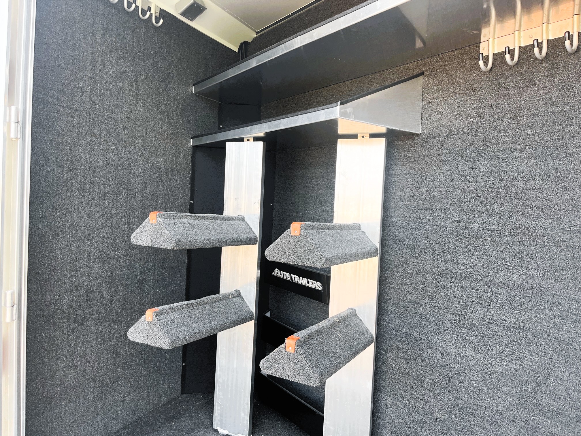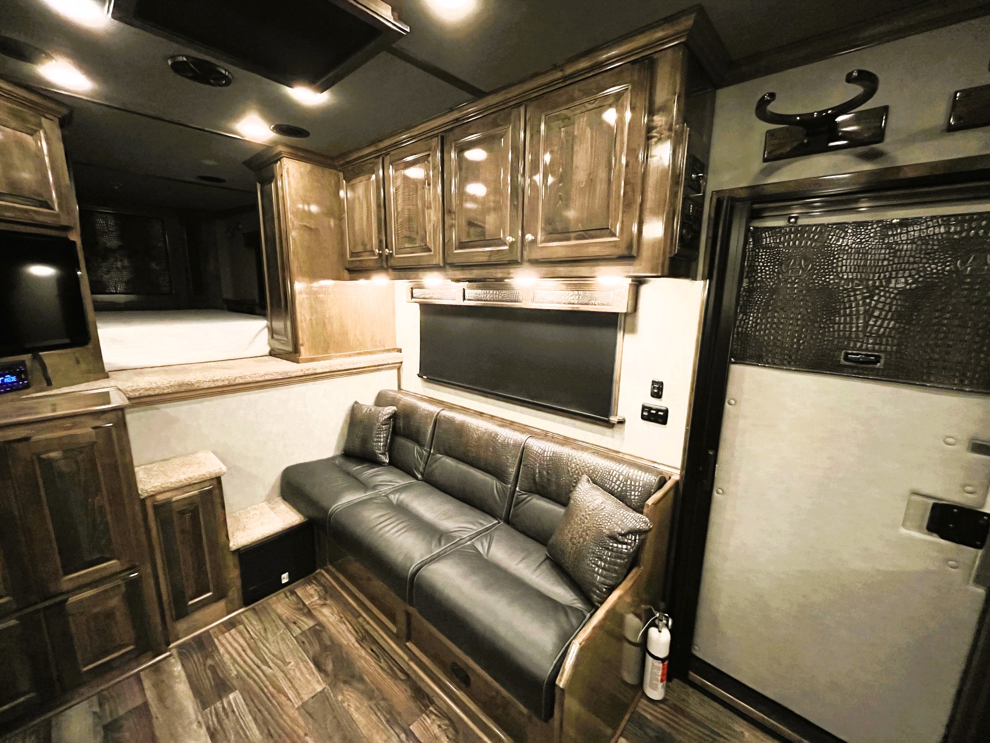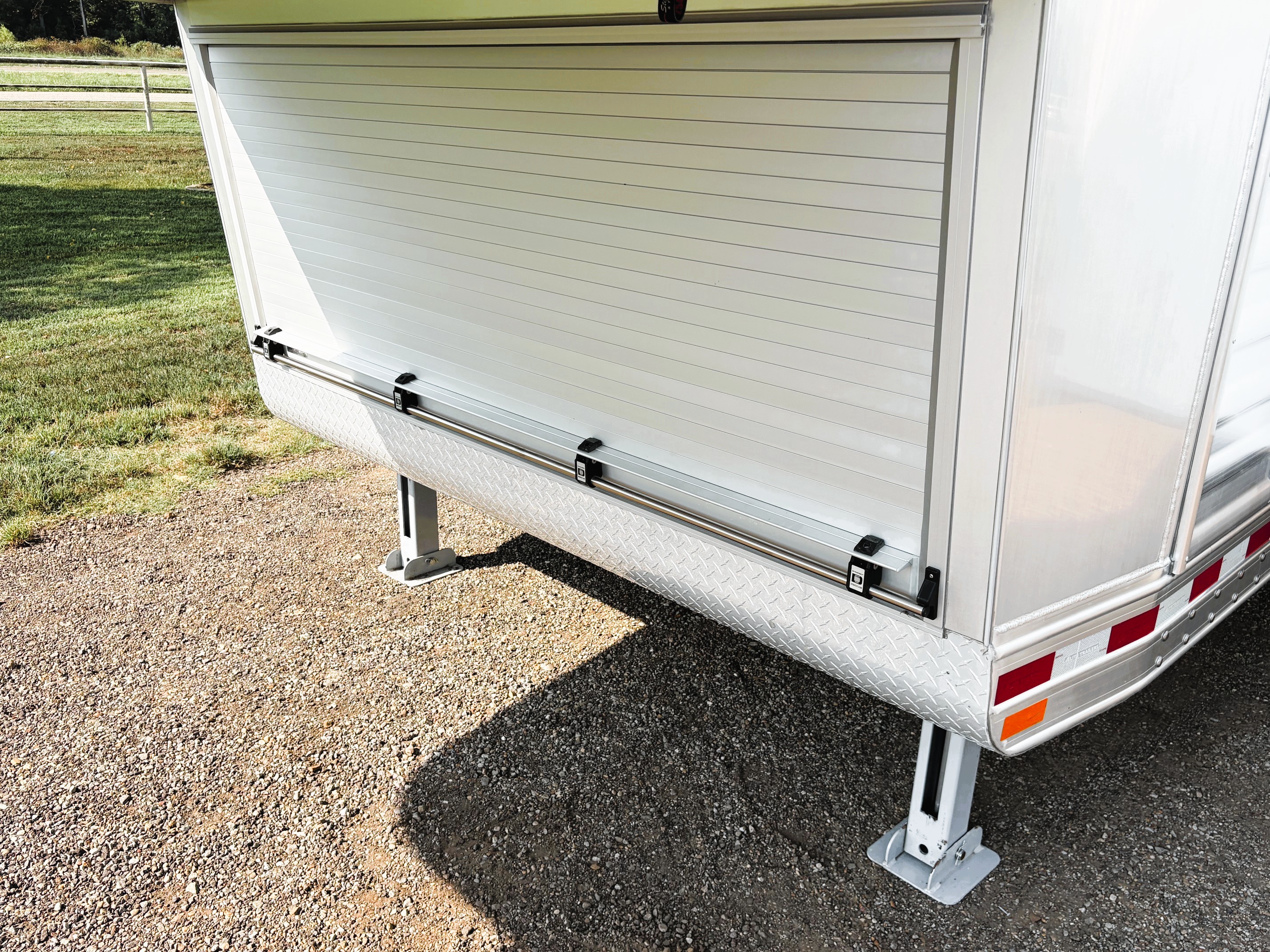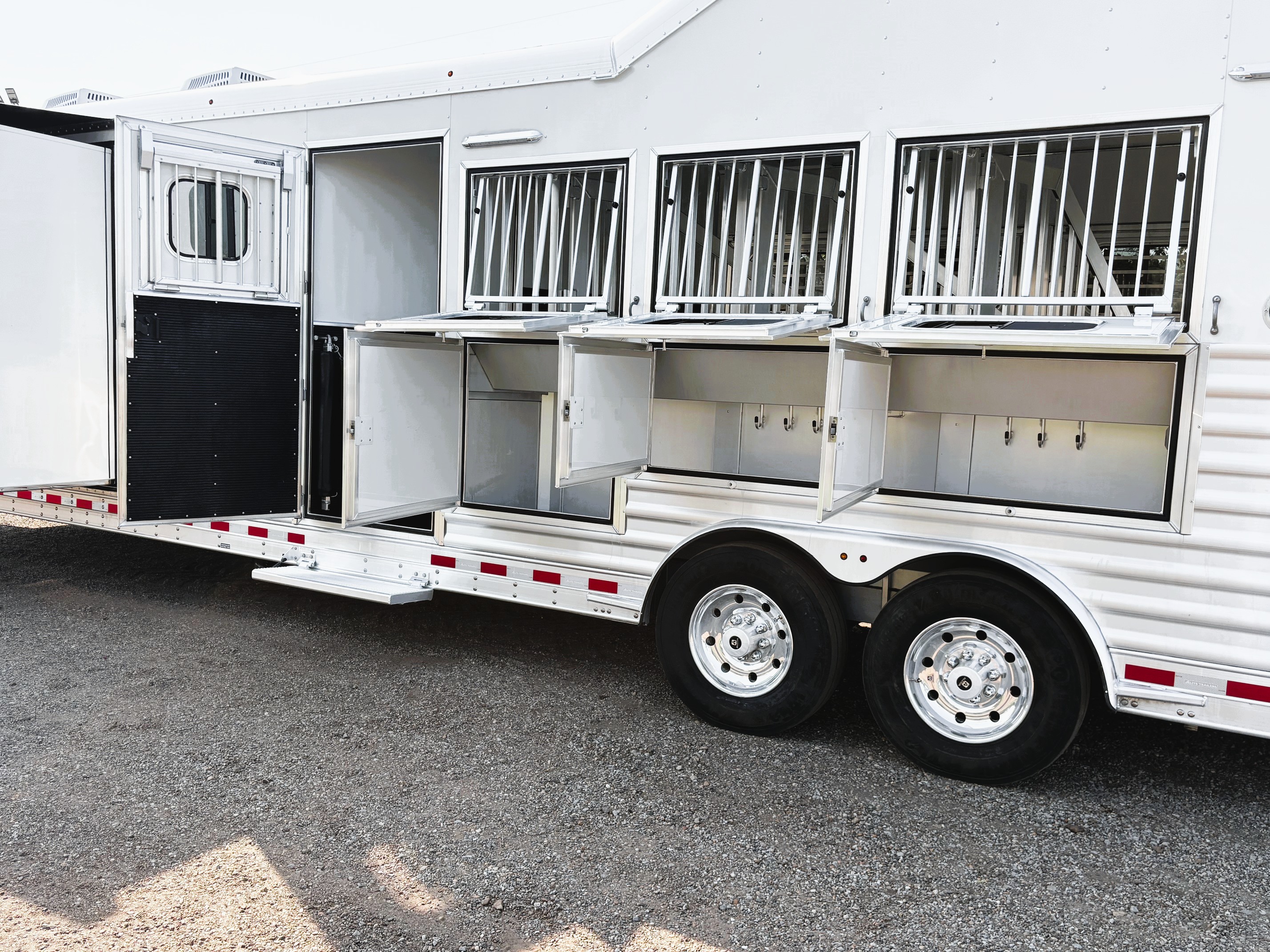 On Consignment is this beautiful 2026 Elite 4 horse side-load with a 15' Outback Customs interior that features an 8' 3" slide out with a sofa-sleeper and a large refrigerator. There is an additional sofa-sleeper on the opposite wall. There is a full kitchen that has a recessed cook-top, sink, microwave, and a pantry with shelves. The bedroom has a queen-sized mattress and a hanging closet on each side. The private bathroom has a radius shower, vanity with mirror and lights, a double hanging closet and a walk-through door into the horse compartment. The horse area has a stud stall in the front slant, air flow dividers, mangers with under manger storage, WERM flooring, a roadside escape door, and a side load ramp. The full rear tack room has 2 2-tier saddle racks, blanket bar, bridle hooks, boot rack, brush boxes and storage shelves. Additional features include Starlink, diesel generator, awning and dual hydraulic jacks. This trailer has a floor length of 35'.