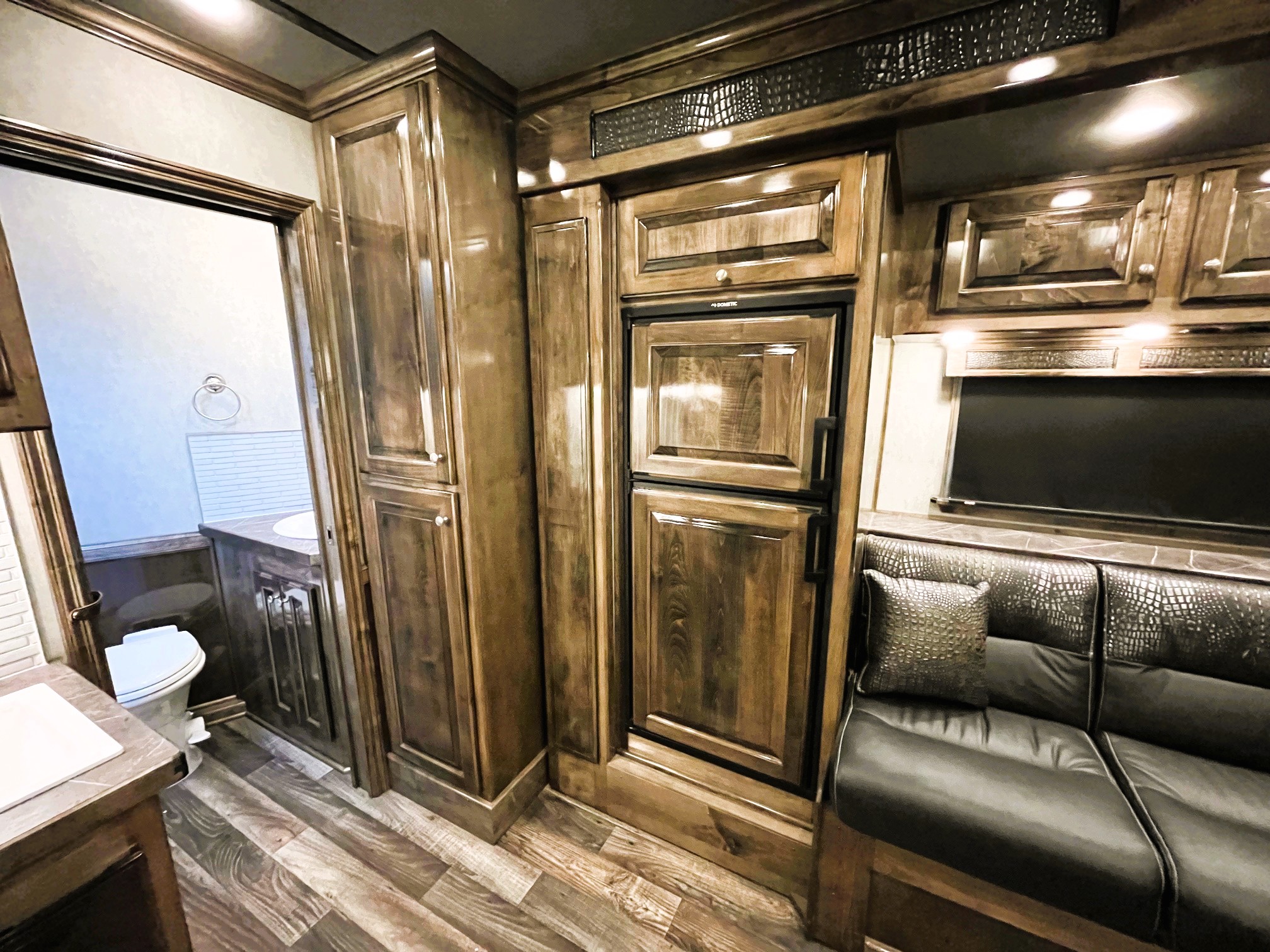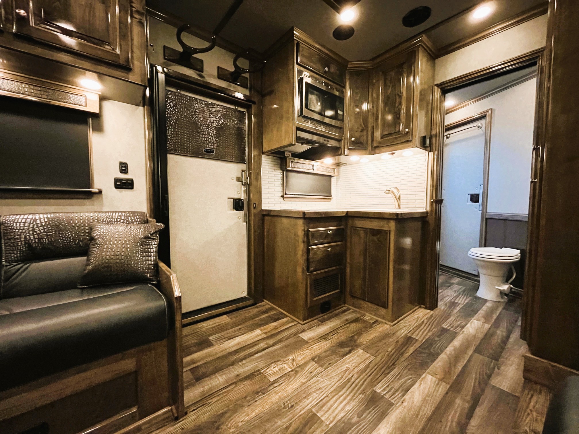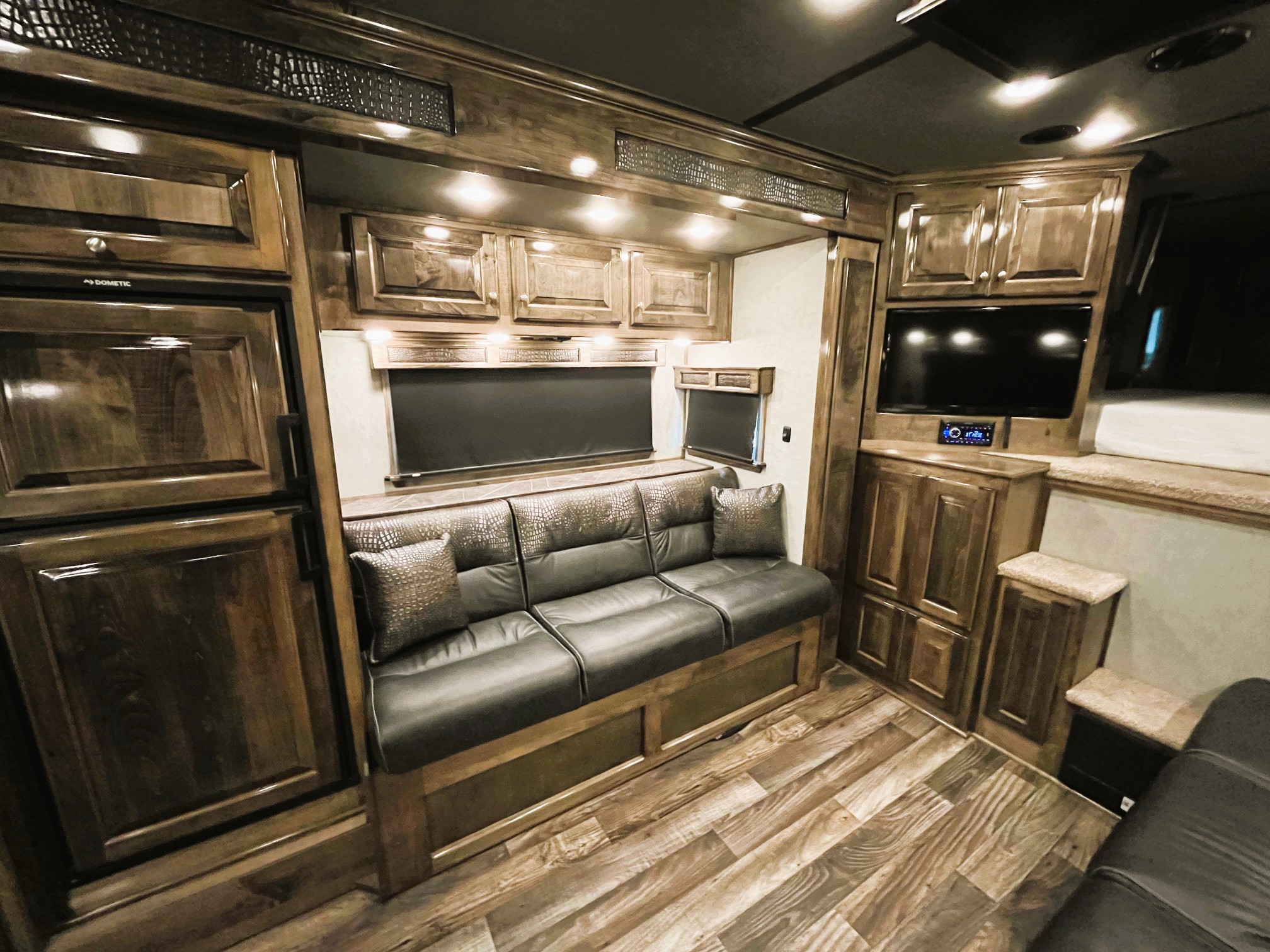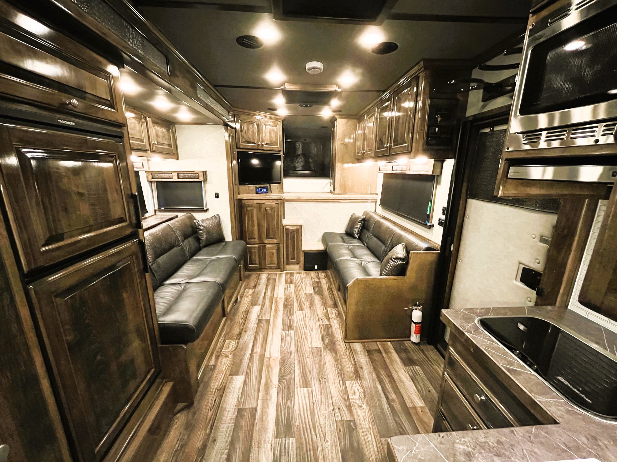 On Consignment is this beautiful 2026 Elite 4 horse side-load with a 15' Outback Customs interior that features an 8' 3" slide out with a sofa-sleeper and a large refrigerator. There is an additional sofa-sleeper on the opposite wall. There is a full kitchen that has a recessed cook-top, sink, microwave, and a pantry with shelves. The bedroom has a queen-sized mattress and a hanging closet on each side. The private bathroom has a radius shower, vanity with mirror and lights, a double hanging closet and a walk-through door into the horse compartment. The horse area has a stud stall in the front slant, air flow dividers, mangers with under manger storage, WERM flooring, a roadside escape door, and a side load ramp. The full rear tack room has 2 2-tier saddle racks, blanket bar, bridle hooks, boot rack, brush boxes and storage shelves. Additional features include Starlink, diesel generator, awning and dual hydraulic jacks. This trailer has a floor length of 35'.