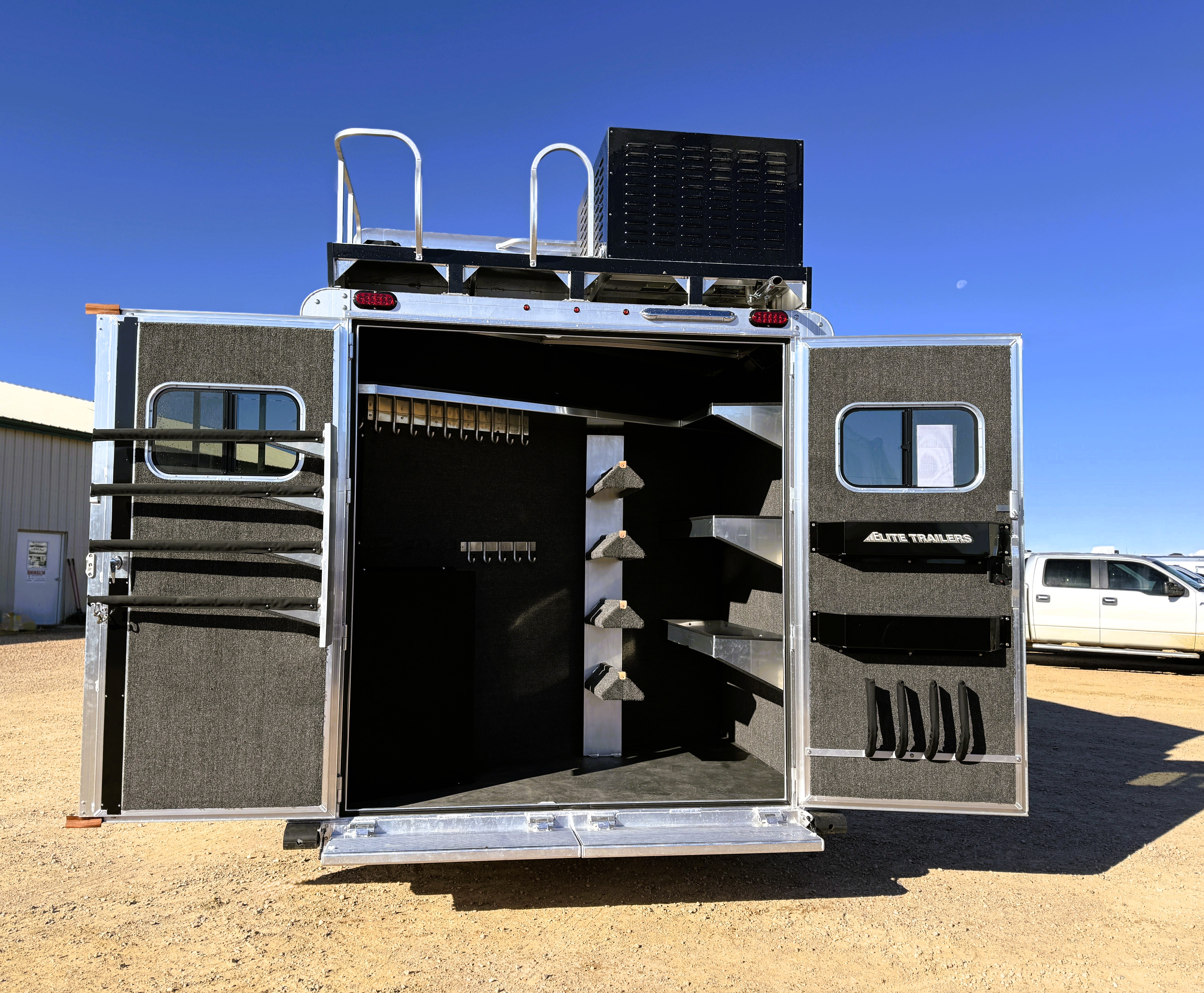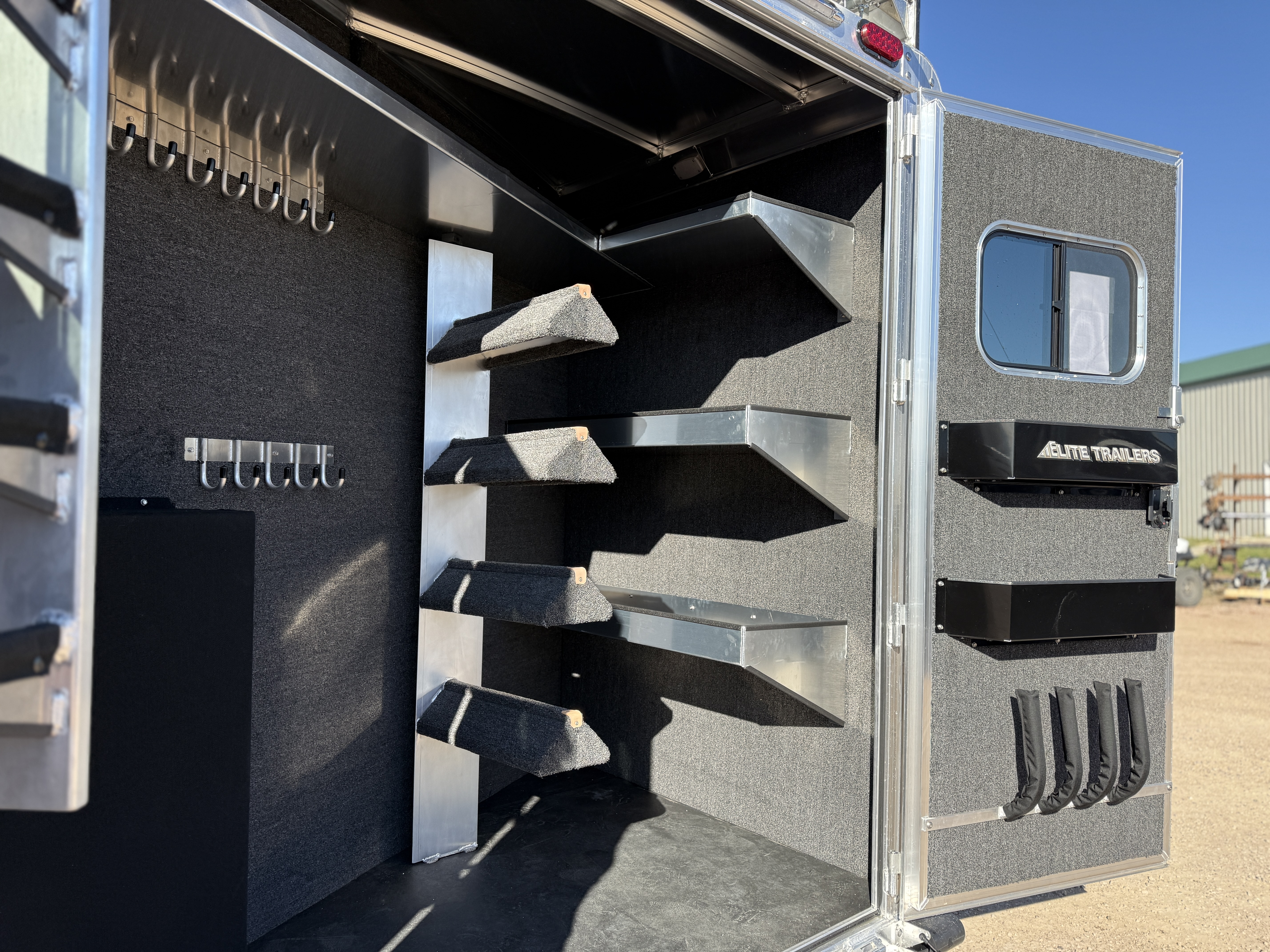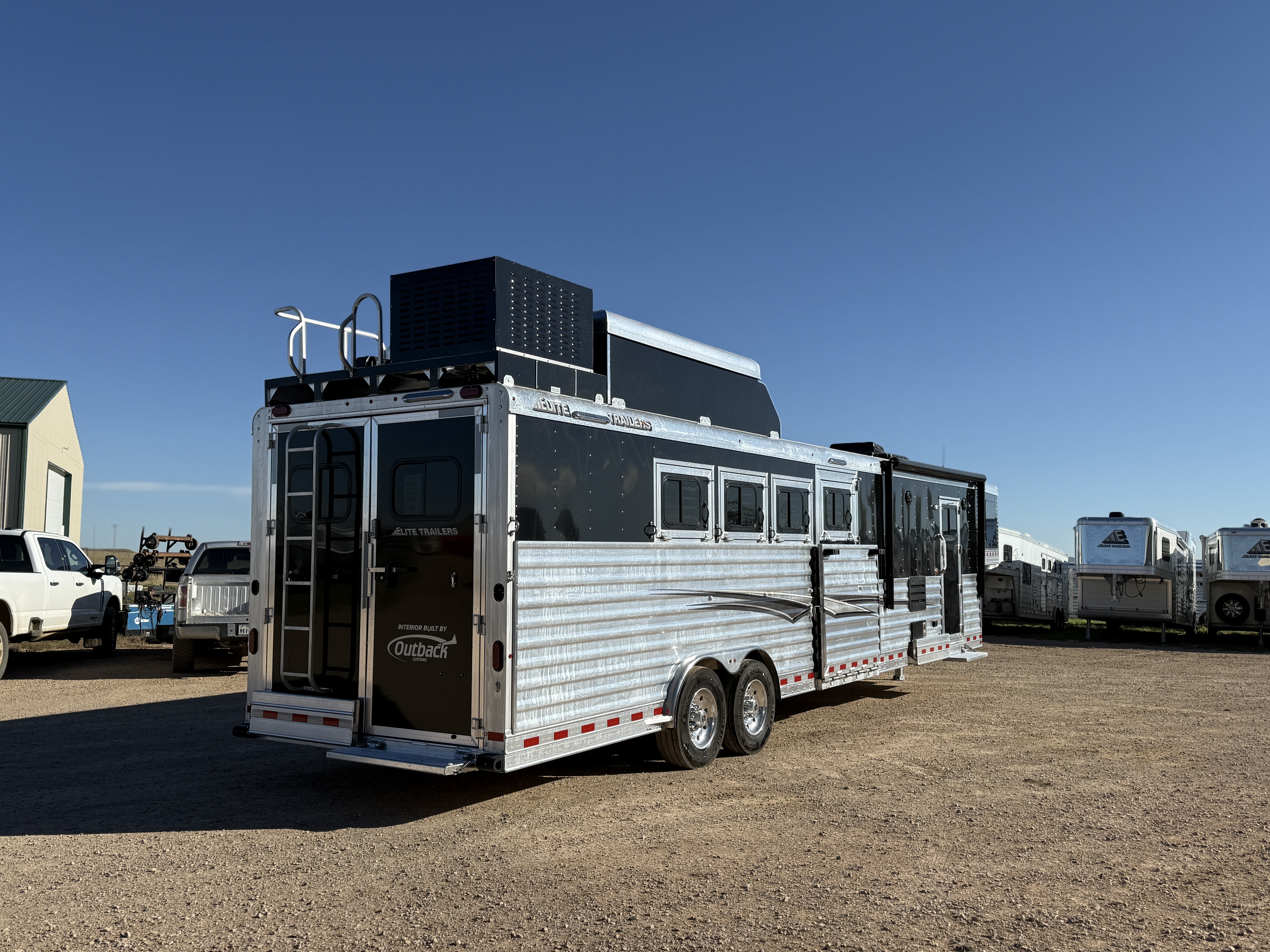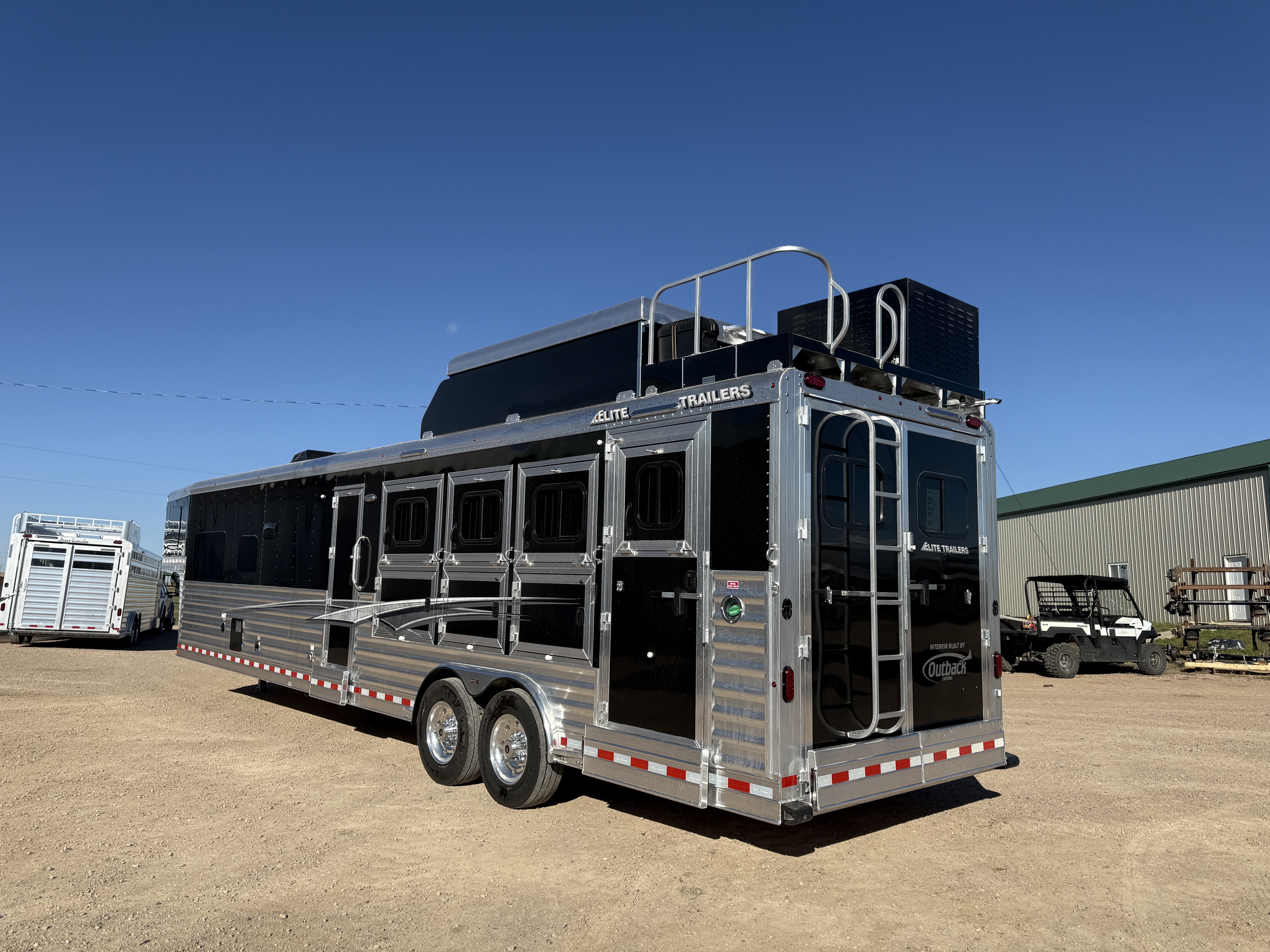This stunning 2026 Elite 4 horse reverse load with a 15' Outback Customs Interior features a sofa-sleeper and a drop-down bunk, an entertainment center with a television, a queen-sized bed, and a hat rack. The full kitchen includes a beautiful sink, recessed cook top, microwave and lots of storage. The private bathroom has a large radius shower, toilet, storage, vanity with a sink and mirror, a large double hanging closet with access from the inside and the outside of the trailer and a walk-through door into the horse area. The horse compartment has air flow dividers, stud stall in the first slant, road-side escape door, mangers with under manger storage and a side load ramp. The full rear tack room has a 4-tier saddle rack, bridle hooks, brush boxes, boot hooks and lots of storage shelves. Additional features include a diesel generator, awning, hay pod with ladder and a hydraulic jack. This trailer has a floor length of 34'.
