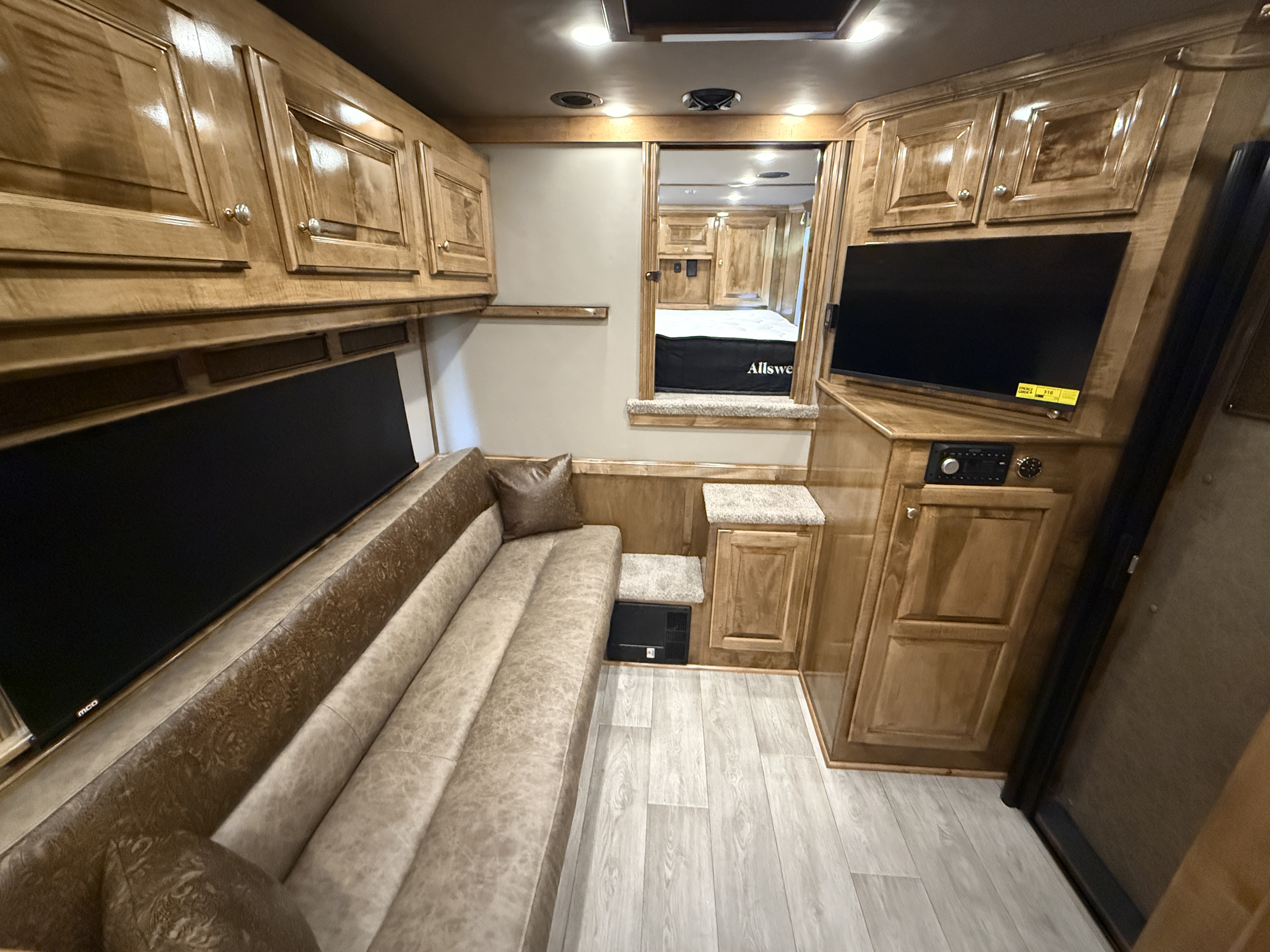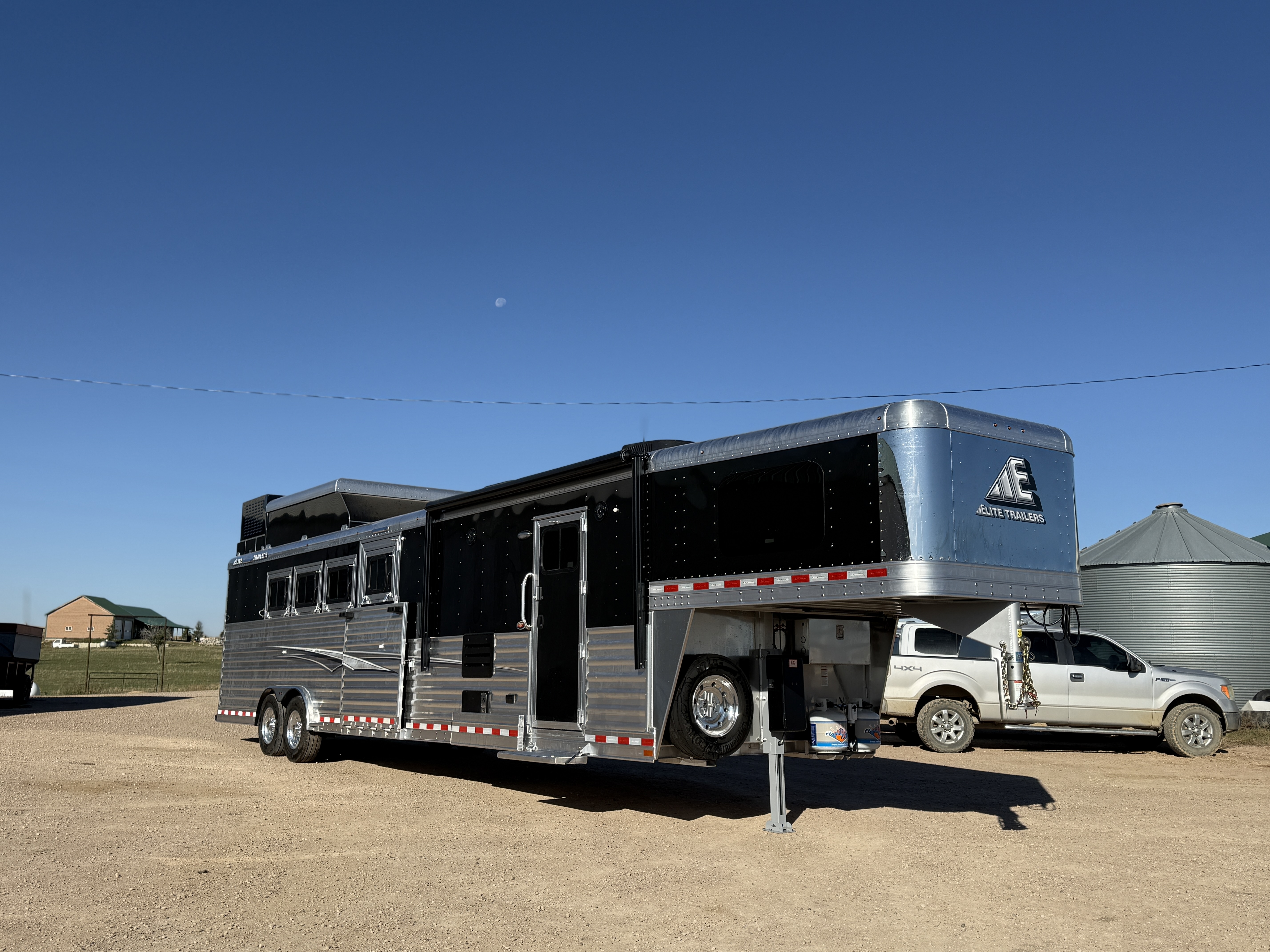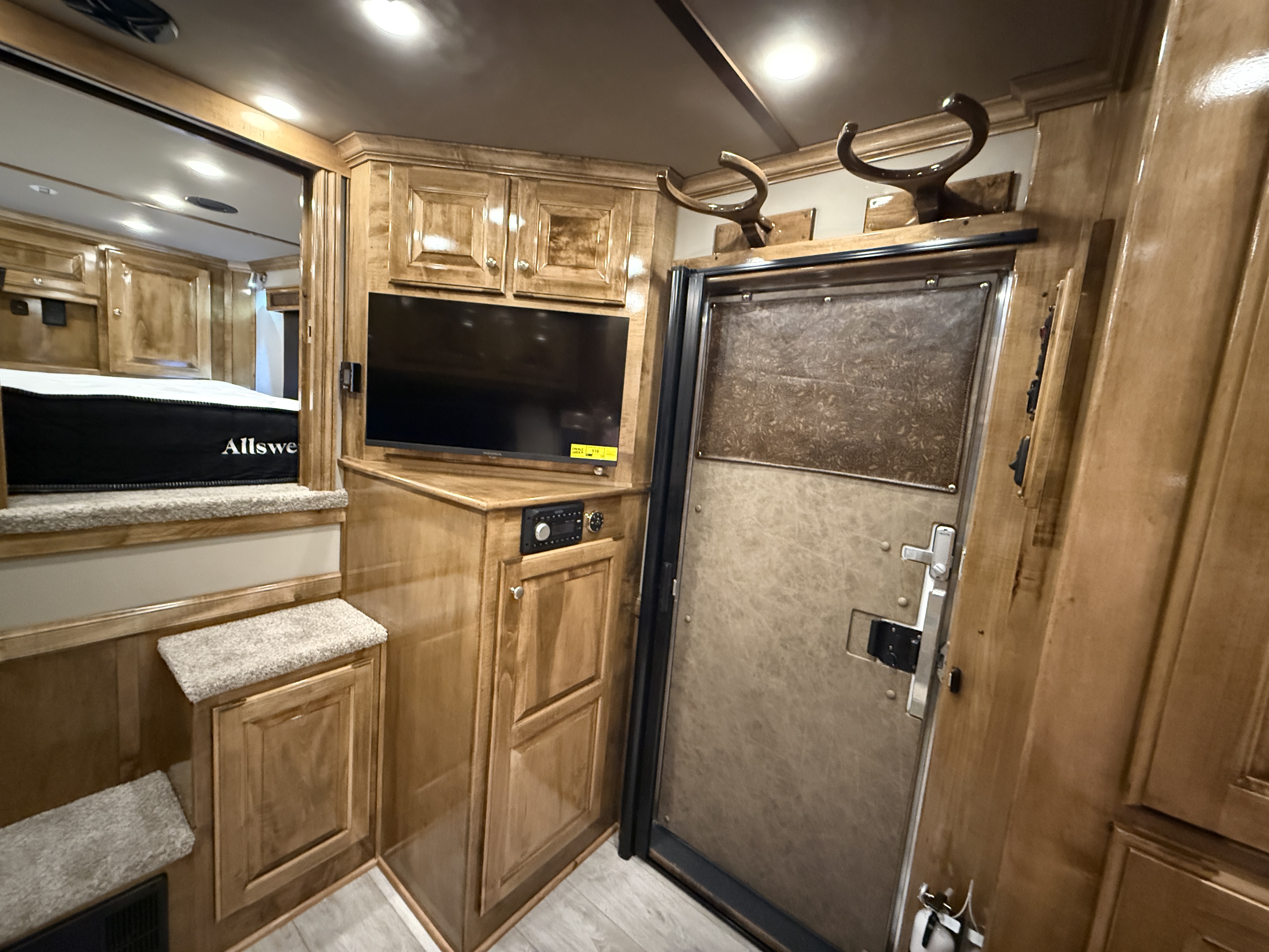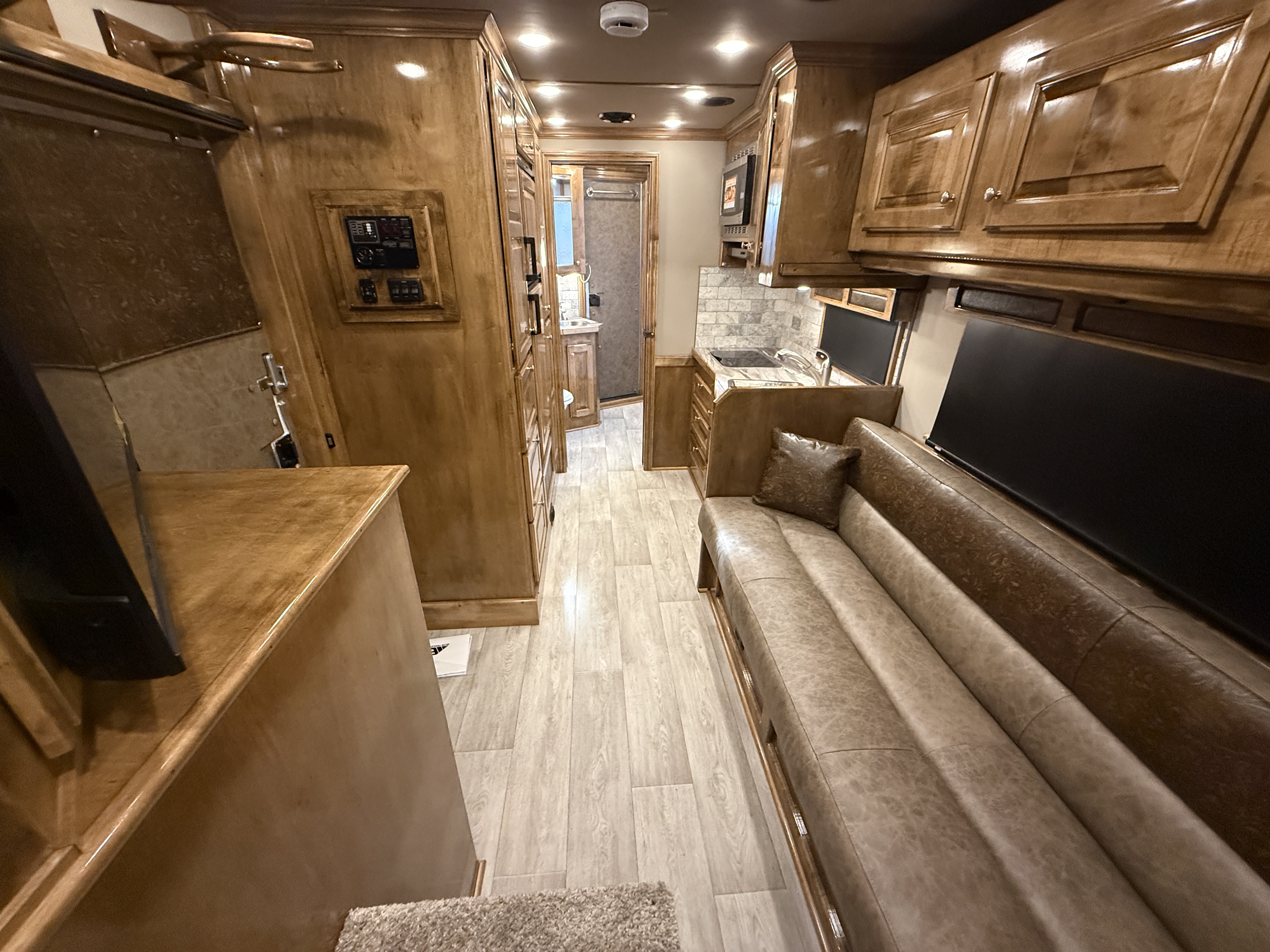 This stunning 2026 Elite 4 horse reverse load with a 15' Outback Customs Interior features a sofa-sleeper and a drop-down bunk, an entertainment center with a television, a queen-sized bed, and a hat rack. The full kitchen includes a beautiful sink, recessed cook top, microwave and lots of storage. The private bathroom has a large radius shower, toilet, storage, vanity with a sink and mirror, a large double hanging closet with access from the inside and the outside of the trailer and a walk-through door into the horse area. The horse compartment has air flow dividers, stud stall in the first slant, road-side escape door, mangers with under manger storage and a side load ramp. The full rear tack room has a 4-tier saddle rack, bridle hooks, brush boxes, boot hooks and lots of storage shelves. Additional features include a diesel generator, awning, hay pod with ladder and a hydraulic jack. This trailer has a floor length of 34'.