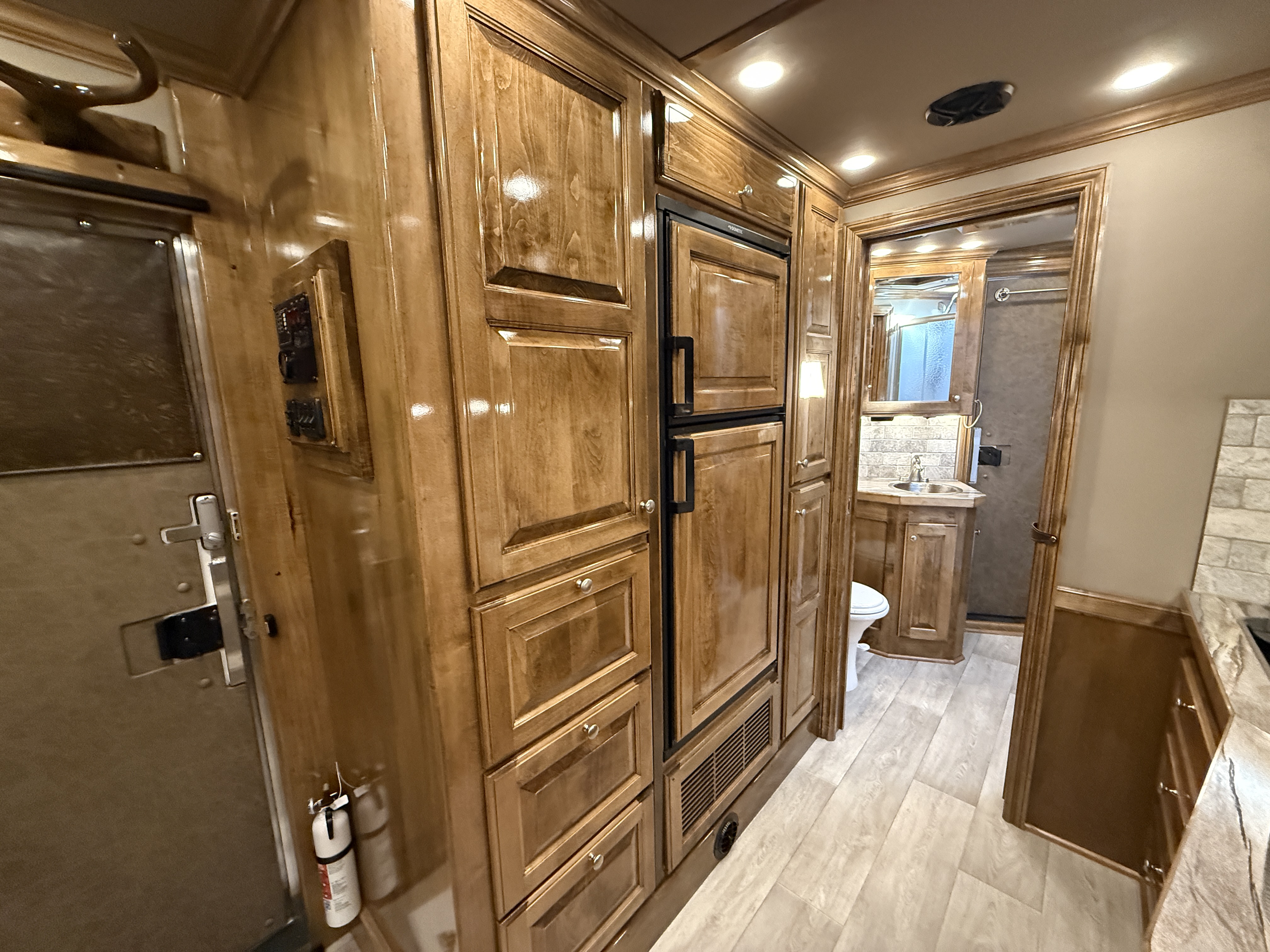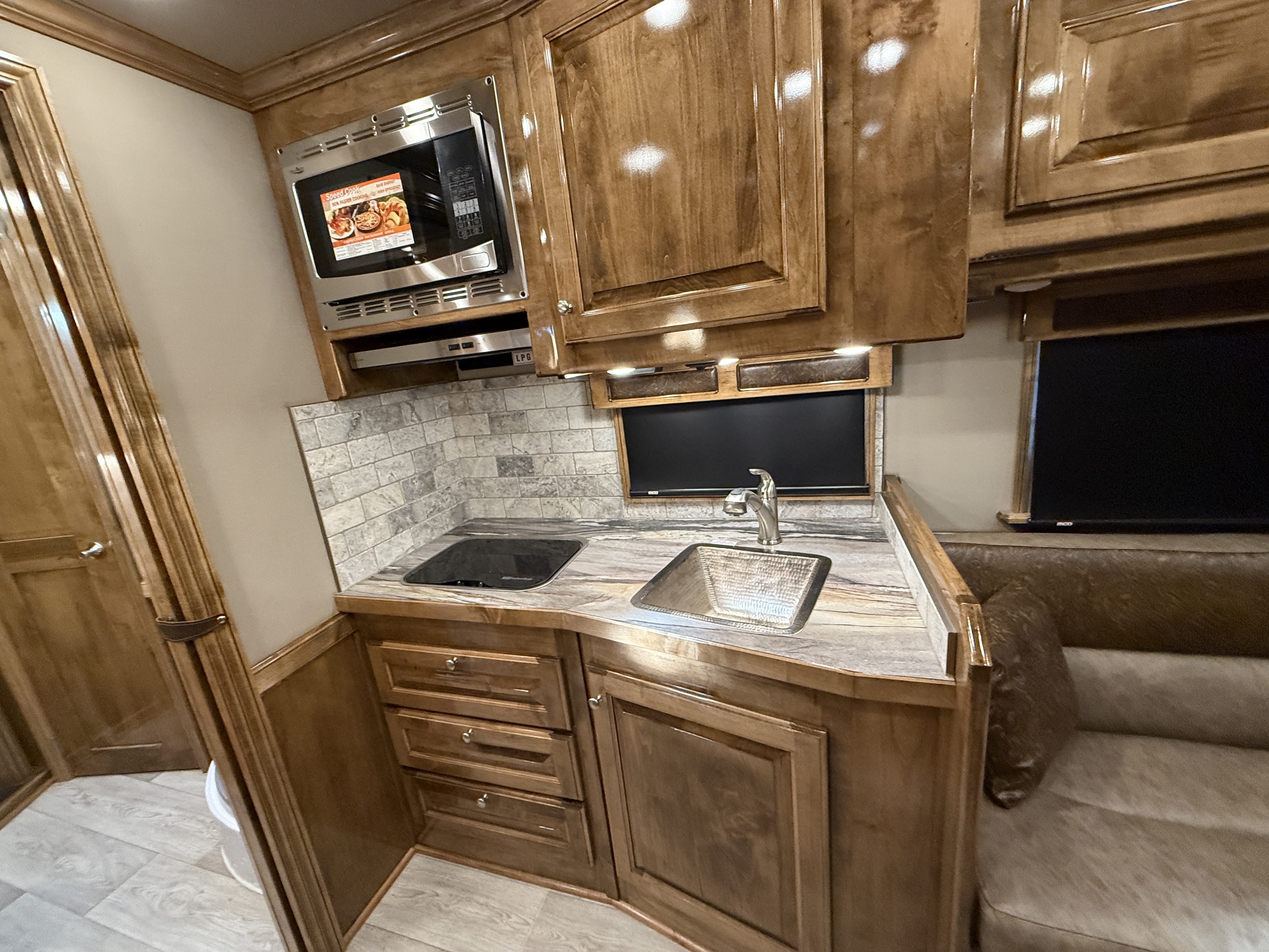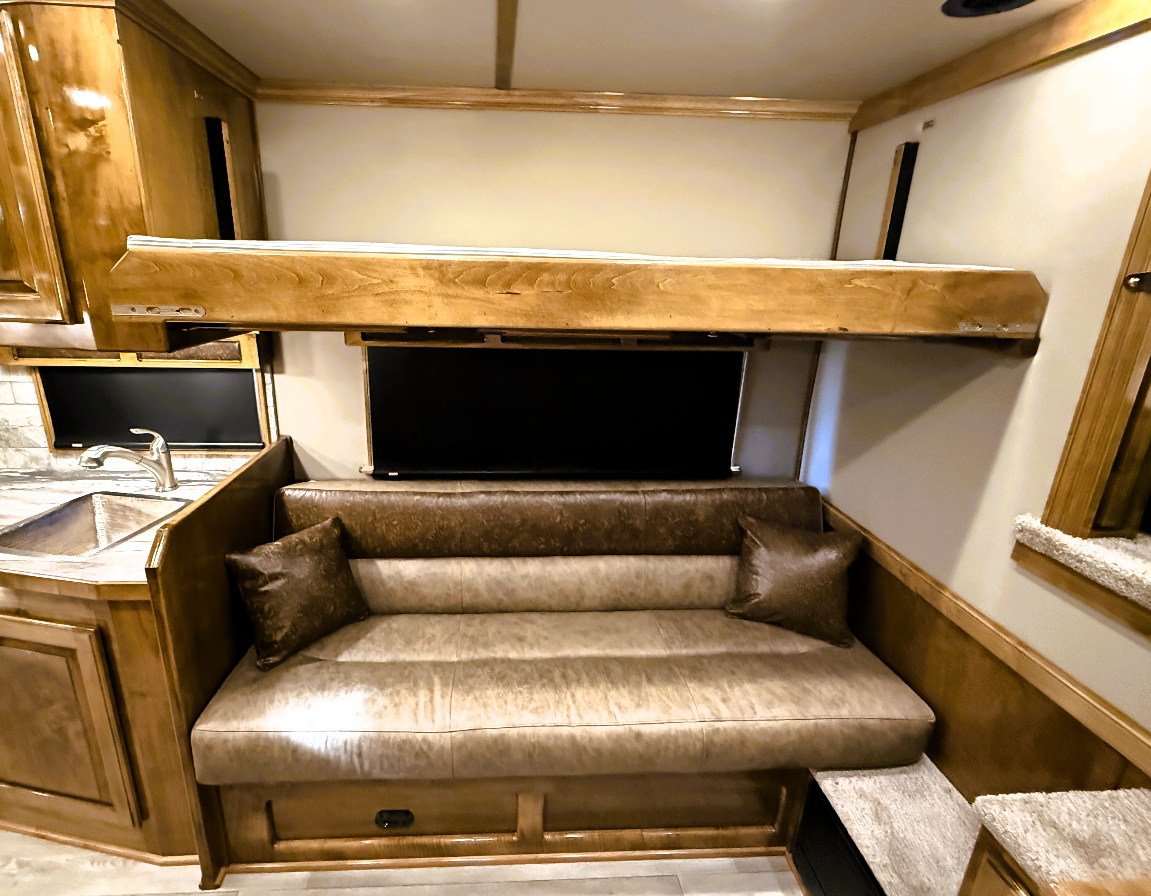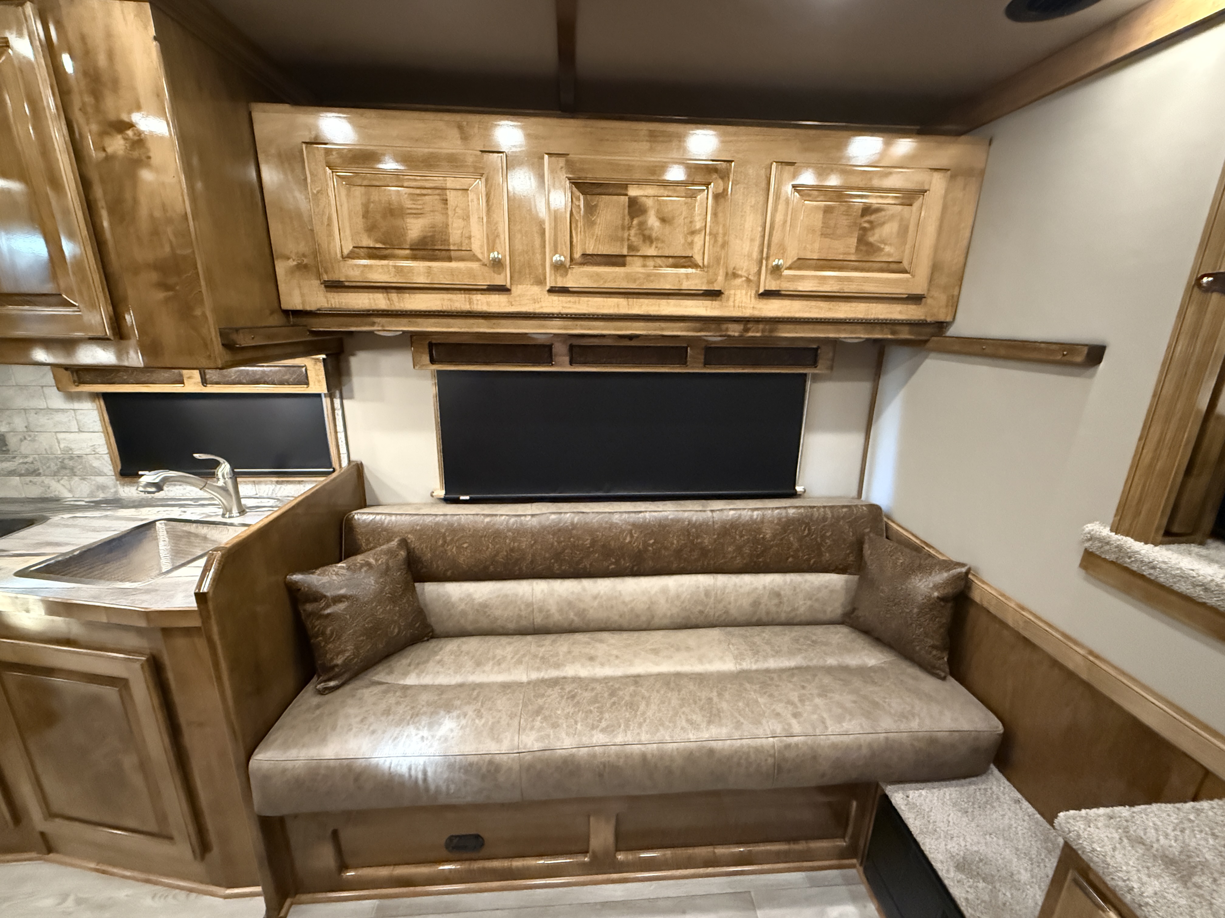 This stunning 2026 Elite 4 horse reverse load with a 15' Outback Customs Interior features a sofa-sleeper and a drop-down bunk, an entertainment center with a television, a queen-sized bed, and a hat rack. The full kitchen includes a beautiful sink, recessed cook top, microwave and lots of storage. The private bathroom has a large radius shower, toilet, storage, vanity with a sink and mirror, a large double hanging closet with access from the inside and the outside of the trailer and a walk-through door into the horse area. The horse compartment has air flow dividers, stud stall in the first slant, road-side escape door, mangers with under manger storage and a side load ramp. The full rear tack room has a 4-tier saddle rack, bridle hooks, brush boxes, boot hooks and lots of storage shelves. Additional features include a diesel generator, awning, hay pod with ladder and a hydraulic jack. This trailer has a floor length of 34'.