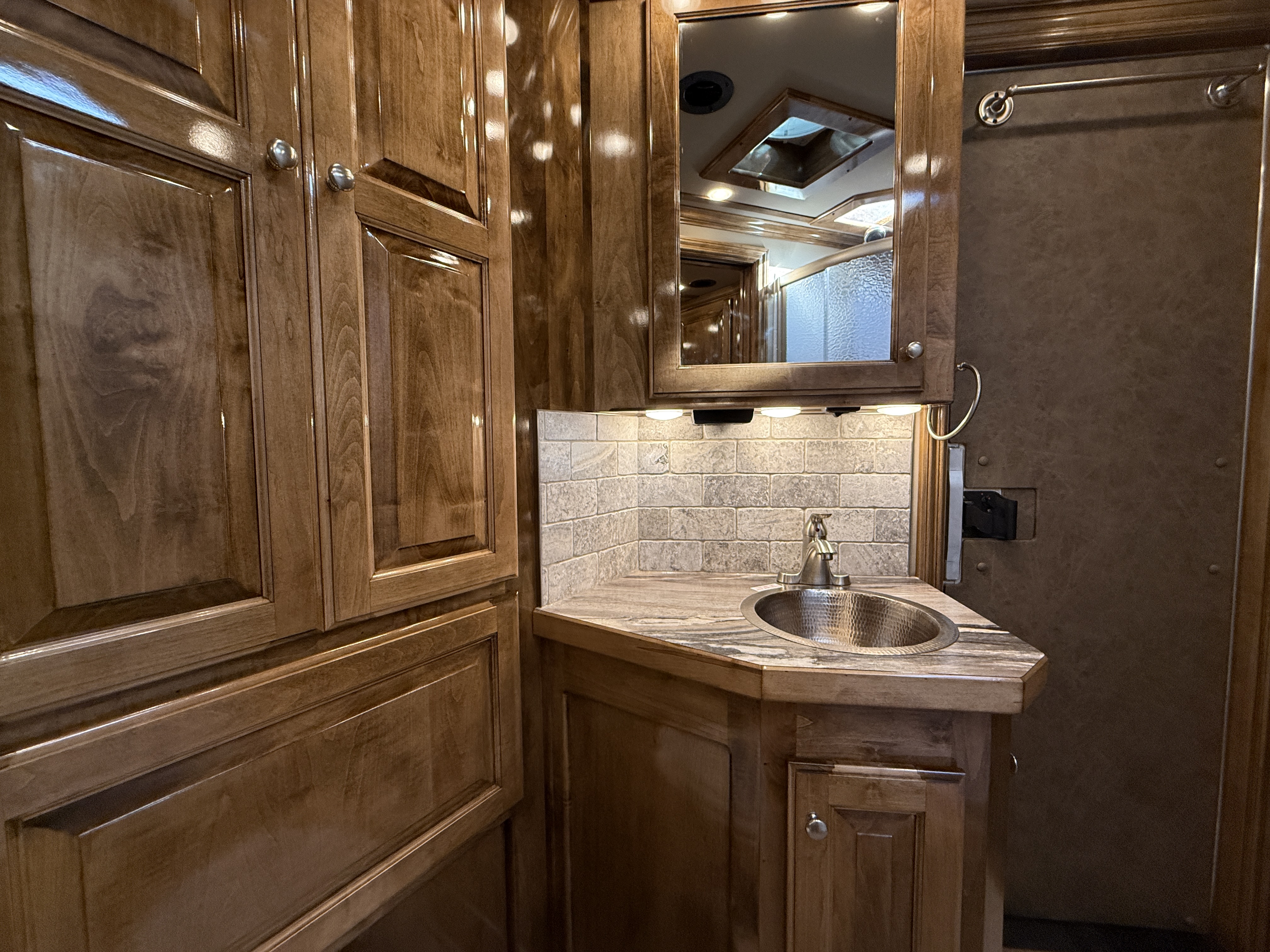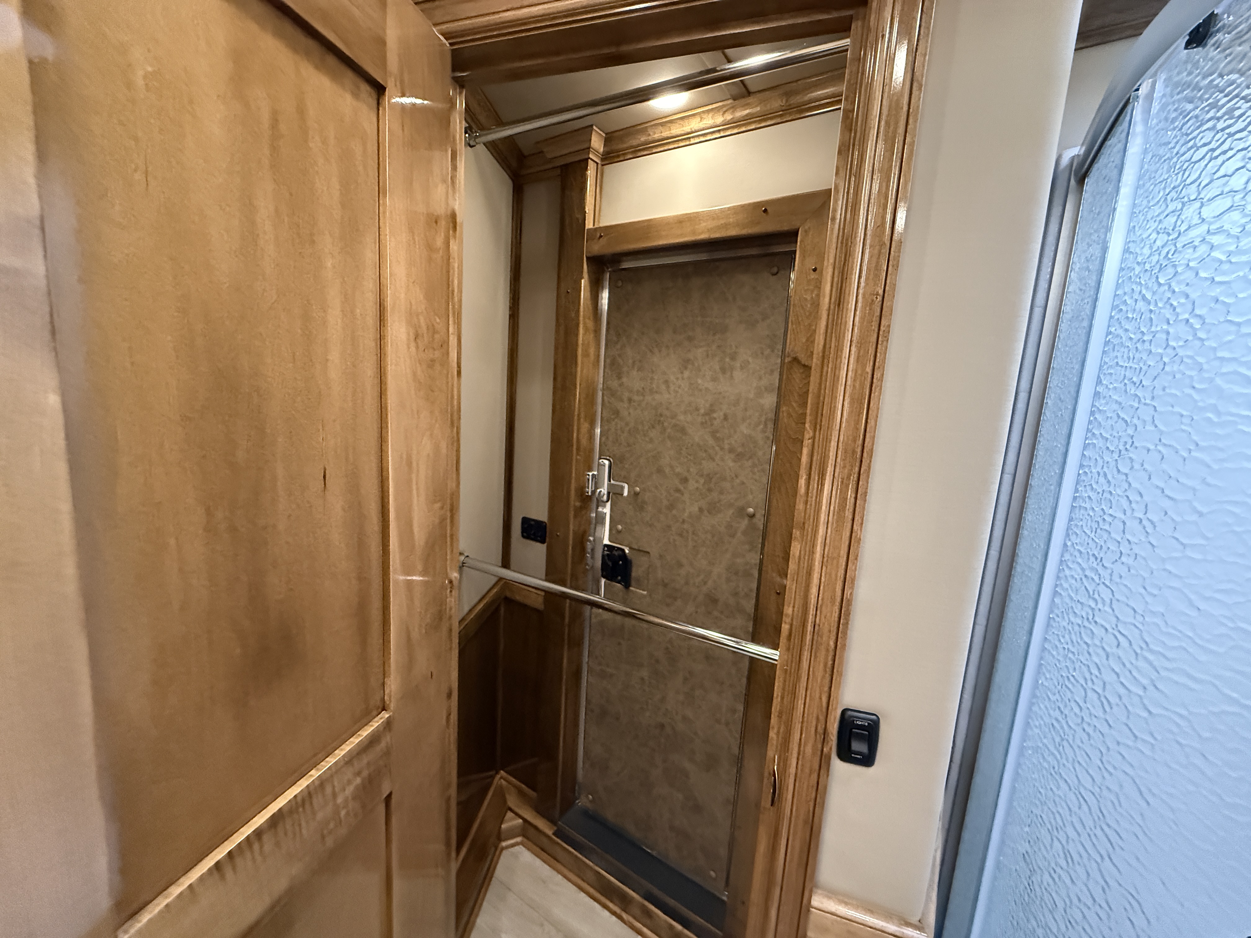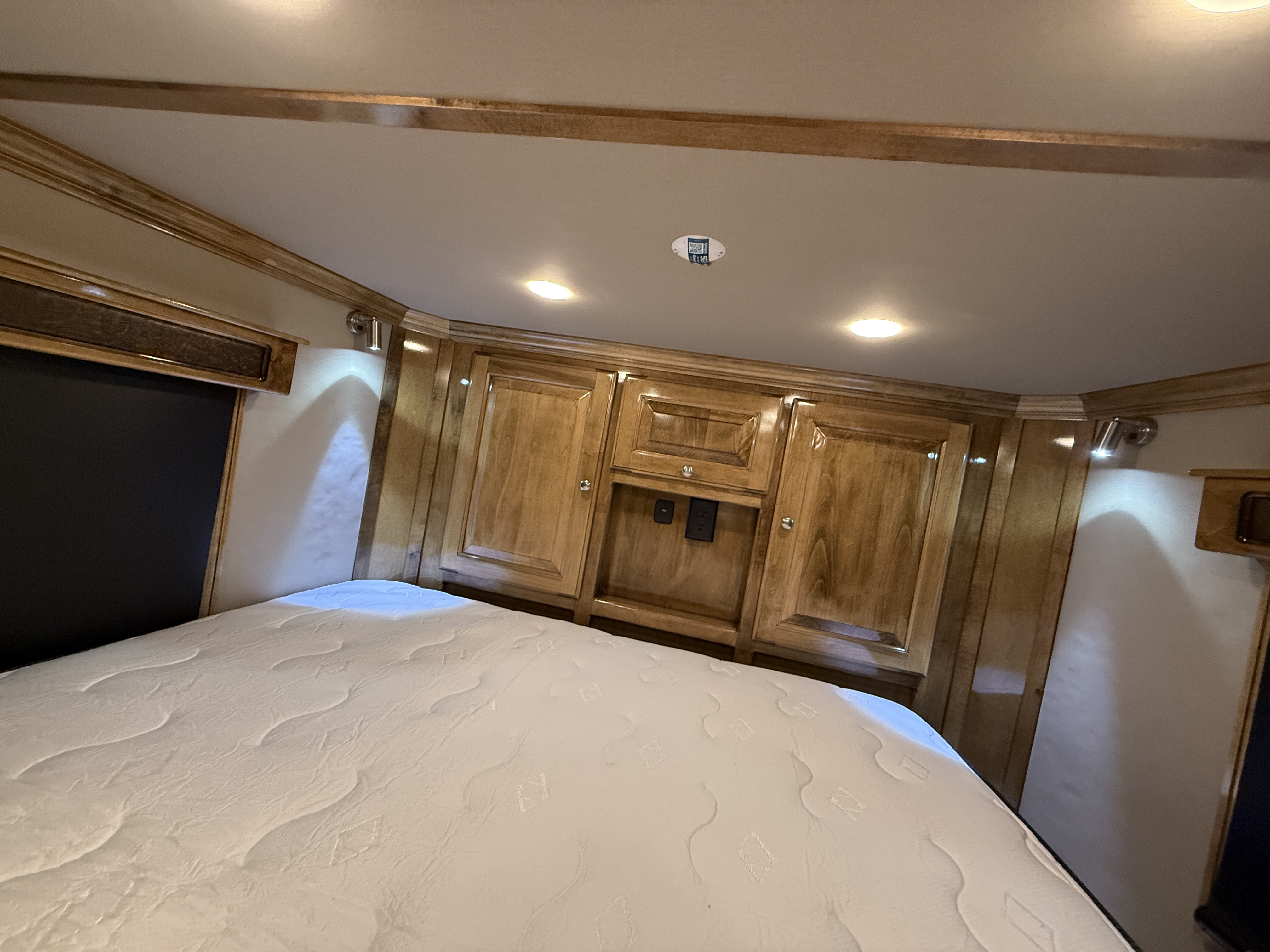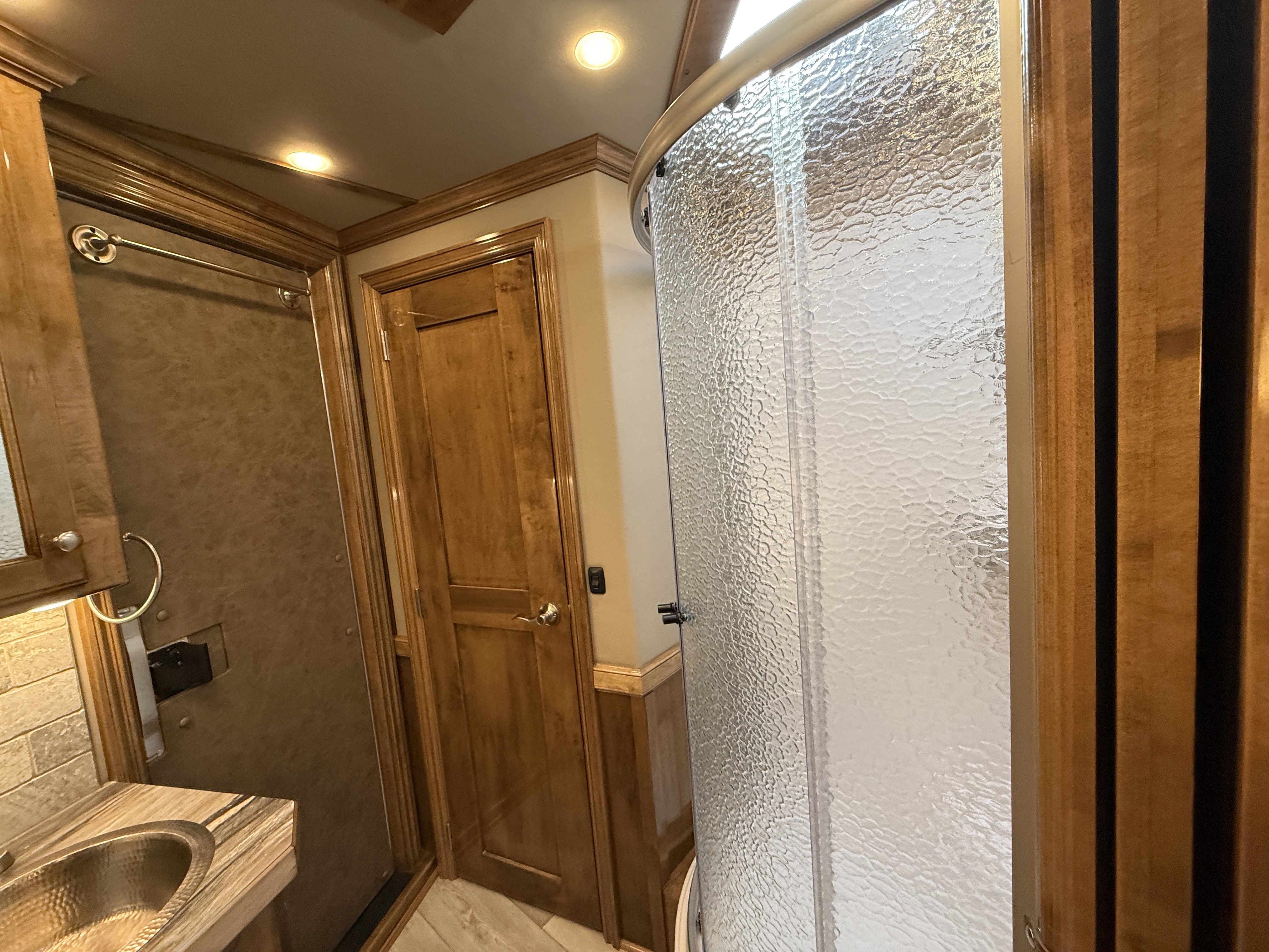 This stunning 2026 Elite 4 horse reverse load with a 15' Outback Customs Interior features a sofa-sleeper and a drop-down bunk, an entertainment center with a television, a queen-sized bed, and a hat rack. The full kitchen includes a beautiful sink, recessed cook top, microwave and lots of storage. The private bathroom has a large radius shower, toilet, storage, vanity with a sink and mirror, a large double hanging closet with access from the inside and the outside of the trailer and a walk-through door into the horse area. The horse compartment has air flow dividers, stud stall in the first slant, road-side escape door, mangers with under manger storage and a side load ramp. The full rear tack room has a 4-tier saddle rack, bridle hooks, brush boxes, boot hooks and lots of storage shelves. Additional features include a diesel generator, awning, hay pod with ladder and a hydraulic jack. This trailer has a floor length of 34'.