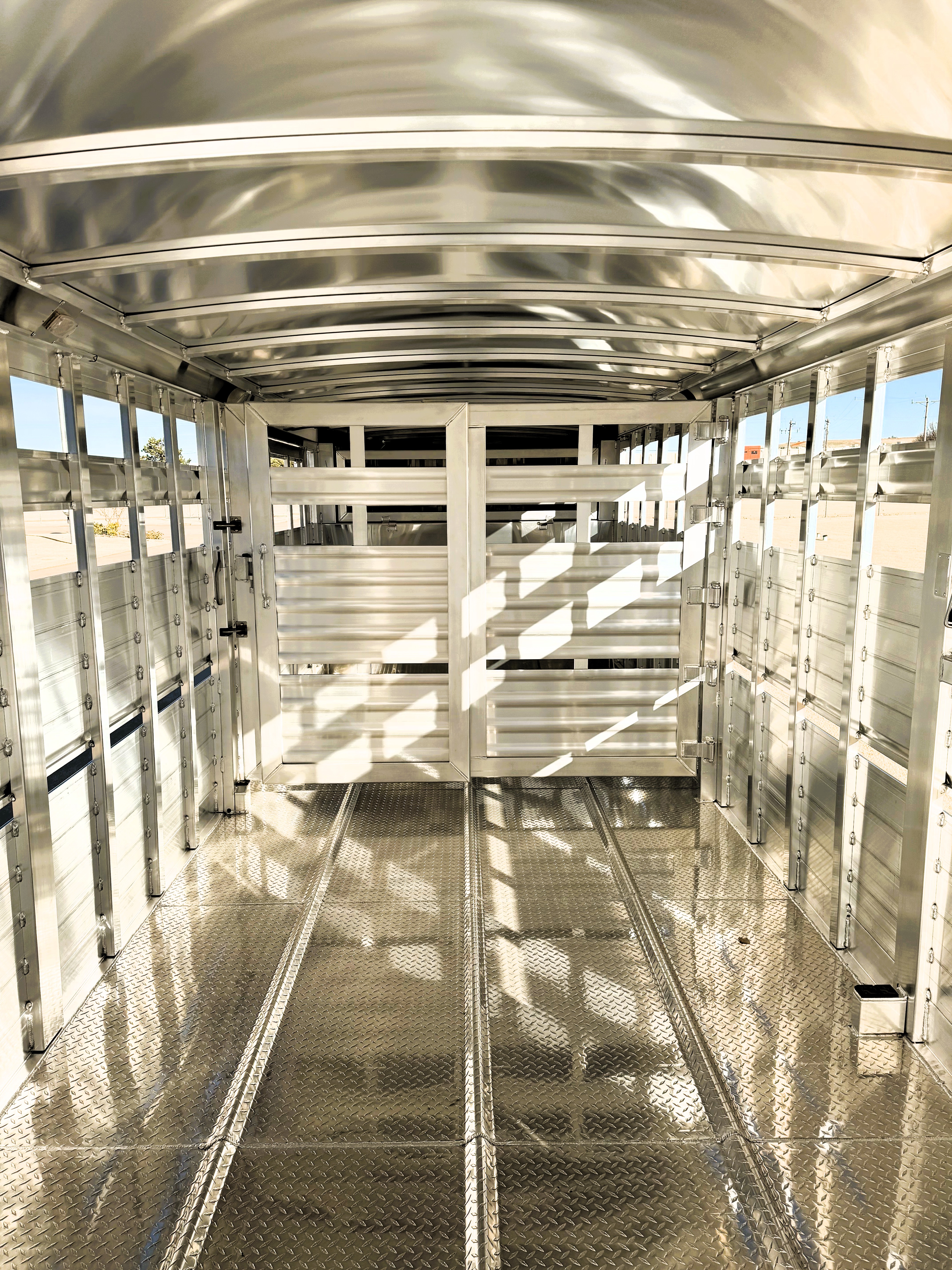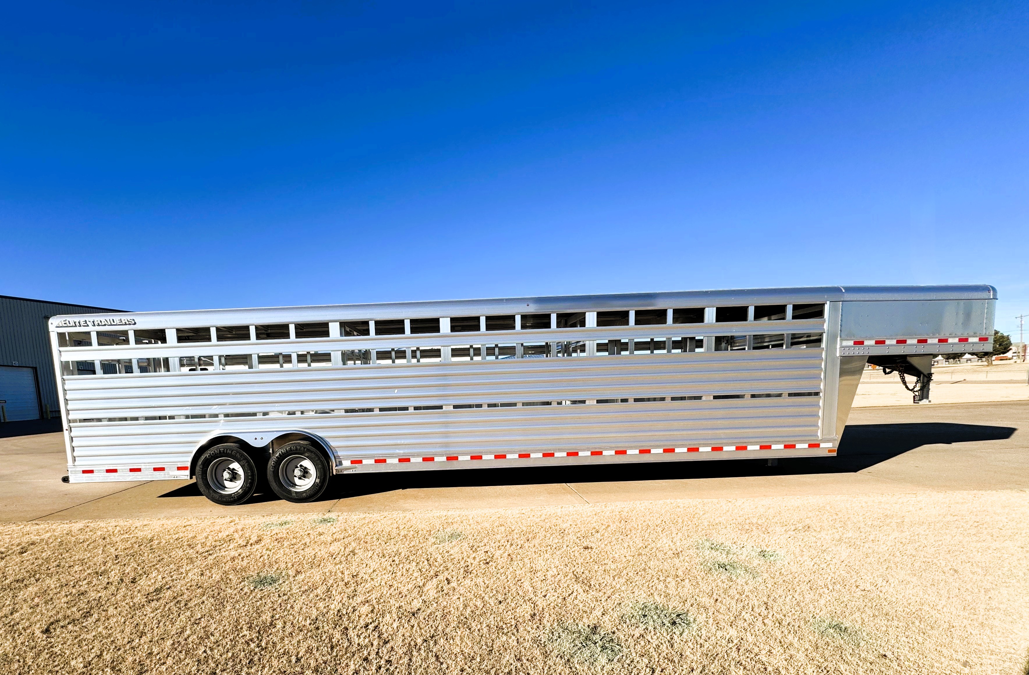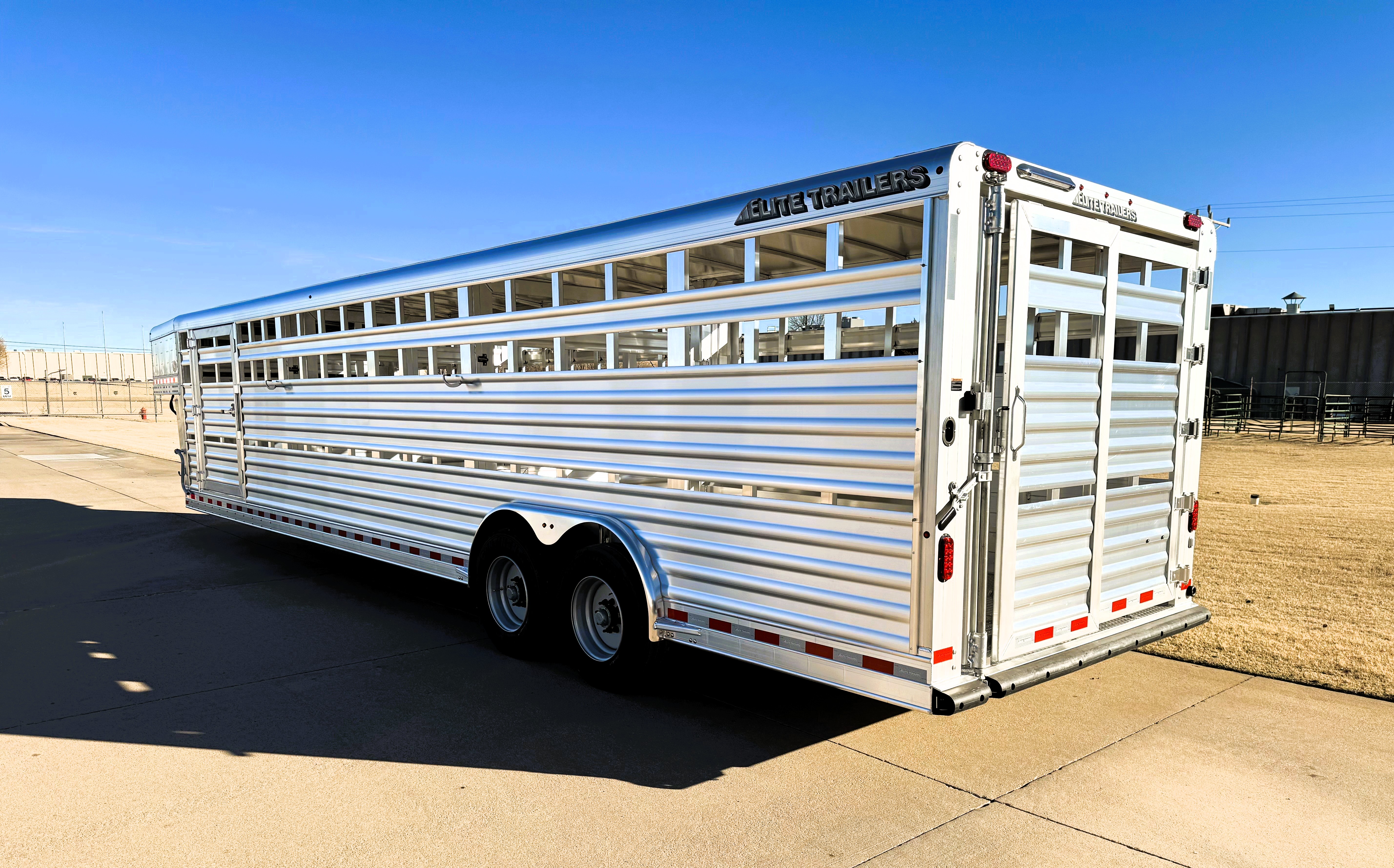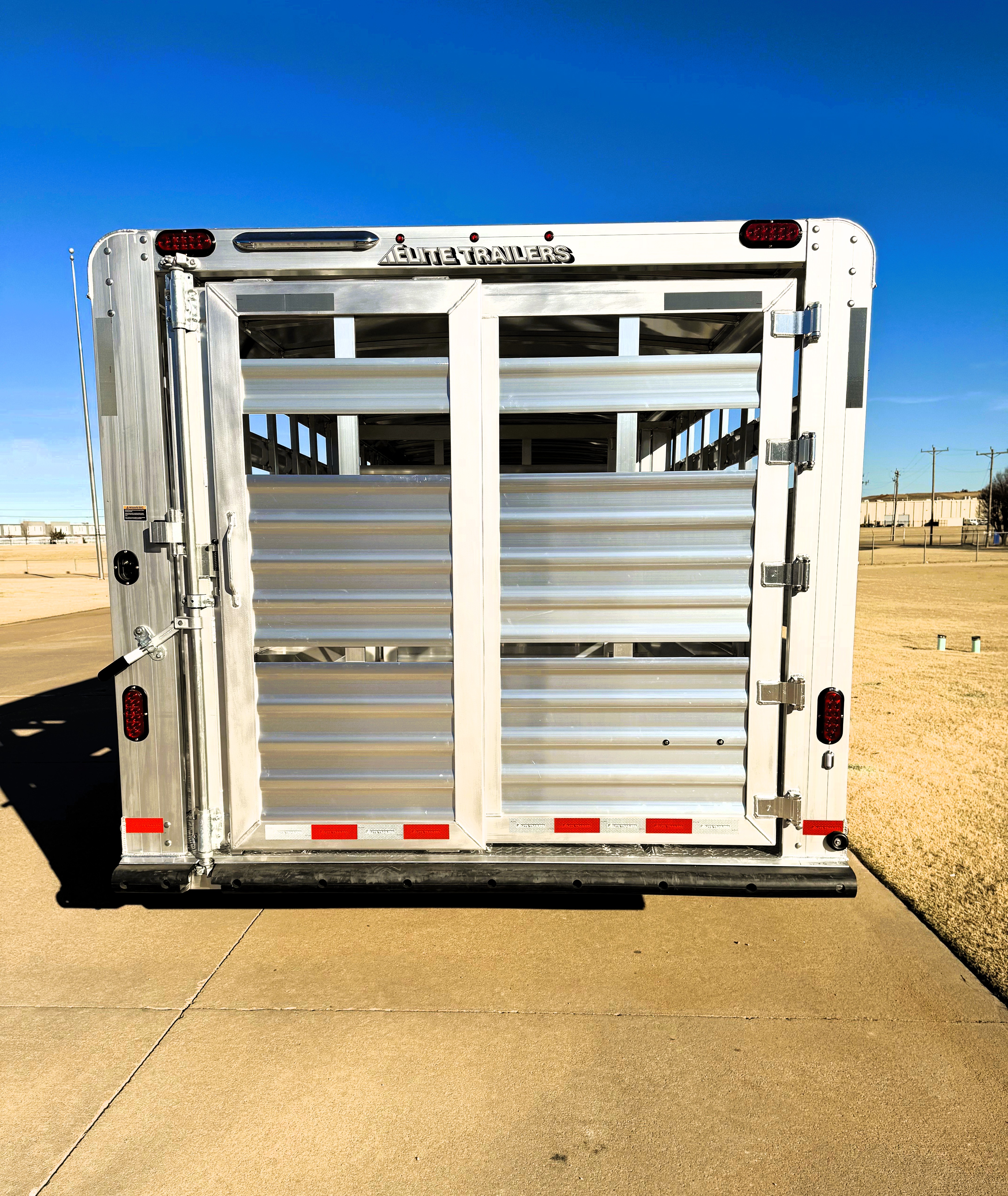 This 32' Elite stock trailer has 2 cut gates, with the front gate having a 1/2 slider, calf gates in the nose, a 50' roadside escape door, and an extra 2" side vent cut out for extra air flow. Along with a full rear door with a sliding gate.