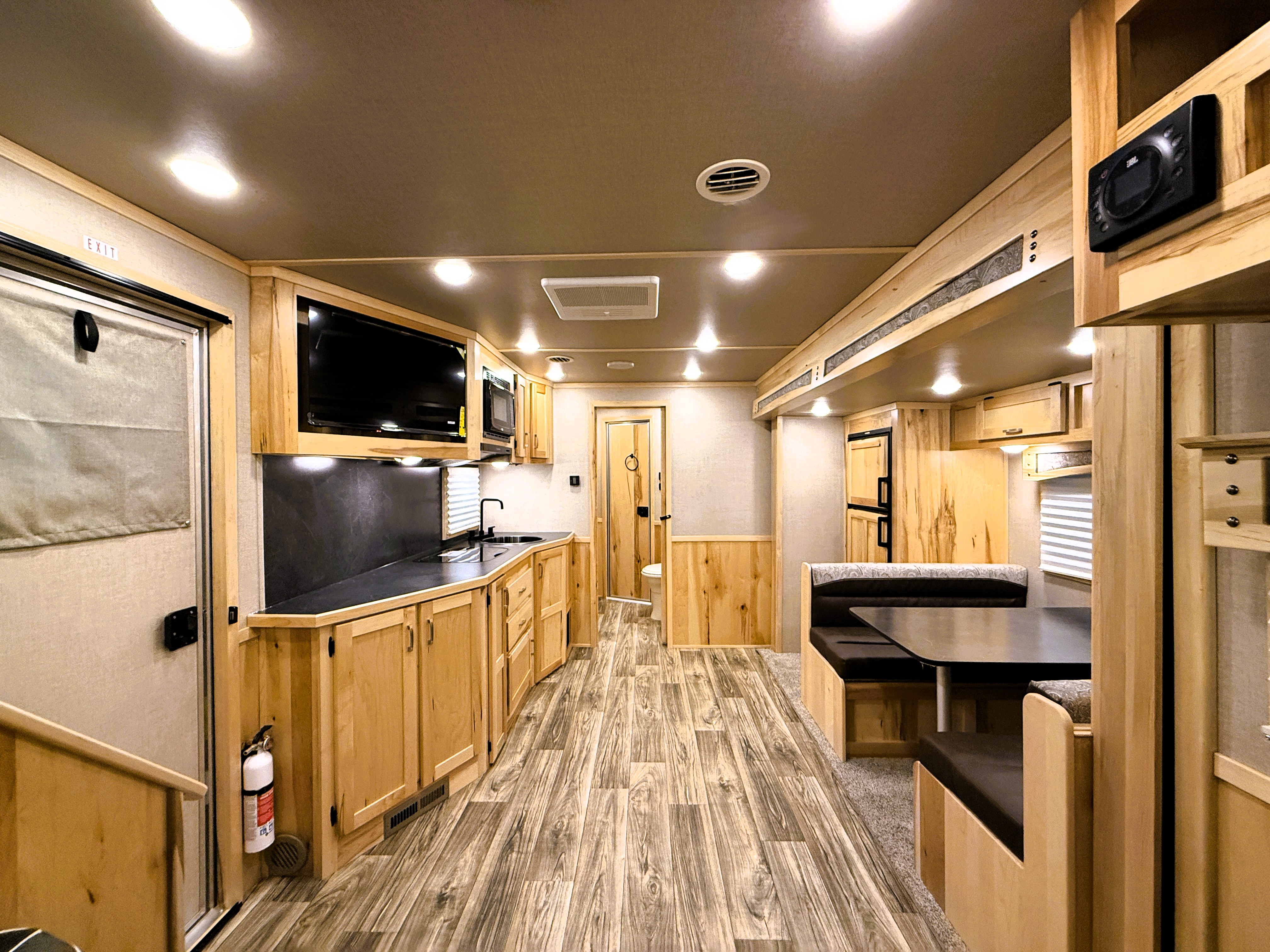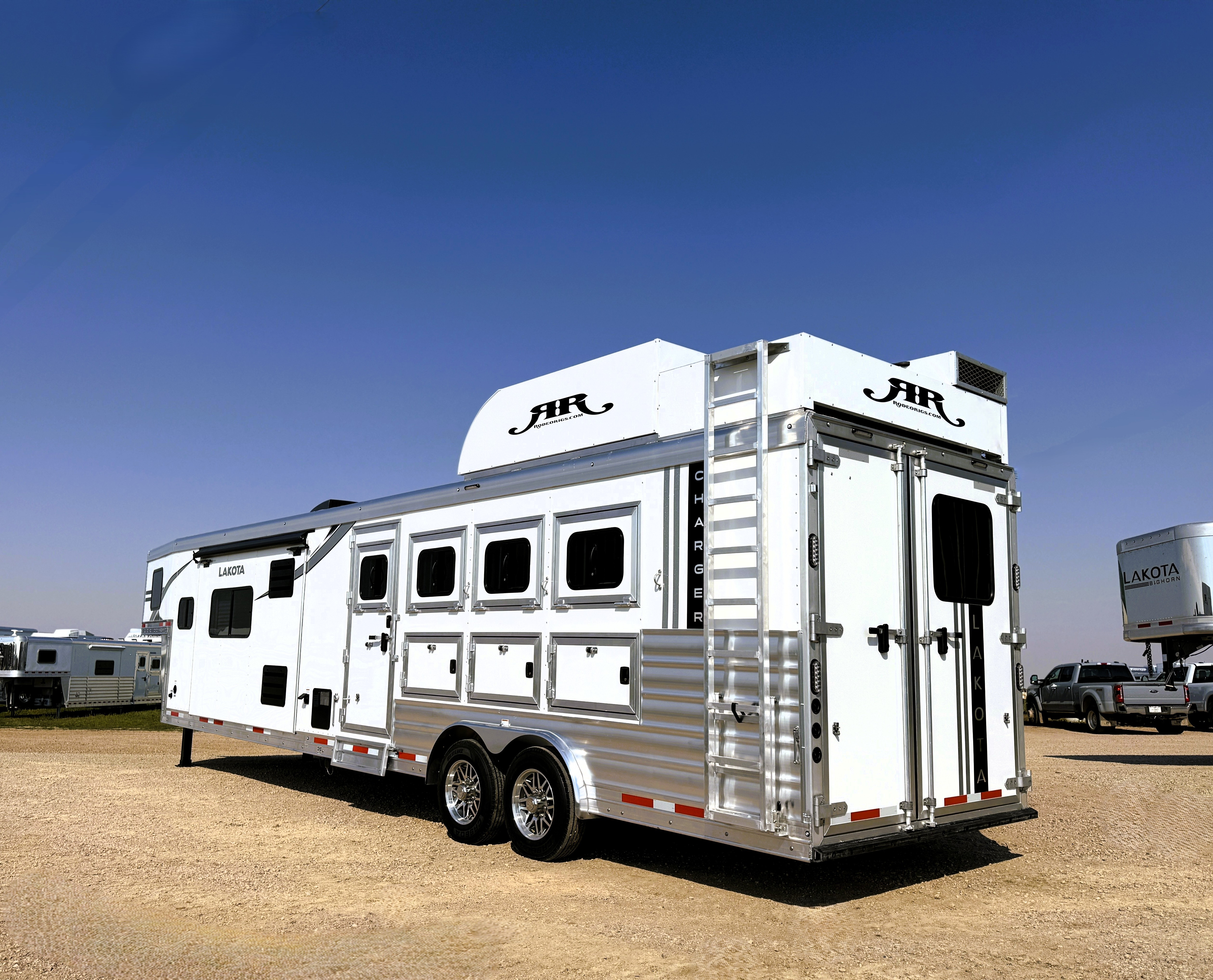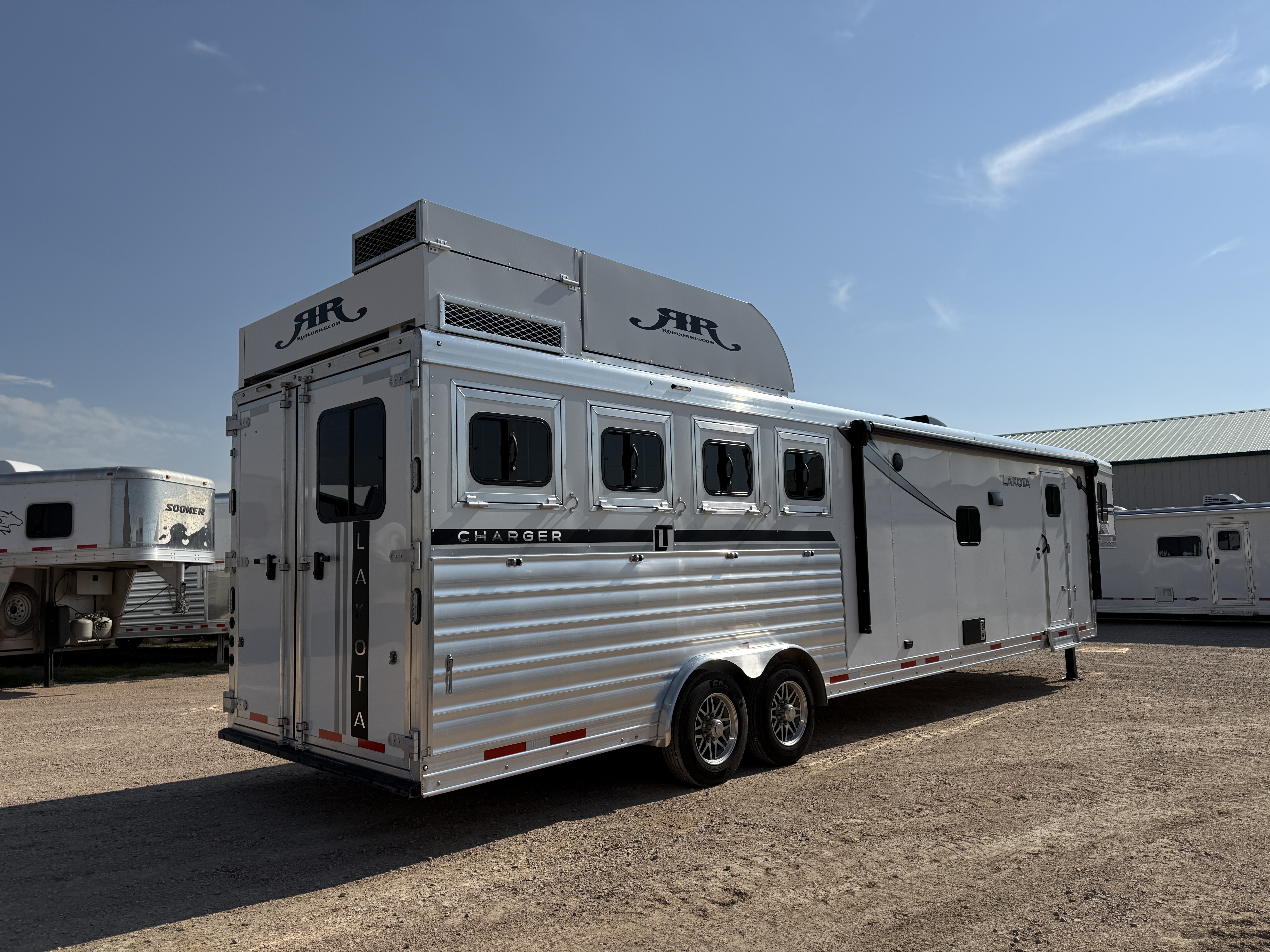 This 4 horse Lakota Charger has a 15' living quarters with a 9' slide-out that includes a dinette-sleeper and a large refrigerator, along with a sofa-sleeper on the riser wall. The full kitchen includes a sink, recessed cook-top, microwave, and lots of storage. The fully private bathroom includes a radius shower, sink with a vanity and mirror, closet and a walk-through door into the horse area. The horse area features air flow dividers, a stud stall in the first slant, mangers with under manger storage, a roadside escape door and kick matting all the way around. The corner rear tack has an adjustable 4-tier saddle rack, blanket bars and lots of bridle hooks. Additional features include dual hydraulic jacks, electric awning, and a hay pod with ladder. This trailer has a floor length of 33'.