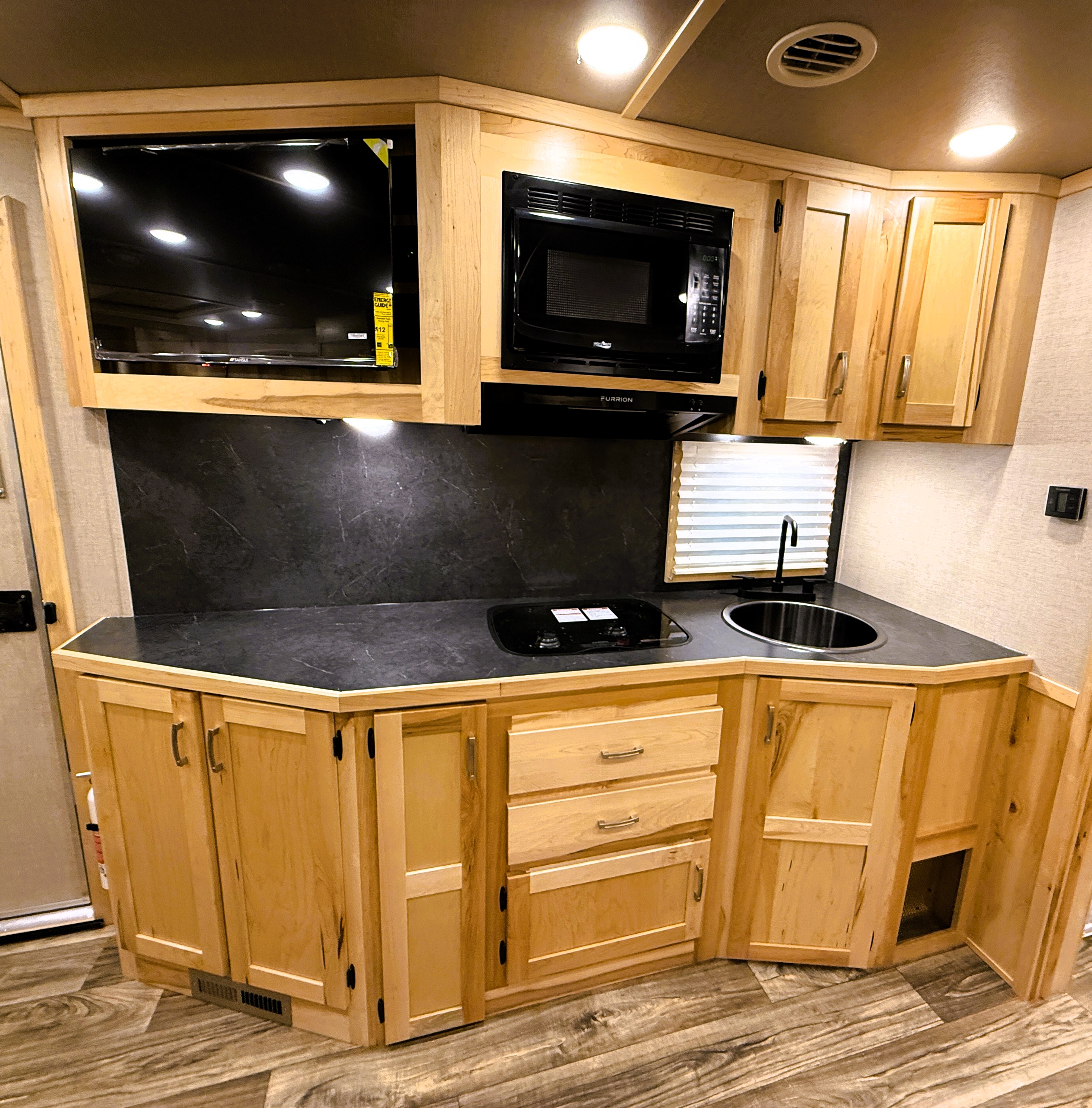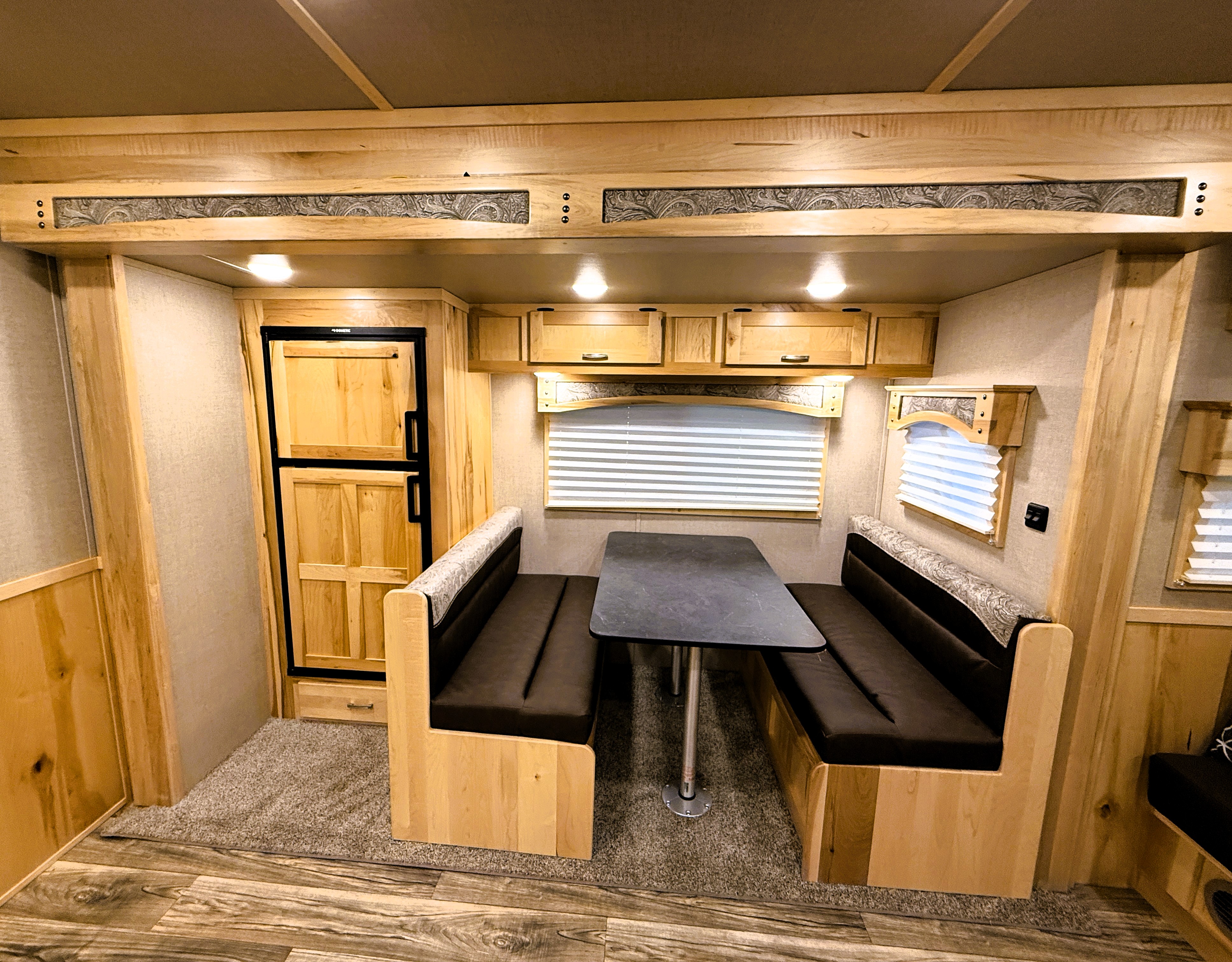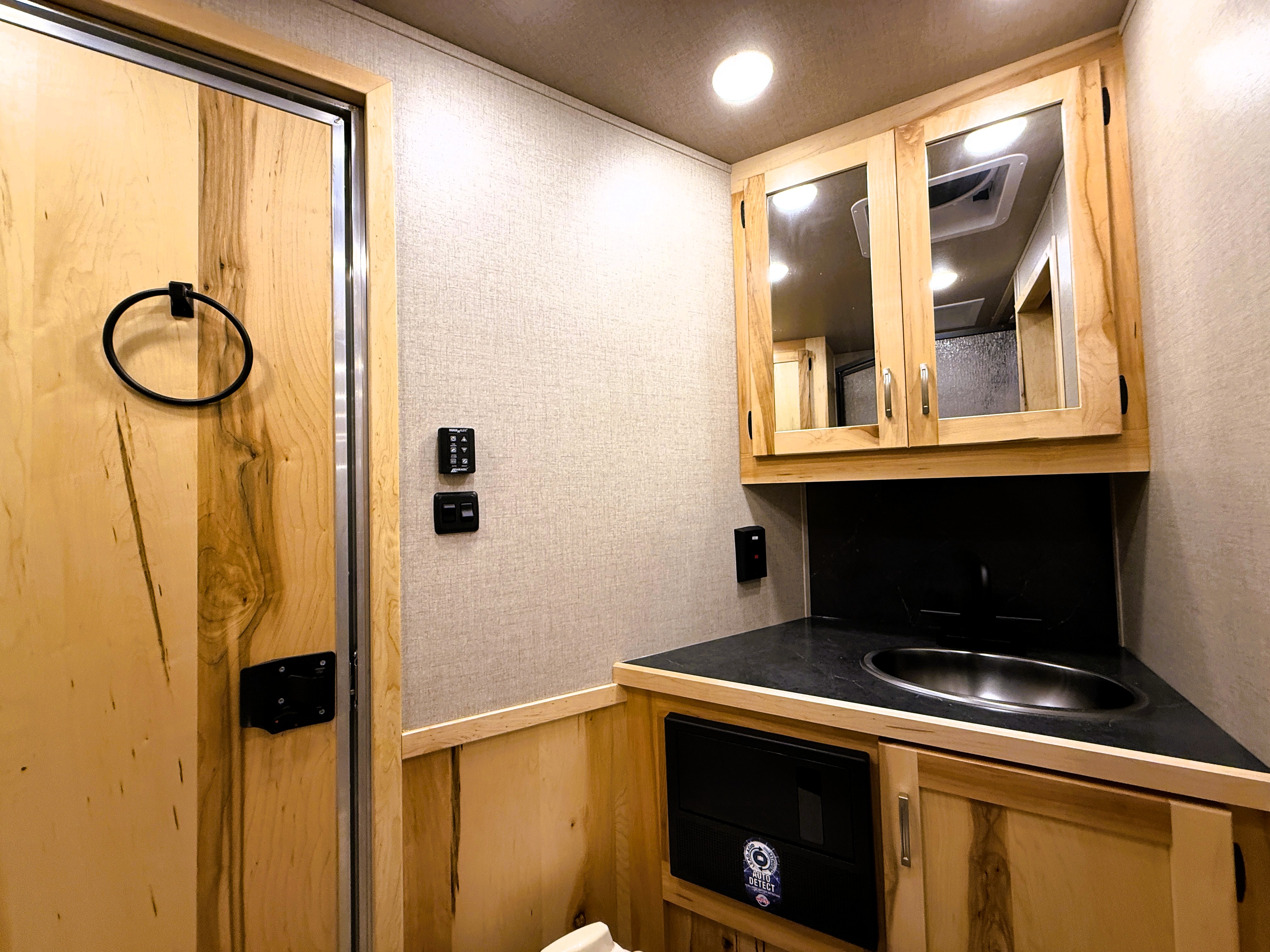 This 4 horse Lakota Charger has a 15' living quarters with a 9' slide-out that includes a dinette-sleeper and a large refrigerator, along with a sofa-sleeper on the riser wall. The full kitchen includes a sink, recessed cook-top, microwave, and lots of storage. The fully private bathroom includes a radius shower, sink with a vanity and mirror, closet and a walk-through door into the horse area. The horse area features air flow dividers, a stud stall in the first slant, mangers with under manger storage, a roadside escape door and kick matting all the way around. The corner rear tack has an adjustable 4-tier saddle rack, blanket bars and lots of bridle hooks. Additional features include dual hydraulic jacks, electric awning, and a hay pod with ladder. This trailer has a floor length of 33'.