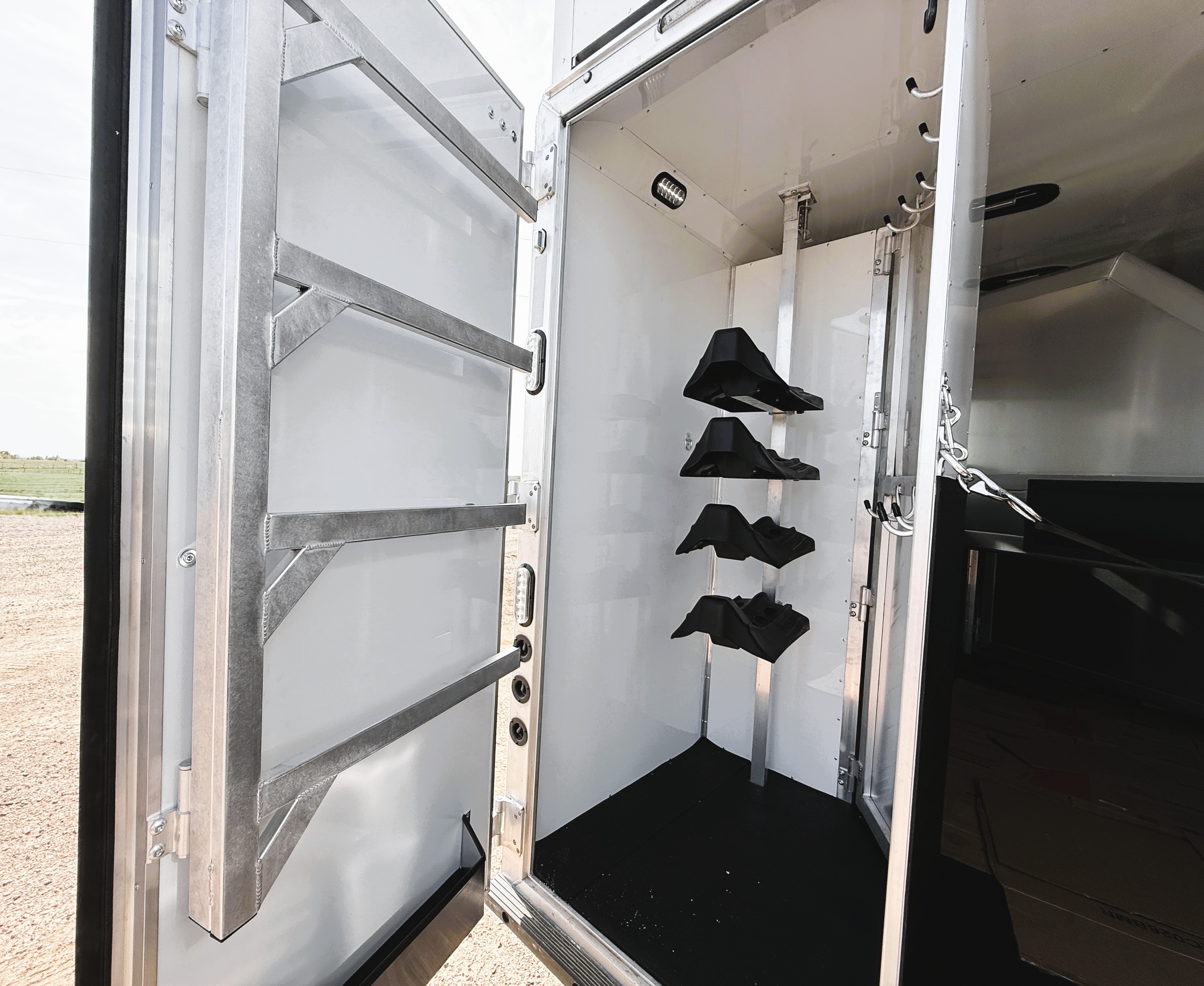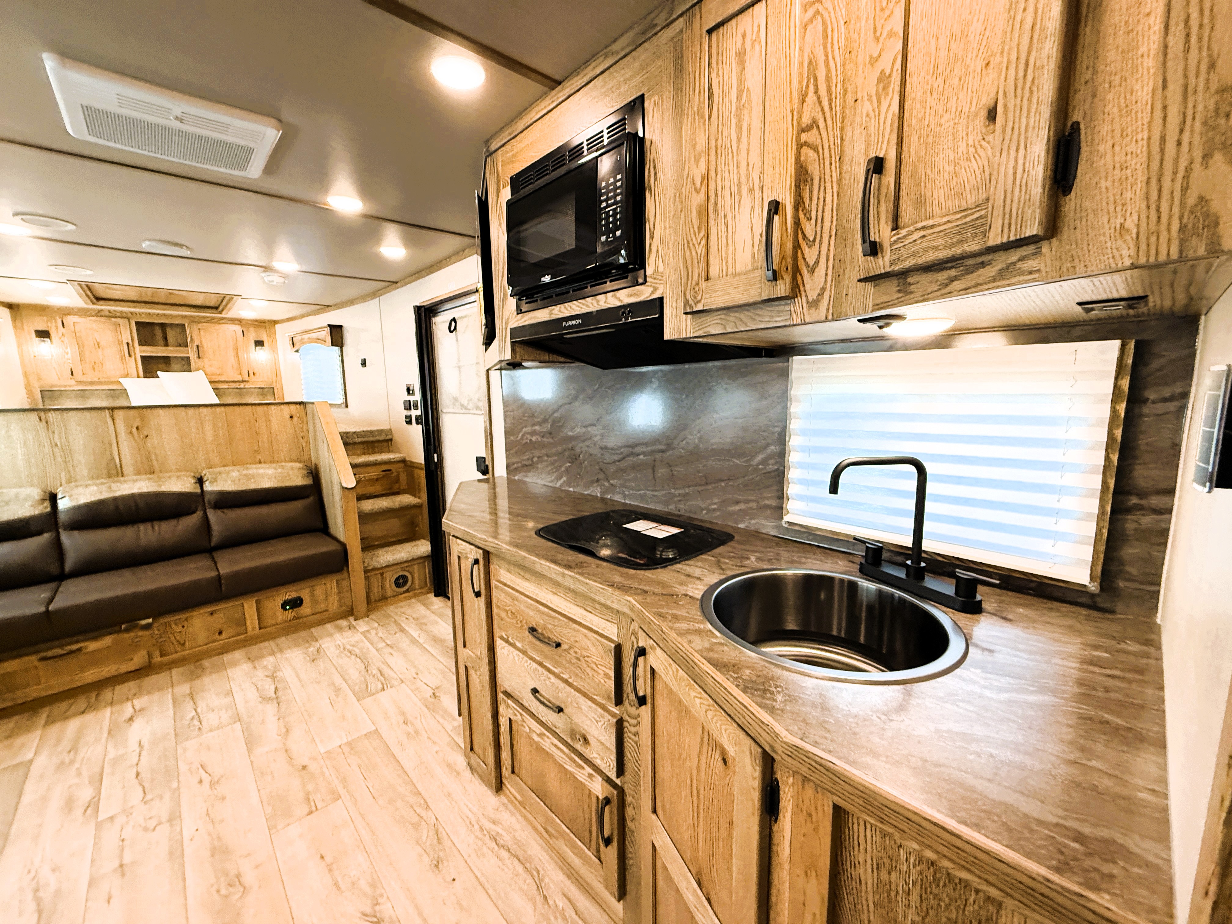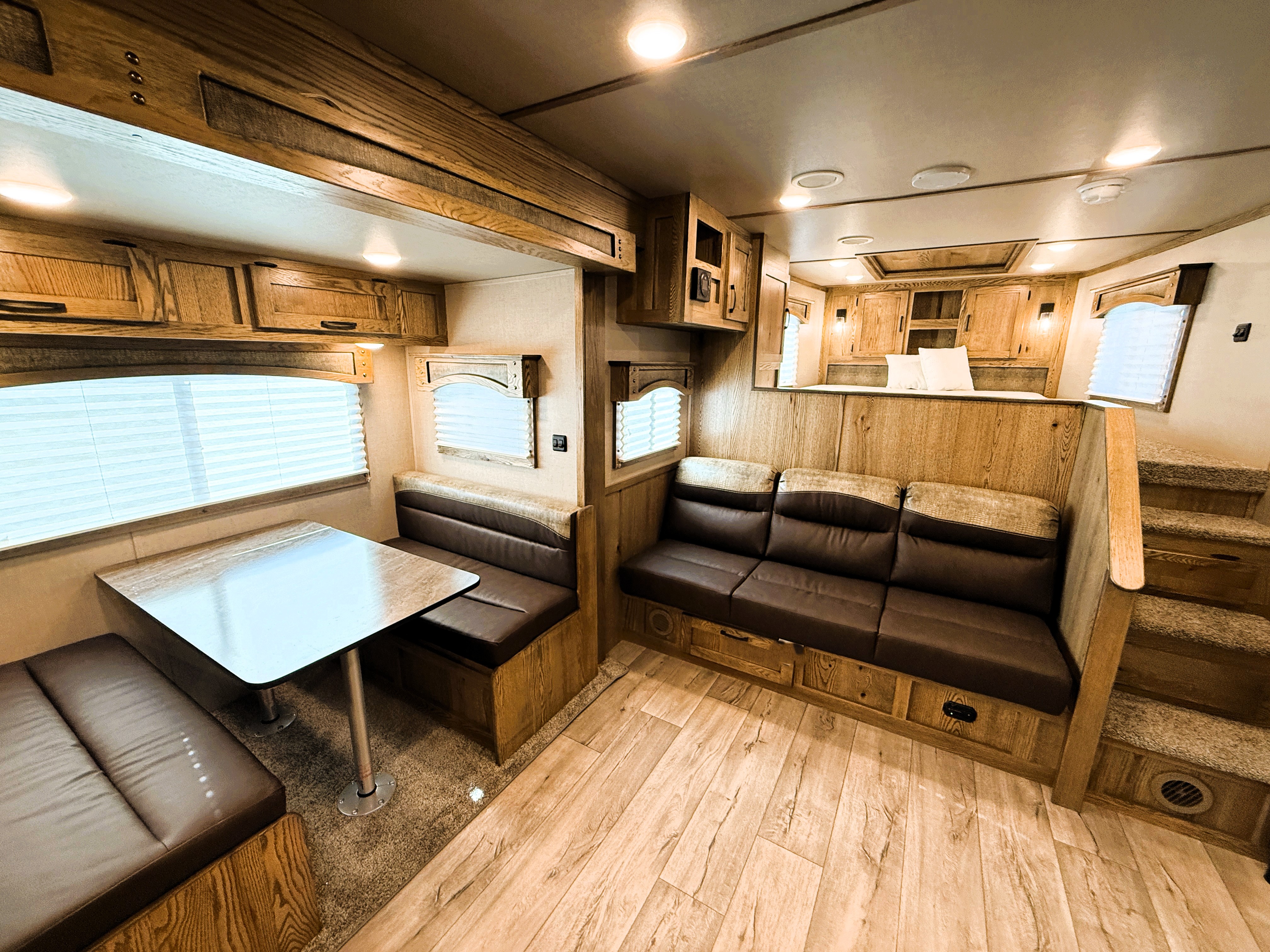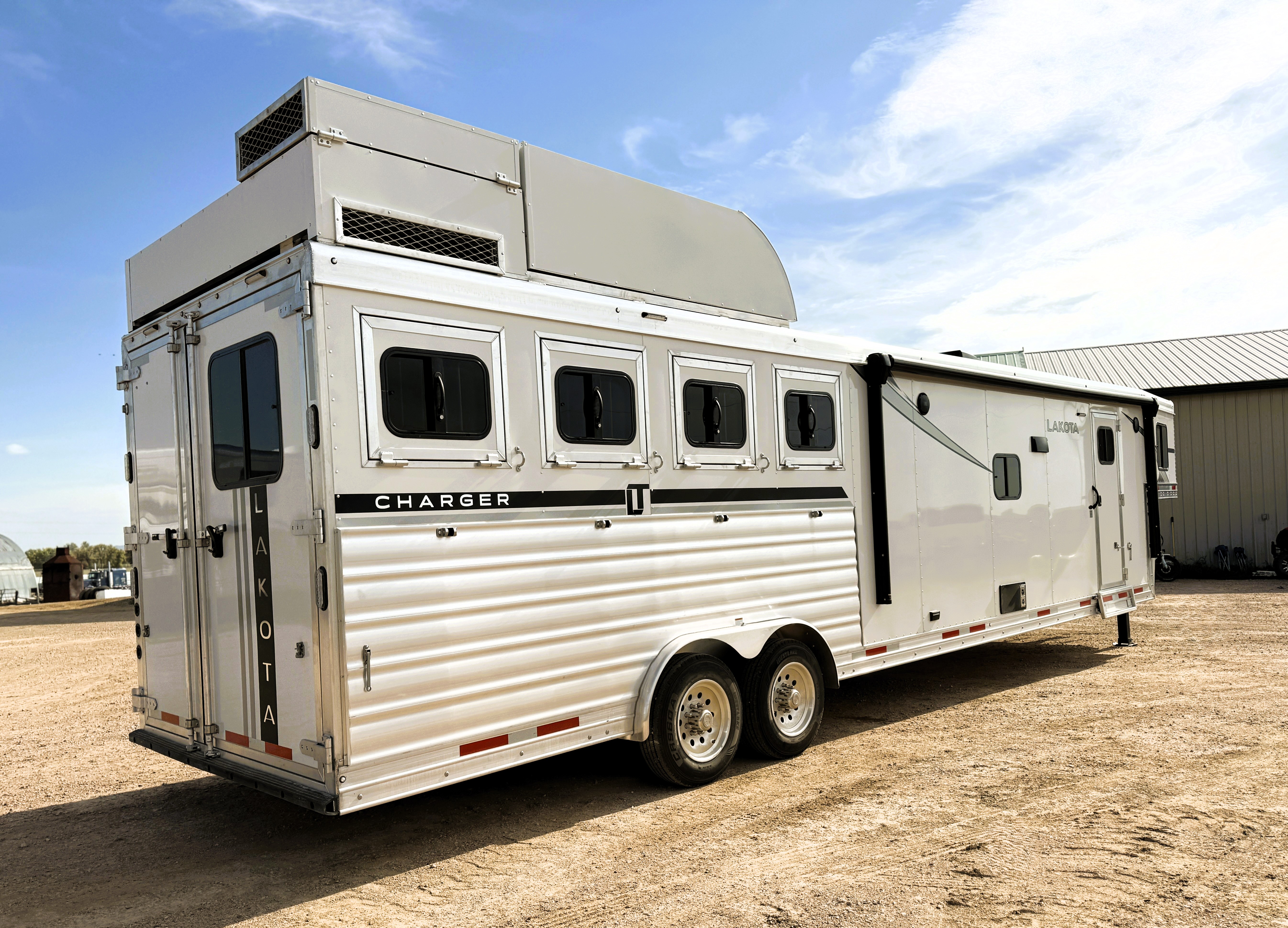 This 4 horse Lakota Charger has a 15' living quarters with a 9' slide-out that includes a dinette-sleeper and a large refrigerator, along with a sofa-sleeper on the riser wall. The full kitchen includes a sink, recessed cook-top, microwave, and lots of storage. The fully private bathroom includes a radius shower, sink with a vanity and mirror, closet and a walk-through door into the horse area. The horse area features air flow dividers, a stud stall in the first slant, mangers with under manger storage, a roadside escape door and kick matting all the way around. The corner rear tack has an adjustable 4-tier saddle rack, blanket bars and lots of bridle hooks. Additional features include dual hydraulic jacks, electric awning, and a hay pod with ladder. This trailer has a floor length of 33'.