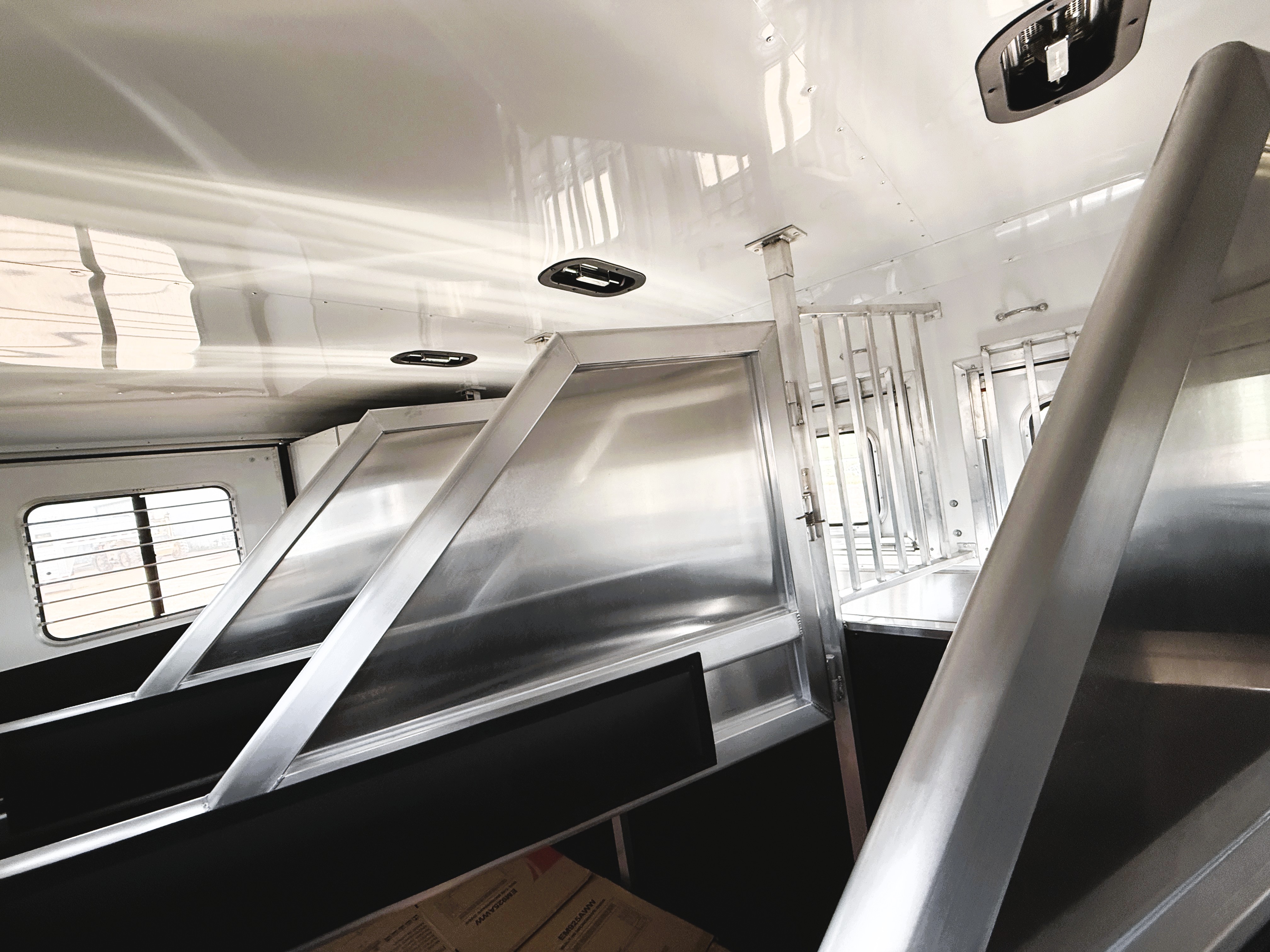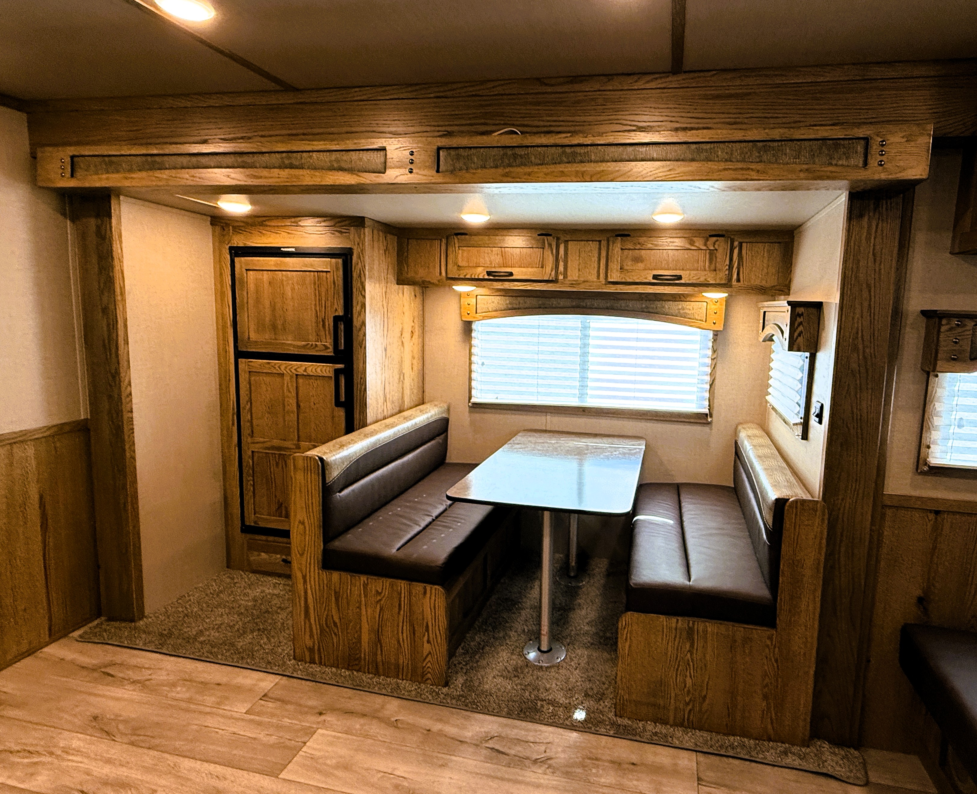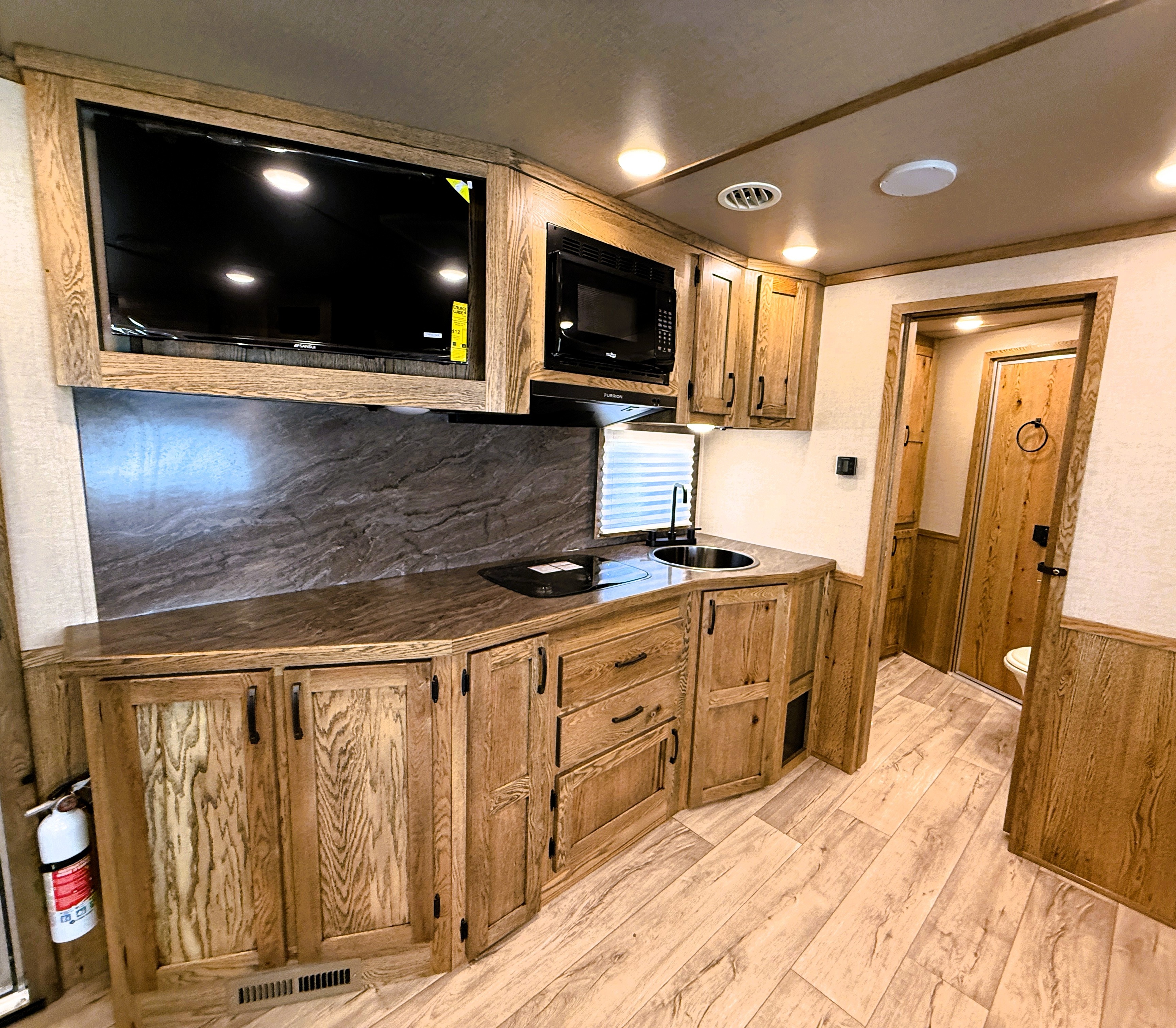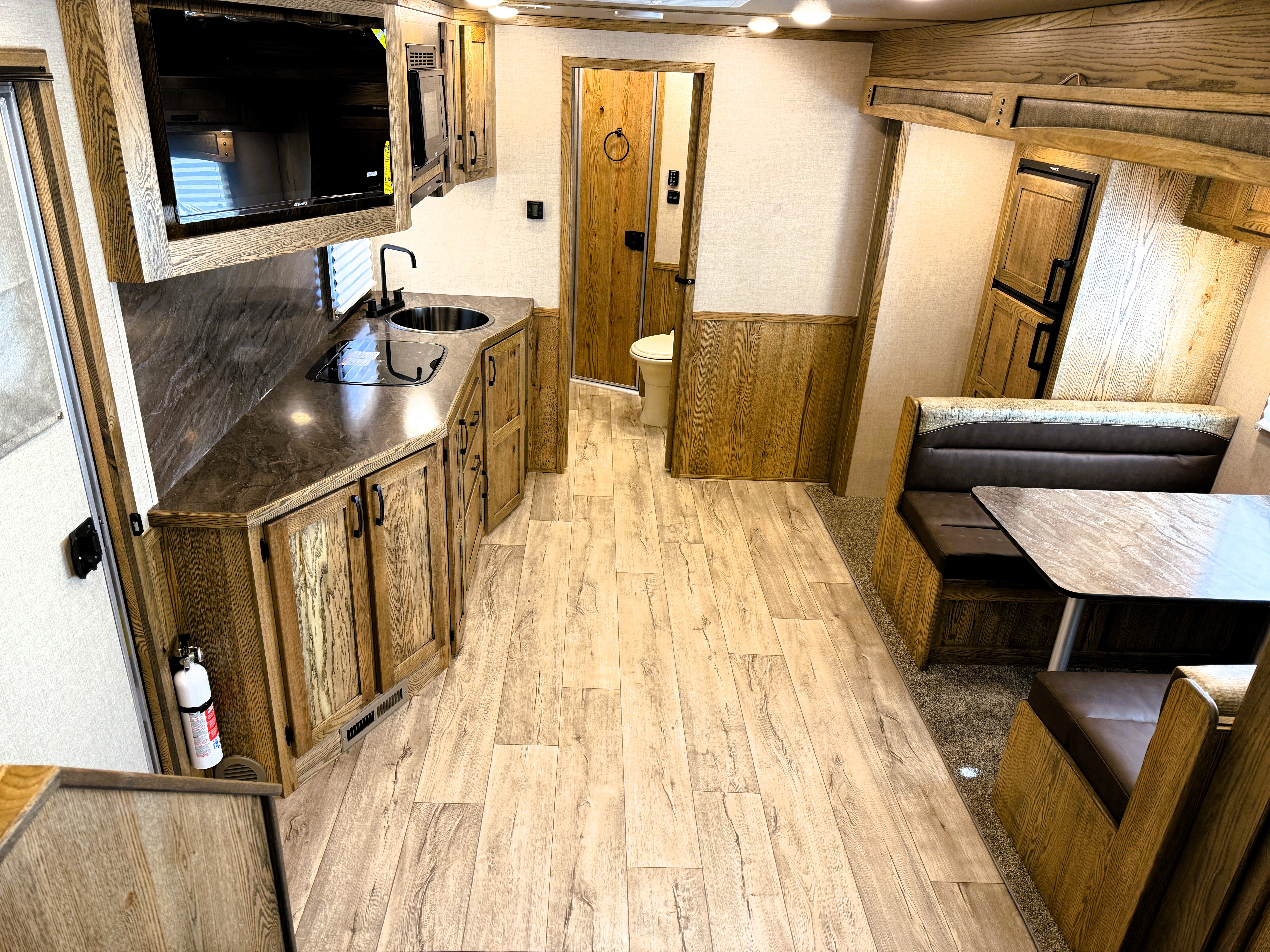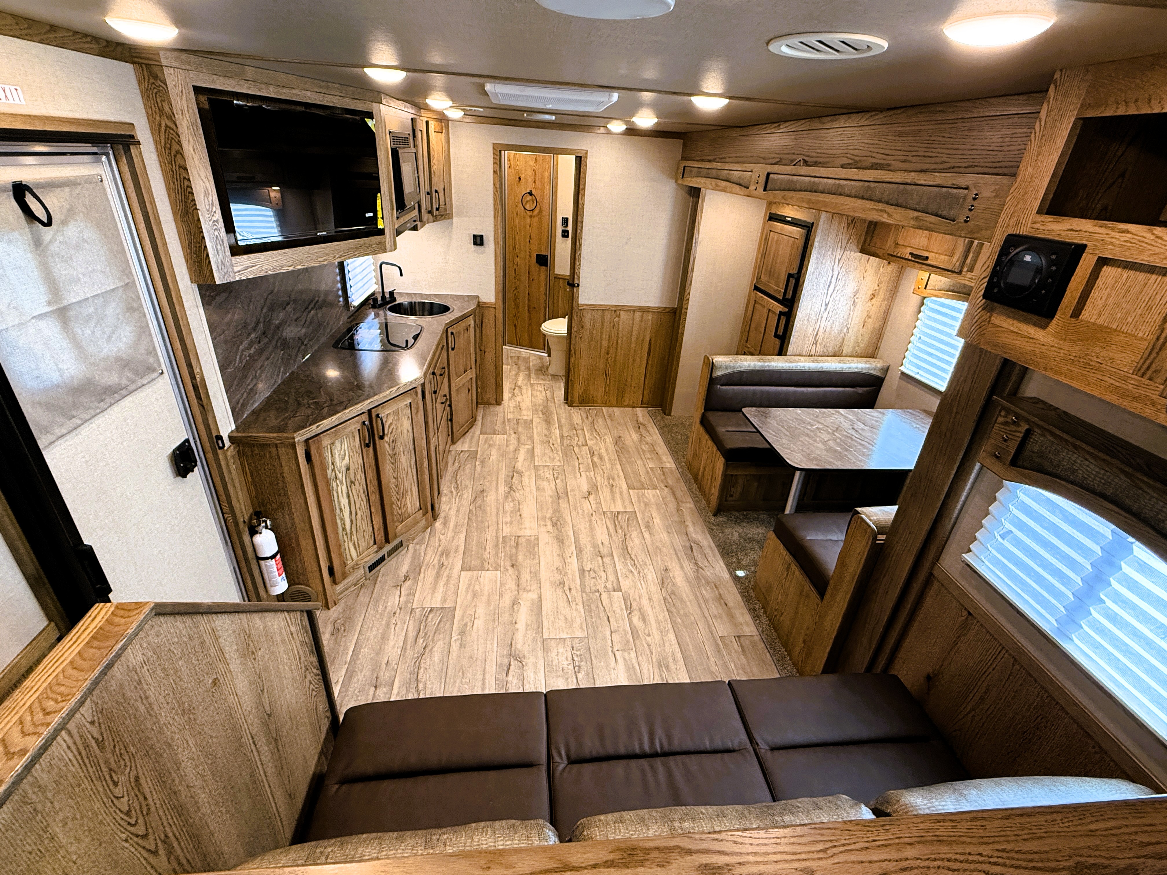 This 4 horse Lakota Charger has a 15' living quarters with a 9' slide-out that includes a dinette-sleeper and a large refrigerator, along with a sofa-sleeper on the riser wall. The full kitchen includes a sink, recessed cook-top, microwave, and lots of storage. The fully private bathroom includes a radius shower, sink with a vanity and mirror, closet and a walk-through door into the horse area. The horse area features air flow dividers, a stud stall in the first slant, mangers with under manger storage, a roadside escape door and kick matting all the way around. The corner rear tack has an adjustable 4-tier saddle rack, blanket bars and lots of bridle hooks. Additional features include dual hydraulic jacks, electric awning, and a hay pod with ladder. This trailer has a floor length of 33'.