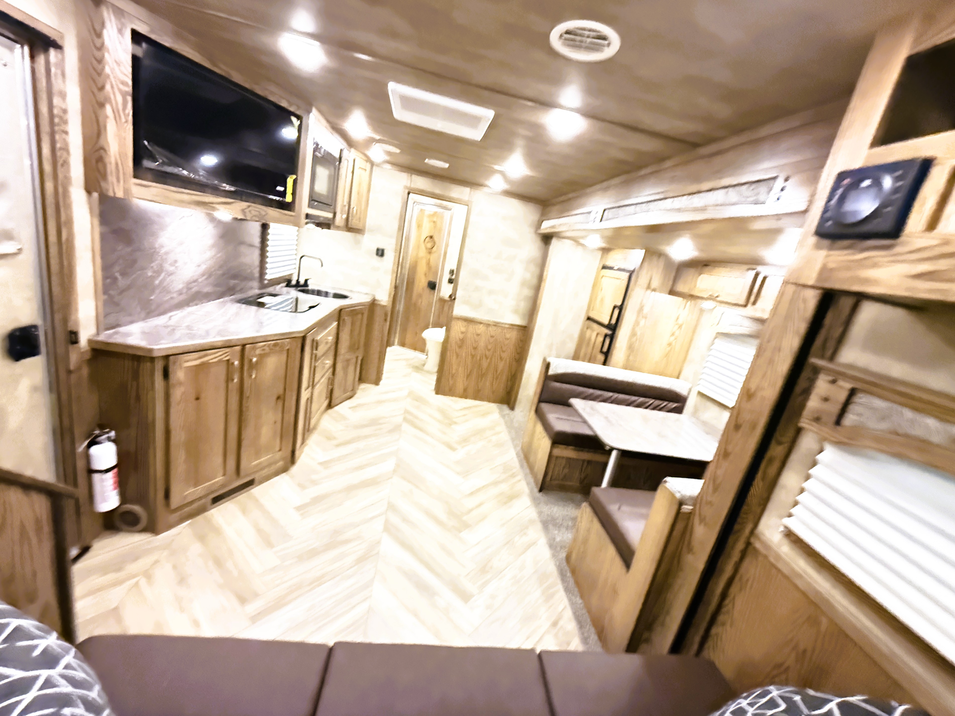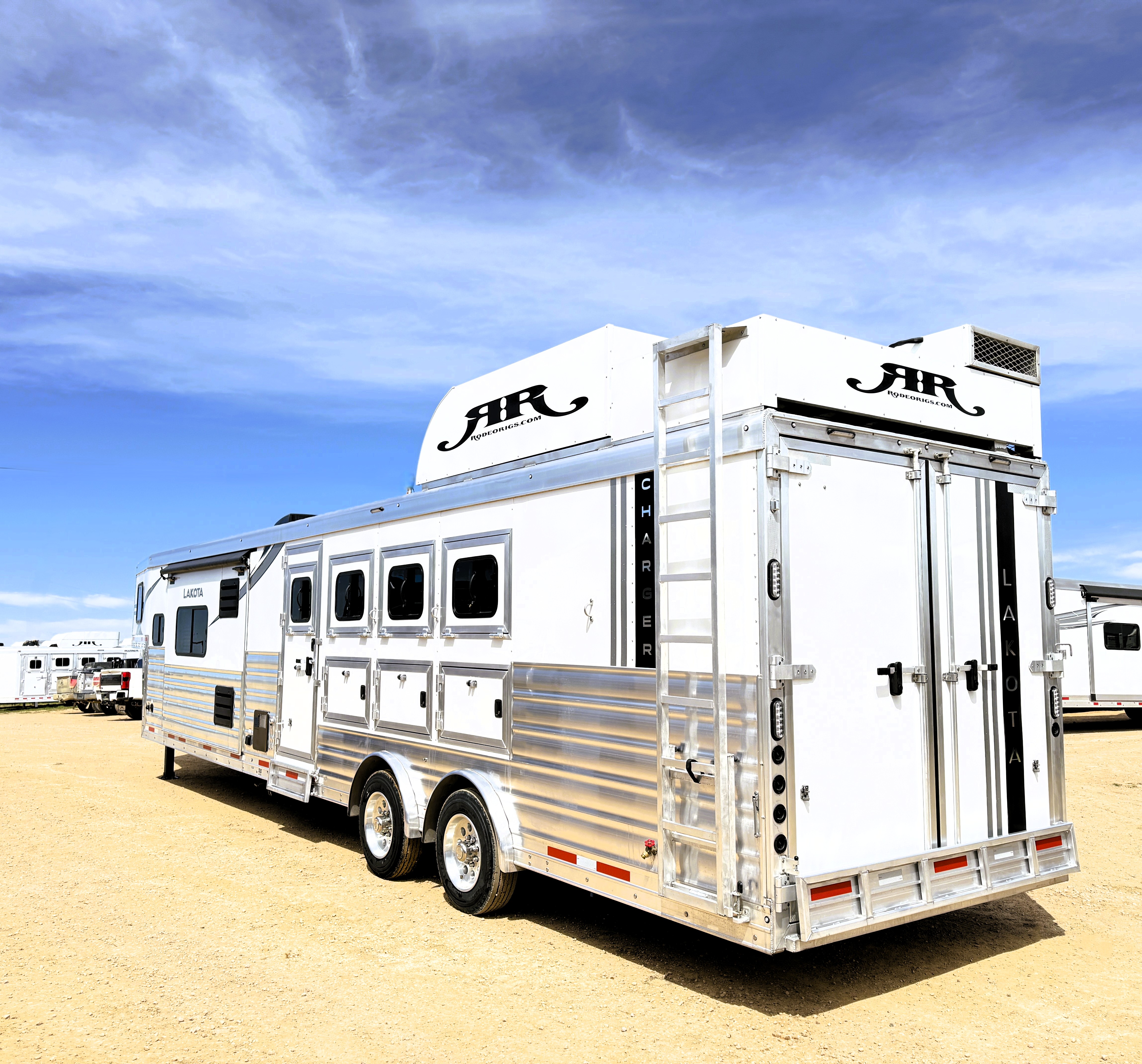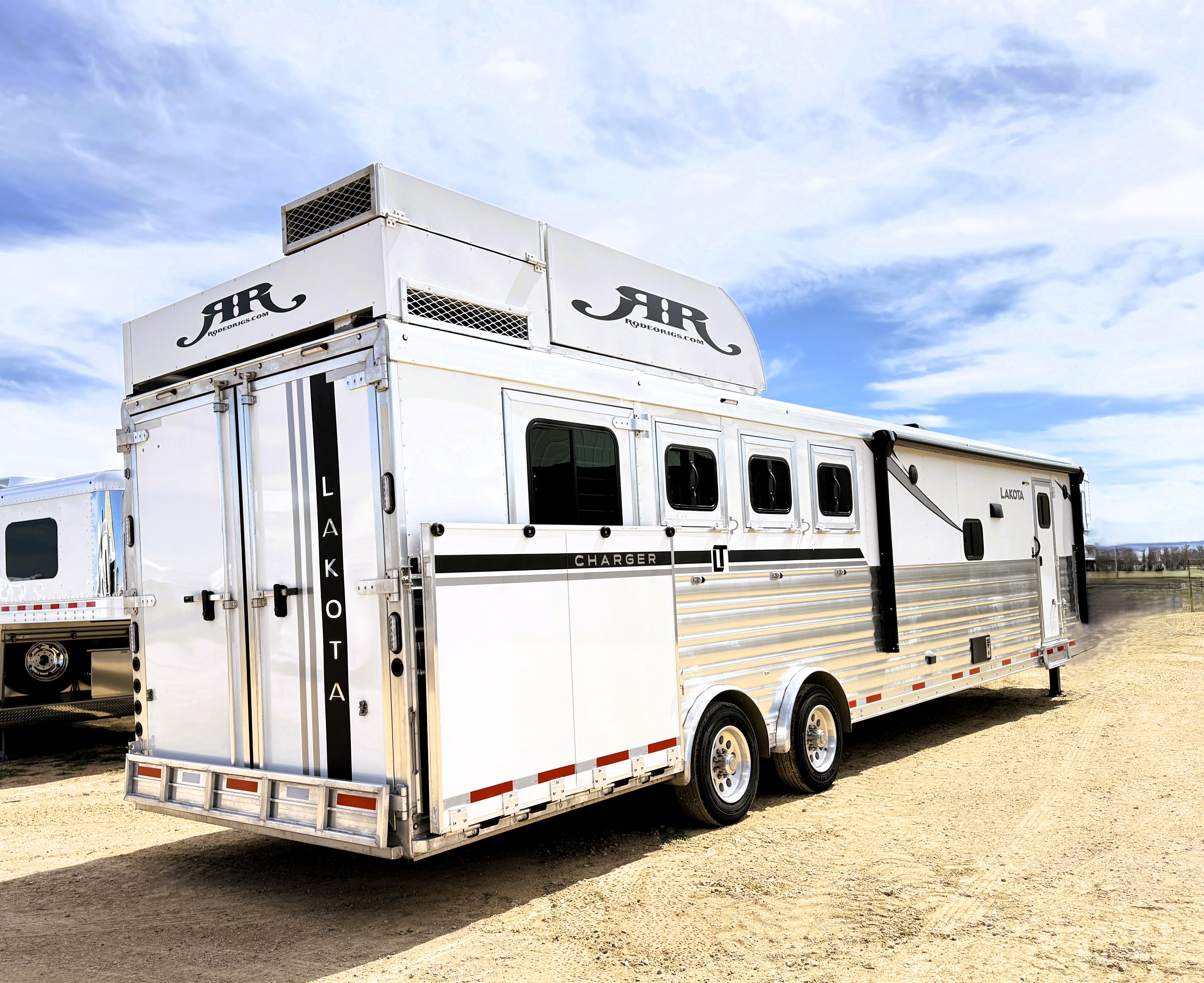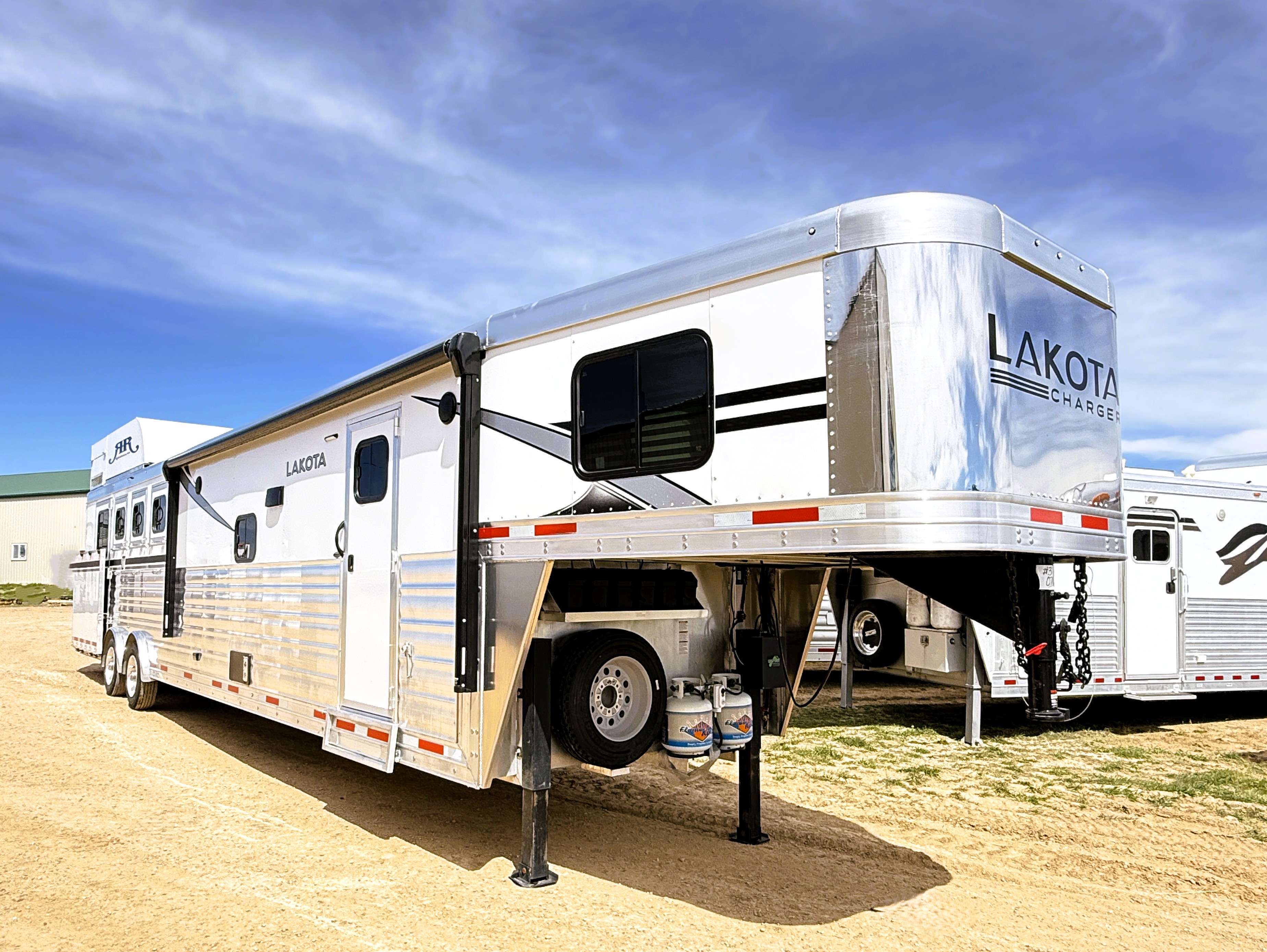 This side-load 2026 Lakota CH8415SR has all the features. The 15' living quarters features a queen-sized bed and closets in the bedroom area. The living space has a sofa-sleeper on the riser wall, a dinette-sleeper and refrigerator in the 9' insulated slide out, a 32" television, ducted air conditioning, and a full kitchen that has a microwave, sink, recessed cook top along with lots of storage and counter space. The fully private bathroom has a radius shower, dual-sided closet, toilet, sink with vanity and mirror, rain sensor fan, and a walk-through door into the horse area. The horse area features a stud-stall in the front slant, mangers with under manger storage, a road-side escape door, head and tail drop down windows, side load ramp and a telescoping divider in the end slant for easy loading. The full rear tack has an extra foot of length for more storage along with adjustable shelves, a 4-tier saddle rack, blanket bars, brush boxes, bridle hooks and a corner water tank. Additional features include dual 8k spread axles, dual 12k hydraulic jacks, pre-wired for a generator, hay pod with ladder, interior/exterior speakers, and an awning.