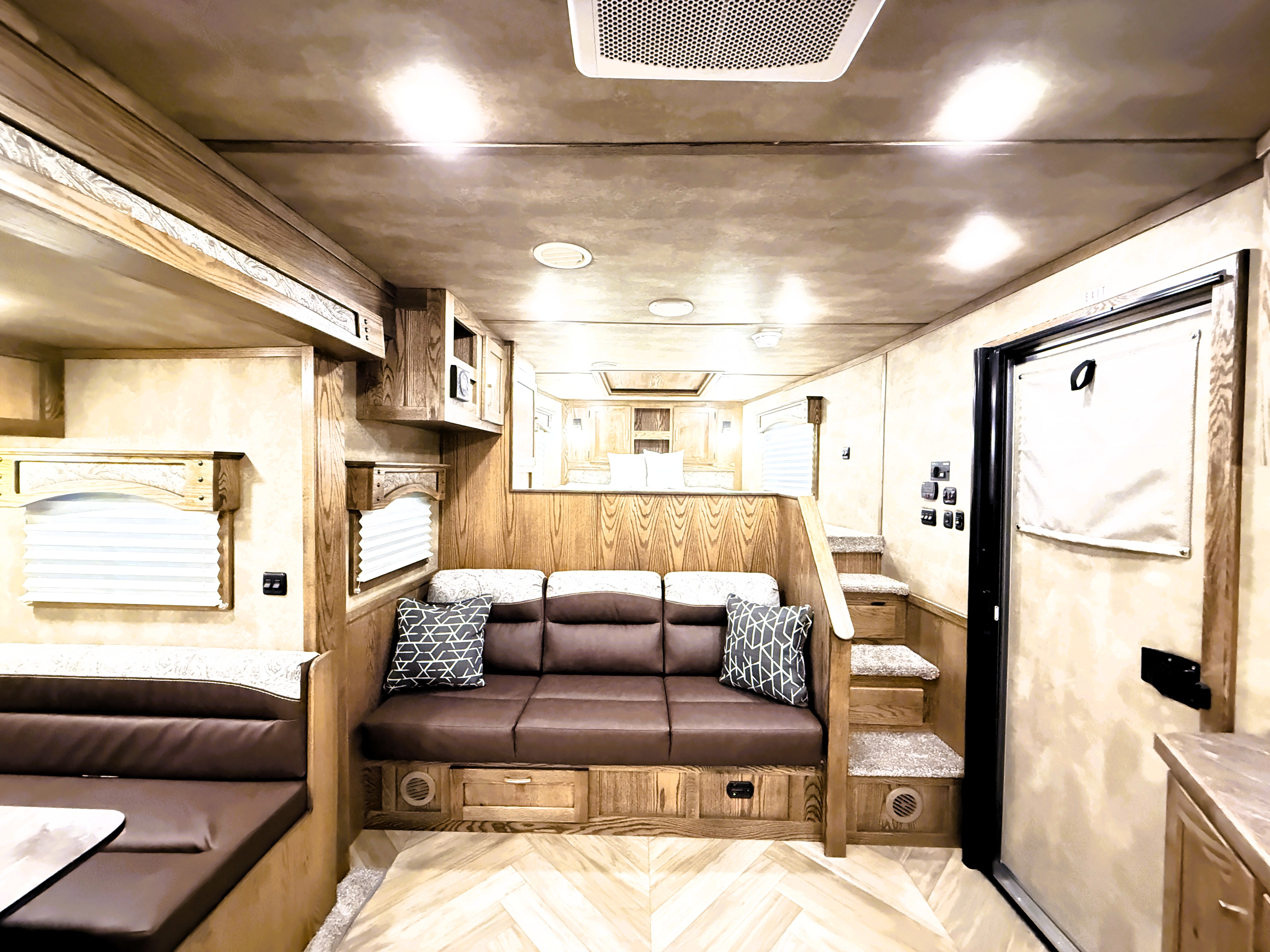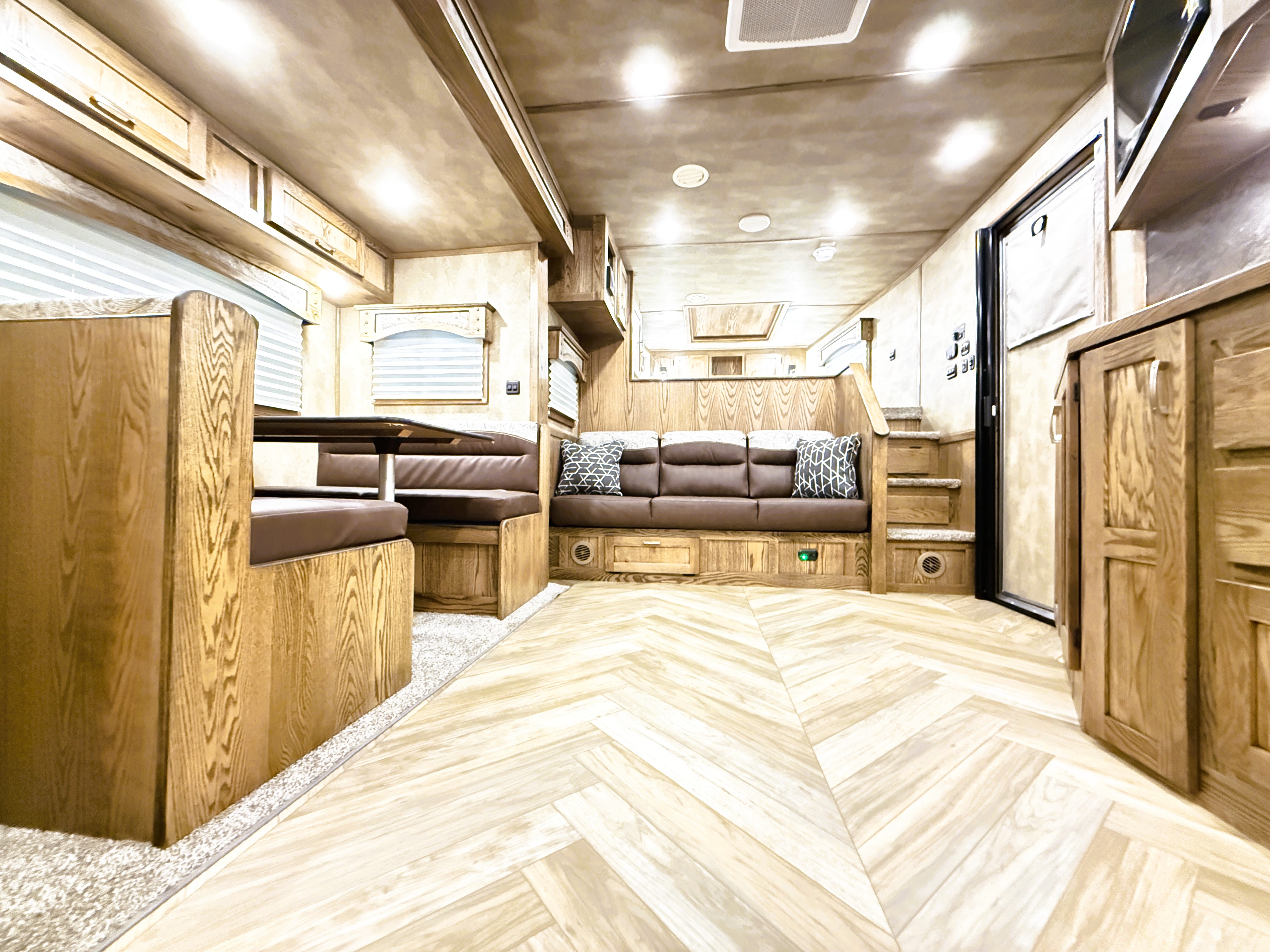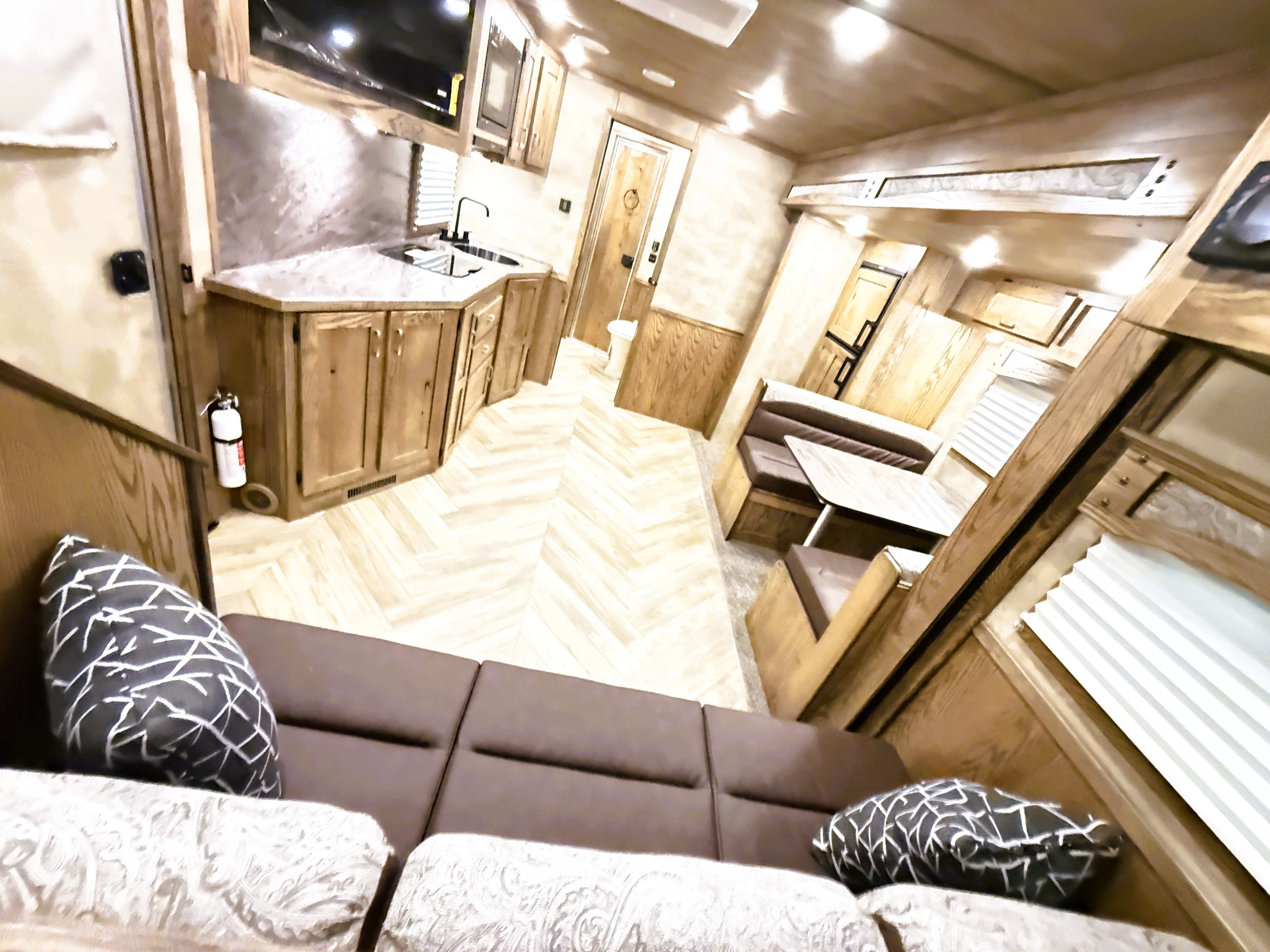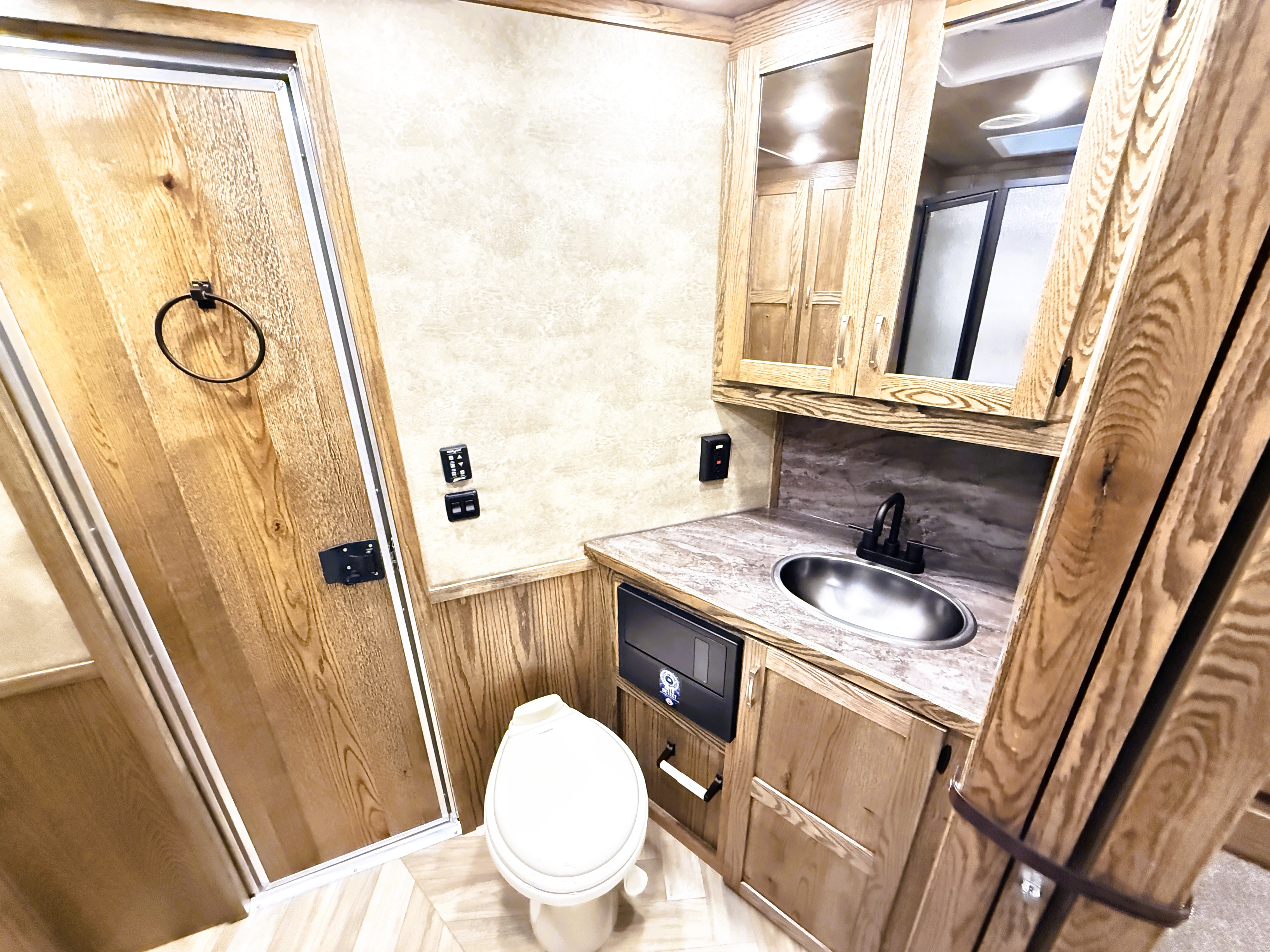 This side-load 2026 Lakota CH8415SR has all the features. The 15' living quarters features a queen-sized bed and closets in the bedroom area. The living space has a sofa-sleeper on the riser wall, a dinette-sleeper and refrigerator in the 9' insulated slide out, a 32" television, ducted air conditioning, and a full kitchen that has a microwave, sink, recessed cook top along with lots of storage and counter space. The fully private bathroom has a radius shower, dual-sided closet, toilet, sink with vanity and mirror, rain sensor fan, and a walk-through door into the horse area. The horse area features a stud-stall in the front slant, mangers with under manger storage, a road-side escape door, head and tail drop down windows, side load ramp and a telescoping divider in the end slant for easy loading. The full rear tack has an extra foot of length for more storage along with adjustable shelves, a 4-tier saddle rack, blanket bars, brush boxes, bridle hooks and a corner water tank. Additional features include dual 8k spread axles, dual 12k hydraulic jacks, pre-wired for a generator, hay pod with ladder, interior/exterior speakers, and an awning.