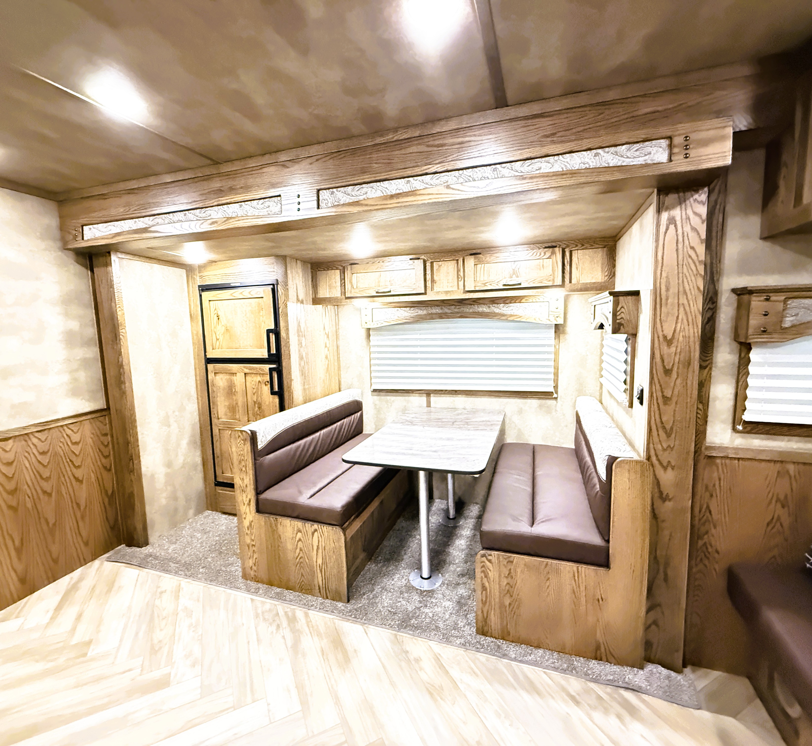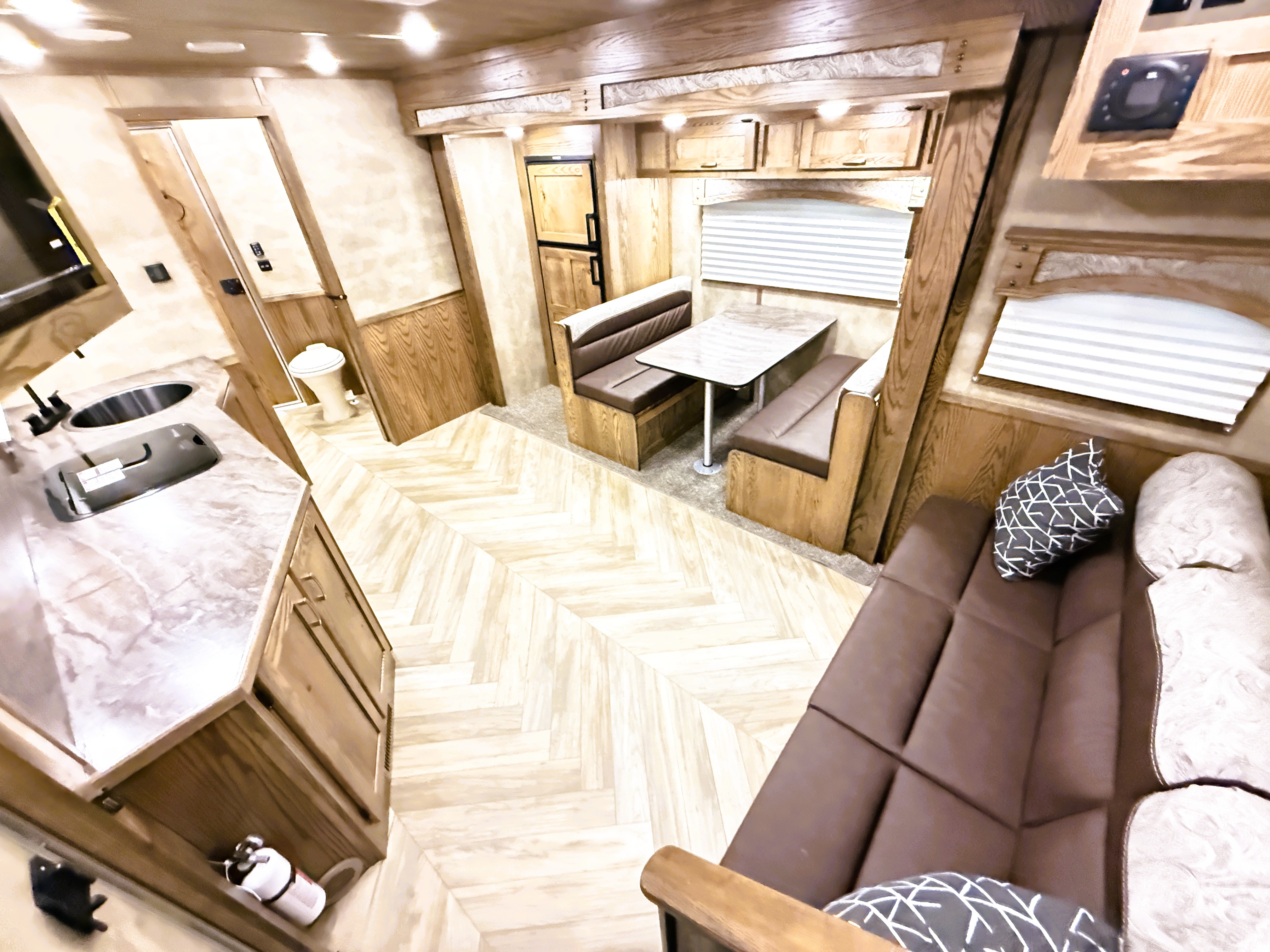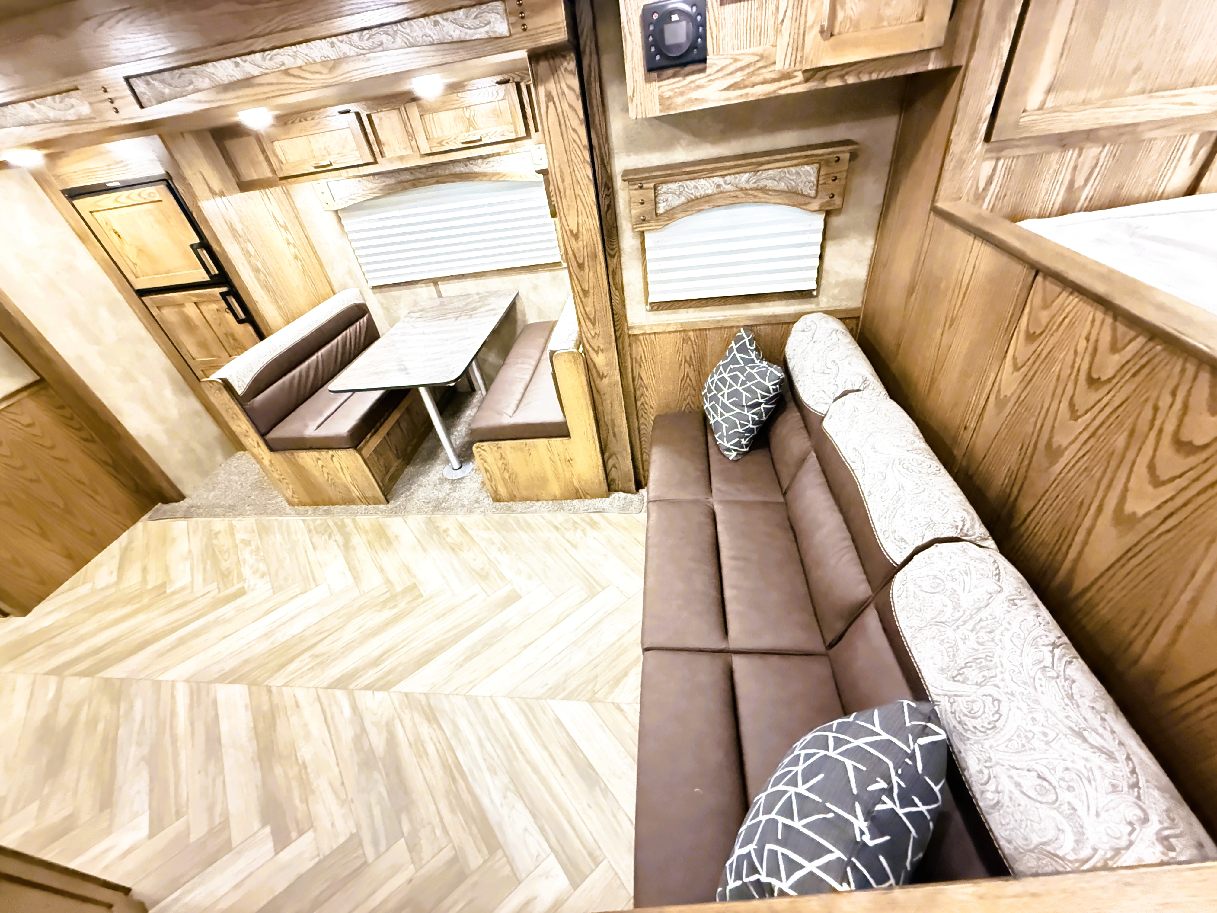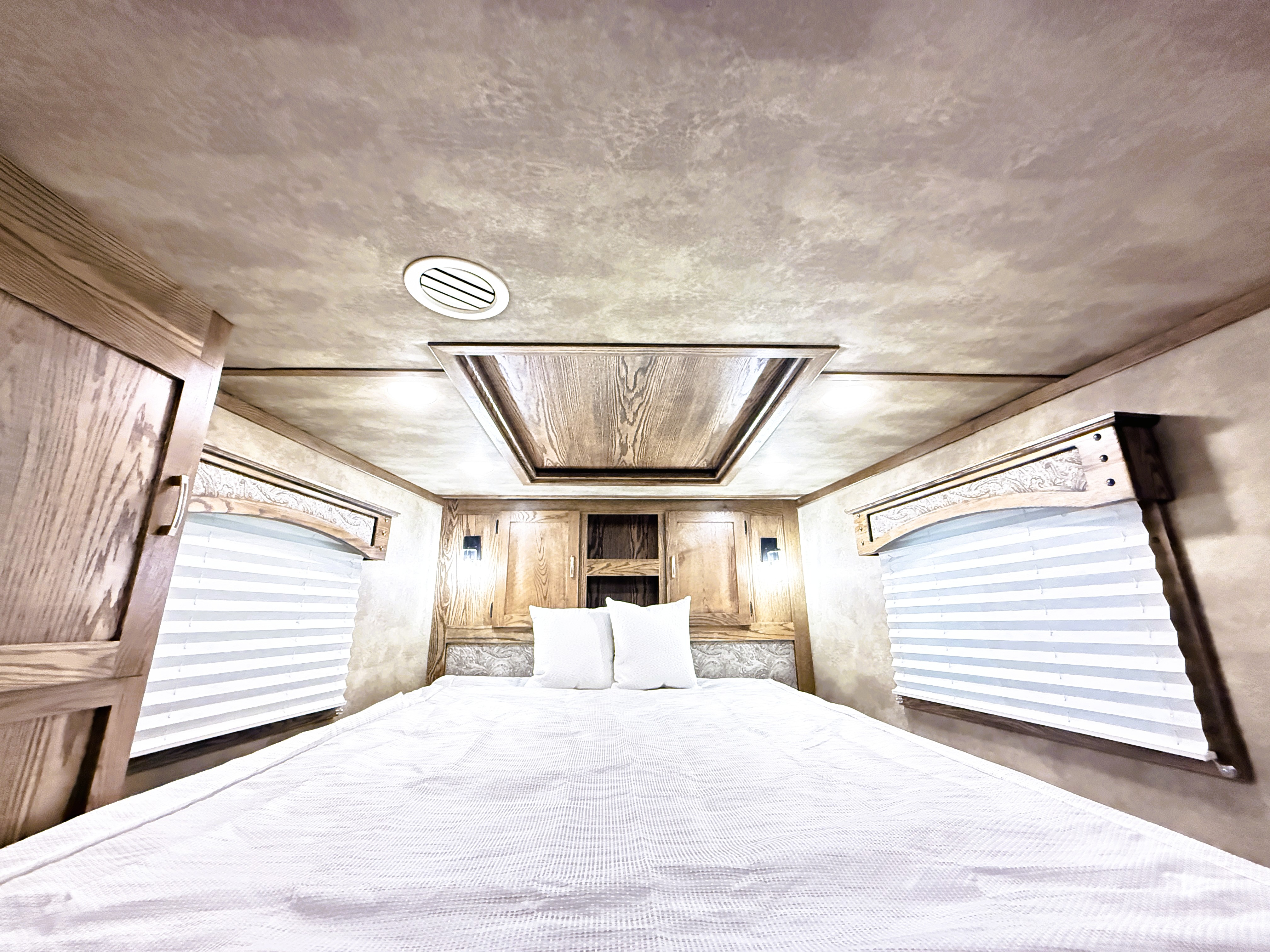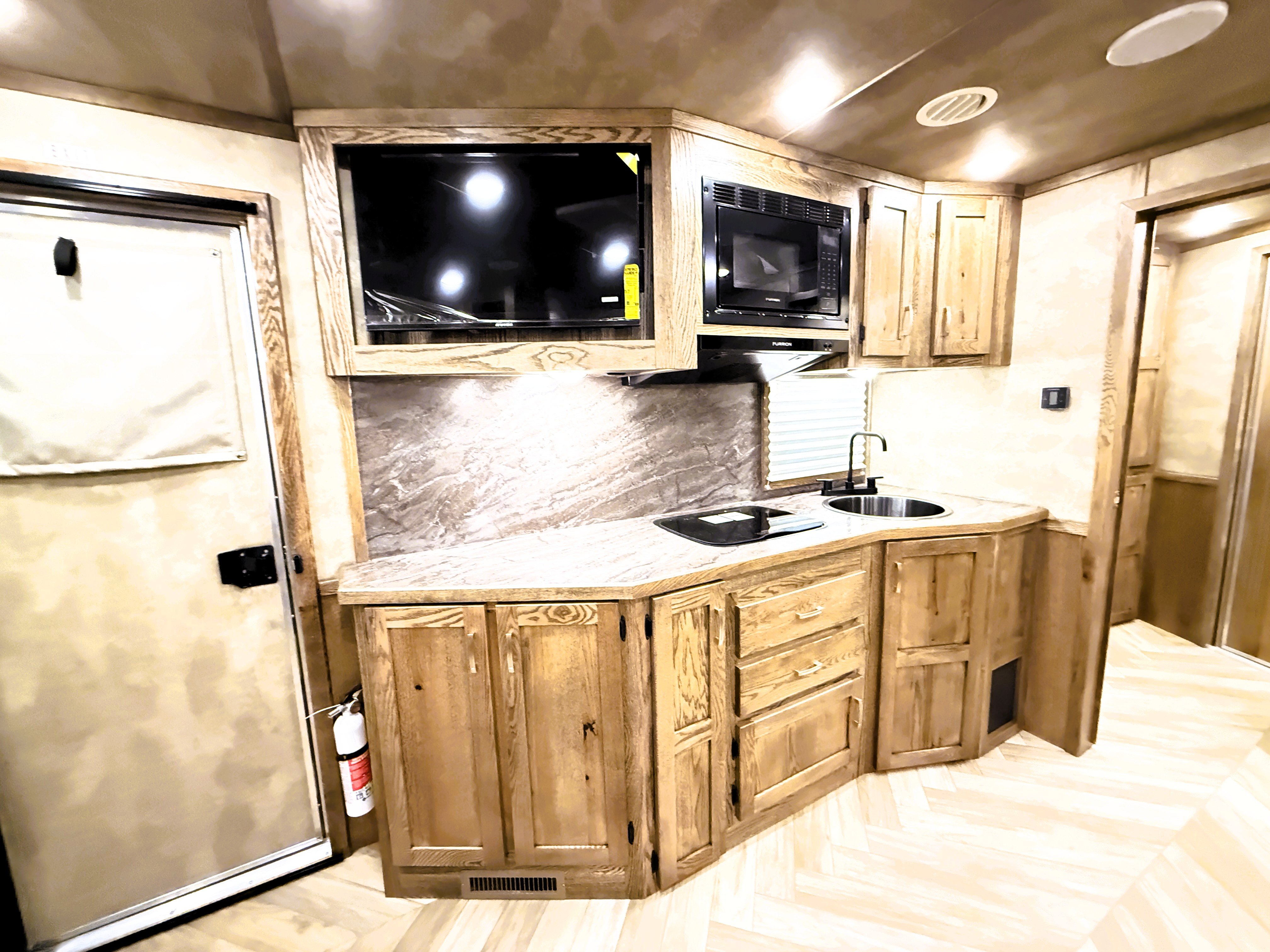 This side-load 2026 Lakota CH8415SR has all the features. The 15' living quarters features a queen-sized bed and closets in the bedroom area. The living space has a sofa-sleeper on the riser wall, a dinette-sleeper and refrigerator in the 9' insulated slide out, a 32" television, ducted air conditioning, and a full kitchen that has a microwave, sink, recessed cook top along with lots of storage and counter space. The fully private bathroom has a radius shower, dual-sided closet, toilet, sink with vanity and mirror, rain sensor fan, and a walk-through door into the horse area. The horse area features a stud-stall in the front slant, mangers with under manger storage, a road-side escape door, head and tail drop down windows, side load ramp and a telescoping divider in the end slant for easy loading. The full rear tack has an extra foot of length for more storage along with adjustable shelves, a 4-tier saddle rack, blanket bars, brush boxes, bridle hooks and a corner water tank. Additional features include dual 8k spread axles, dual 12k hydraulic jacks, pre-wired for a generator, hay pod with ladder, interior/exterior speakers, and an awning.