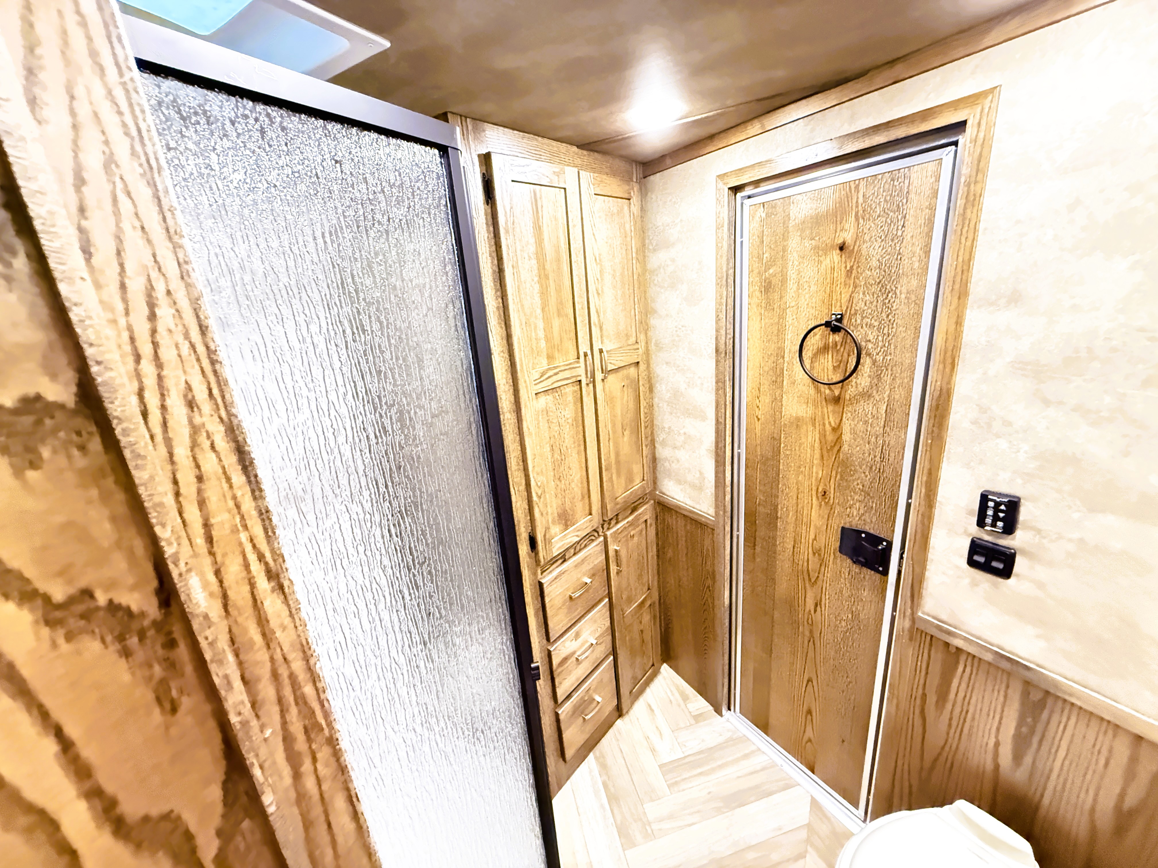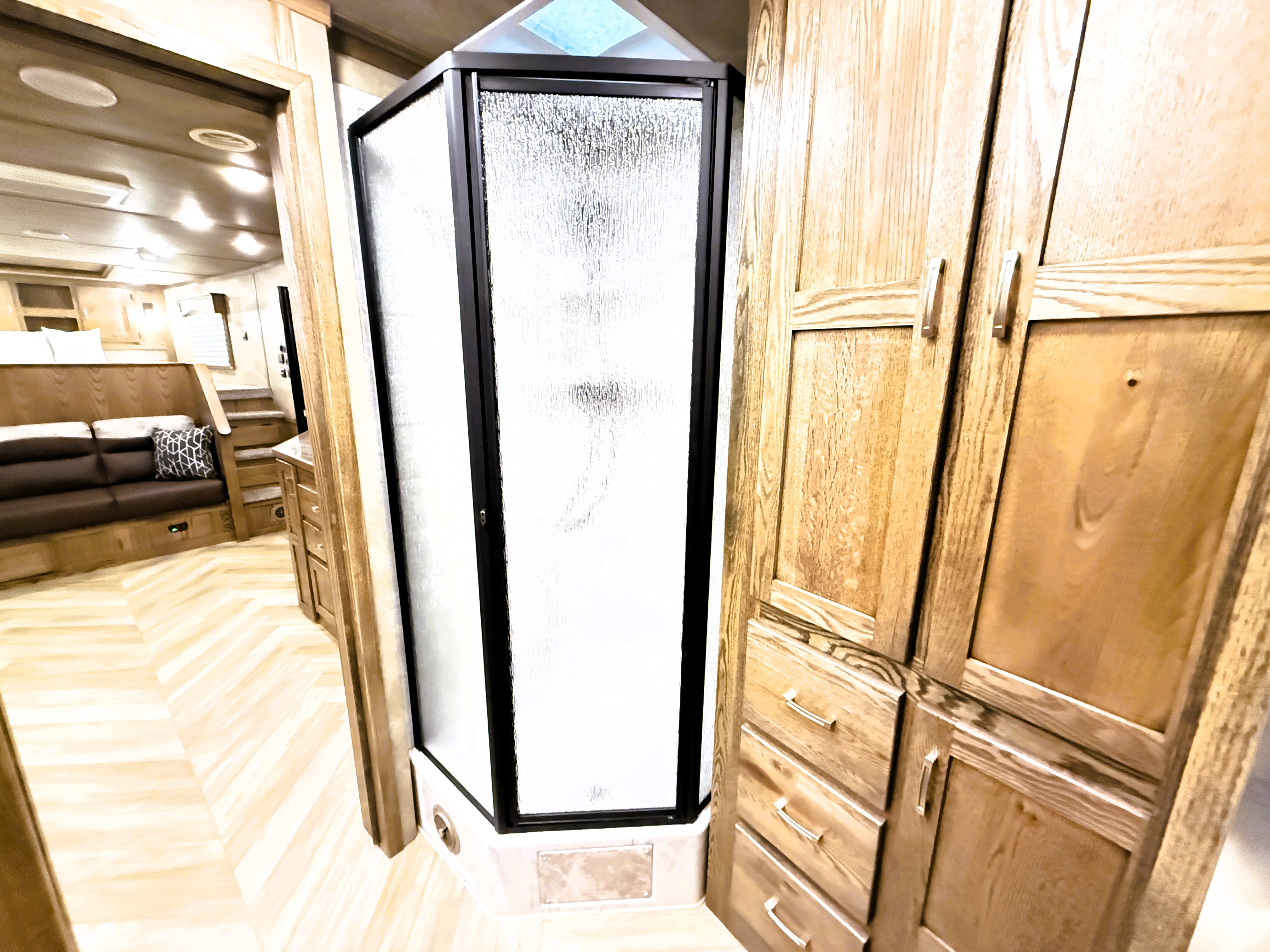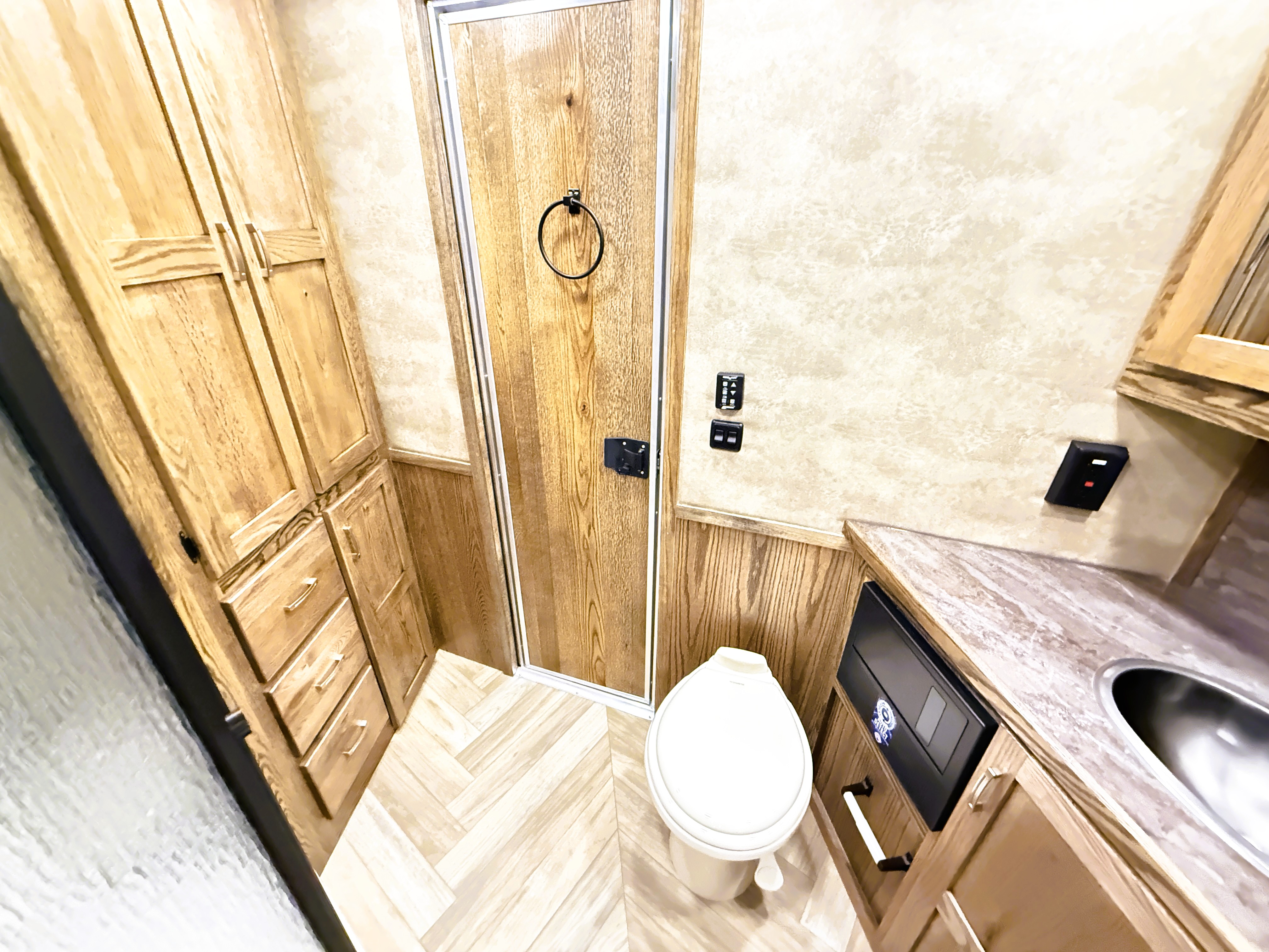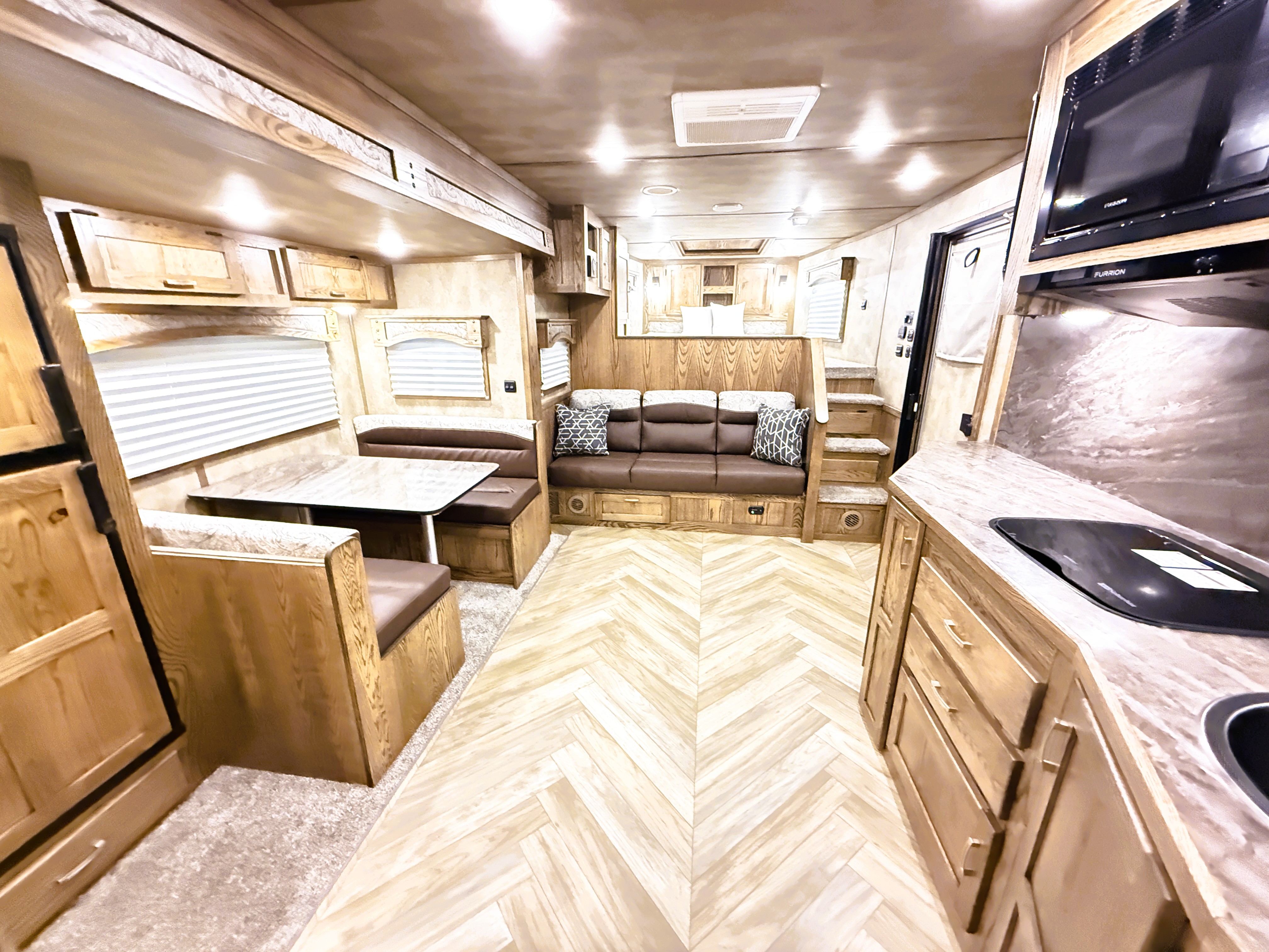 This side-load 2026 Lakota CH8415SR has all the features. The 15' living quarters features a queen-sized bed and closets in the bedroom area. The living space has a sofa-sleeper on the riser wall, a dinette-sleeper and refrigerator in the 9' insulated slide out, a 32" television, ducted air conditioning, and a full kitchen that has a microwave, sink, recessed cook top along with lots of storage and counter space. The fully private bathroom has a radius shower, dual-sided closet, toilet, sink with vanity and mirror, rain sensor fan, and a walk-through door into the horse area. The horse area features a stud-stall in the front slant, mangers with under manger storage, a road-side escape door, head and tail drop down windows, side load ramp and a telescoping divider in the end slant for easy loading. The full rear tack has an extra foot of length for more storage along with adjustable shelves, a 4-tier saddle rack, blanket bars, brush boxes, bridle hooks and a corner water tank. Additional features include dual 8k spread axles, dual 12k hydraulic jacks, pre-wired for a generator, hay pod with ladder, interior/exterior speakers, and an awning.
