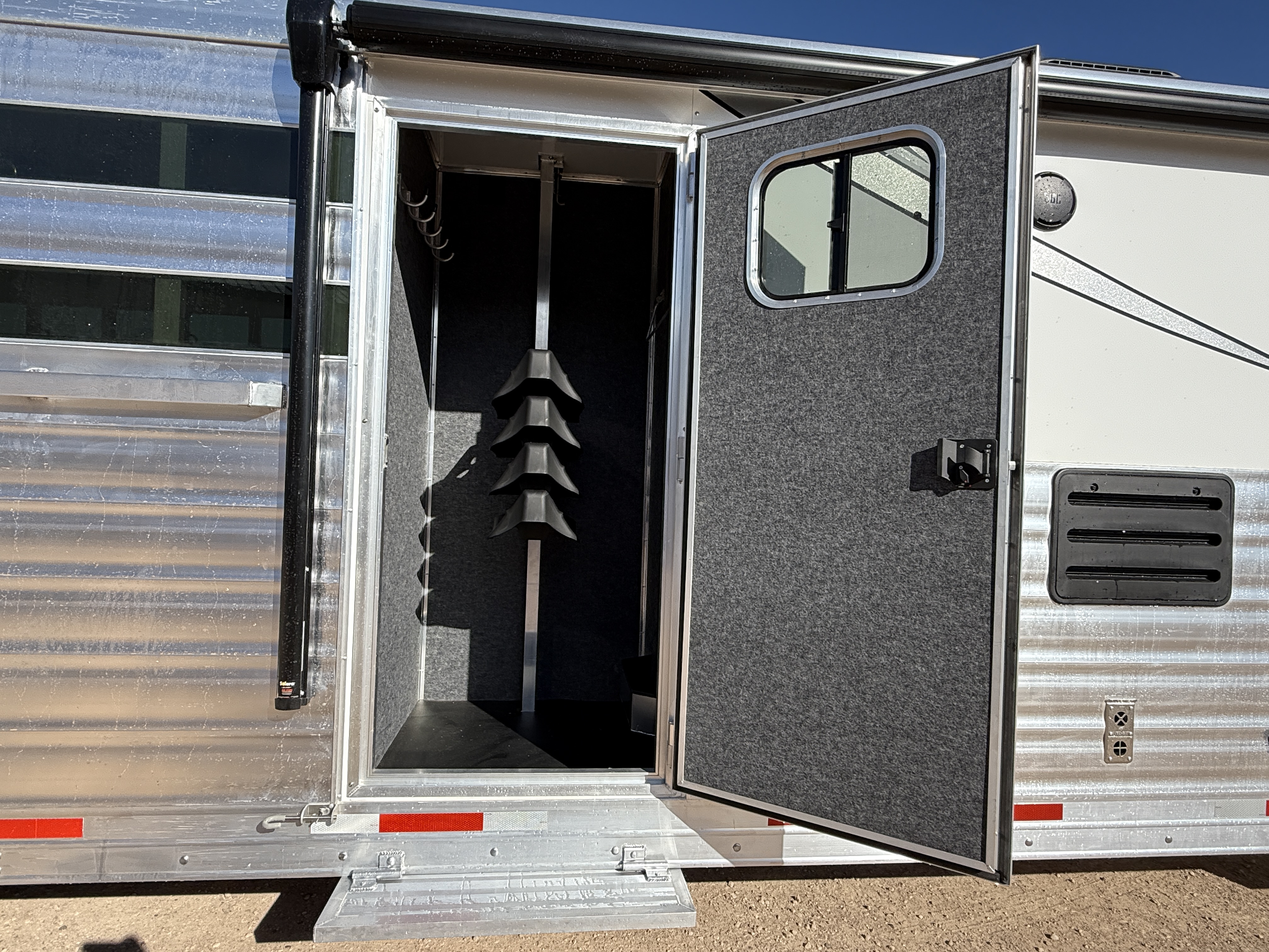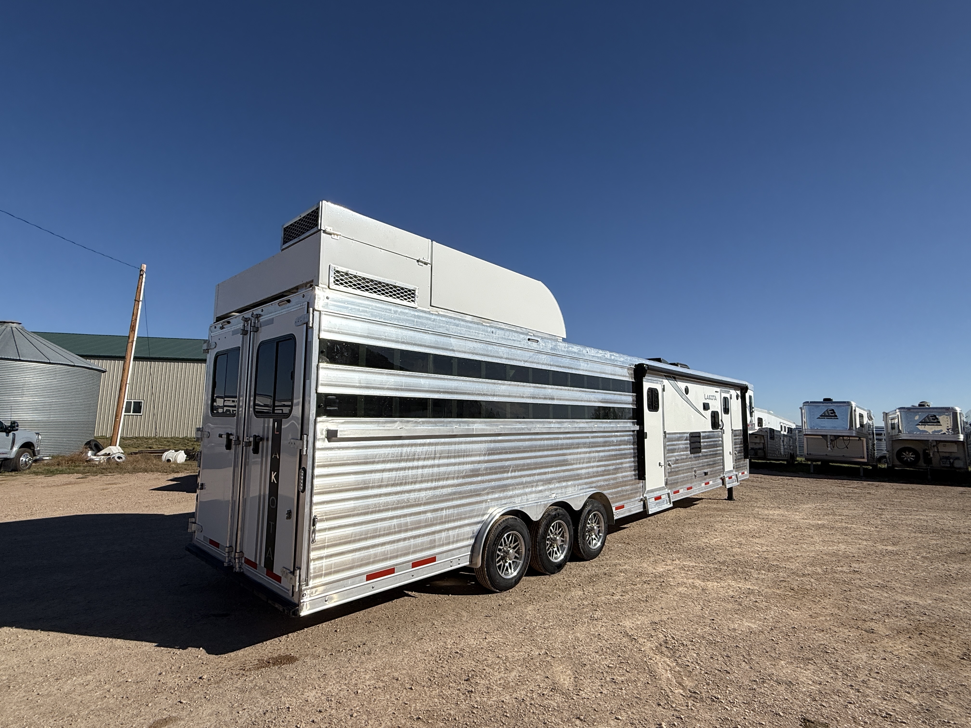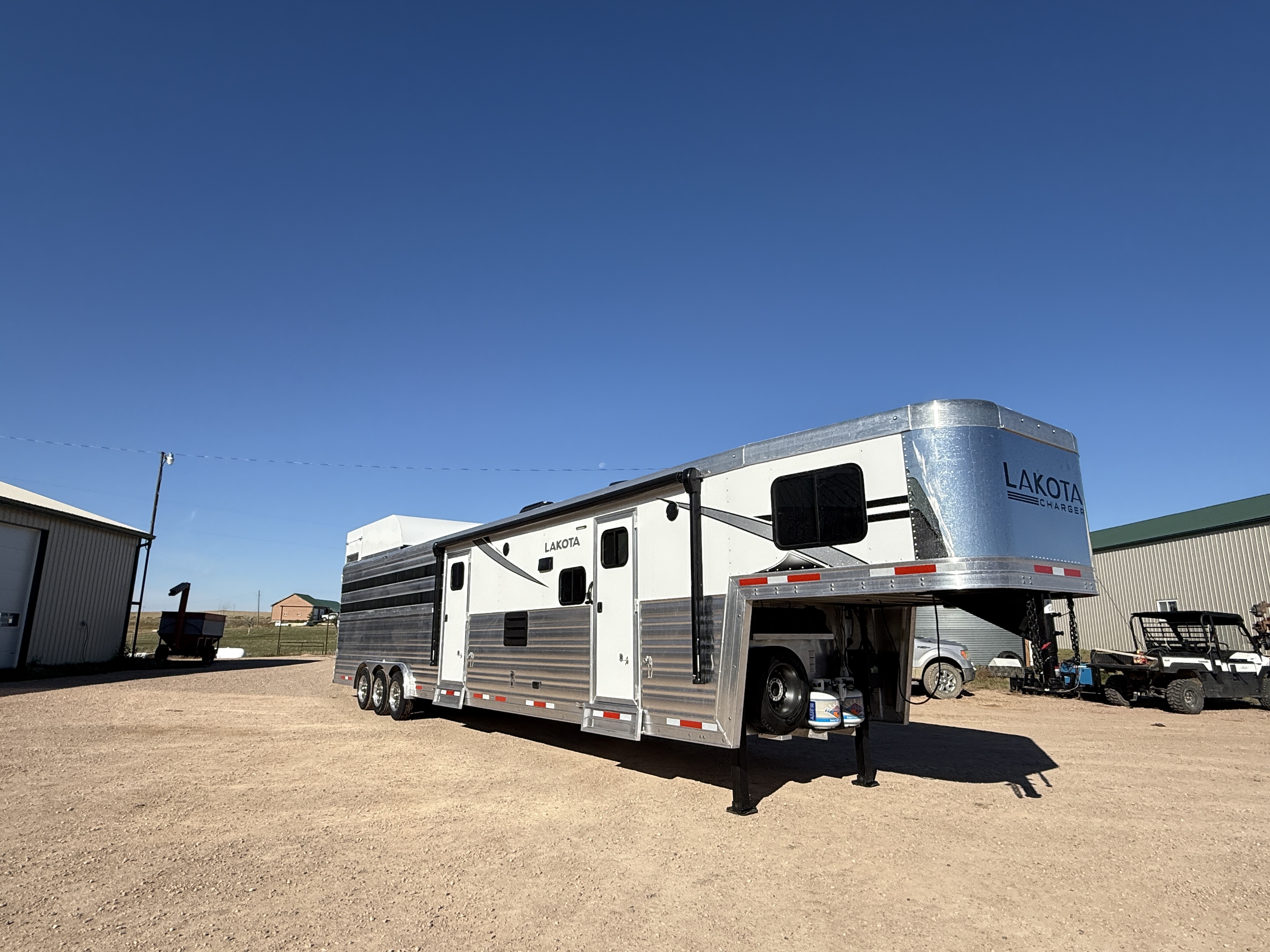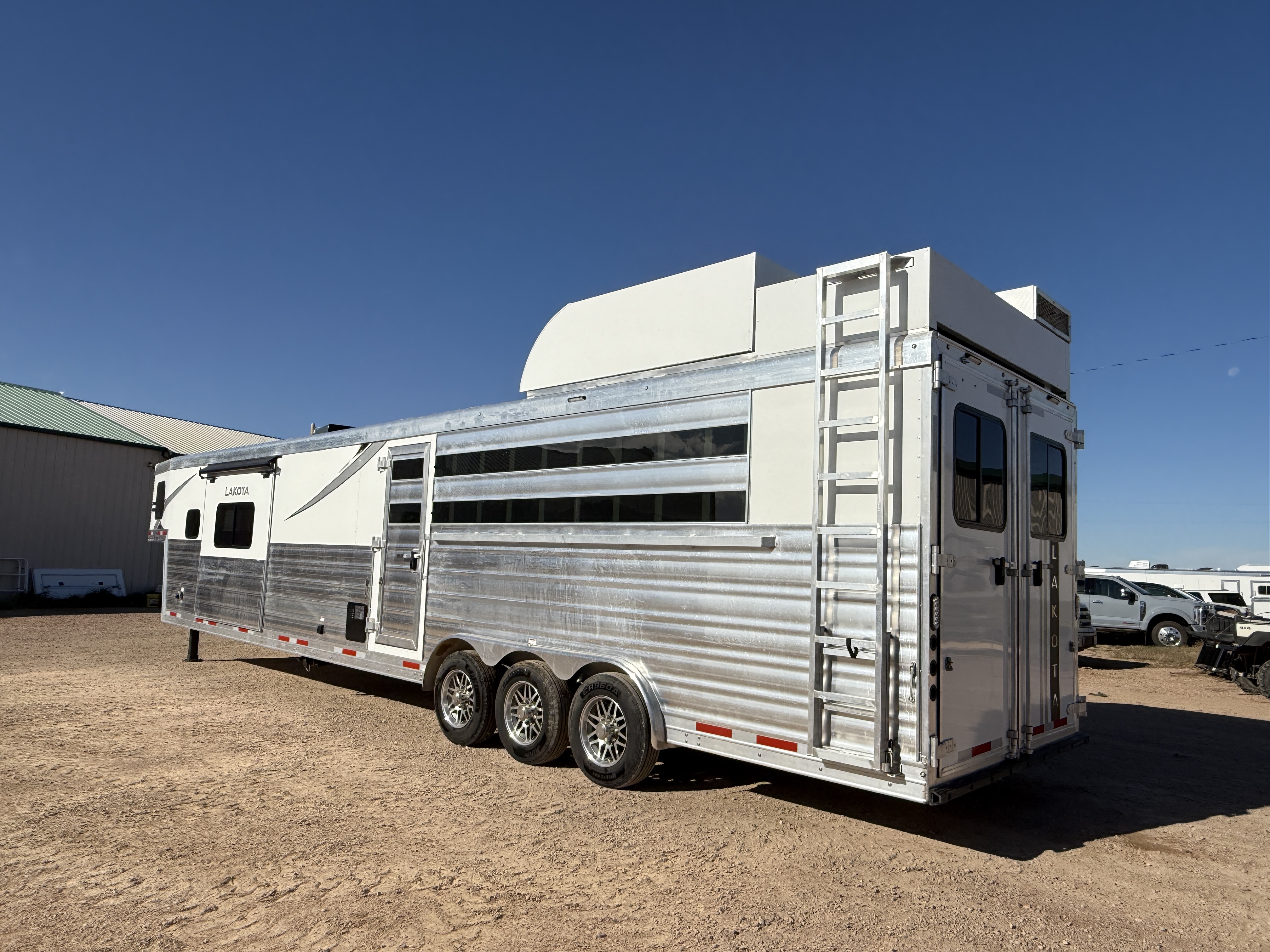 2 Tacks! This 2026 Lakota Livestock Edition has both a single door side-tack with an adjustable 4-tier saddle rack, blanket bar and bridle hooks and a collapsable rear tack with another adjustable 4-tier saddle rack, brush box and more bridle hooks, that's a lot of storage for your gear. The 13' living quarters features a sofa-sleeper in the 6' slide out. There is a sofa-sleeper on the riser wall; a full kitchen that has a sink, recessed cook top, large refrigerator and microwave. The large bathroom has a large shower, 3 door, large medicine cabinet with lights and mirrors, closet and a walk-through door into the stock area. The 18' stock area has a floating center gate. Additional features include a hay pod, dual hydraulic jack, and an awning. This trailer is pre-wired for a generator.