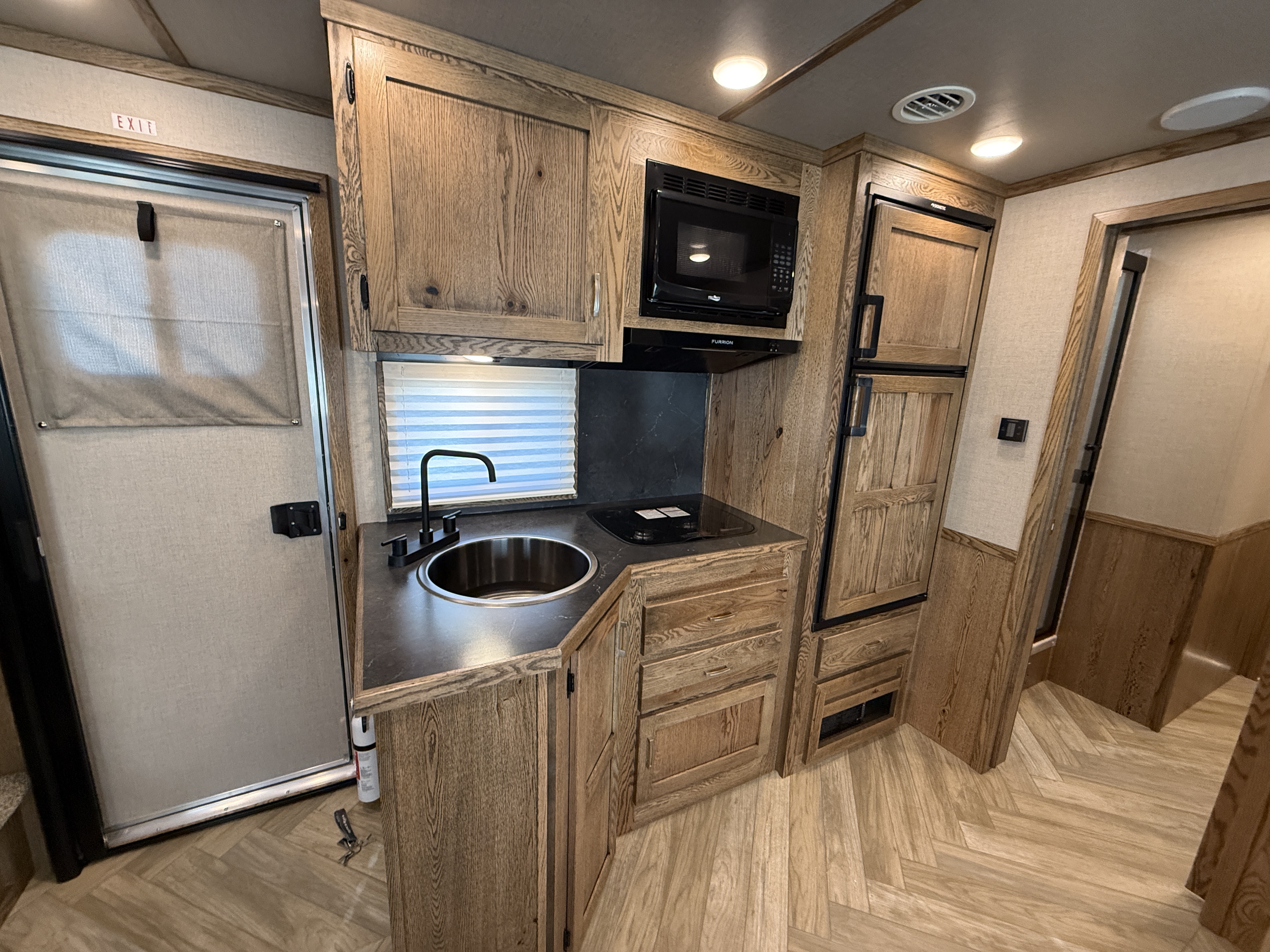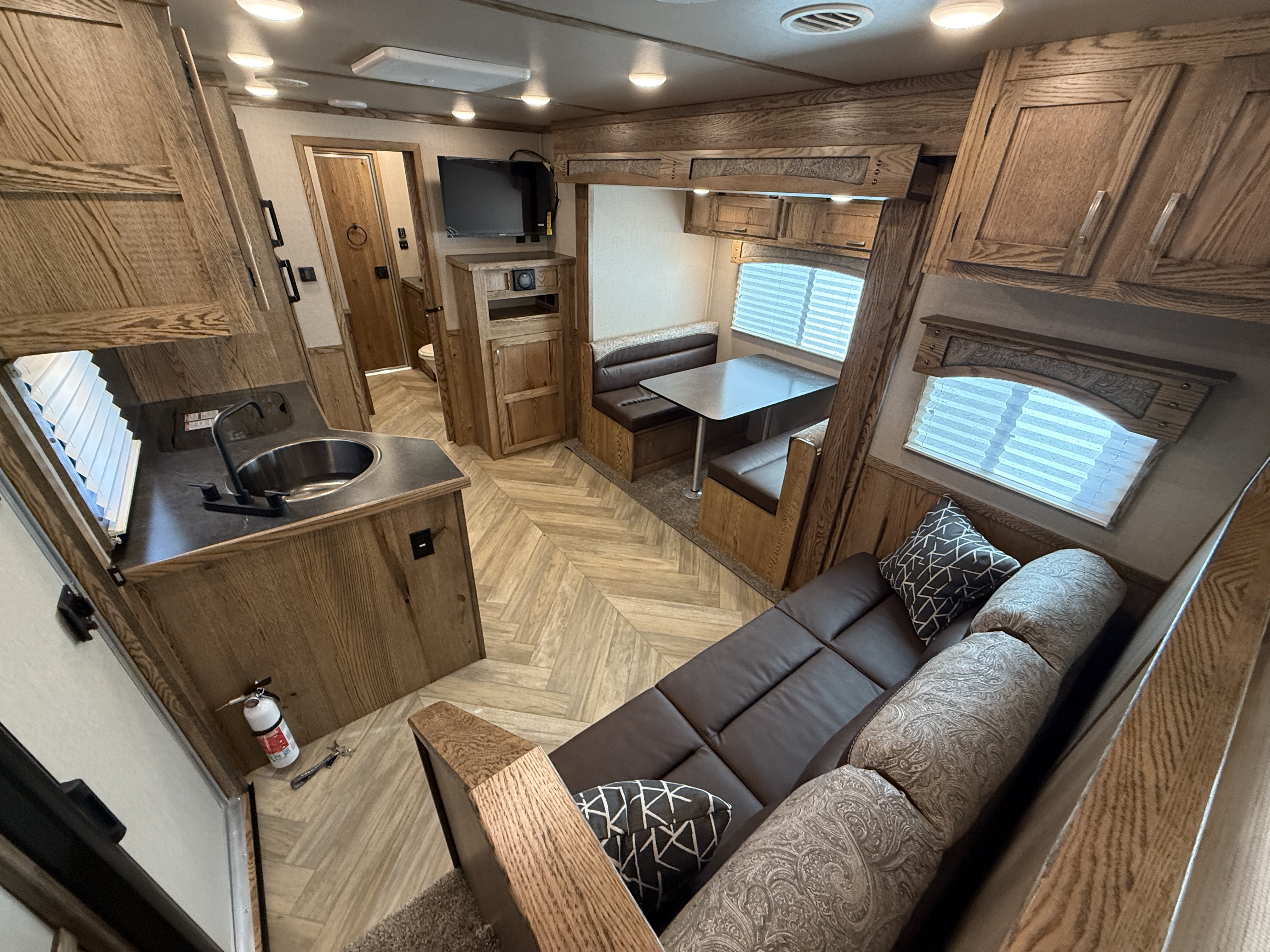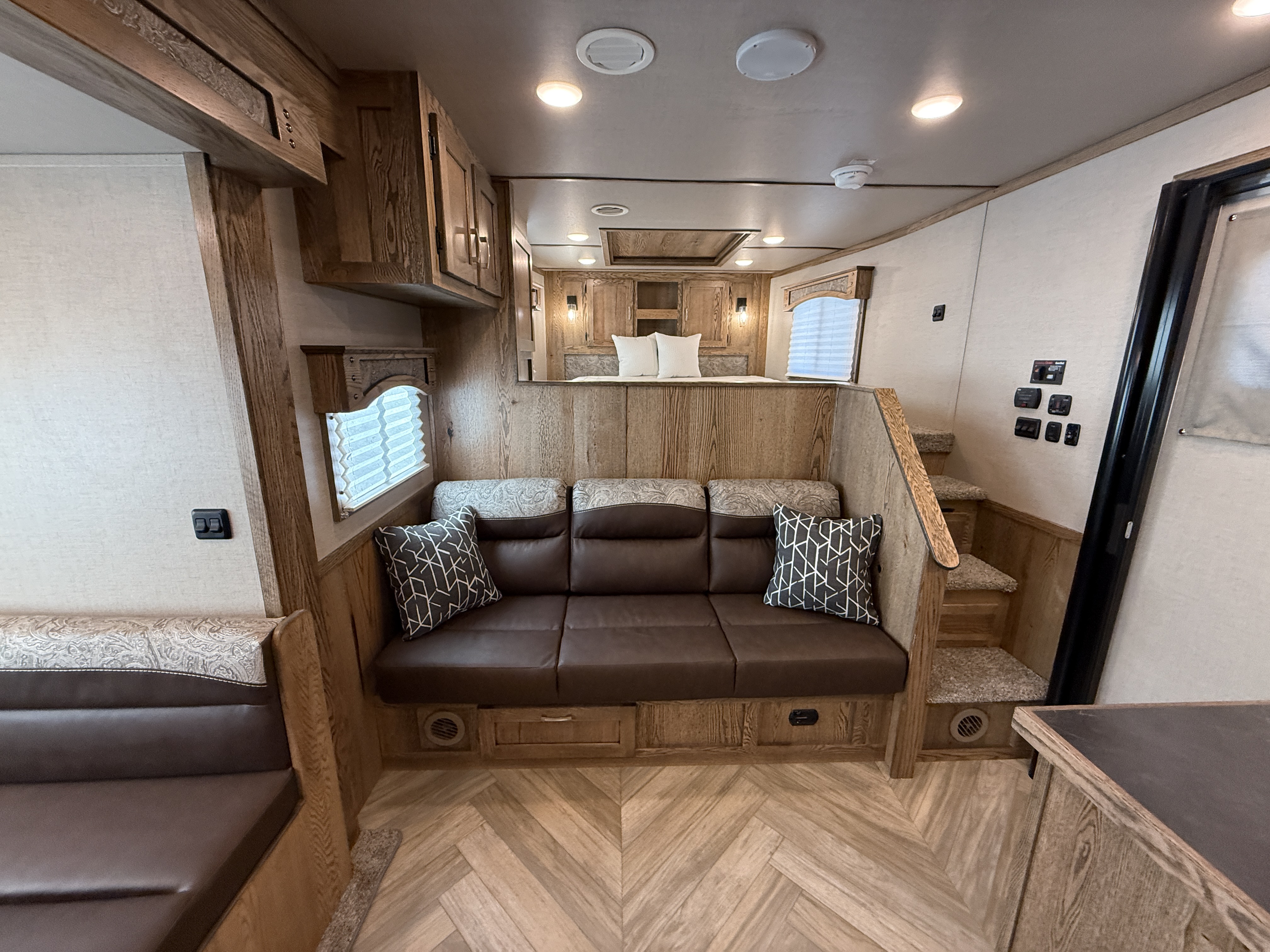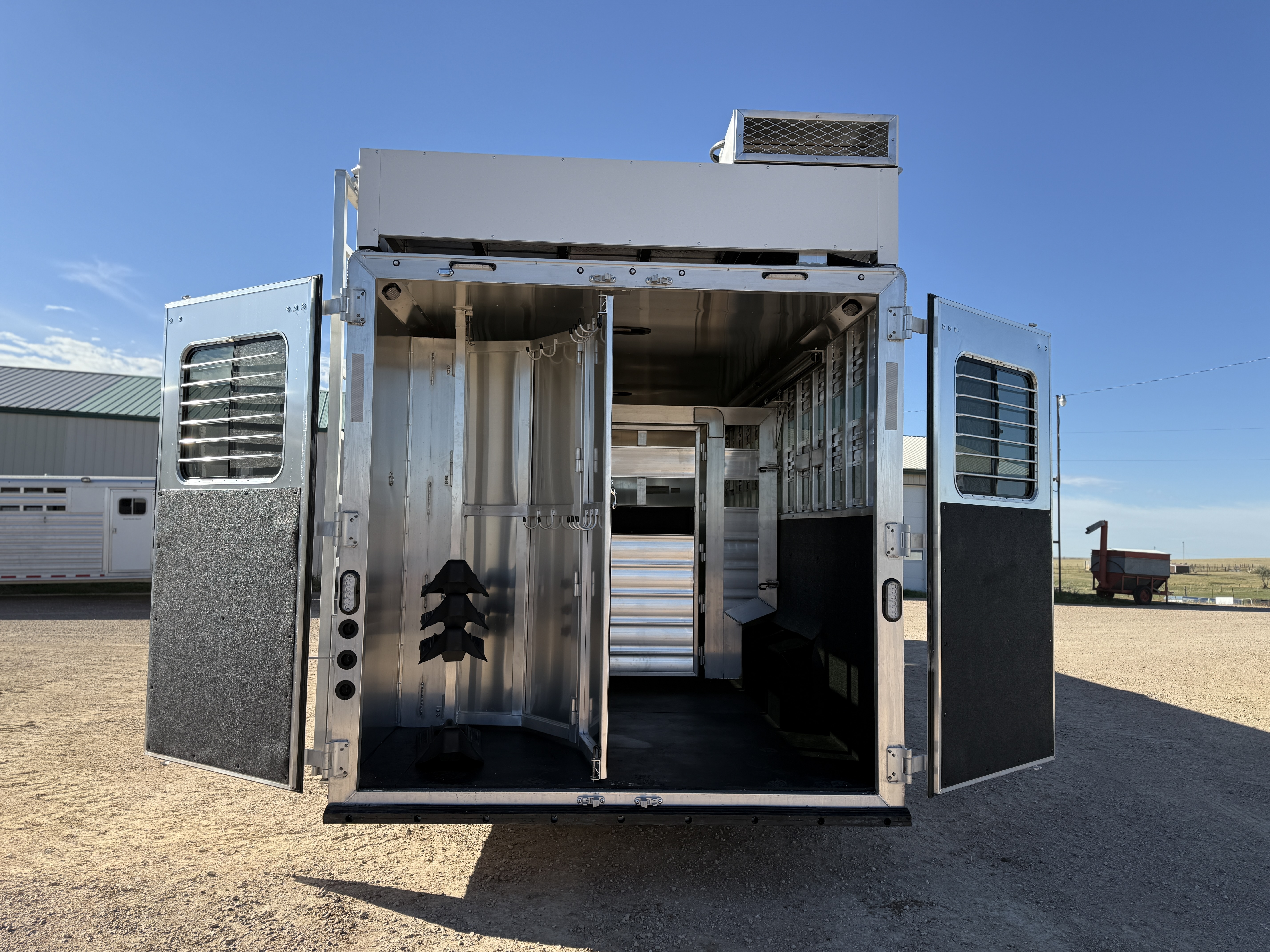 2 Tacks! This 2026 Lakota Livestock Edition has both a single door side-tack with an adjustable 4-tier saddle rack, blanket bar and bridle hooks and a collapsable rear tack with another adjustable 4-tier saddle rack, brush box and more bridle hooks, that's a lot of storage for your gear. The 13' living quarters features a sofa-sleeper in the 6' slide out. There is a sofa-sleeper on the riser wall; a full kitchen that has a sink, recessed cook top, large refrigerator and microwave. The large bathroom has a large shower, 3 door, large medicine cabinet with lights and mirrors, closet and a walk-through door into the stock area. The 18' stock area has a floating center gate. Additional features include a hay pod, dual hydraulic jack, and an awning. This trailer is pre-wired for a generator.