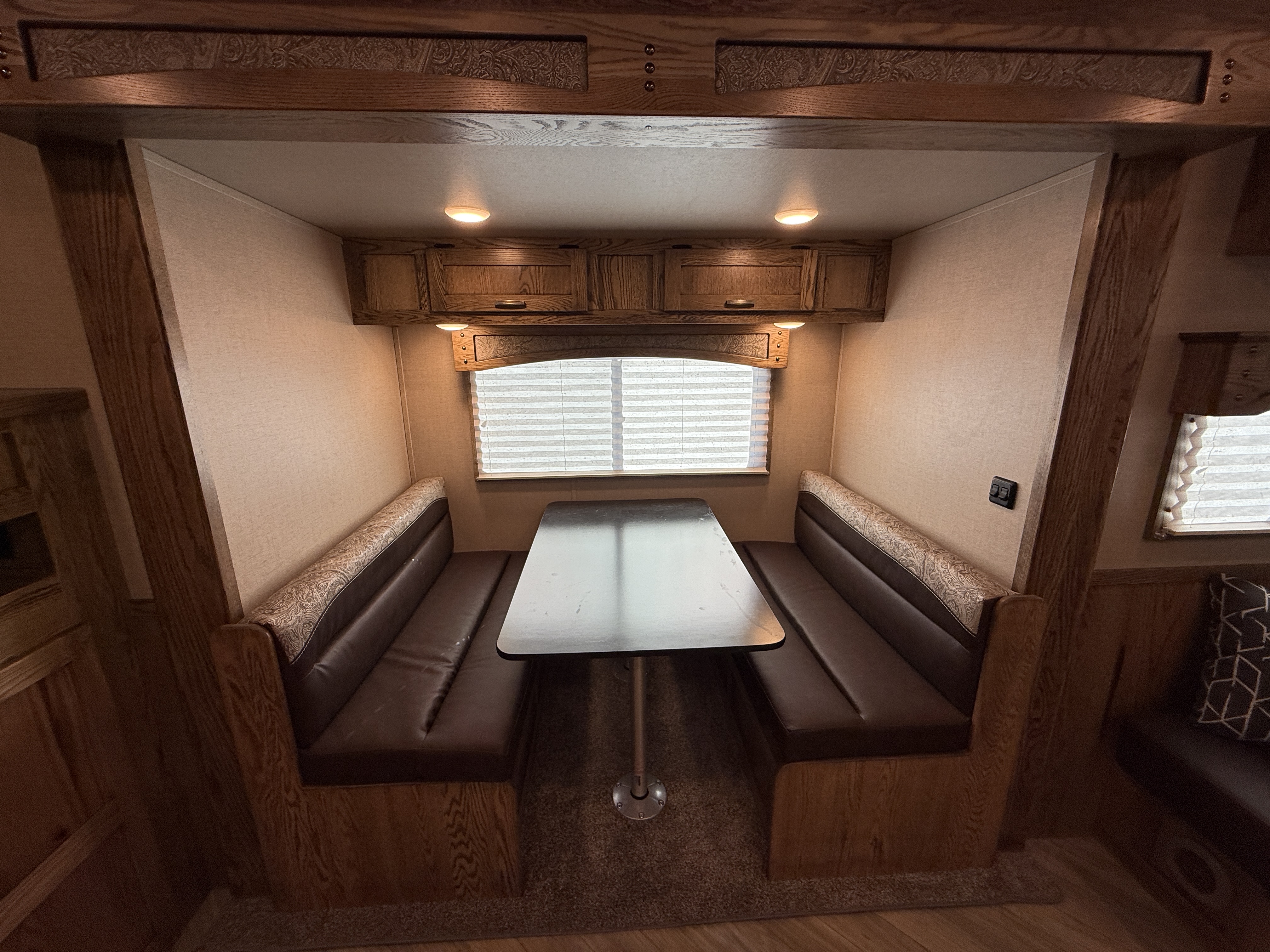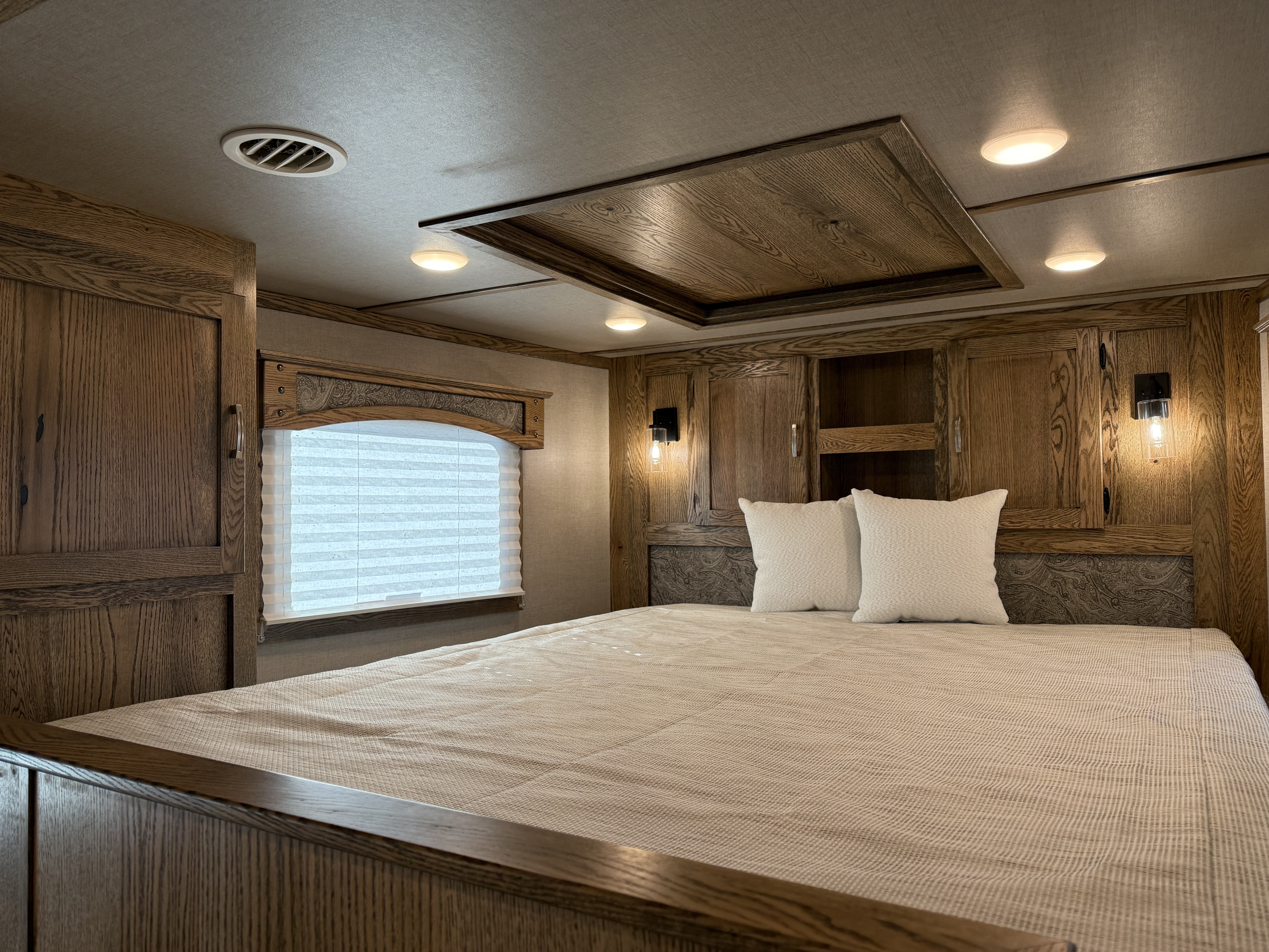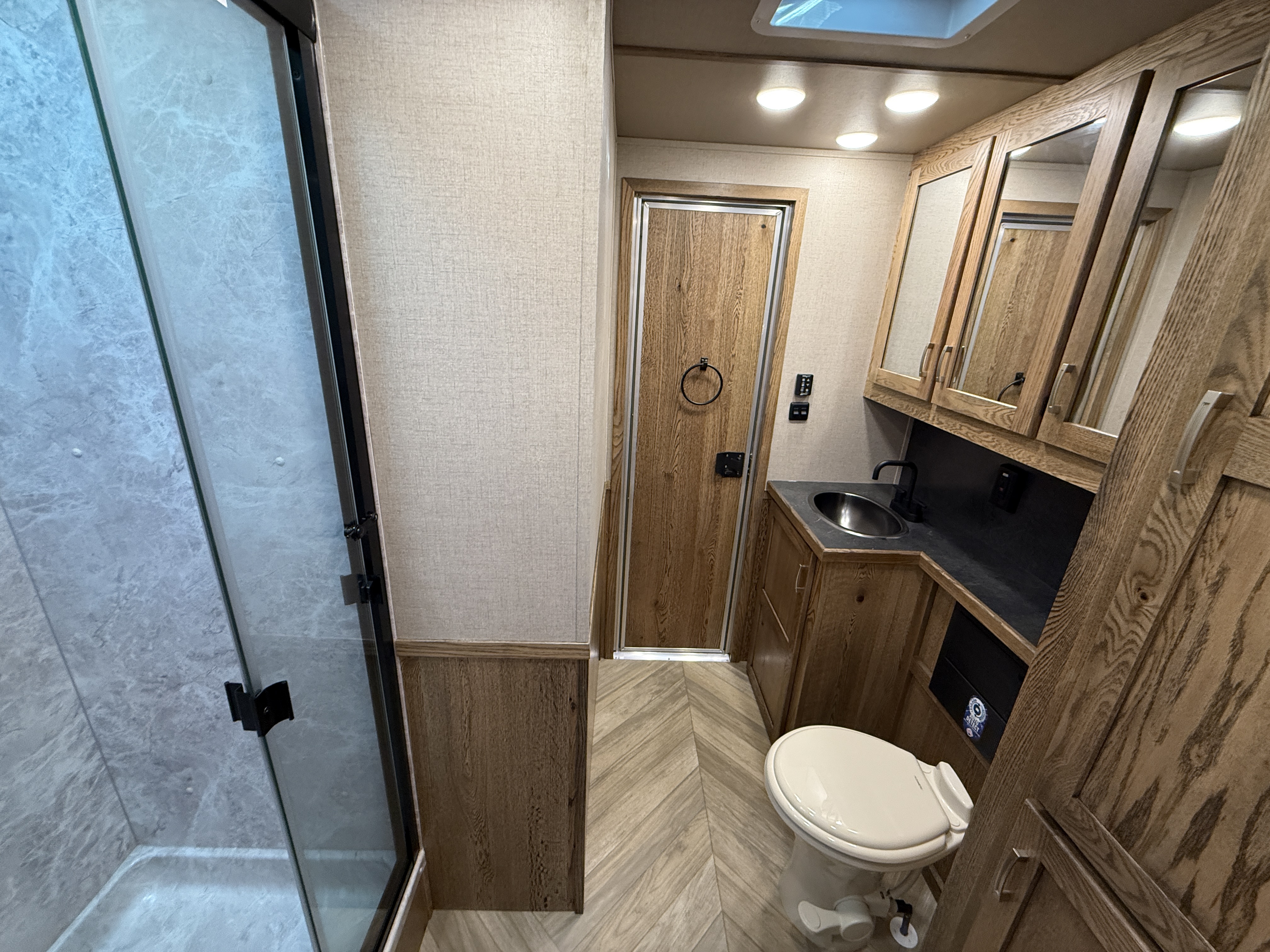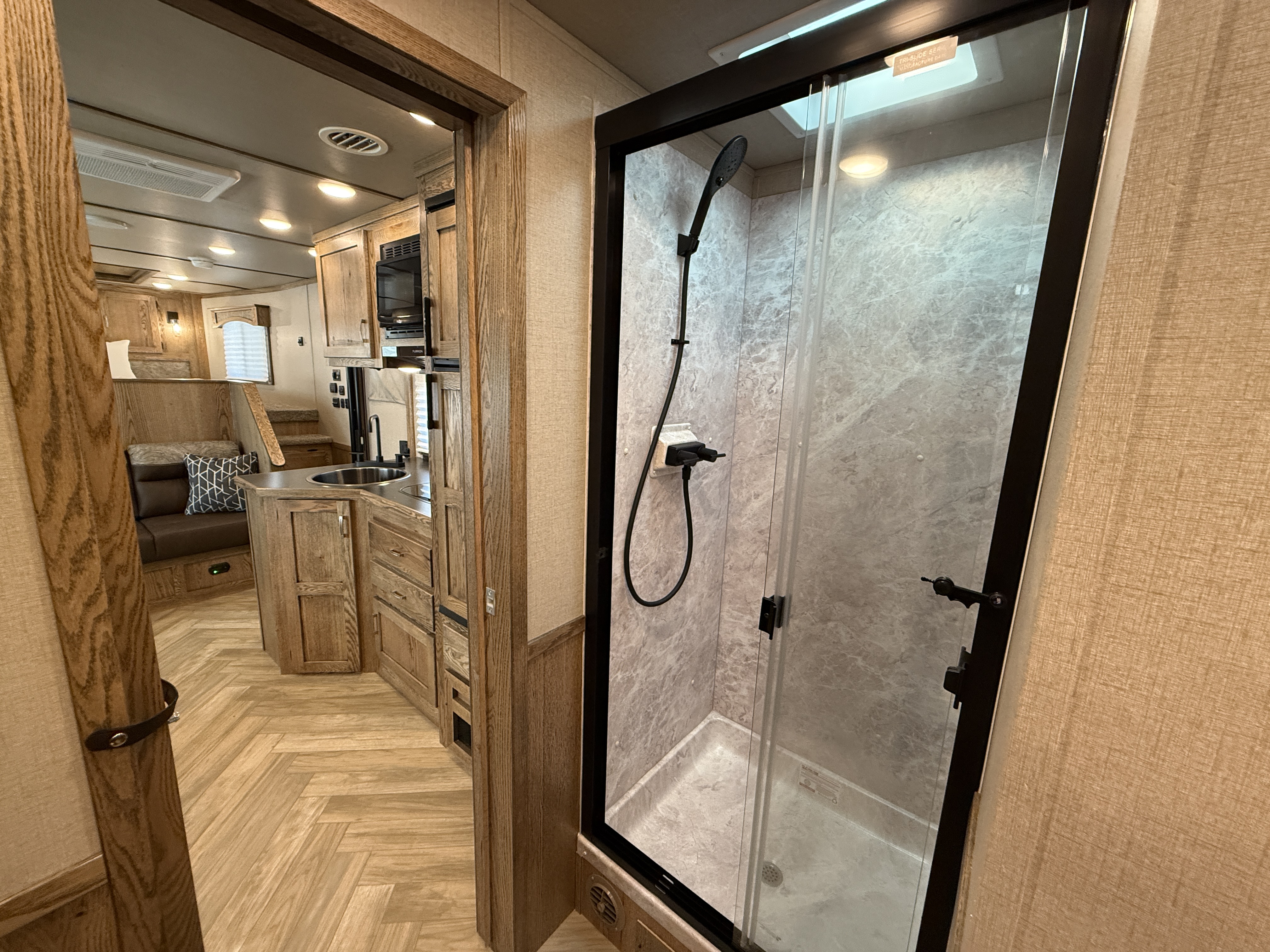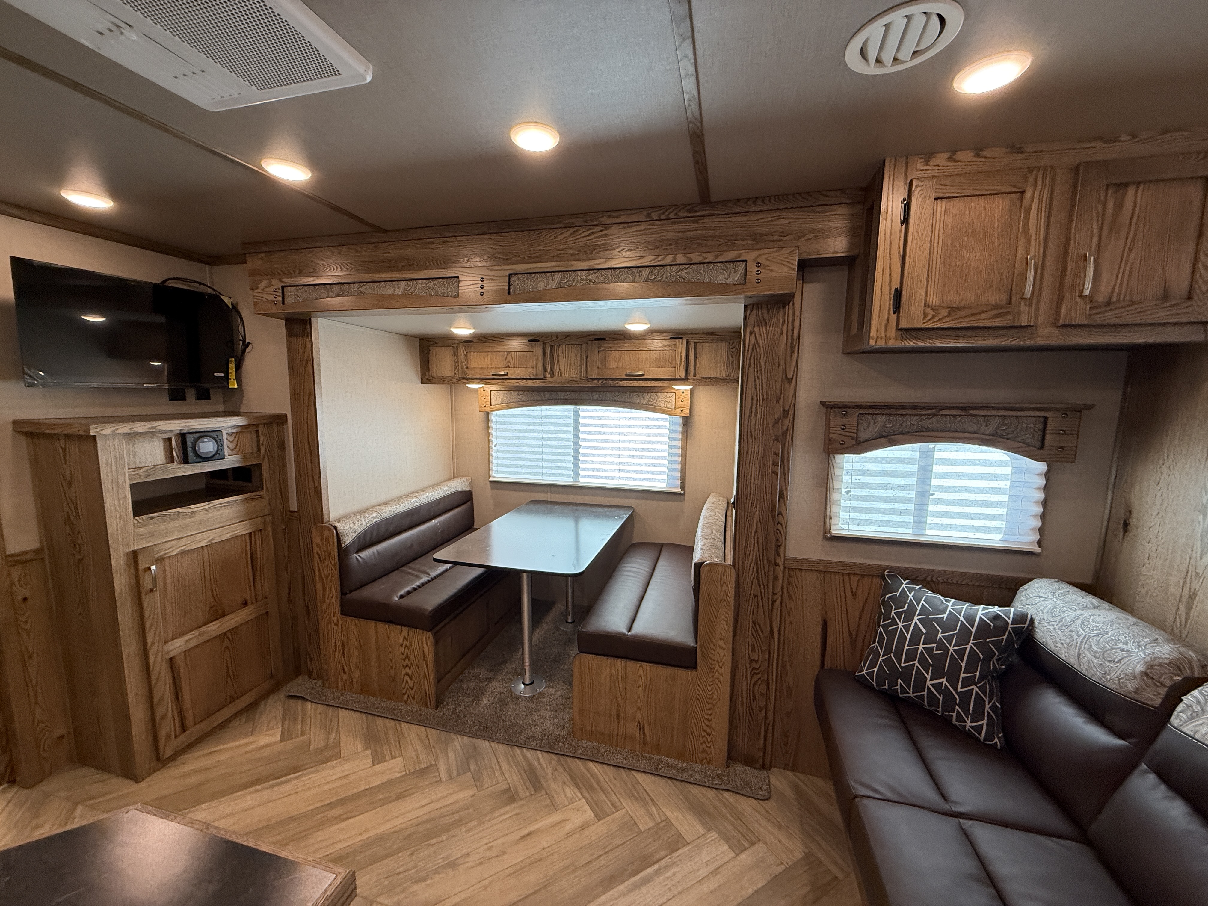 2 Tacks! This 2026 Lakota Livestock Edition has both a single door side-tack with an adjustable 4-tier saddle rack, blanket bar and bridle hooks and a collapsable rear tack with another adjustable 4-tier saddle rack, brush box and more bridle hooks, that's a lot of storage for your gear. The 13' living quarters features a sofa-sleeper in the 6' slide out. There is a sofa-sleeper on the riser wall; a full kitchen that has a sink, recessed cook top, large refrigerator and microwave. The large bathroom has a large shower, 3 door, large medicine cabinet with lights and mirrors, closet and a walk-through door into the stock area. The 18' stock area has a floating center gate. Additional features include a hay pod, dual hydraulic jack, and an awning. This trailer is pre-wired for a generator.