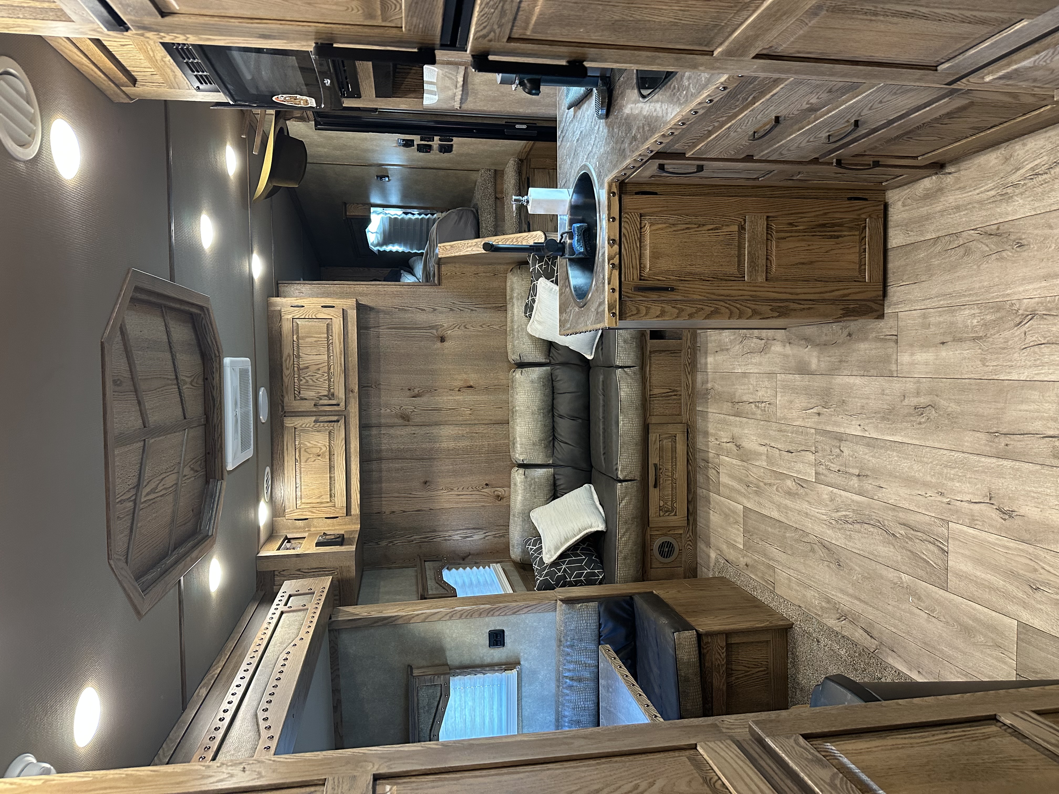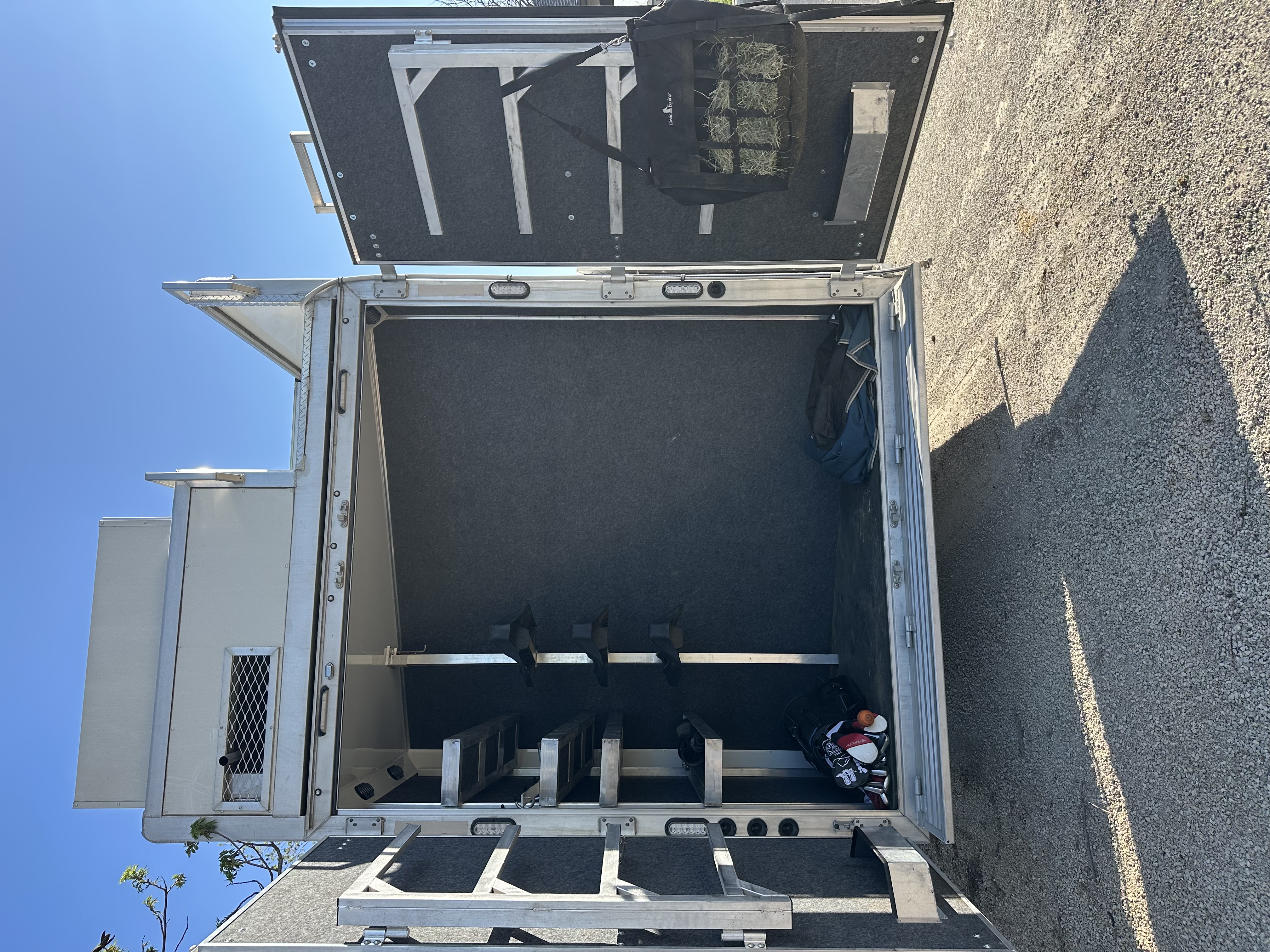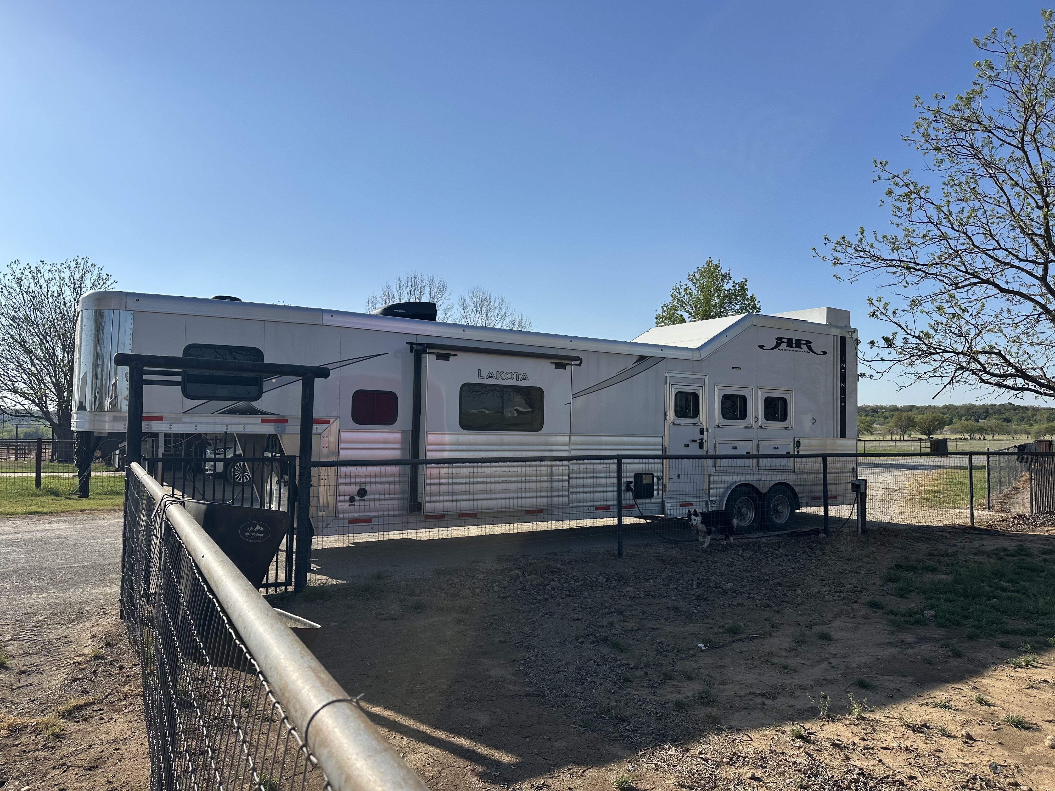 This 2026 Lakota Infinity 3 horse with a 16'7" living quarters, side load with a full rear tack. The living quarters features a semi-private bedroom in the nose with a queen-sized bed, television and storage. There is a sofa-sleeper on the riser wall, dinette-sleeper in the 6' slide out, a large closet and storage area, along with a full kitchen that has a large refrigerator, recessed cooktop, microwave, sink and lots of storage and counter space. The large fully private bathroom has a radius shower, sink with vanity and mirror, toilet, a large double-sided closet and a walk-through door into the horse compartment. The horse area has a stud stall in the front slant, mangers with under manger storage, side load ramp, roadside escape door, front and rear drop-down windows, and a telescoping rear divider. The full rear tack room has a 3-tier saddle rack, blanket bars, brush boxes, lots of bridle hooks and shortage shelves. Additional features include an integrated hay pod, 6.0 diesel generator, dual 12k hydraulic jacks, and an awning. This trailer has a floor length of 33' and is 8' wide.